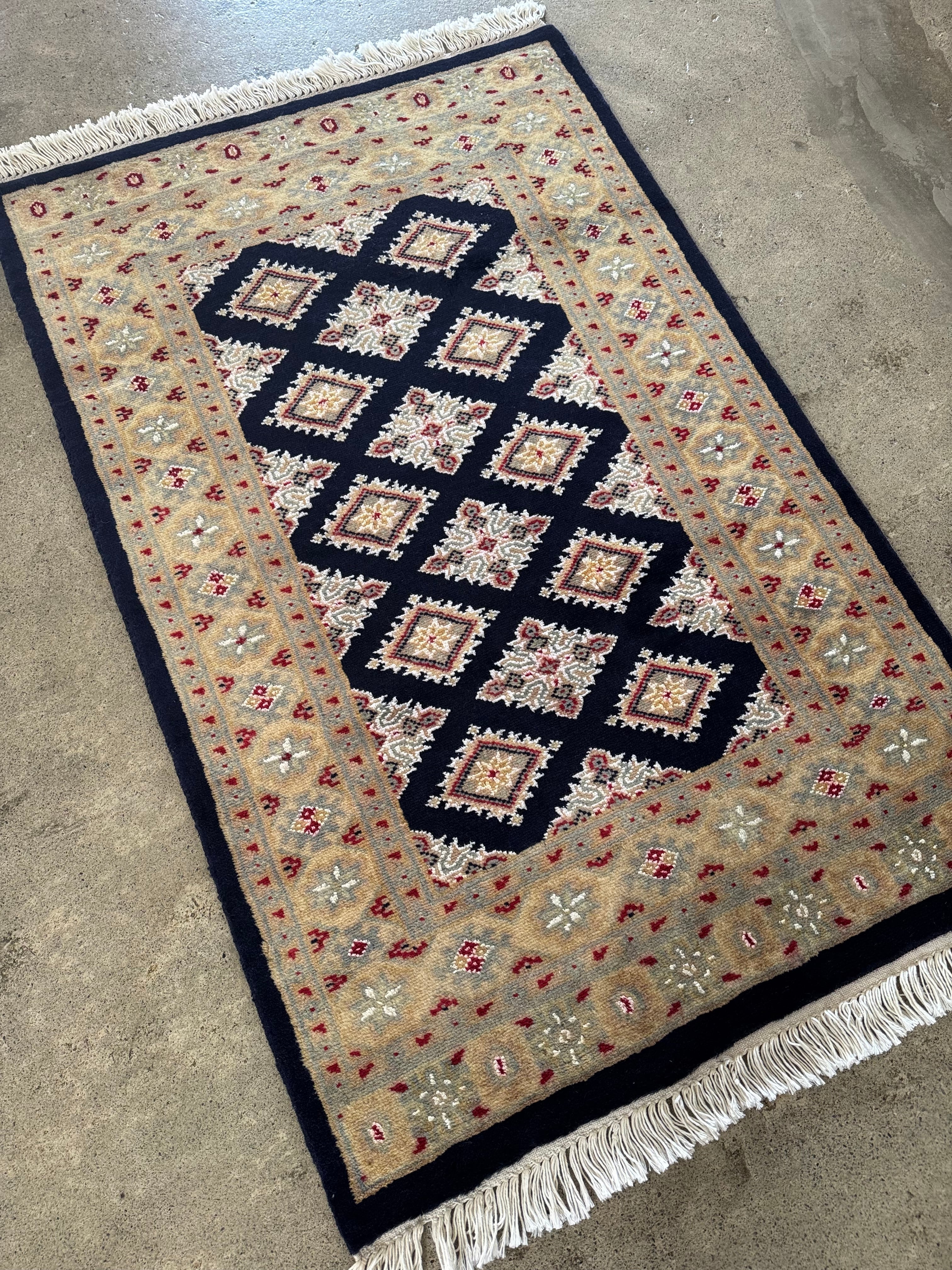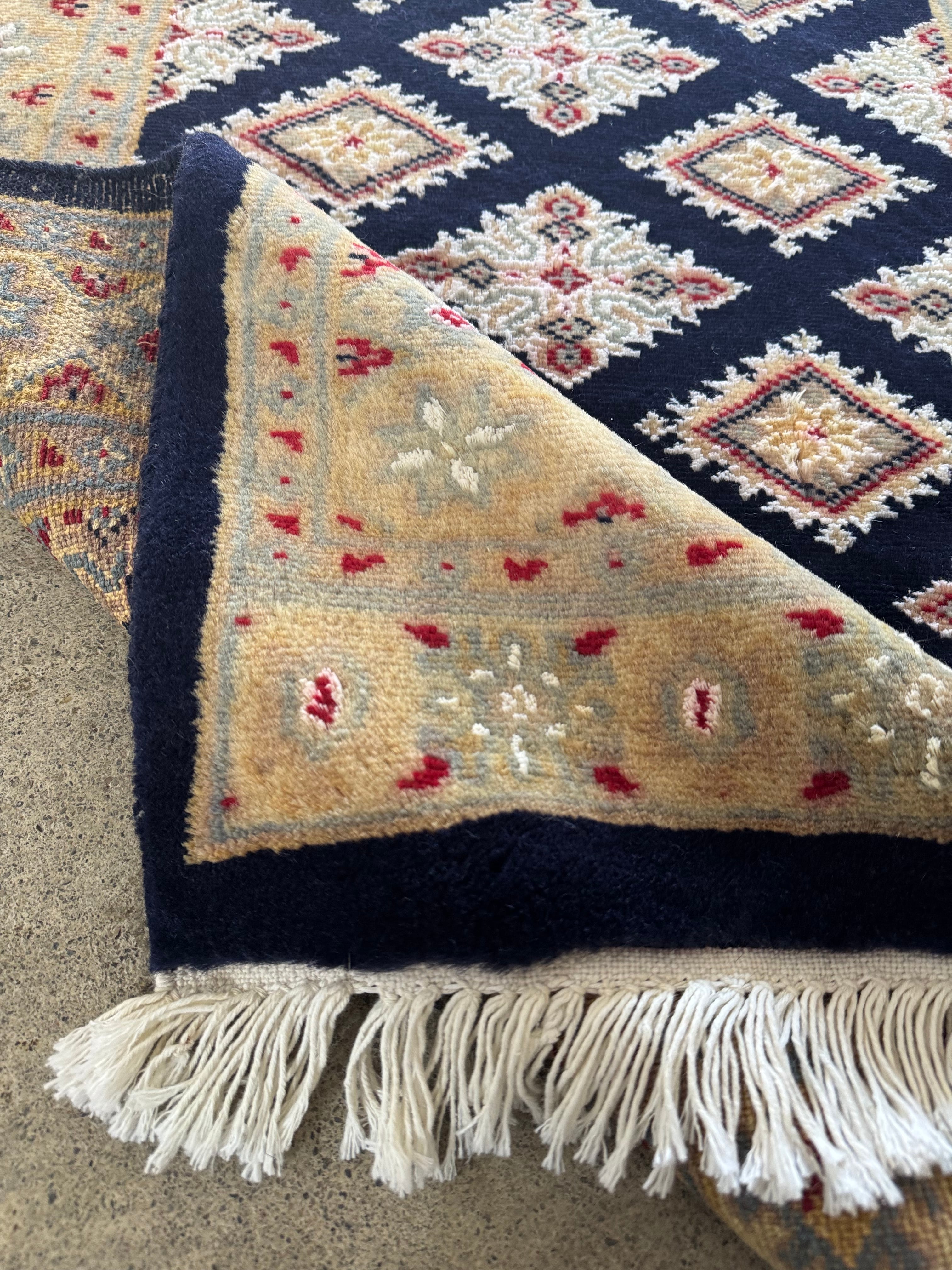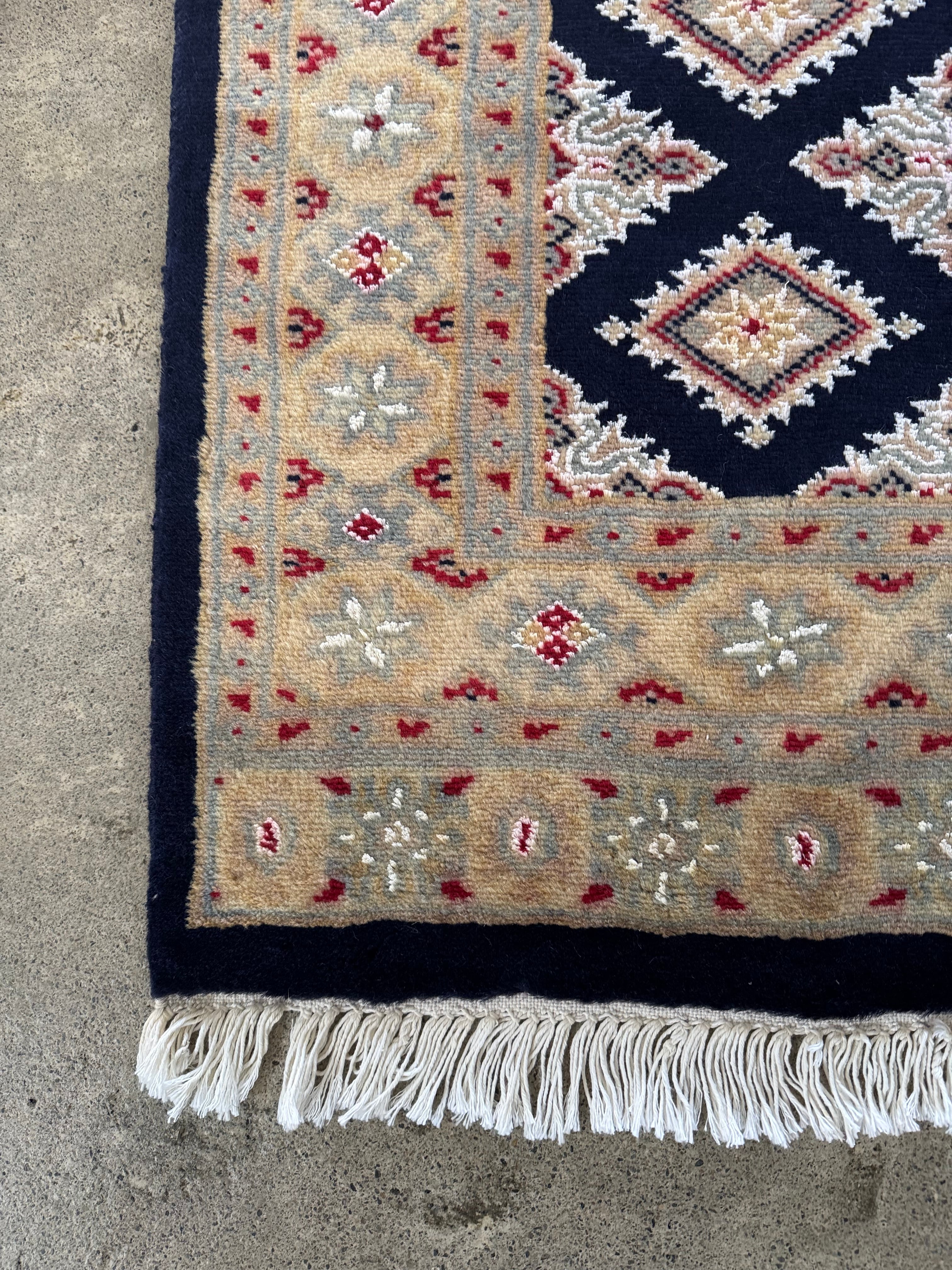 パキスタンの伝統的なトライバルデザインが美しい絨毯。こちらは深いネイビーブルーです。