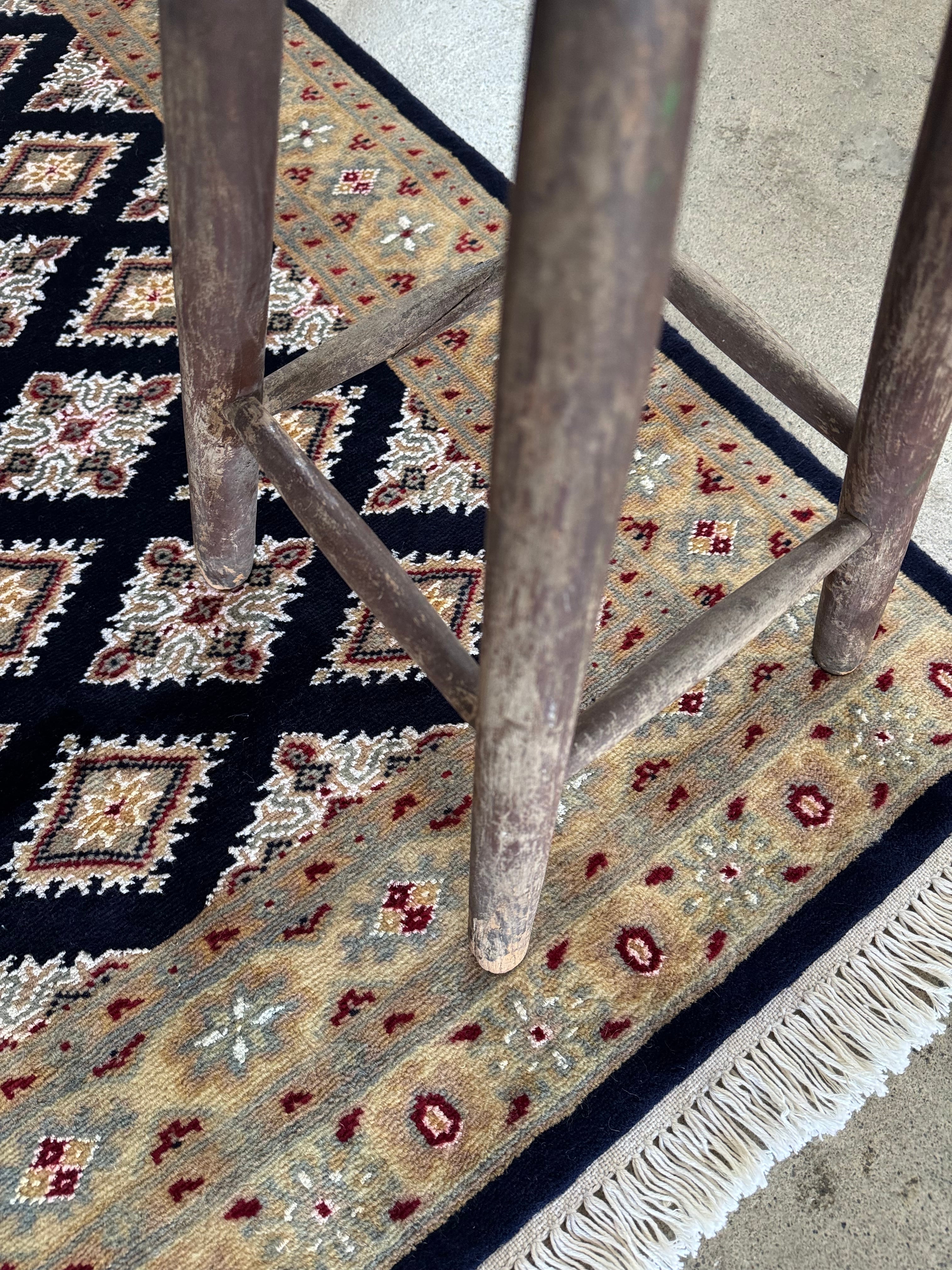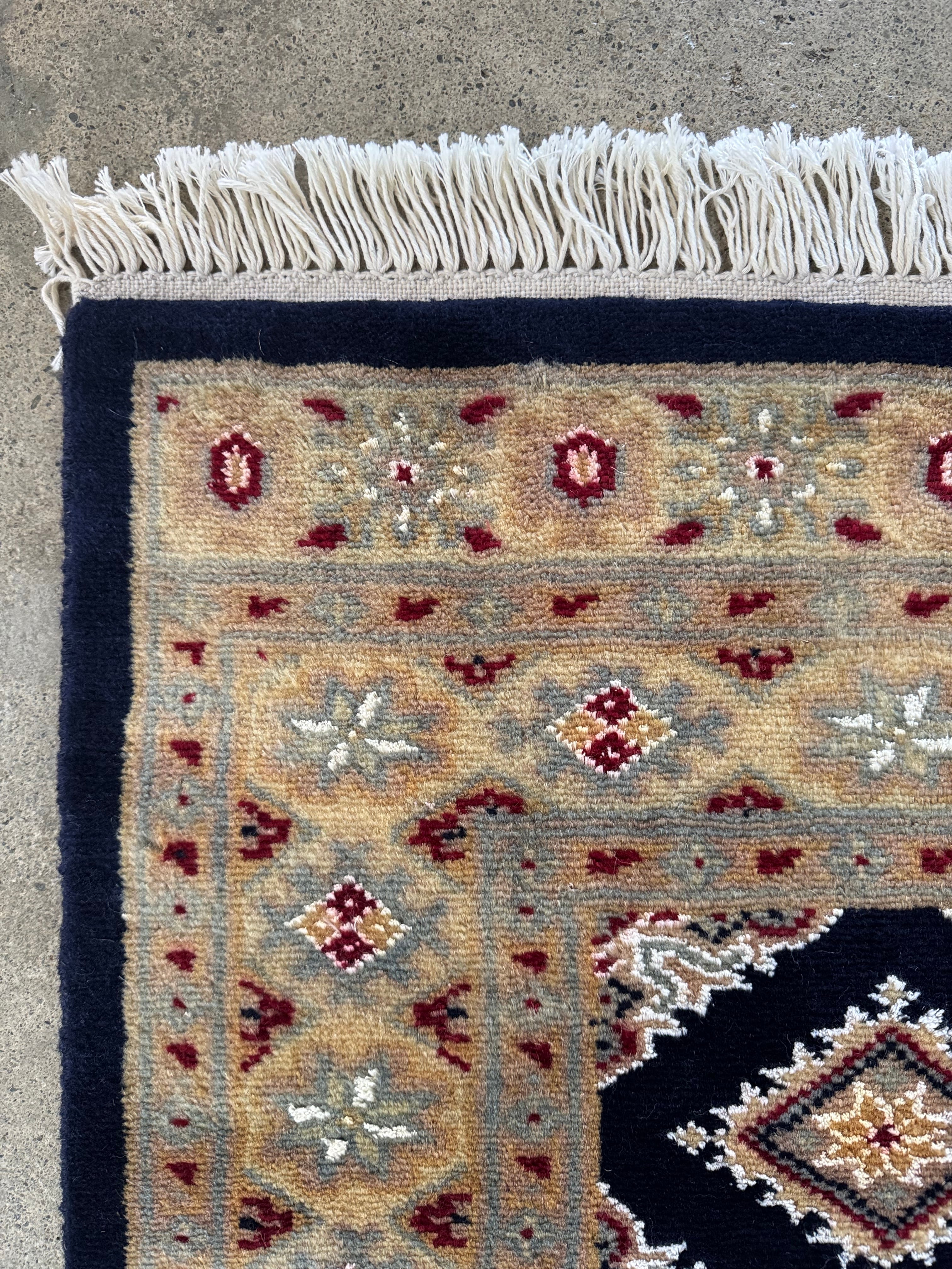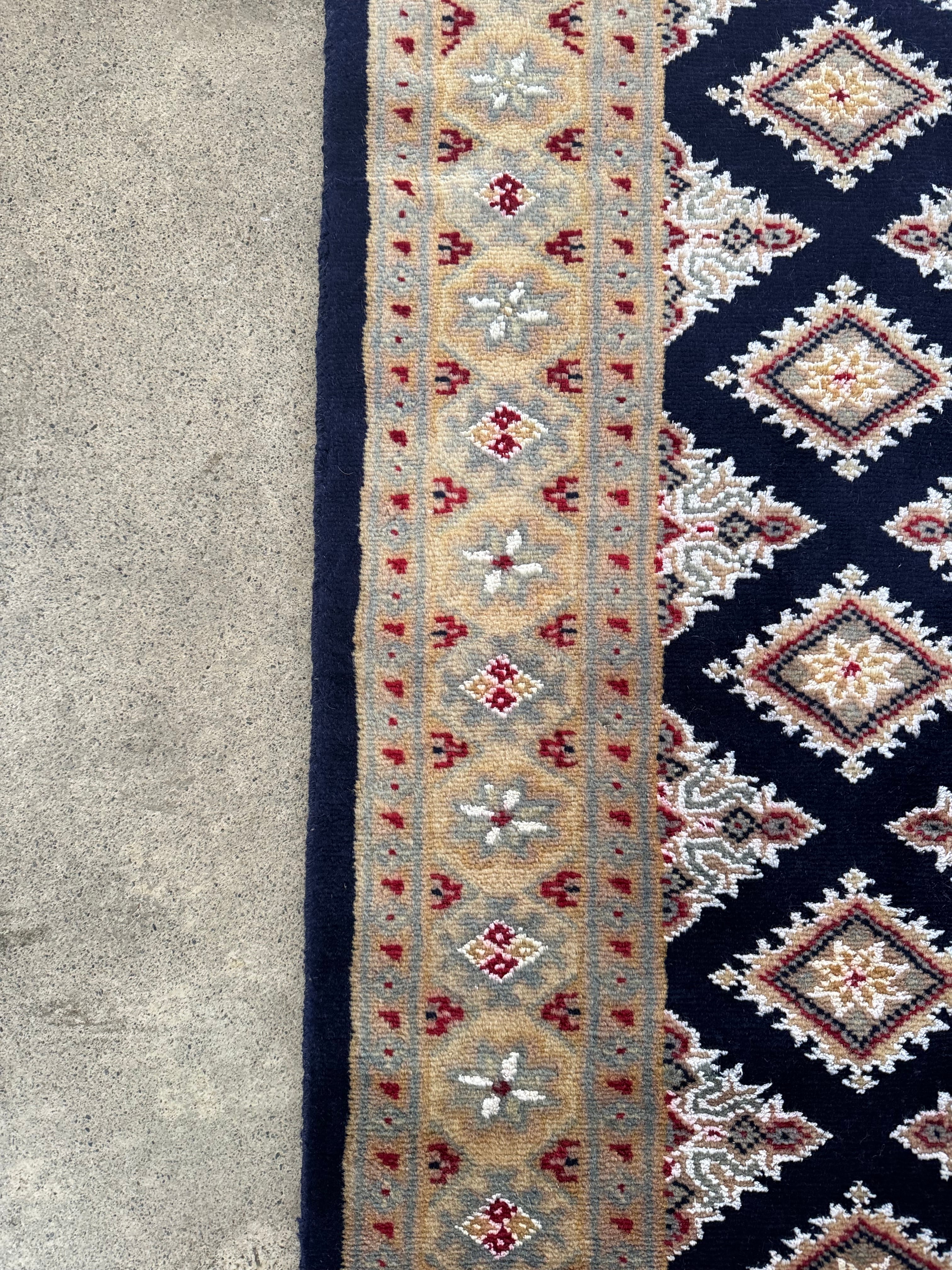 パキスタンの伝統的なトライバルデザインが美しい絨毯。こちらは深いネイビーブルーです。