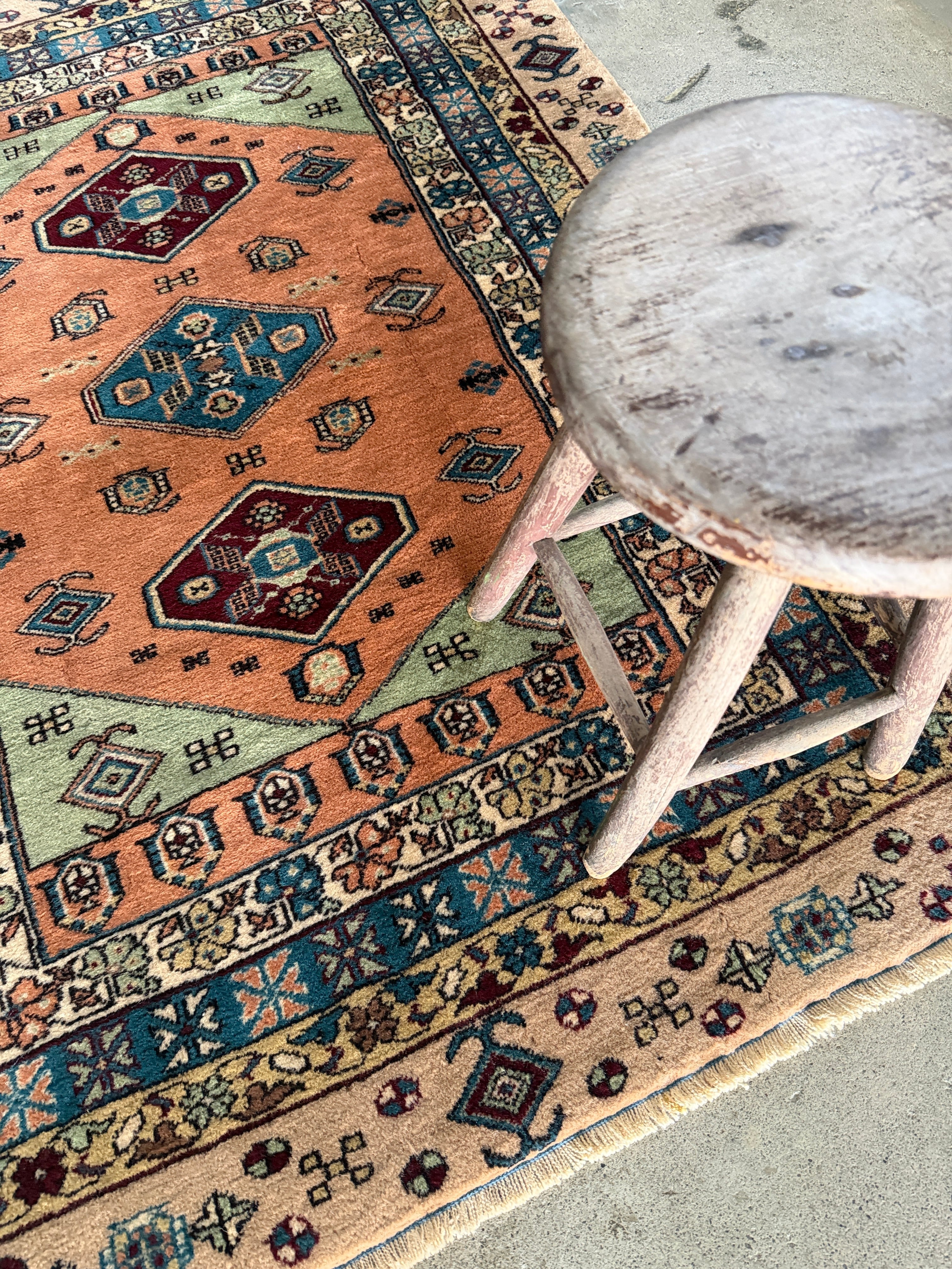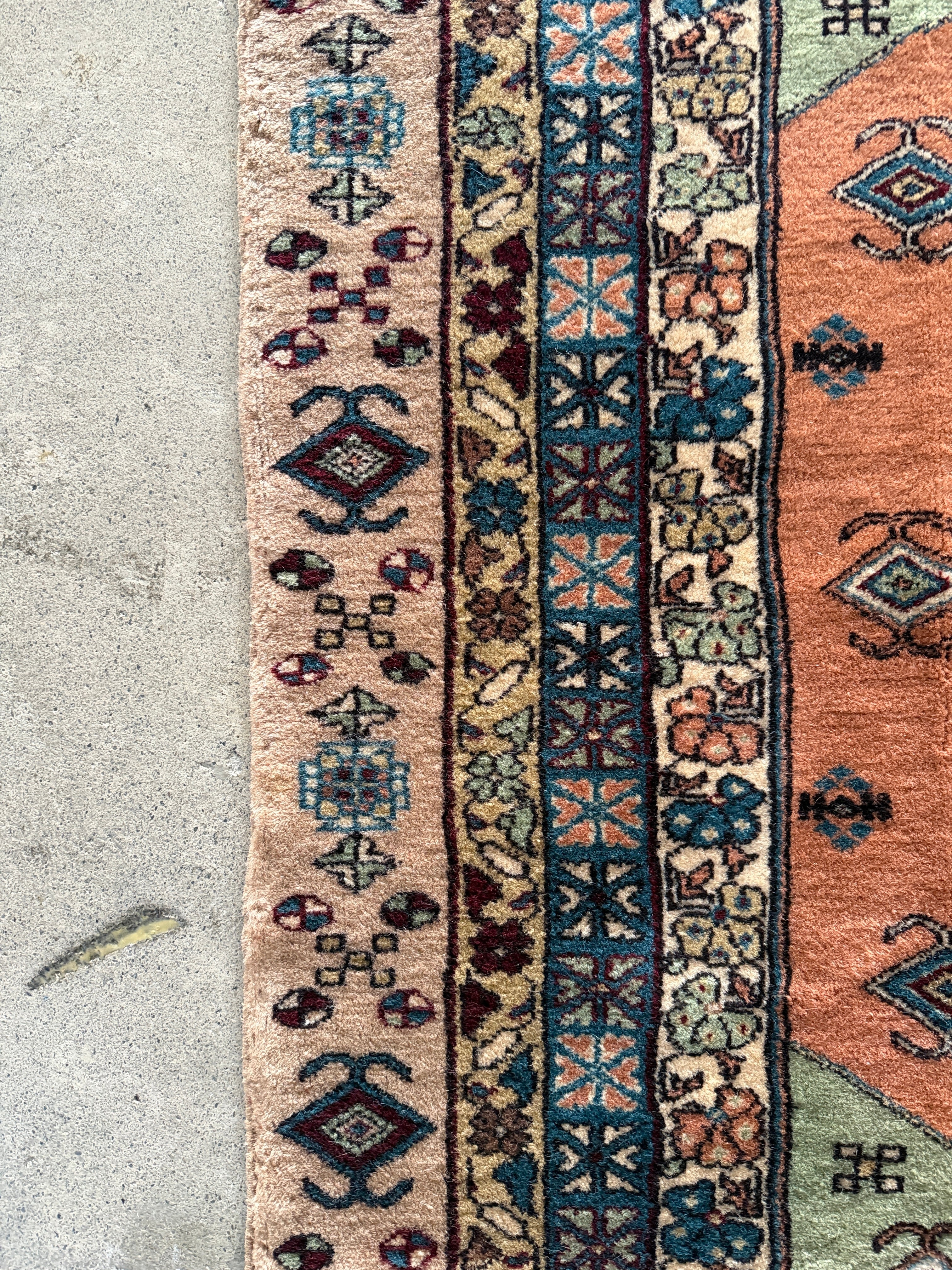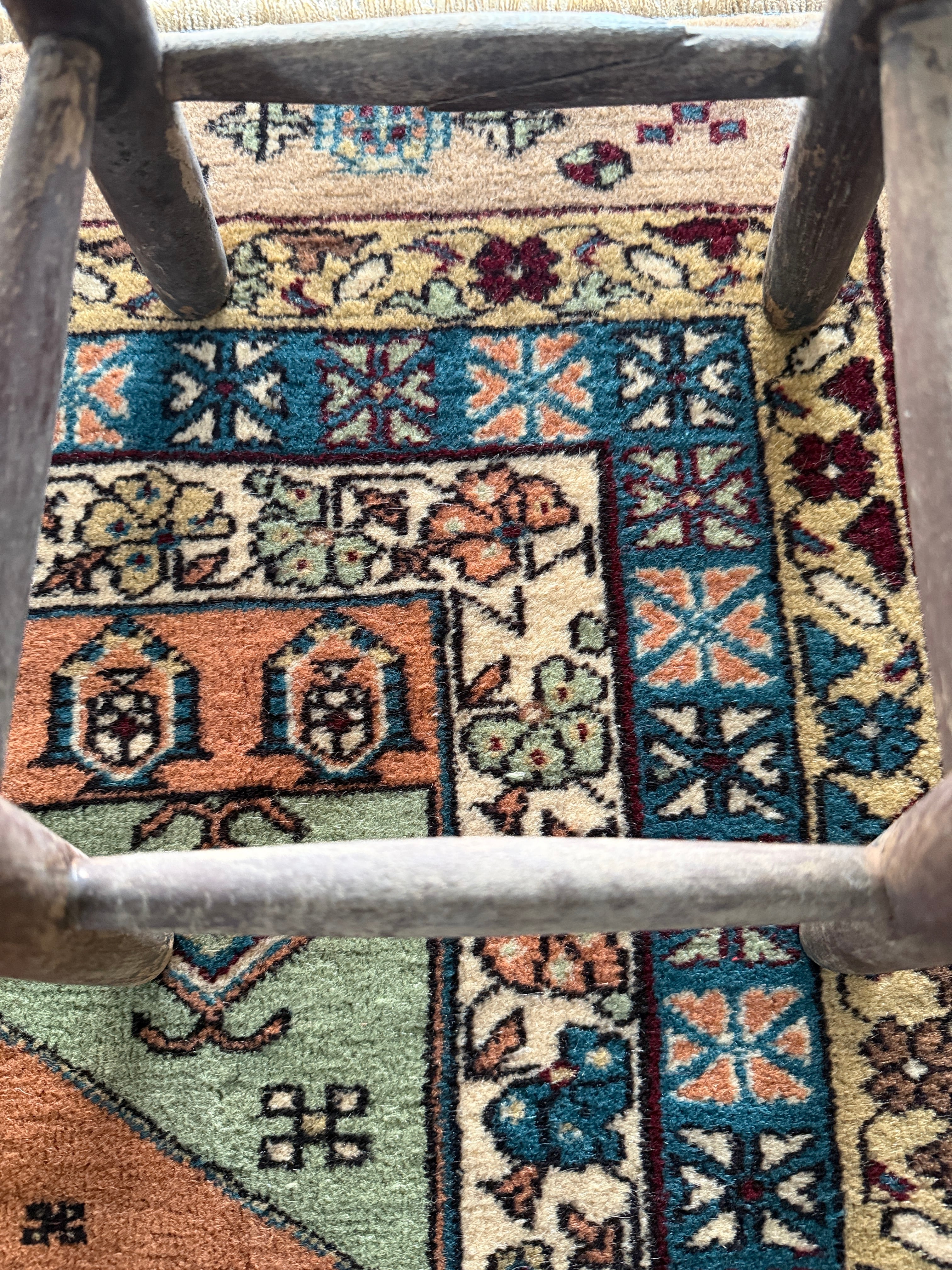 トルコの南西部のエーゲ海に近い街、クラで織られた絨毯。クラ絨毯らしい幾何学模様と花模様の組みわせに、優しい暖かさを感じるオレンジがアクセントになった1枚。グリーンやブルーの色使いも個人的にかな好み。枠のように絨毯のデザインを取り囲む、ベージュ部分の繊細な模様にも注目してほしいです!全てが丁寧にこだわりを持って織られたことを感じさせてくれる職人技が光るラグです。