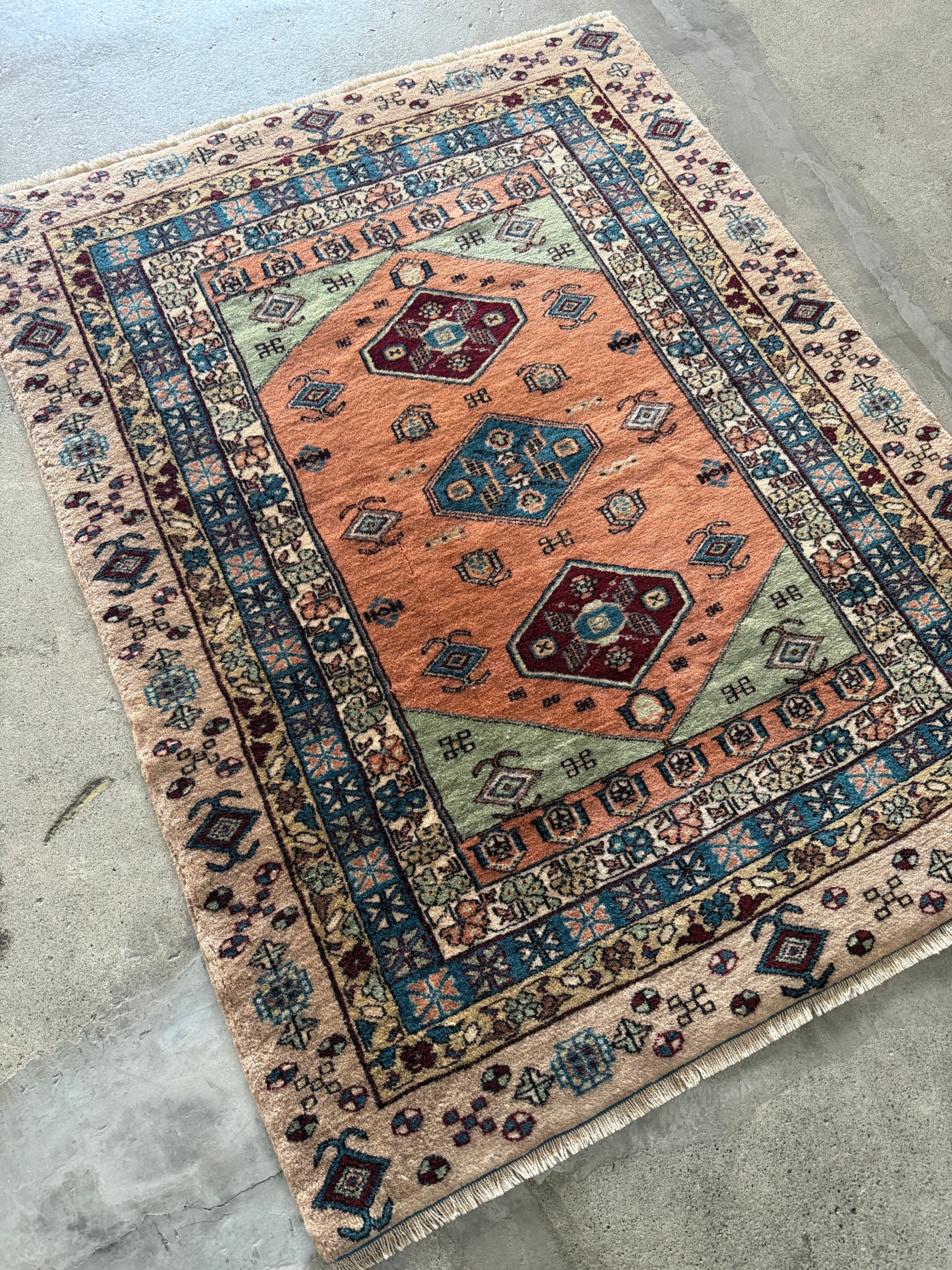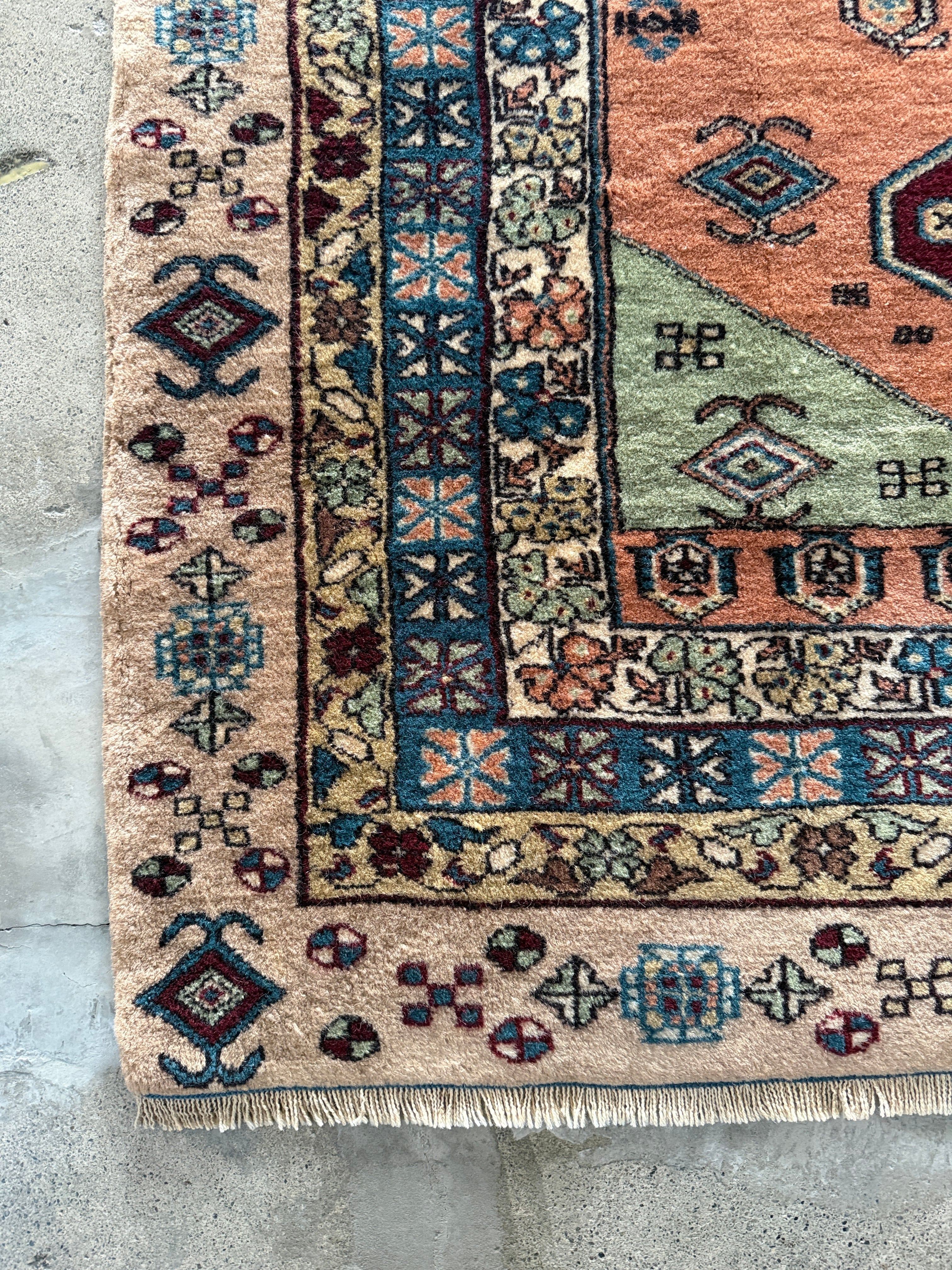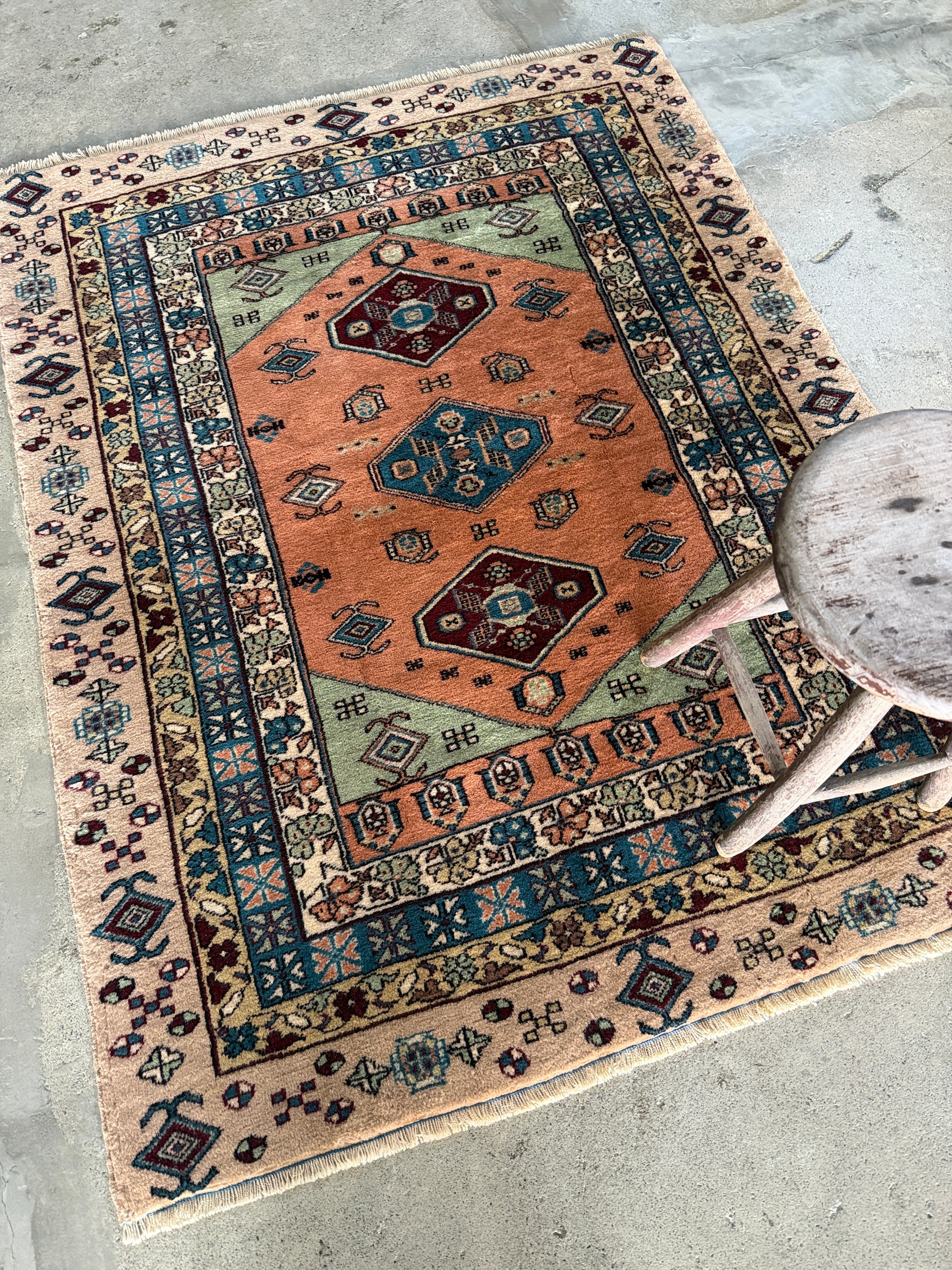 トルコの南西部のエーゲ海に近い街、クラで織られた絨毯。クラ絨毯らしい幾何学模様と花模様の組みわせに、優しい暖かさを感じるオレンジがアクセントになった1枚。グリーンやブルーの色使いも個人的にかな好み。枠のように絨毯のデザインを取り囲む、ベージュ部分の繊細な模様にも注目してほしいです!全てが丁寧にこだわりを持って織られたことを感じさせてくれる職人技が光るラグです。