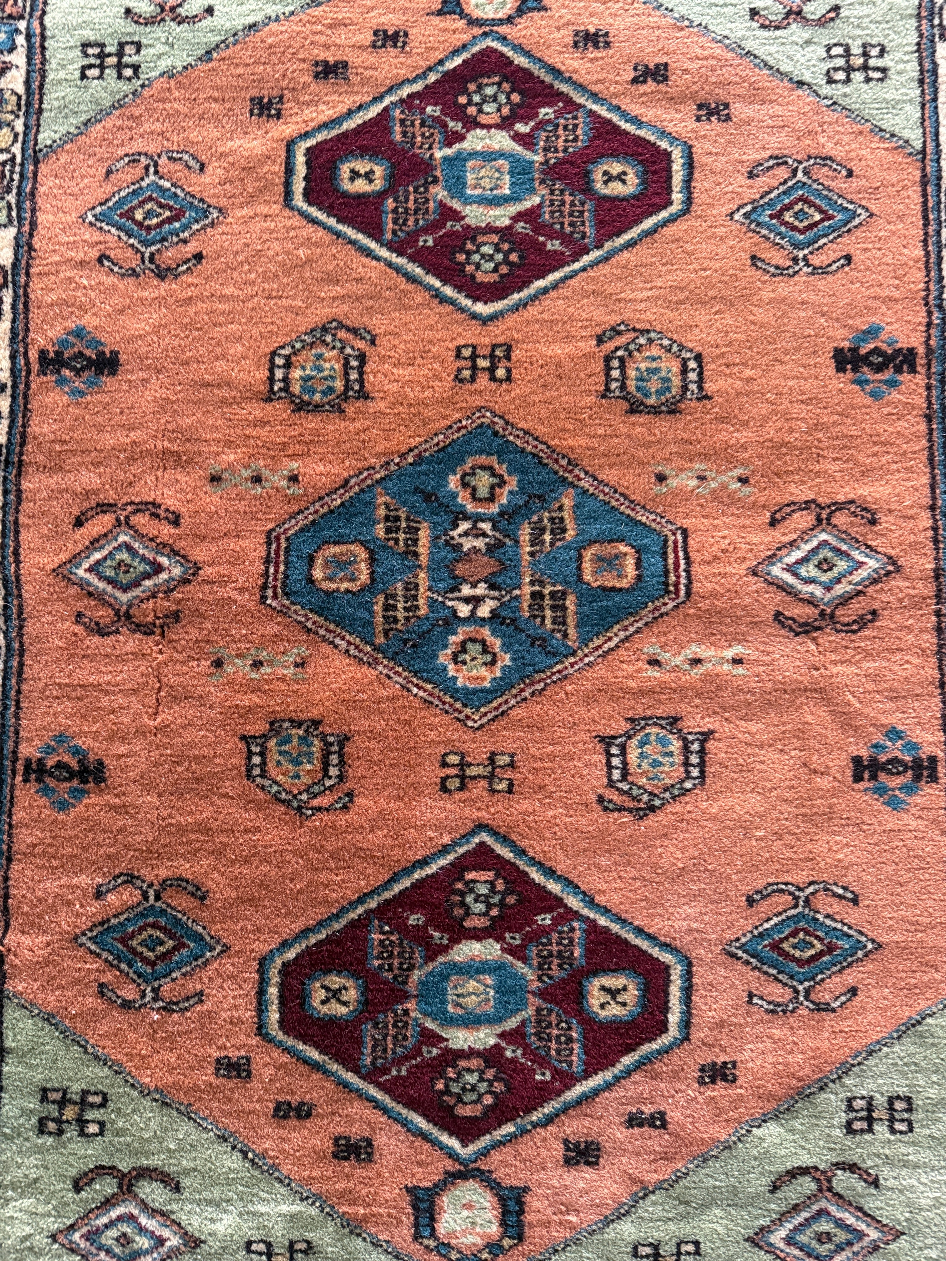 品質・デザイン・希少性どれをとっても素晴らしく美しい絨毯です。レトロな色使いにウールの柔らかさ、重厚感を感じることができます。ヴィンテージですが高品質なウールで織られているので毛足も美しいままの状態です。自然な色合いの褪色も少なく、肌触りも滑らかでデッドストックのような品質の良さです。