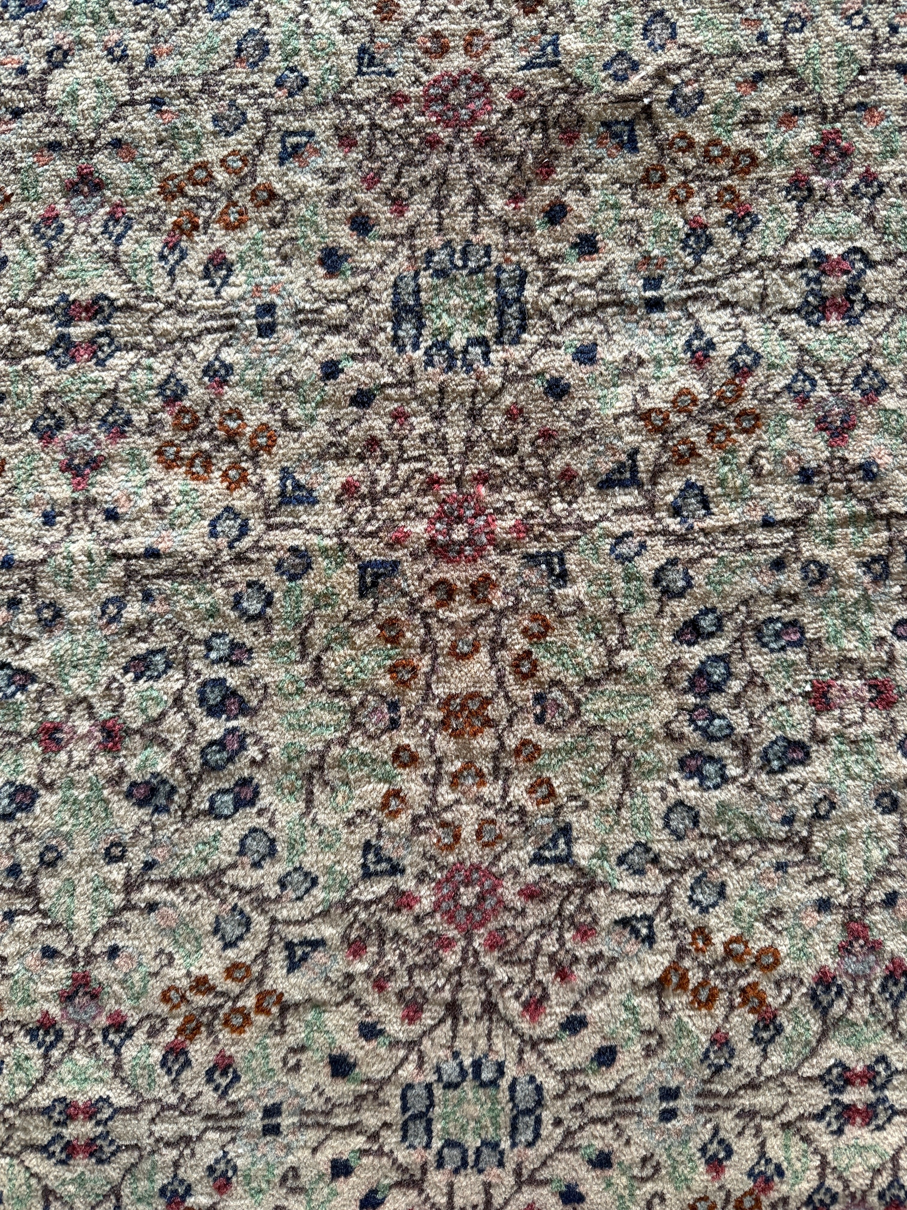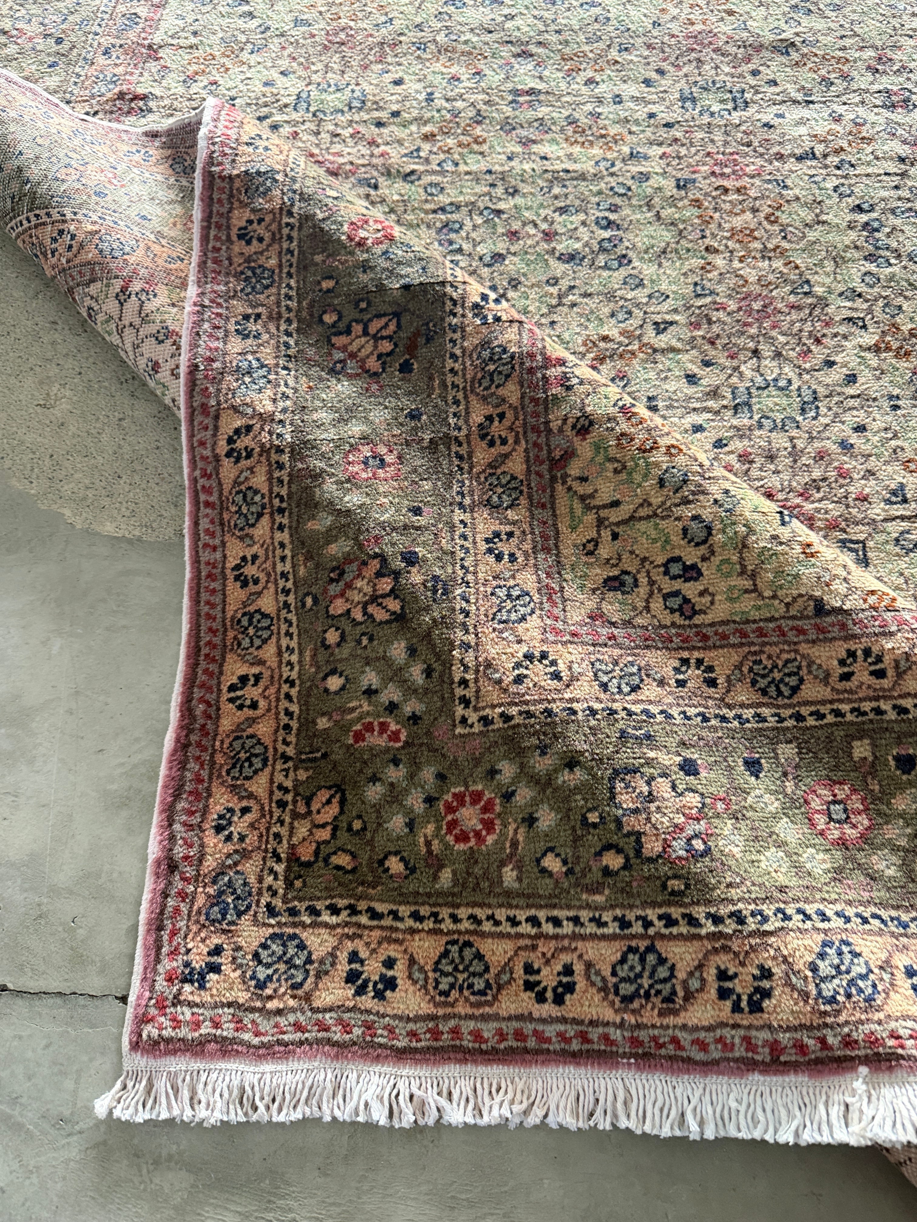 カイセリ絨毯の王道でメダリオンに並ぶ人気の小花模様。今回はシックでモダンなグリーンの1枚をご紹介させていただきます。クラッシックな色合いは古家具や和室などにも相性が良いです。アンティークな雰囲気がお好きなお客様にはぜひオススメの1枚です。パイルの状態も良く、毛足も綺麗です!滑らかな肌触りとウールの艶を感じていただけます。
