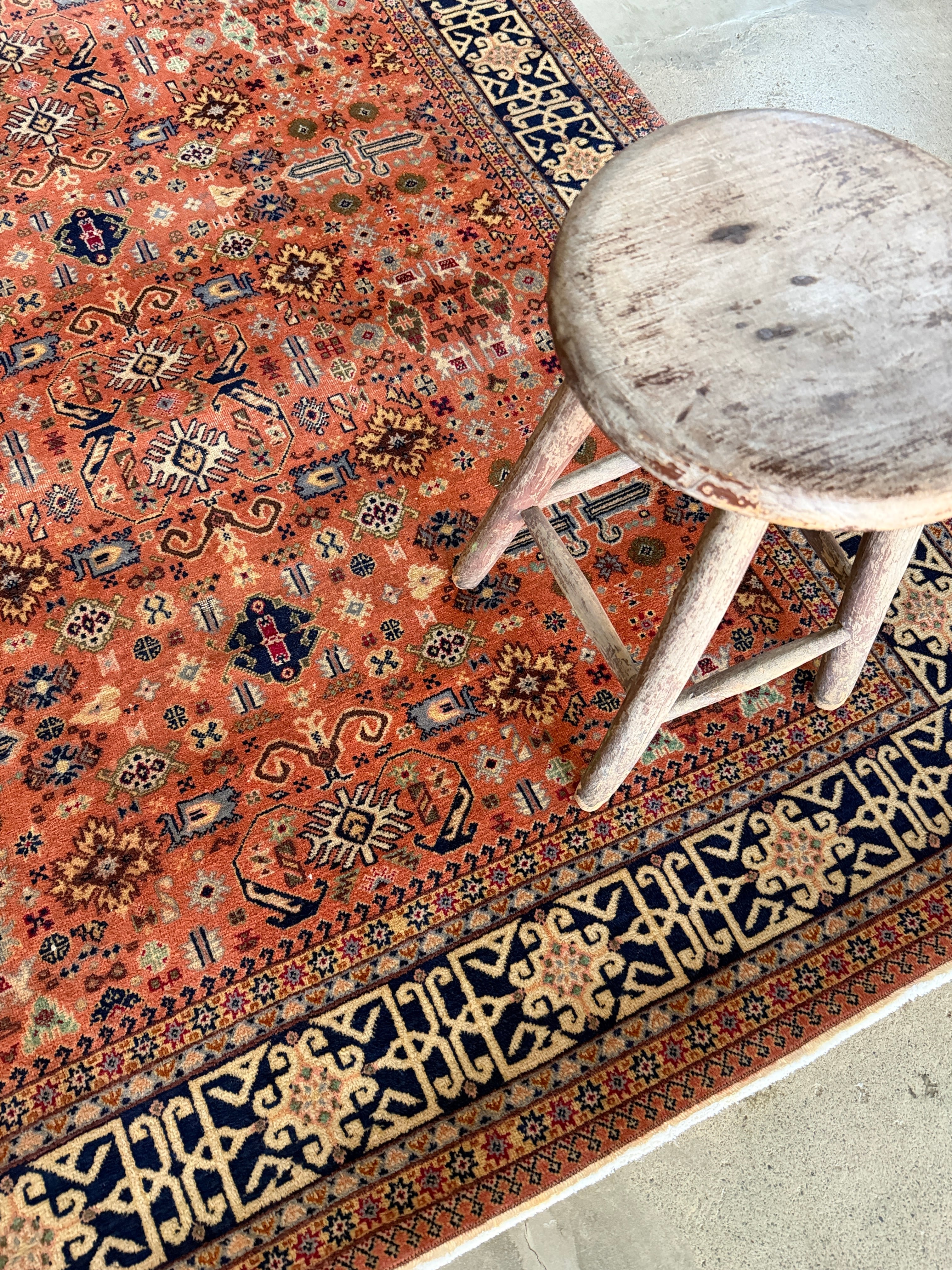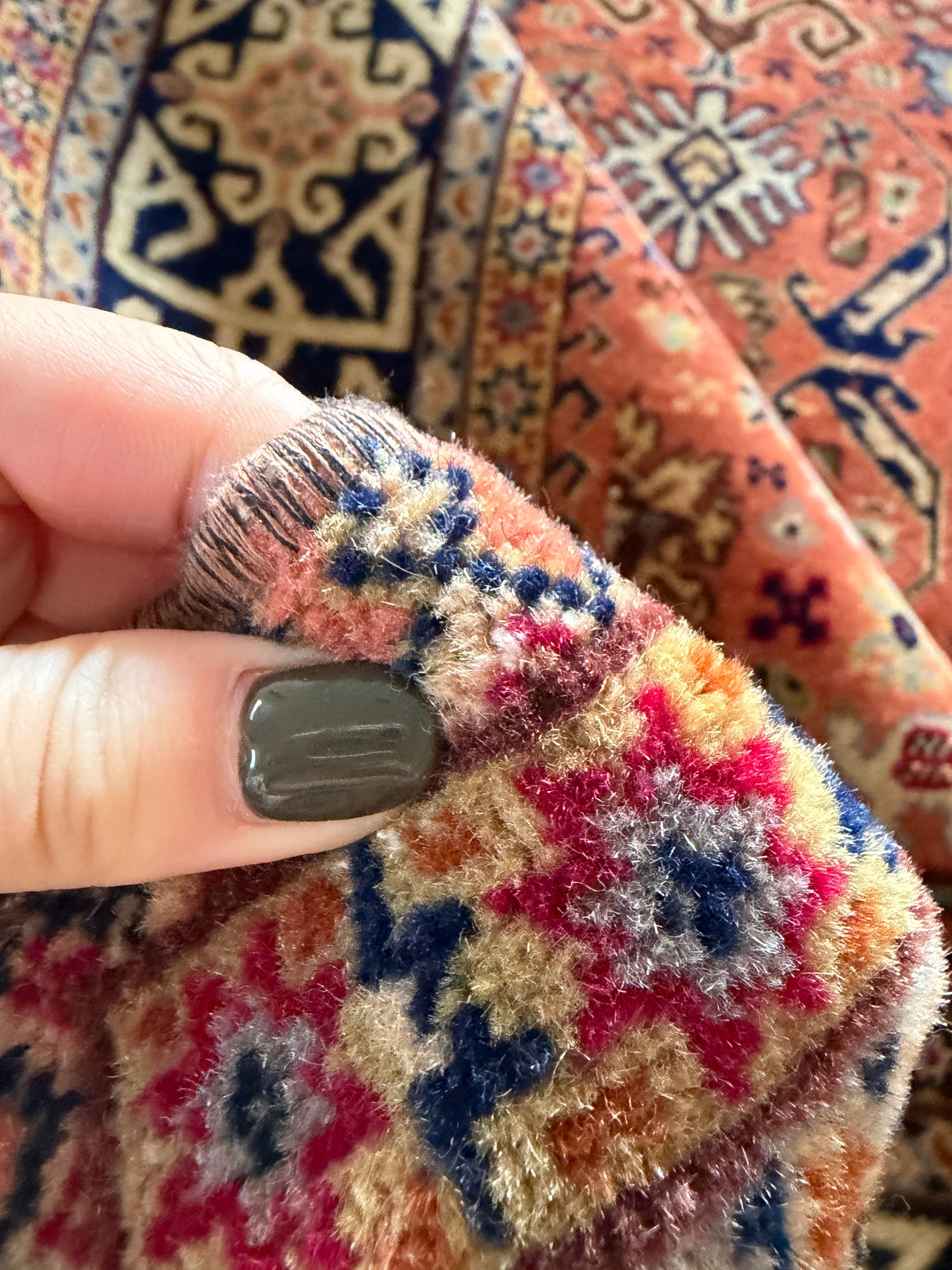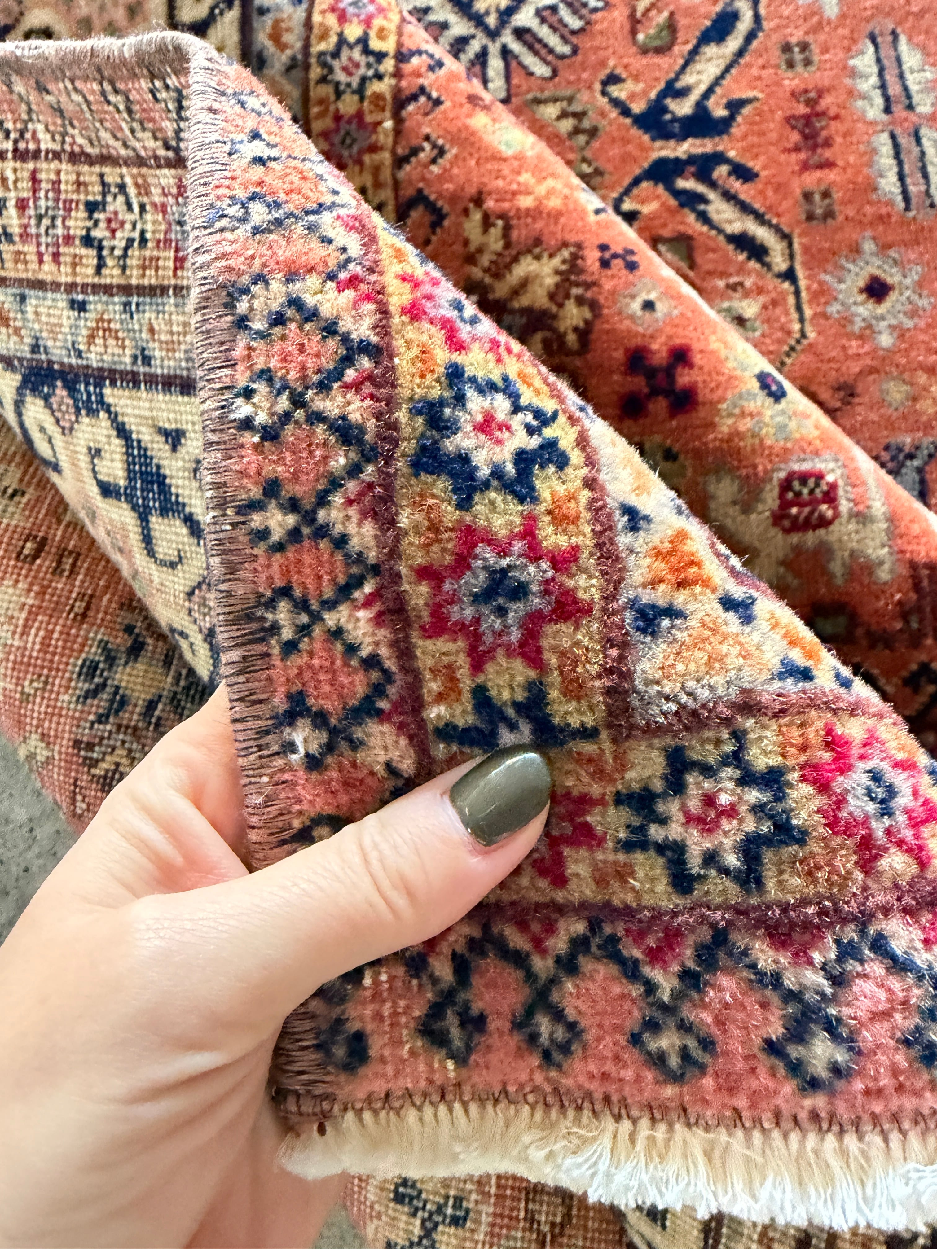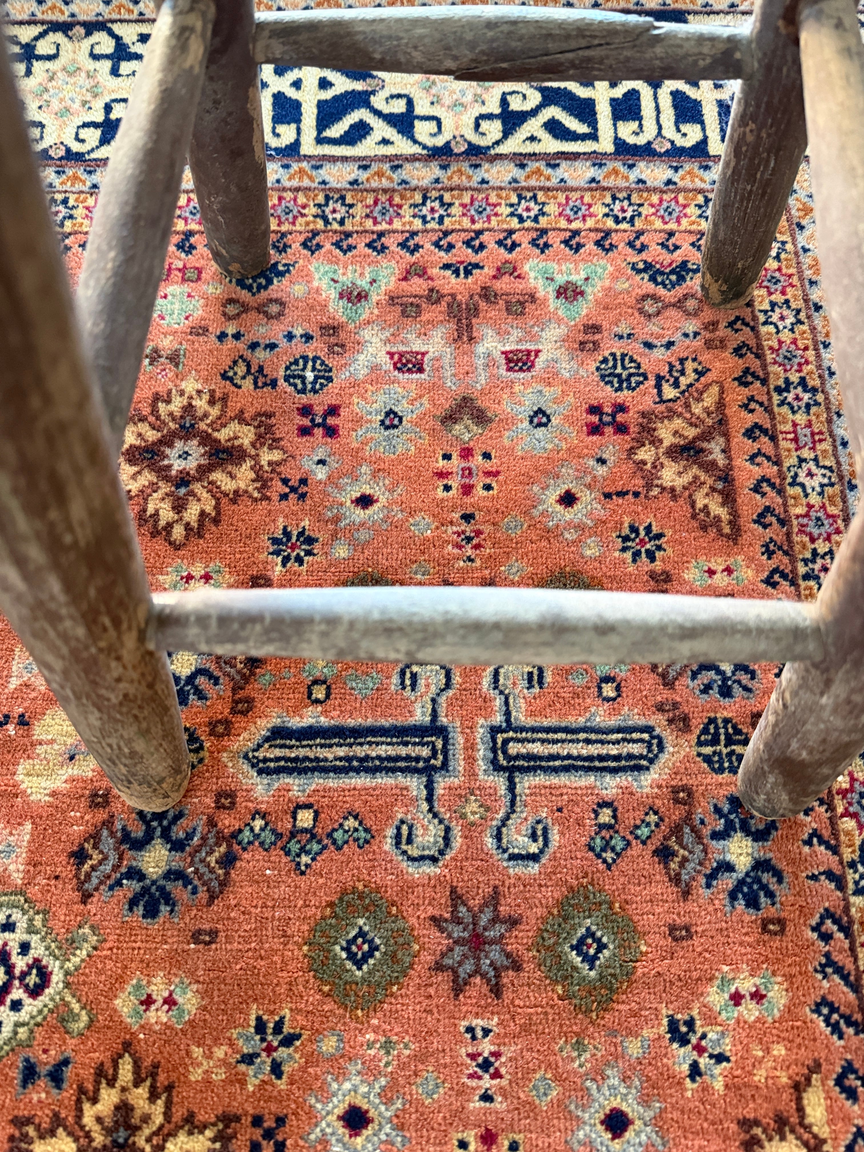 当店の代名詞とも言えるカイセリ絨毯。サーモンピンクにクラシカルな幾何学模様のめずらしい1枚。実はこちらはトルコ出張で一番最初に一目惚れ!私がかなり気に入って買い付けしたラグです。実は運命のように同じタイミングで3枚見つかり、これが最後の1枚となります。