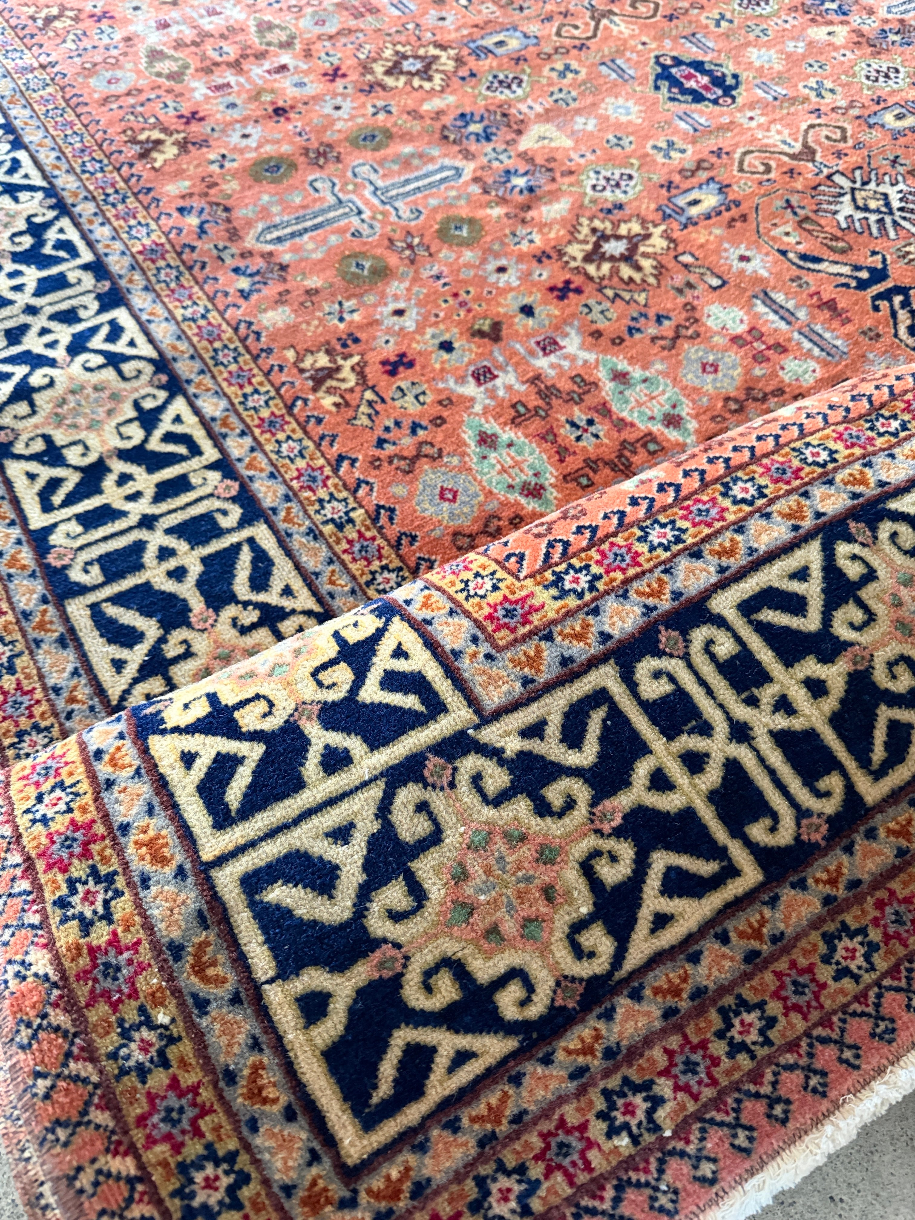 イスラムらしい幾何学模様とカイセリ絨毯らしい花模様が繊細に描かれた1枚。初めて出会っためずらしいデザインです。サーモンピンクを取り囲むネイビーブルーの模様が上品さを感じさせてくれます。