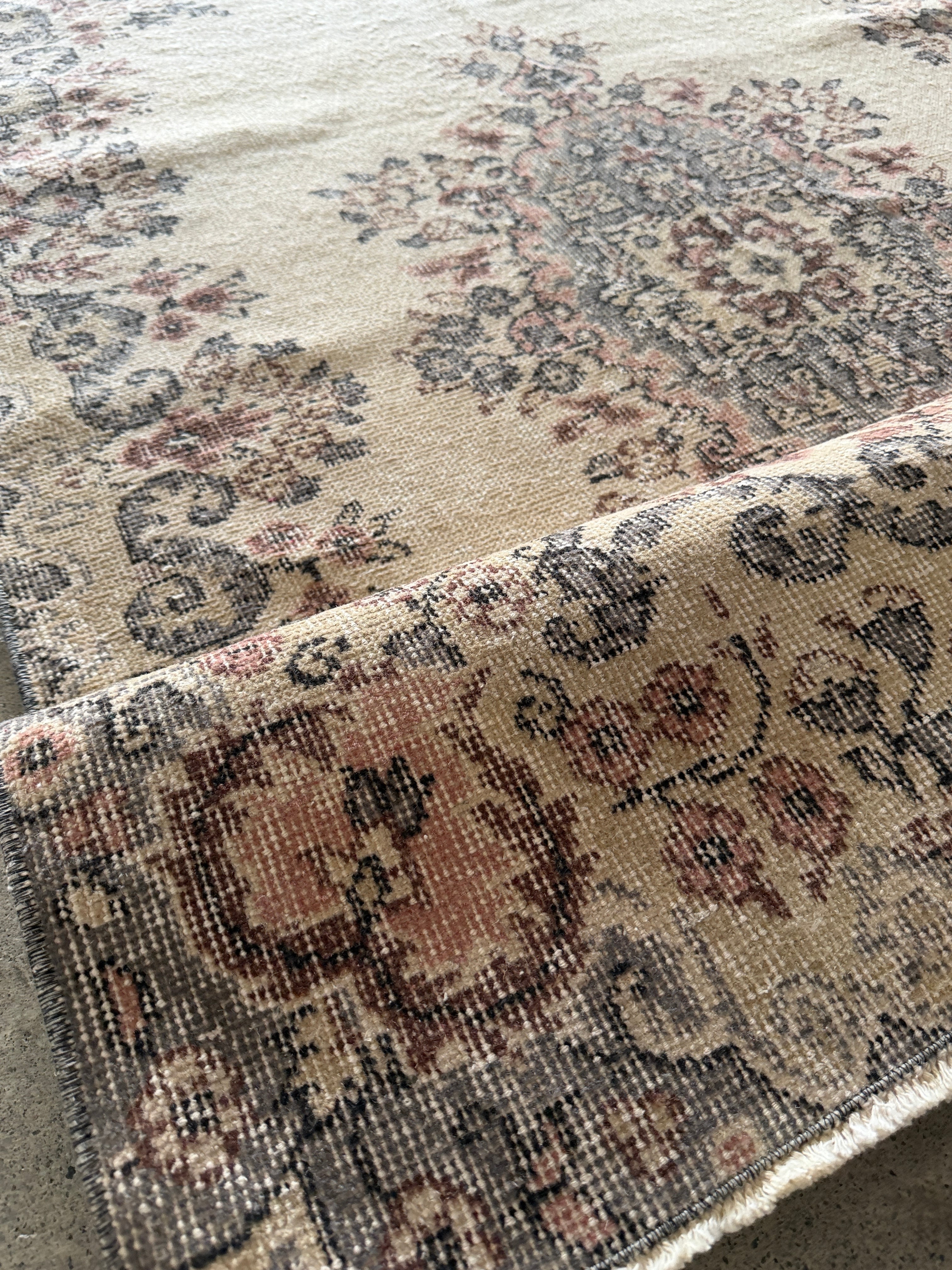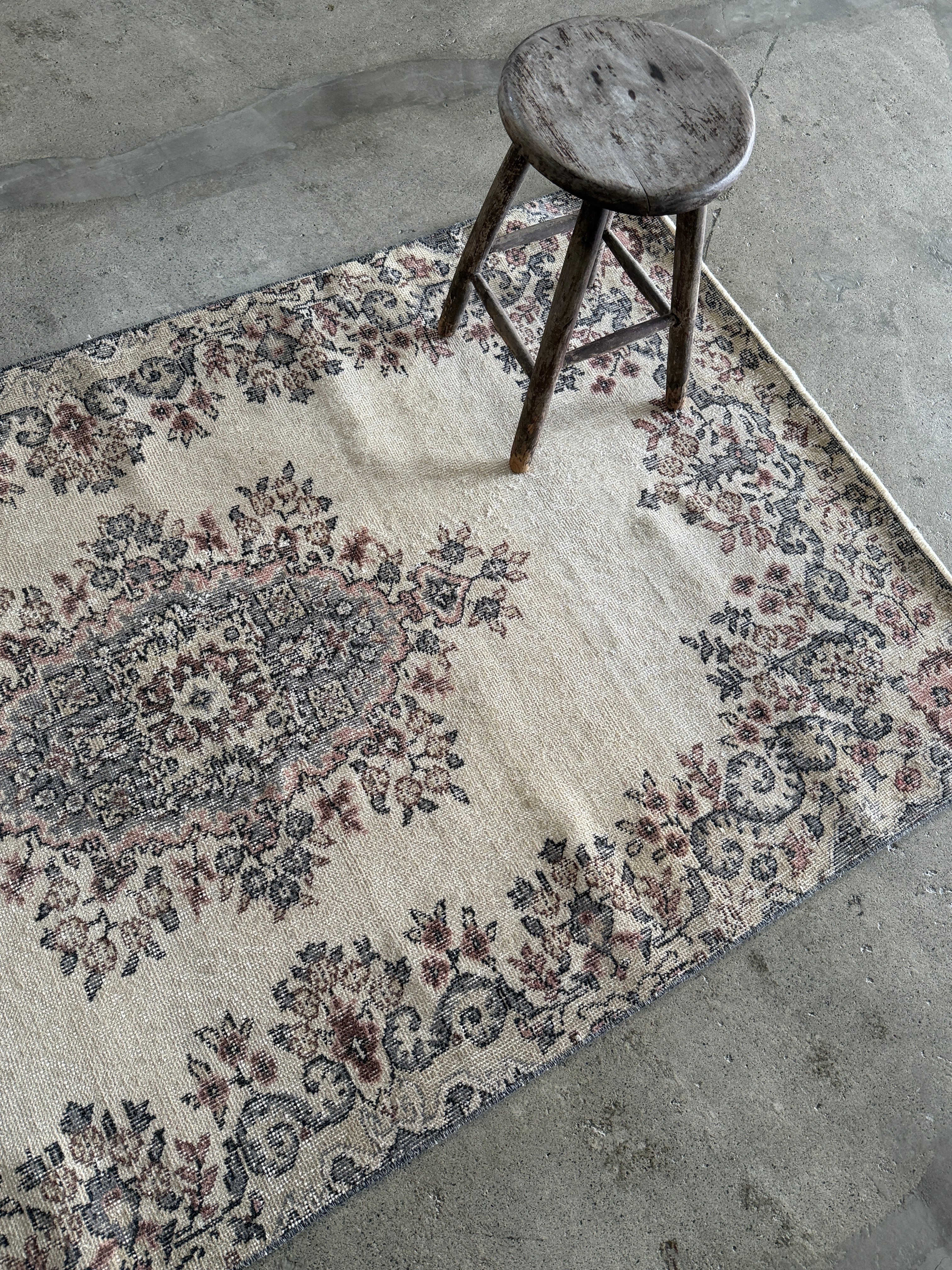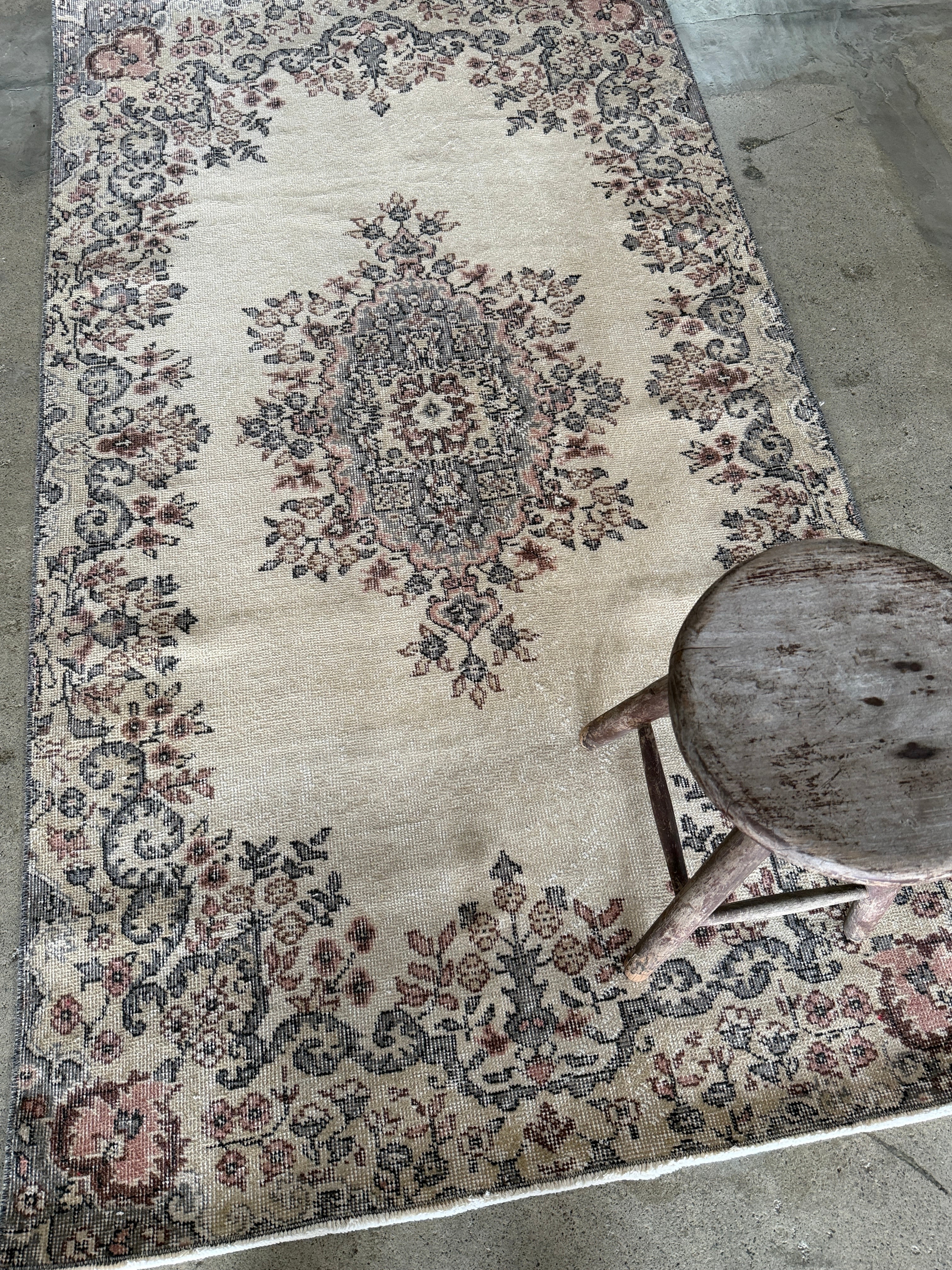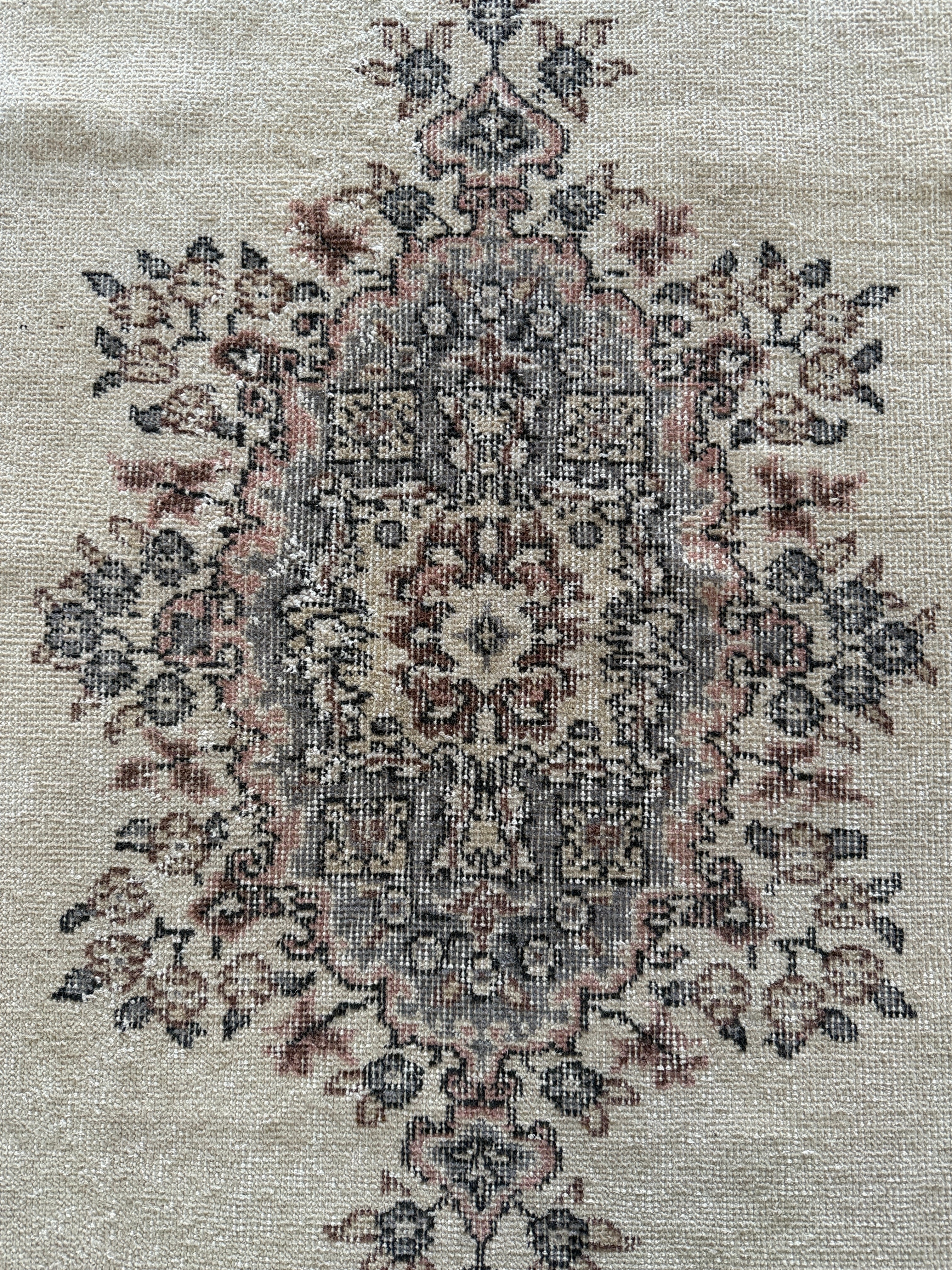 こちらは同じデザインが2枚ある双子ラグ。全く同じ色合いとデザインが見つかることはめずらしく、貴重だそうです。ナチュラルベージュにパステル調のやわらかな色使いと、中央の上品なメダリオンのバランスが美しいラグです。