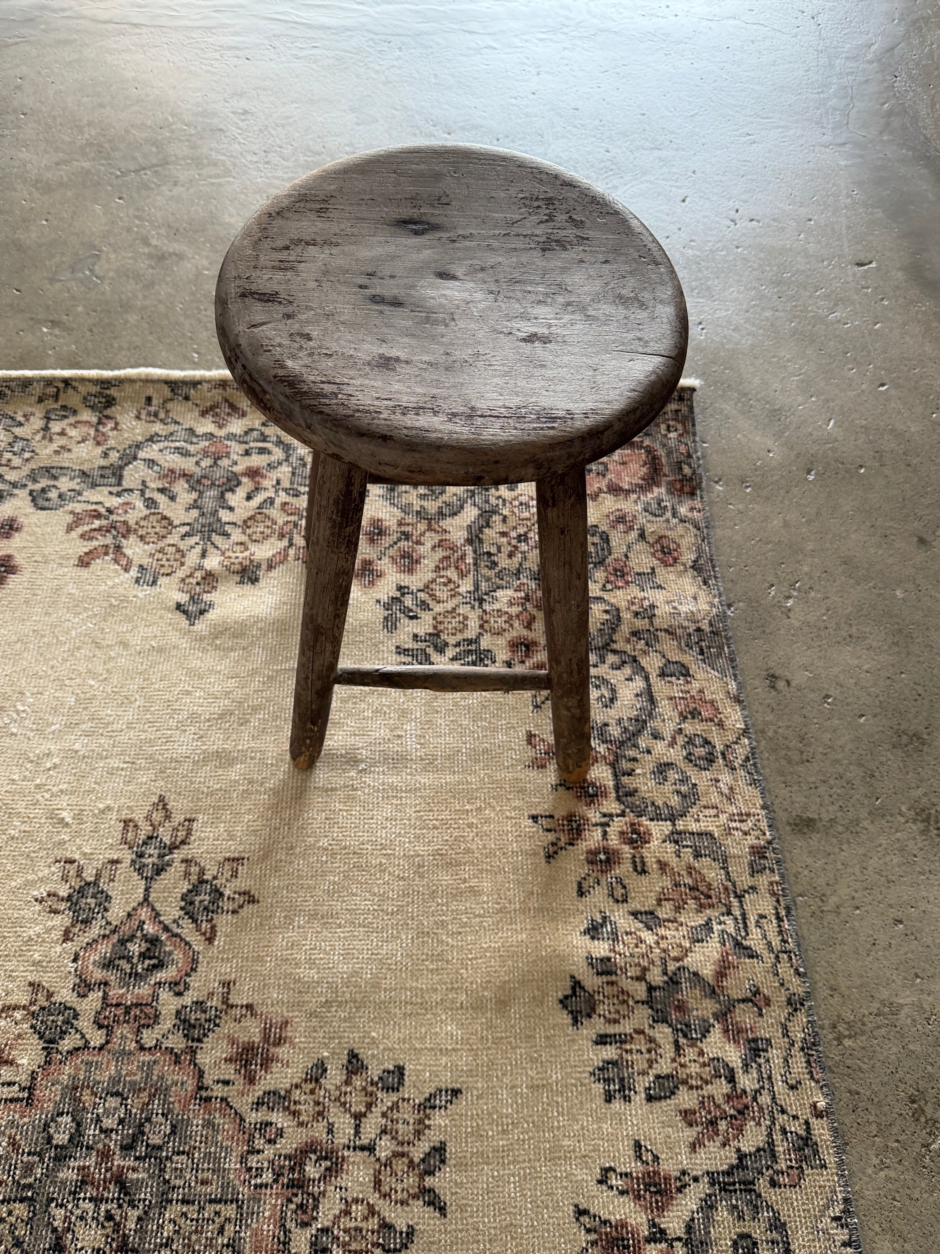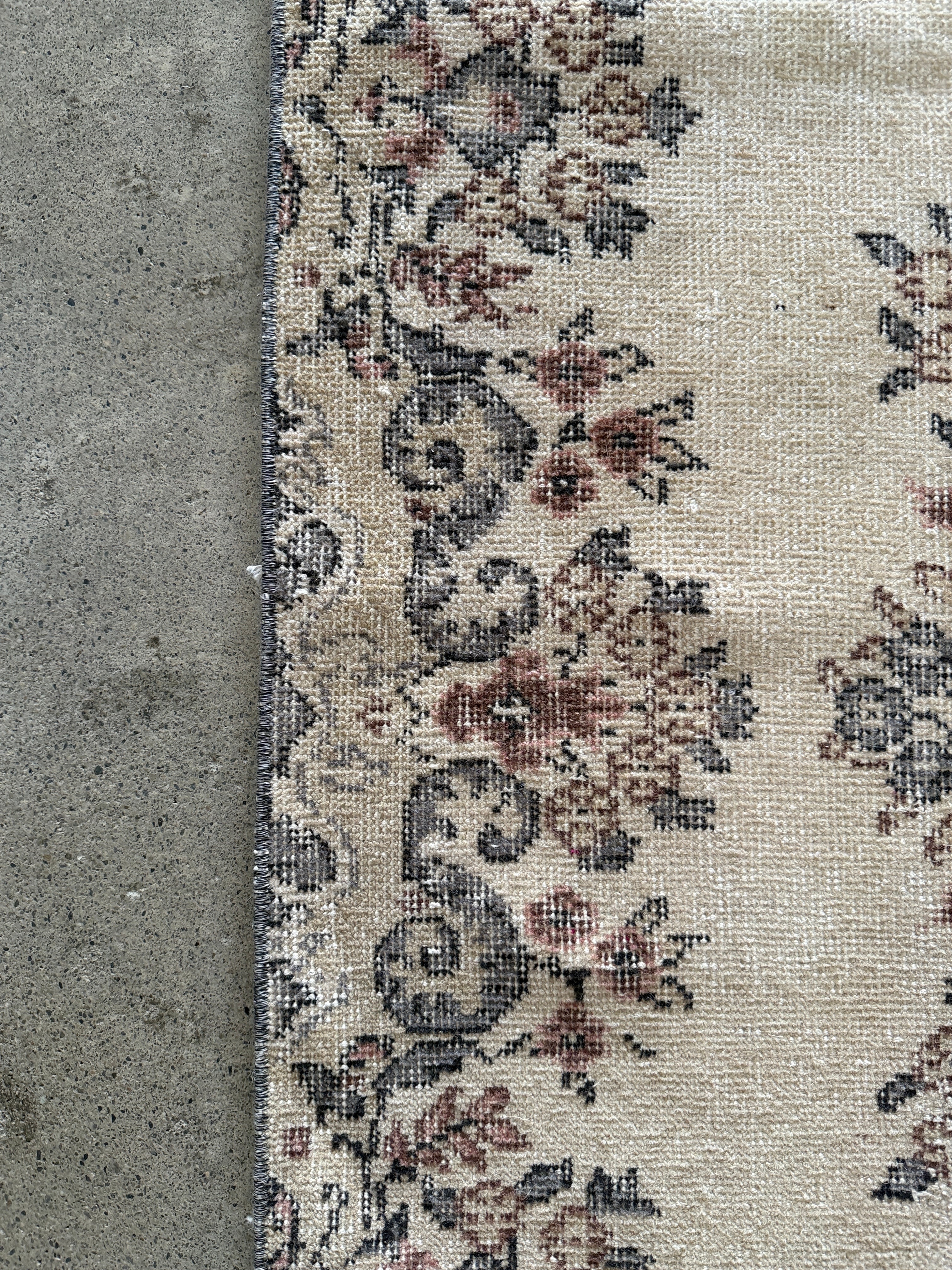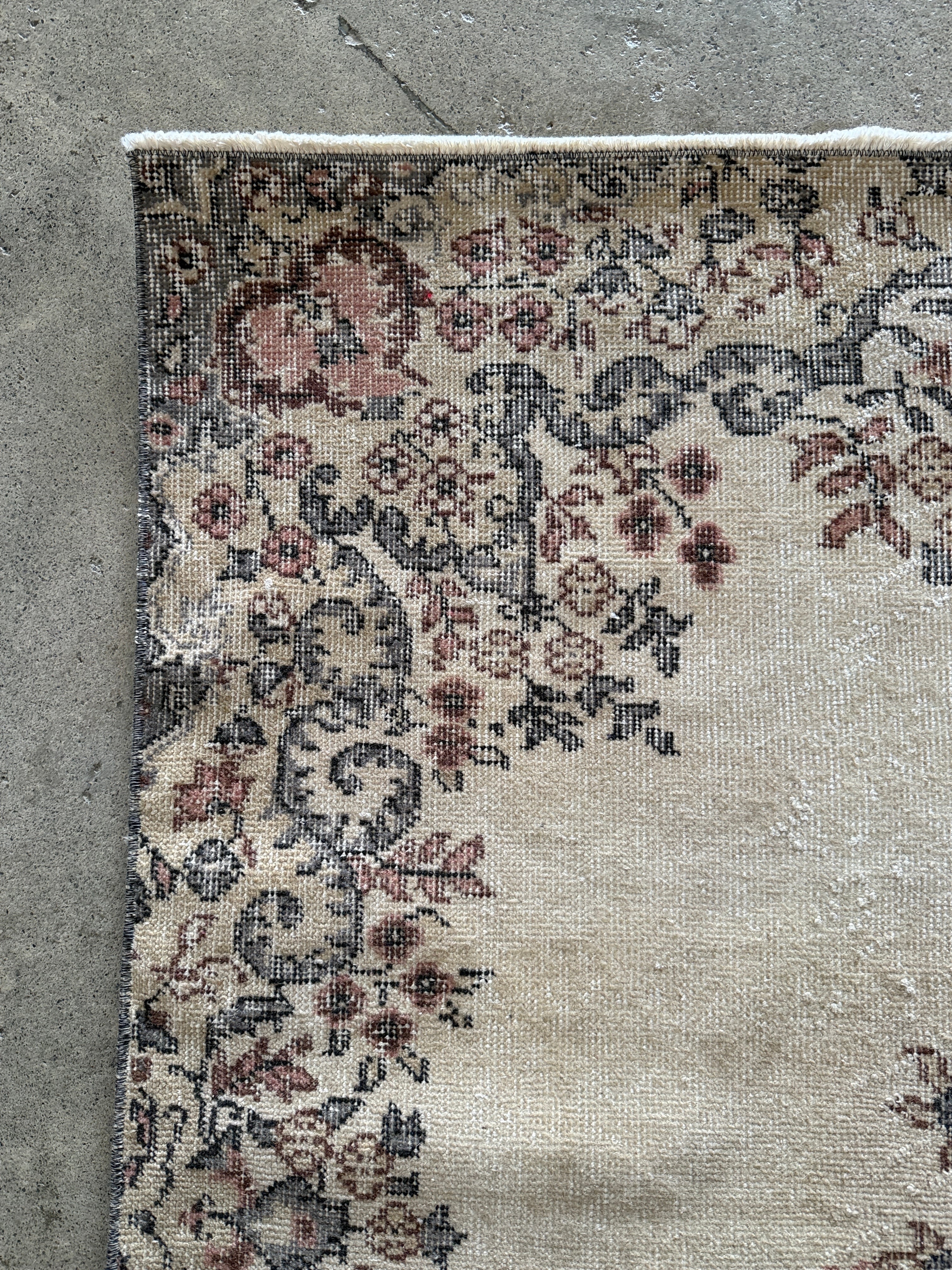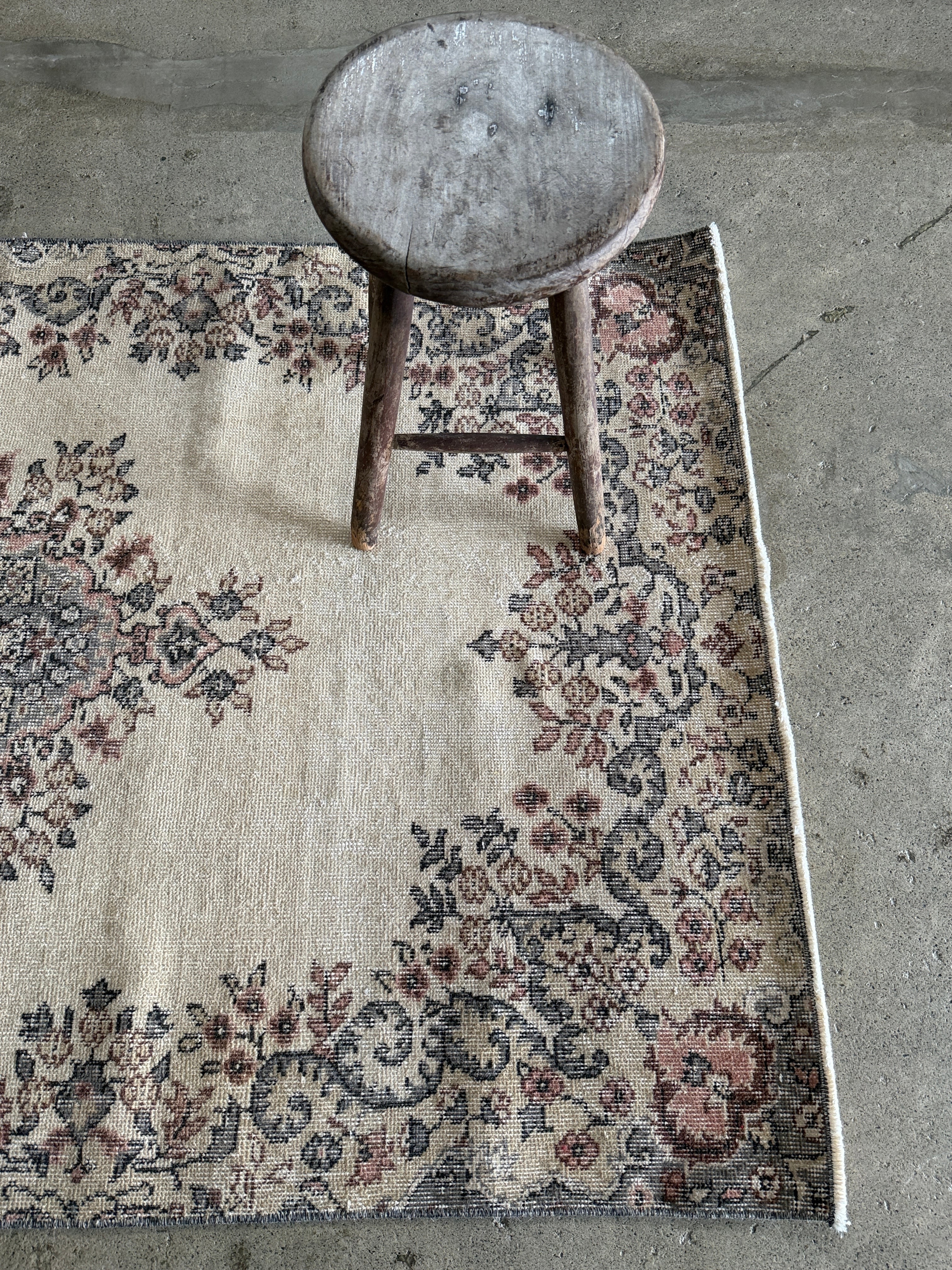 こちらは同じデザインが2枚ある双子ラグ。全く同じ色合いとデザインが見つかることはめずらしく、貴重だそうです。ナチュラルベージュにパステル調のやわらかな色使いと、中央の上品なメダリオンのバランスが美しいラグです。