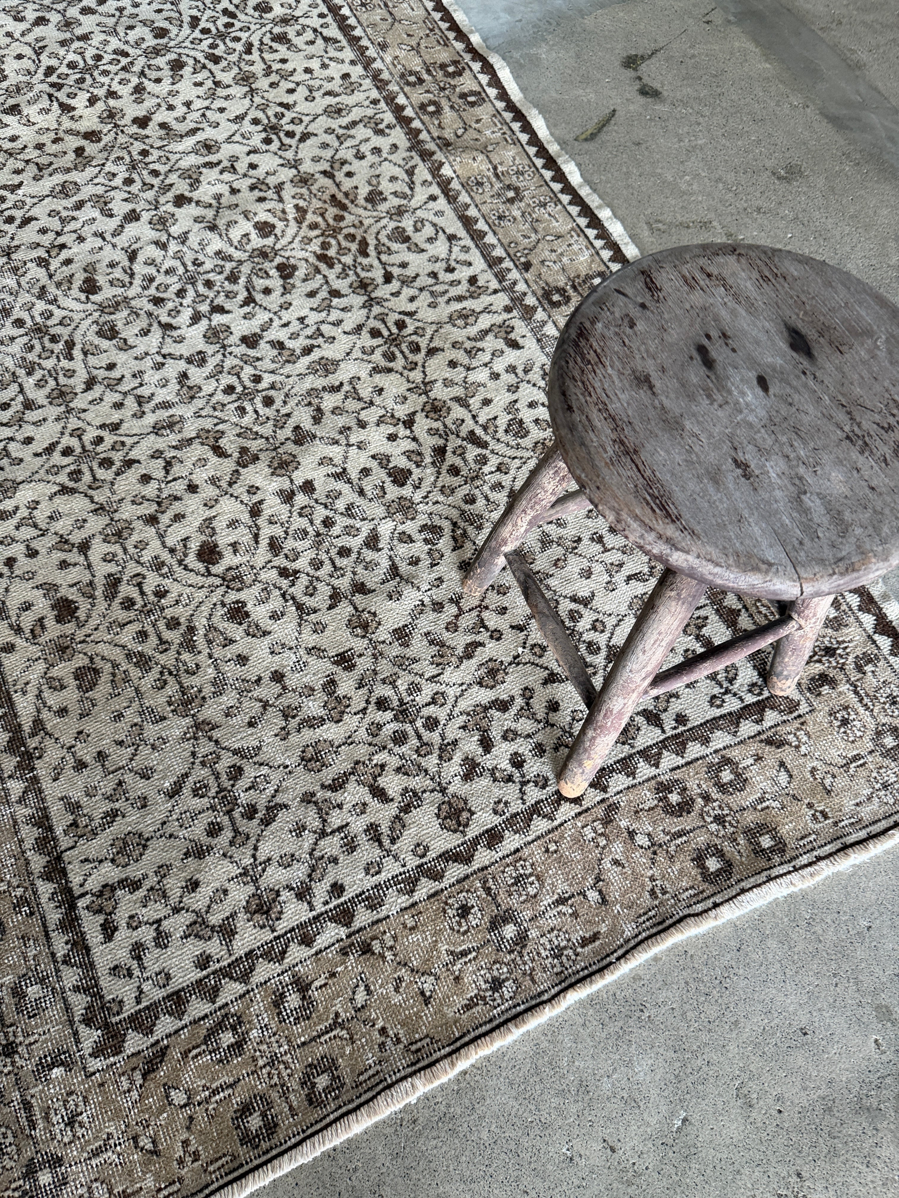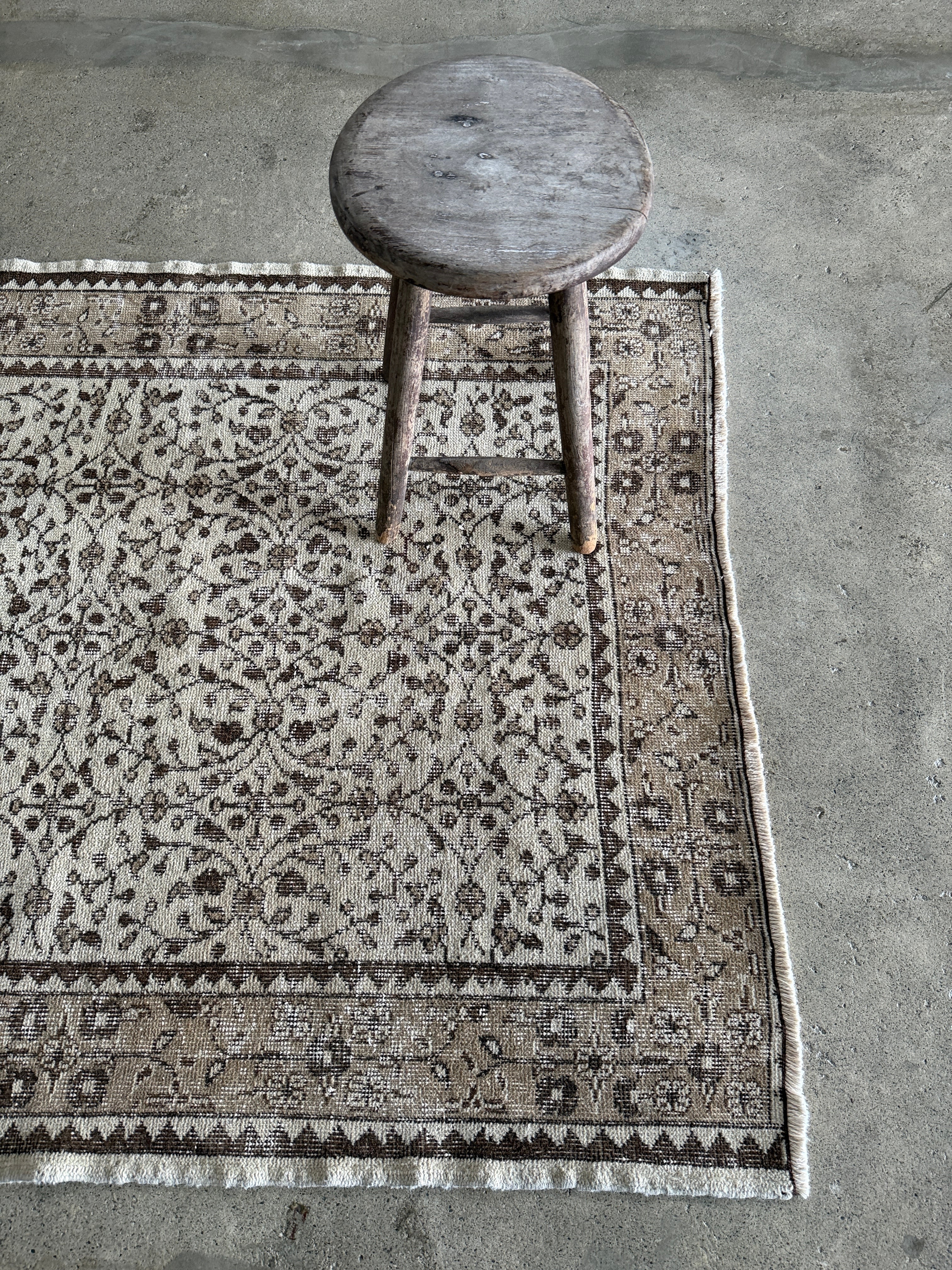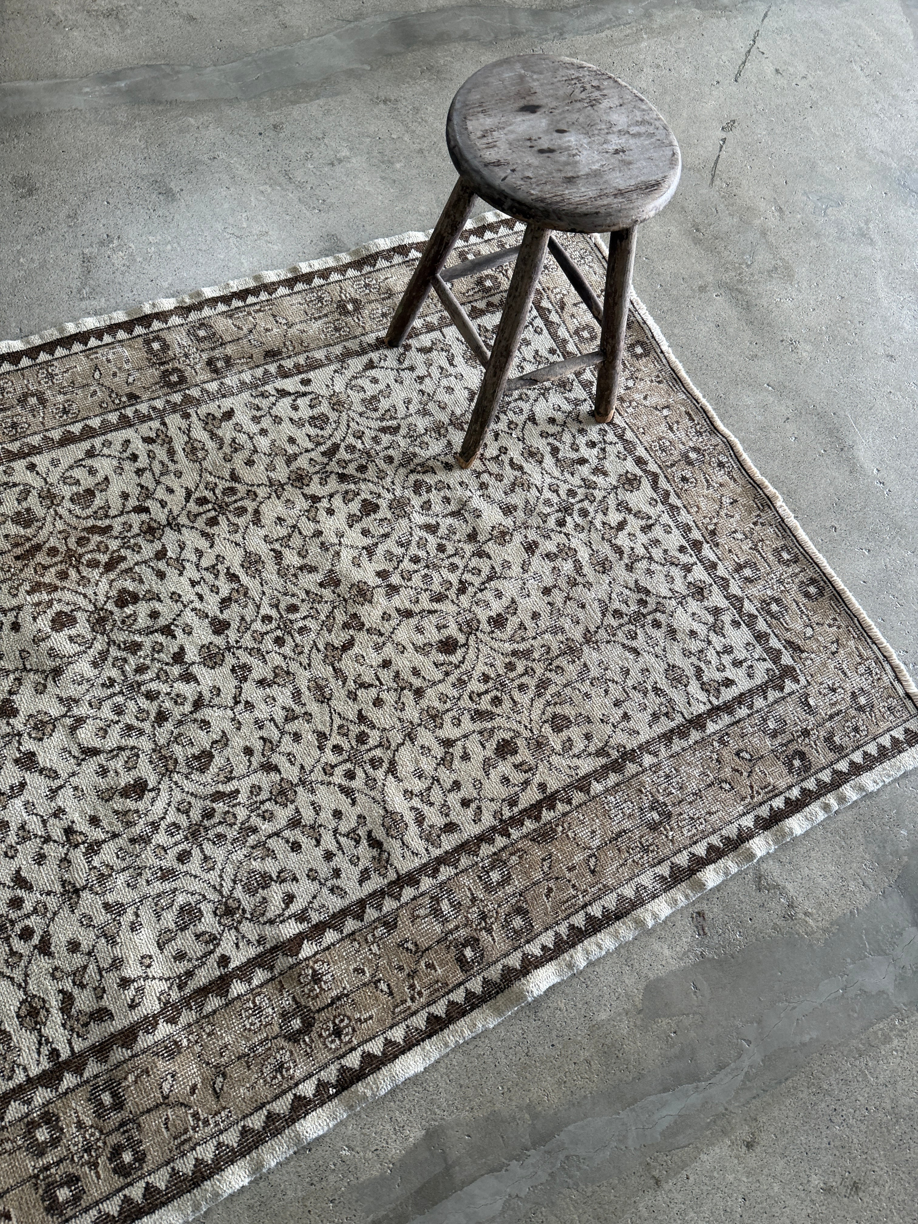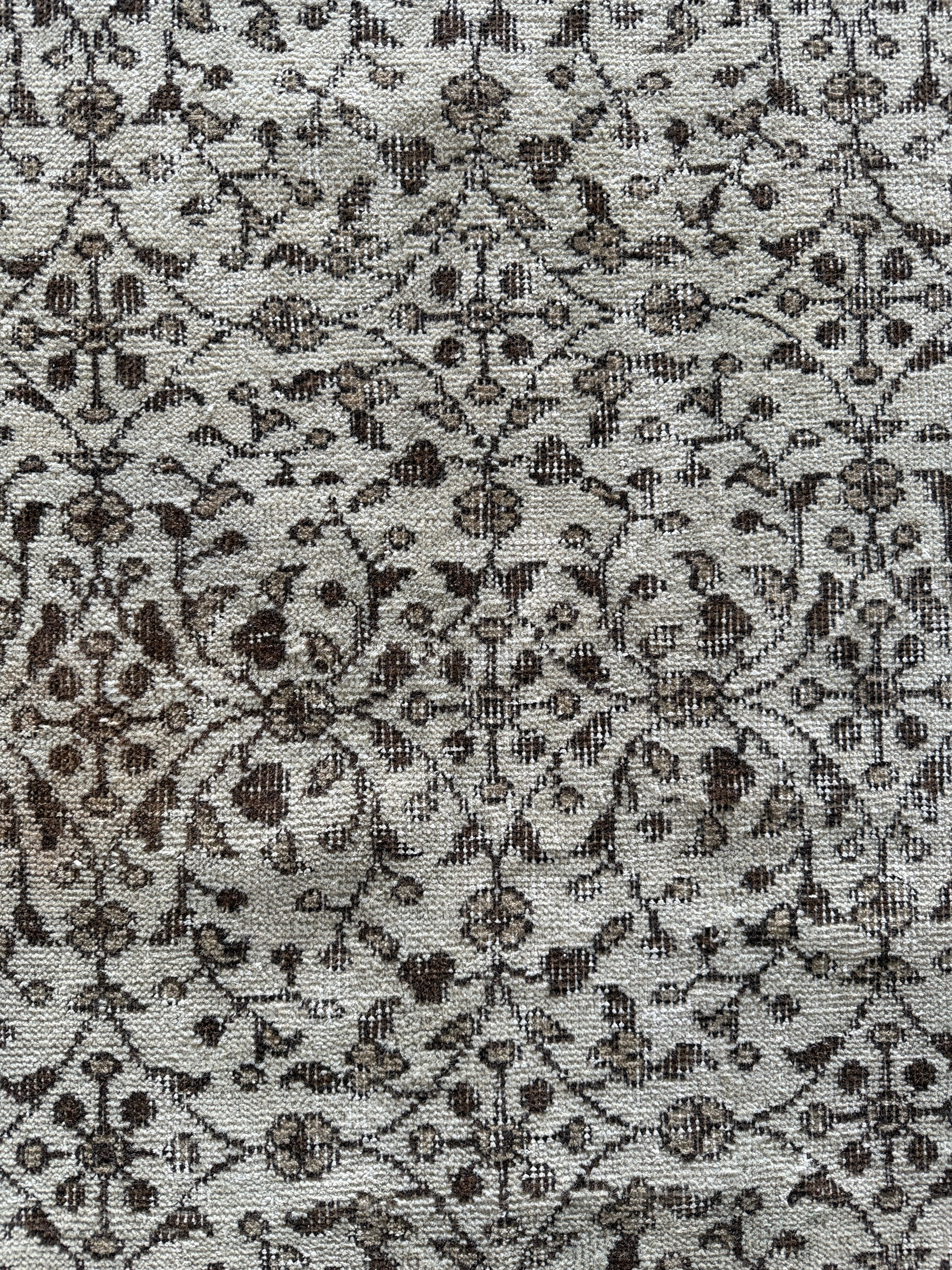 こちらはウール本来の色合いを活かした染料不使用のナチュラルなラグ。シンプルな草木模様があしらわれたシックな1枚。サイドのミシン加工もなく織られた時そのままの雰囲気を感じていただけます。