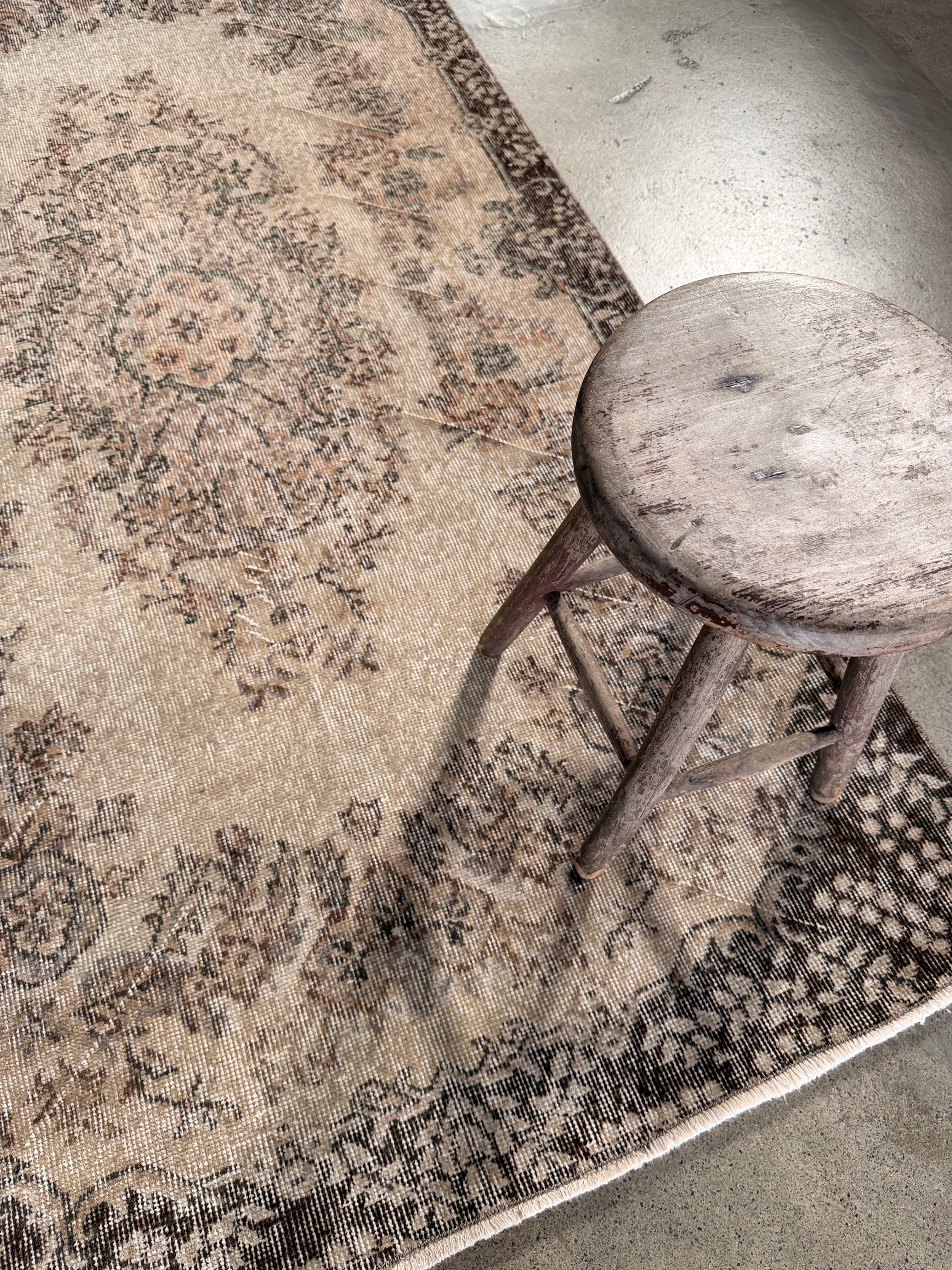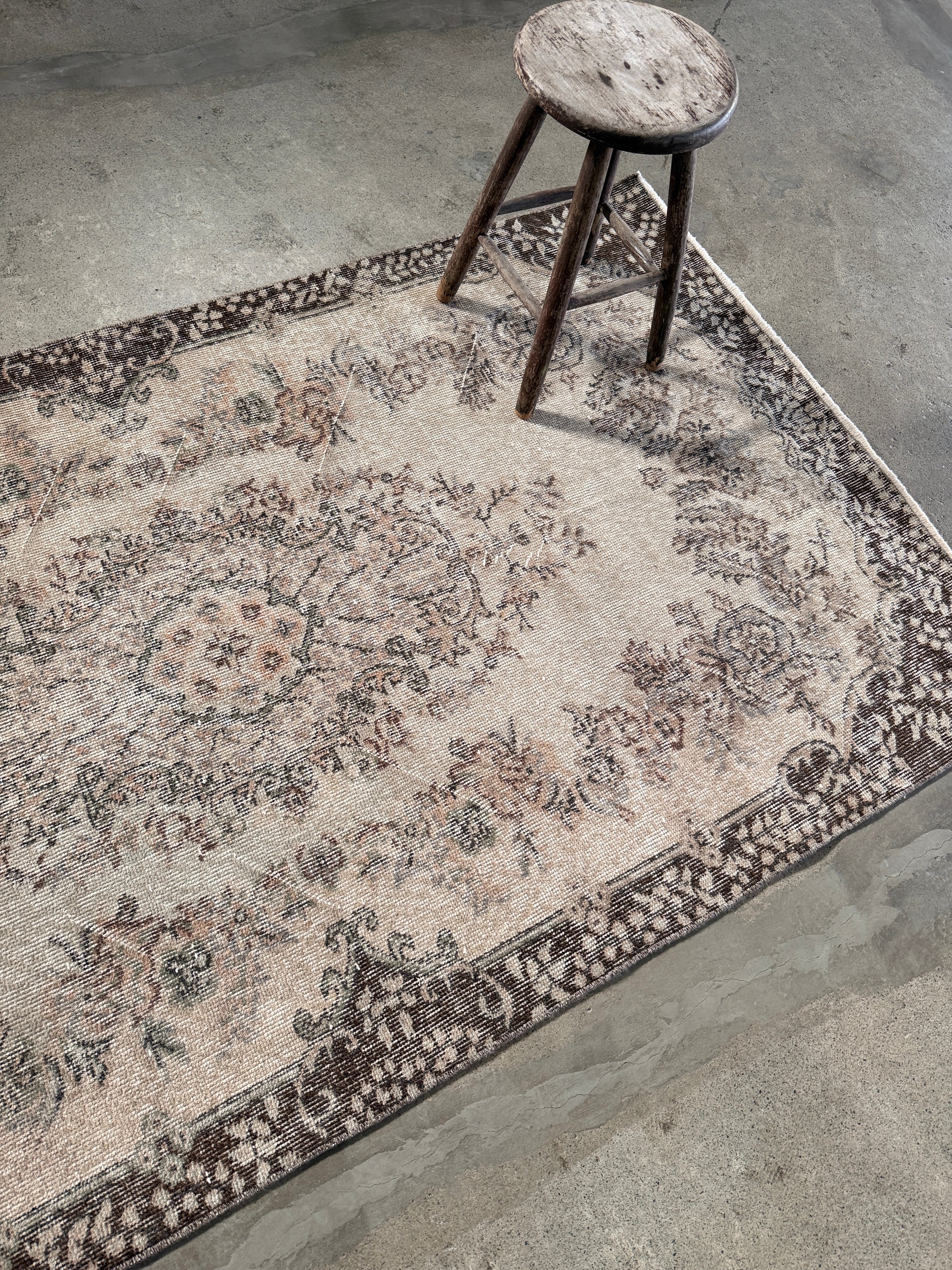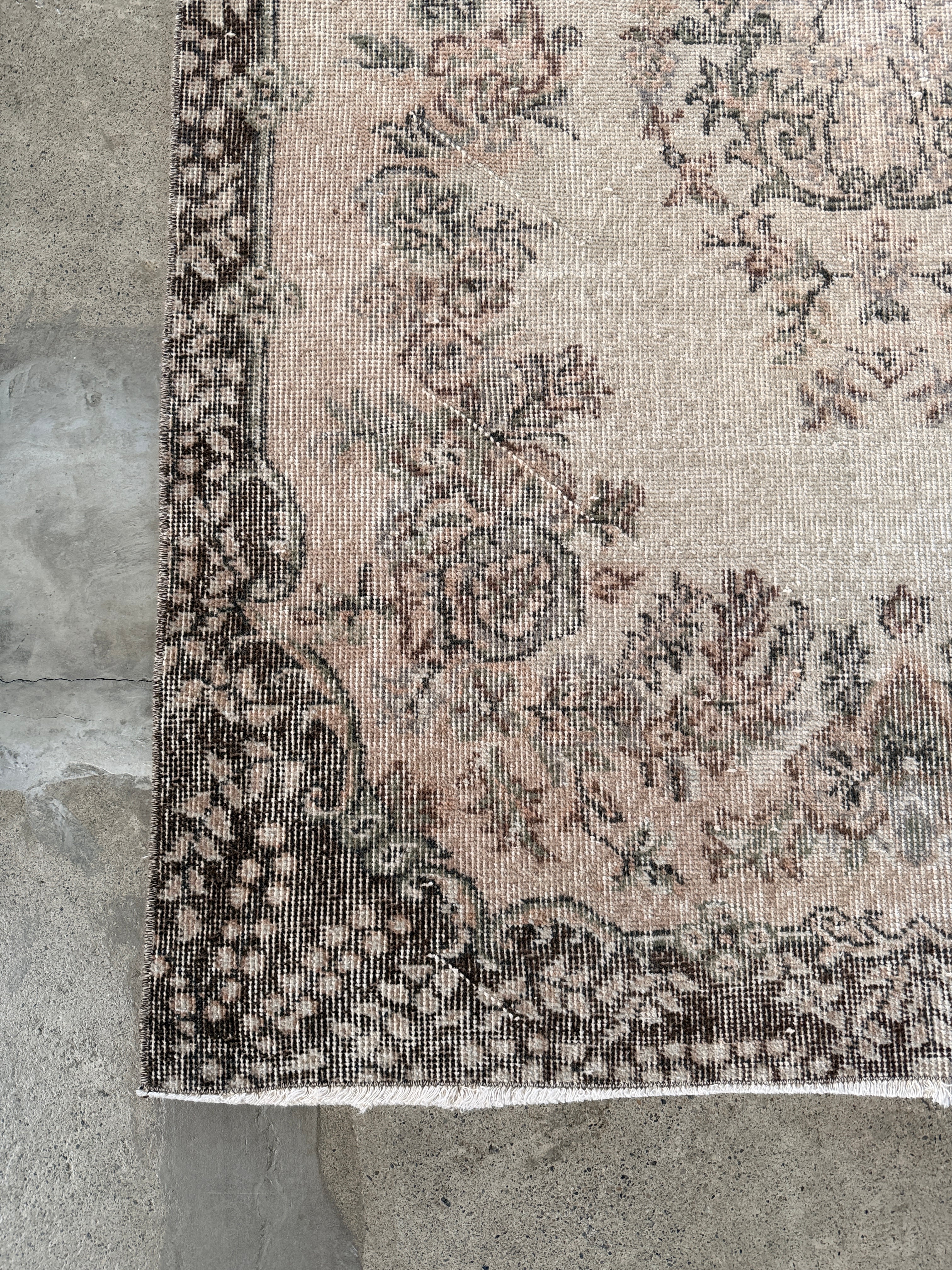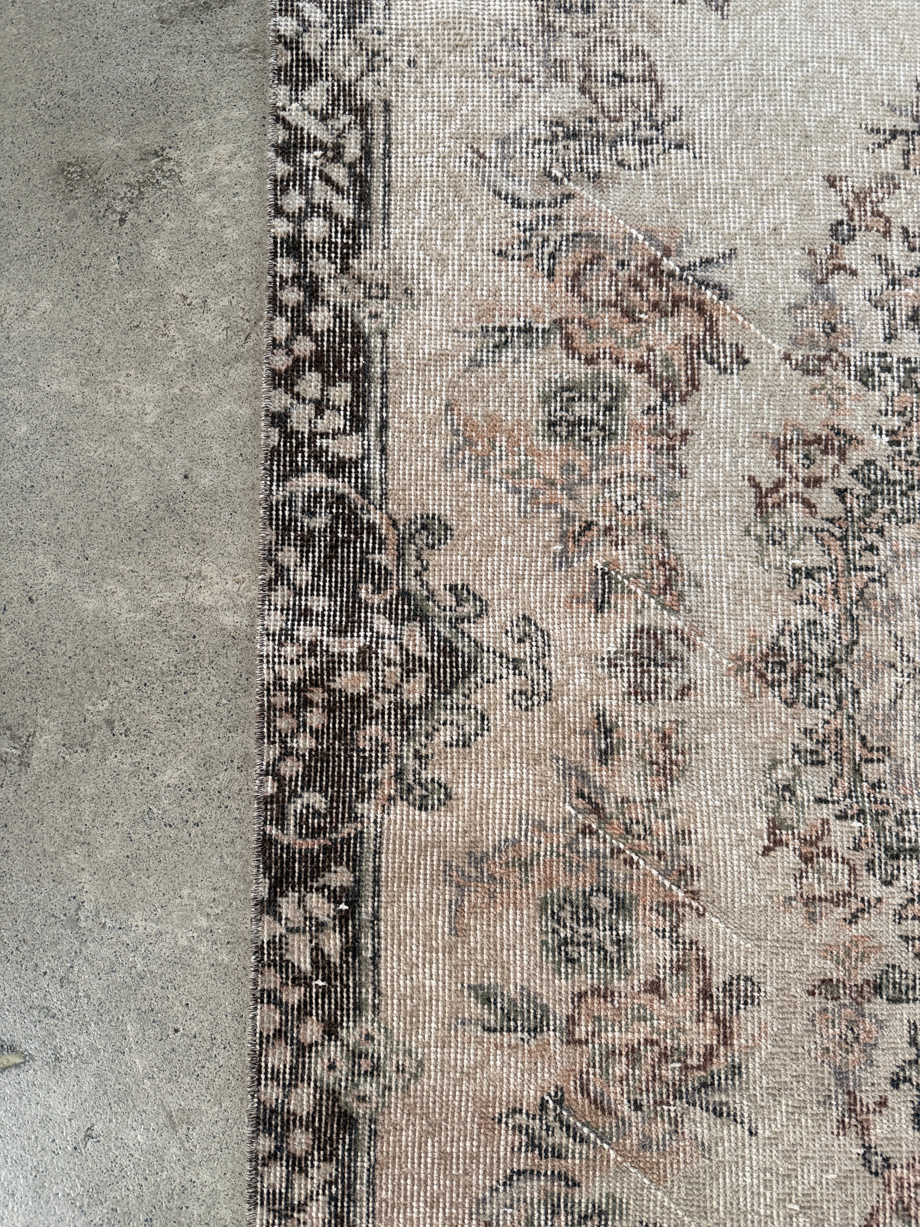イスパルタ絨毯の代表的なデザインから、淡いピンクベージュのアンティーク感たっぷりに1枚をセレクトいたしました。華やかな花模様に落ち着いたブラウン、淡いピンクの色合いが温かみを感じさせてくれます。
