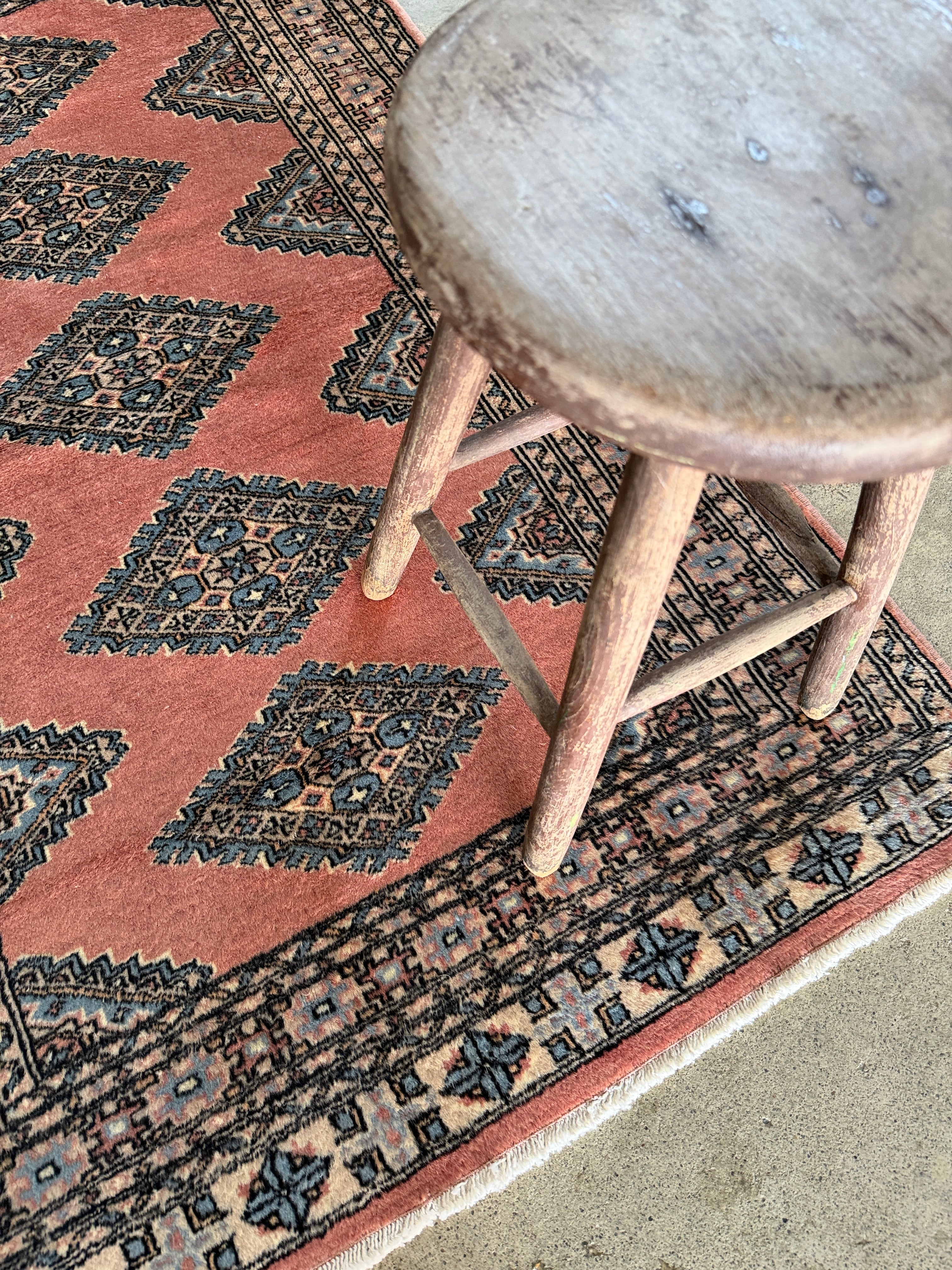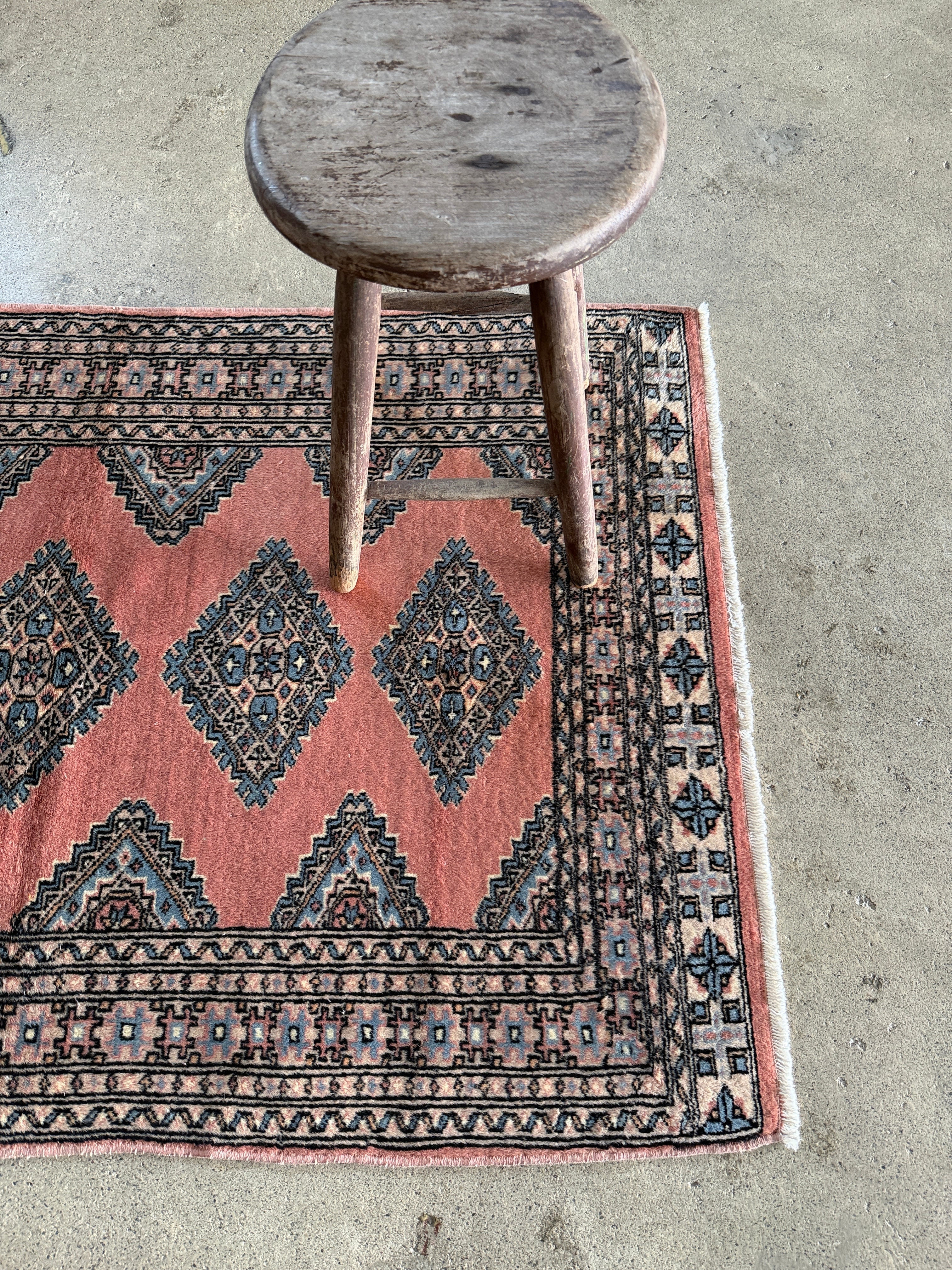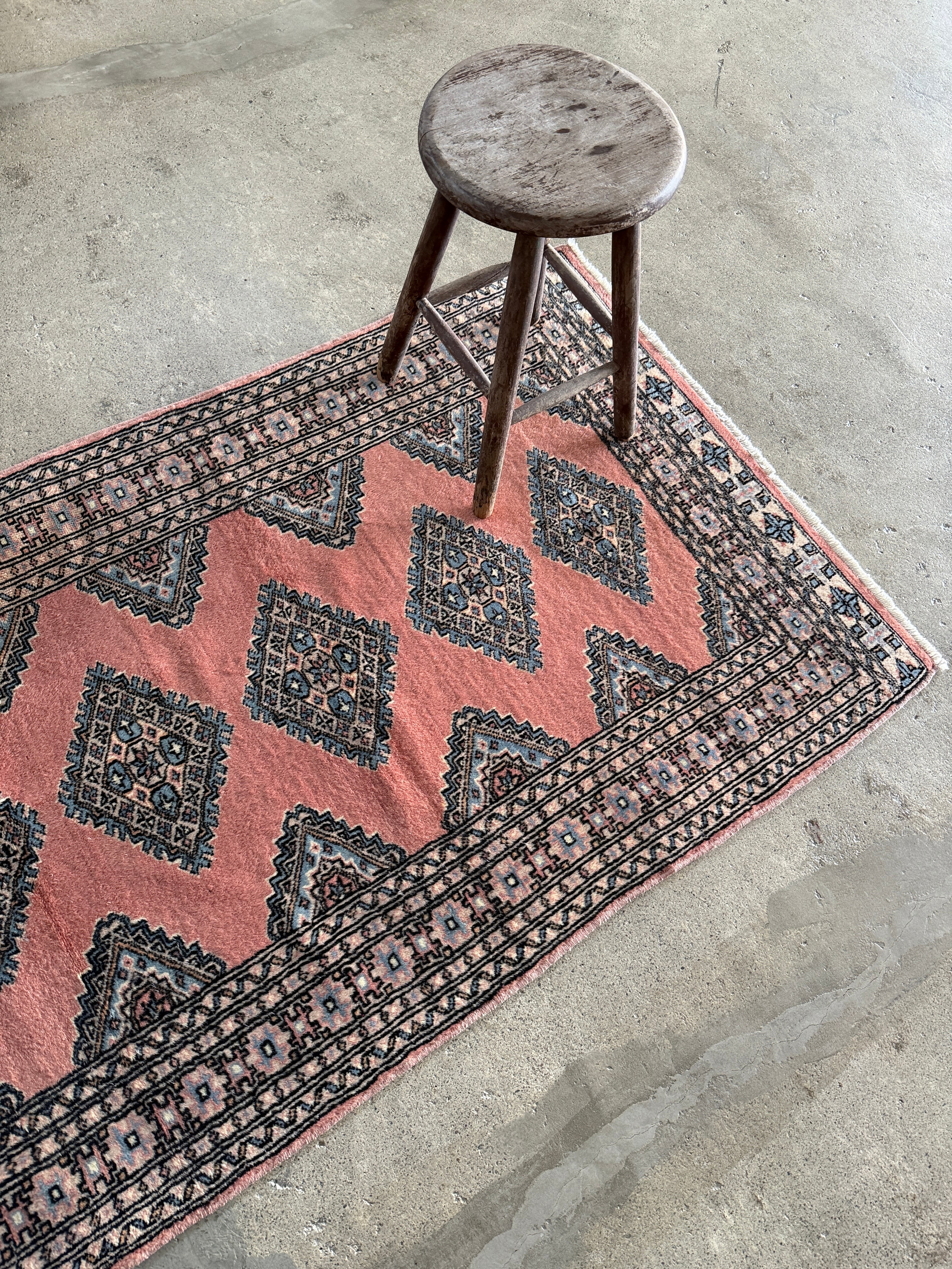 カイセリでの買い付けの際に偶然見つけた、可愛らしいサーモンピンクが印象的なパキスタンラグです。ピンクとブルーの組み合わせがAntiques&Crafts880らしいなと思い、セレクトさせていただきました。玄関マットやお部屋のちょっとしたスペースにご活用くださいませ。