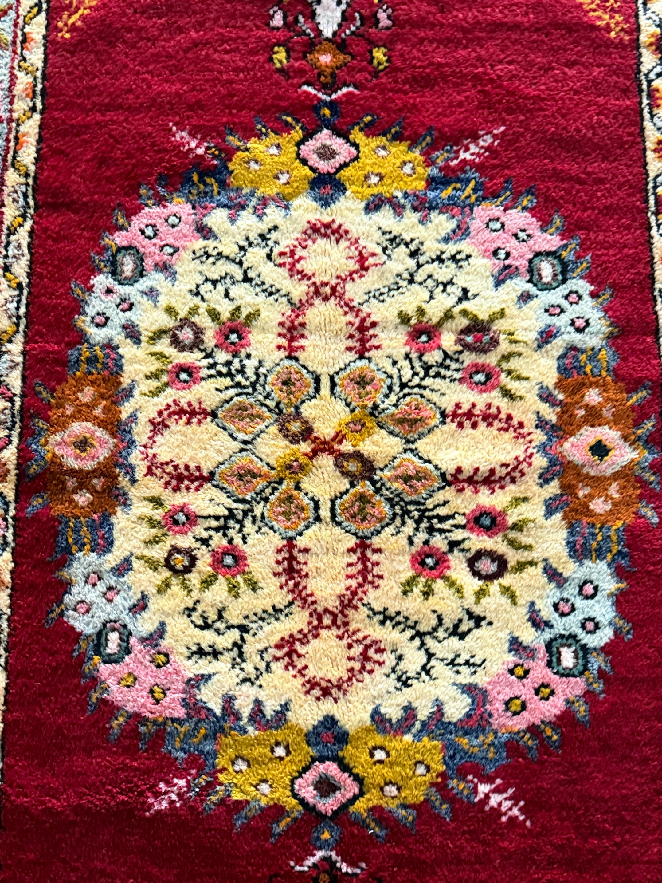 永遠の憧れ!人気モノのギュネイ絨毯からオリジナルの状態で美しい1枚を見つける事ができました。エーゲ海に近いエリアのギュネイらしいエネルギッシュなメダリオンと鮮やかな赤が印象的なラグ。状態も良くフカフカで柔らかな肌触りを感じていただけます。
