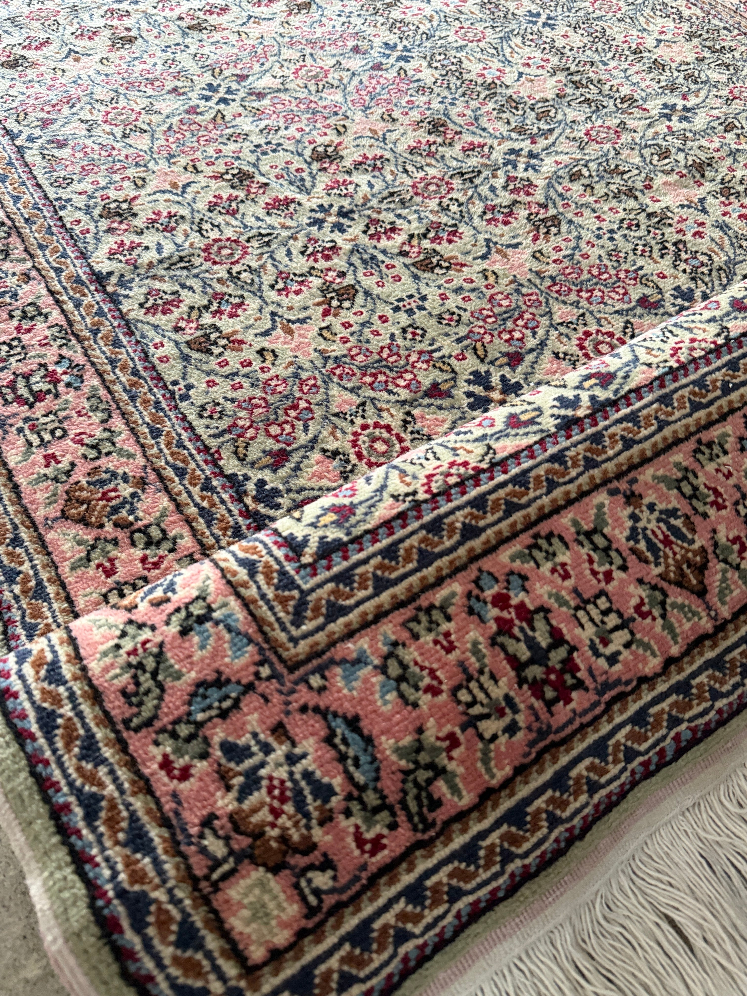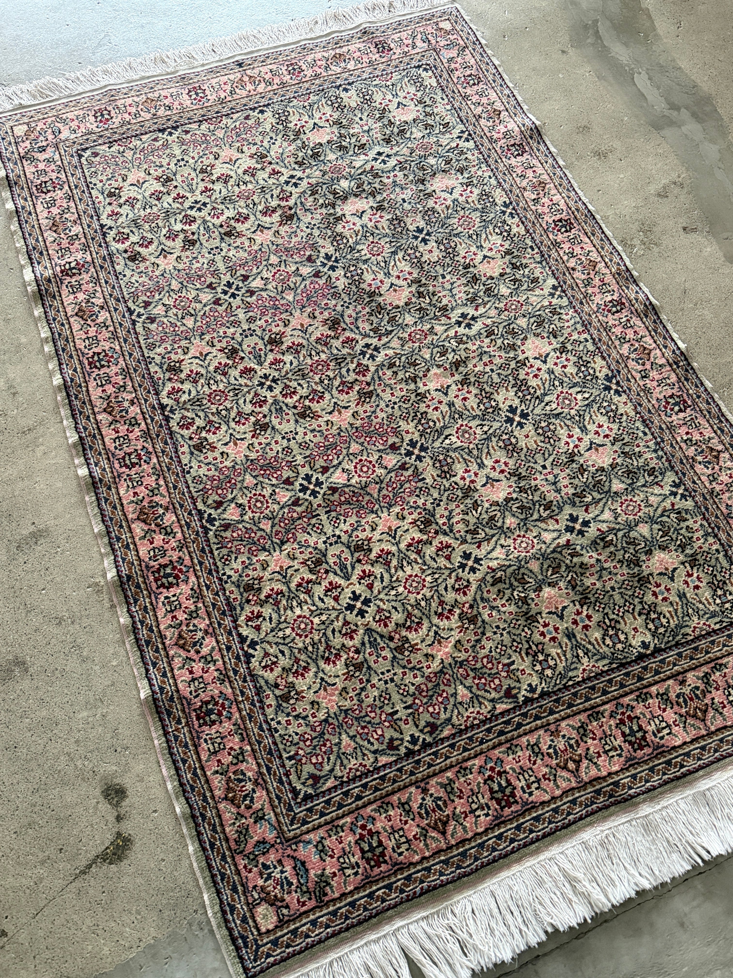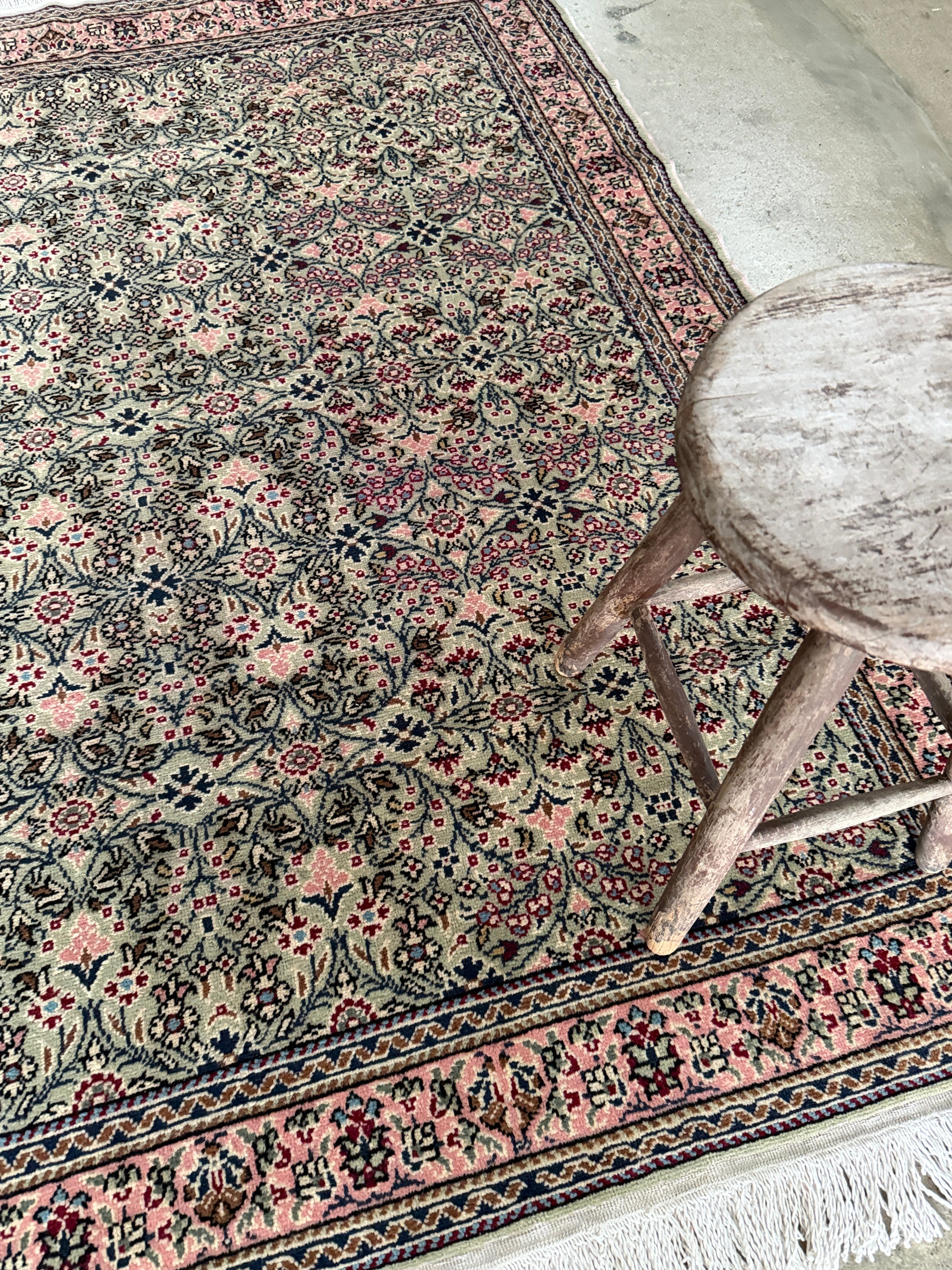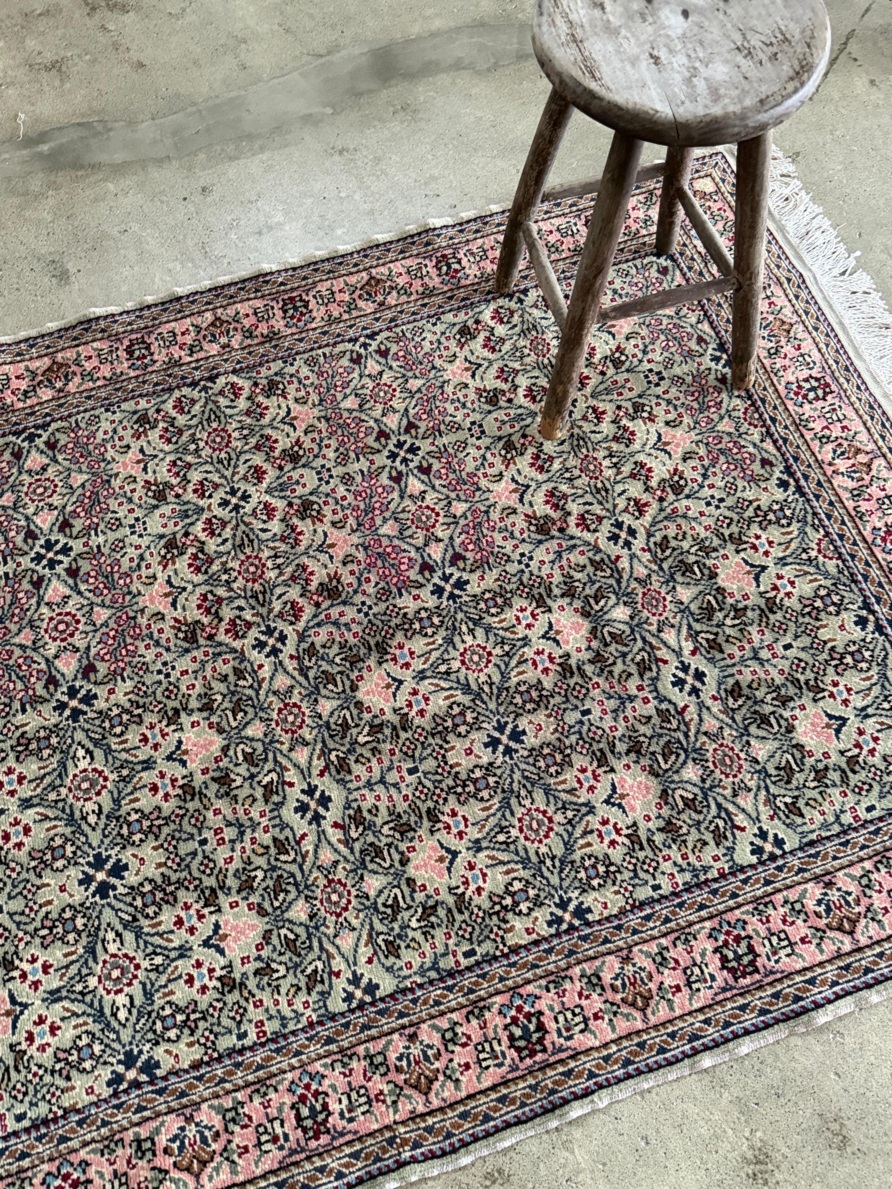 人気のカイセリ絨毯からデッドストック(未使用品)のご紹介です。王道の小花模様デザインに淡いグリーンとピンクという最高に可愛らしい組み合わせでございます!繊細な模様に華やかなフリンジ。織られた時のまま全く使われていなかったことが分かります。フワフワに柔らかな毛足に滑らかな艶。壁に飾りたくなるような絵画のように美しい芸術品です。