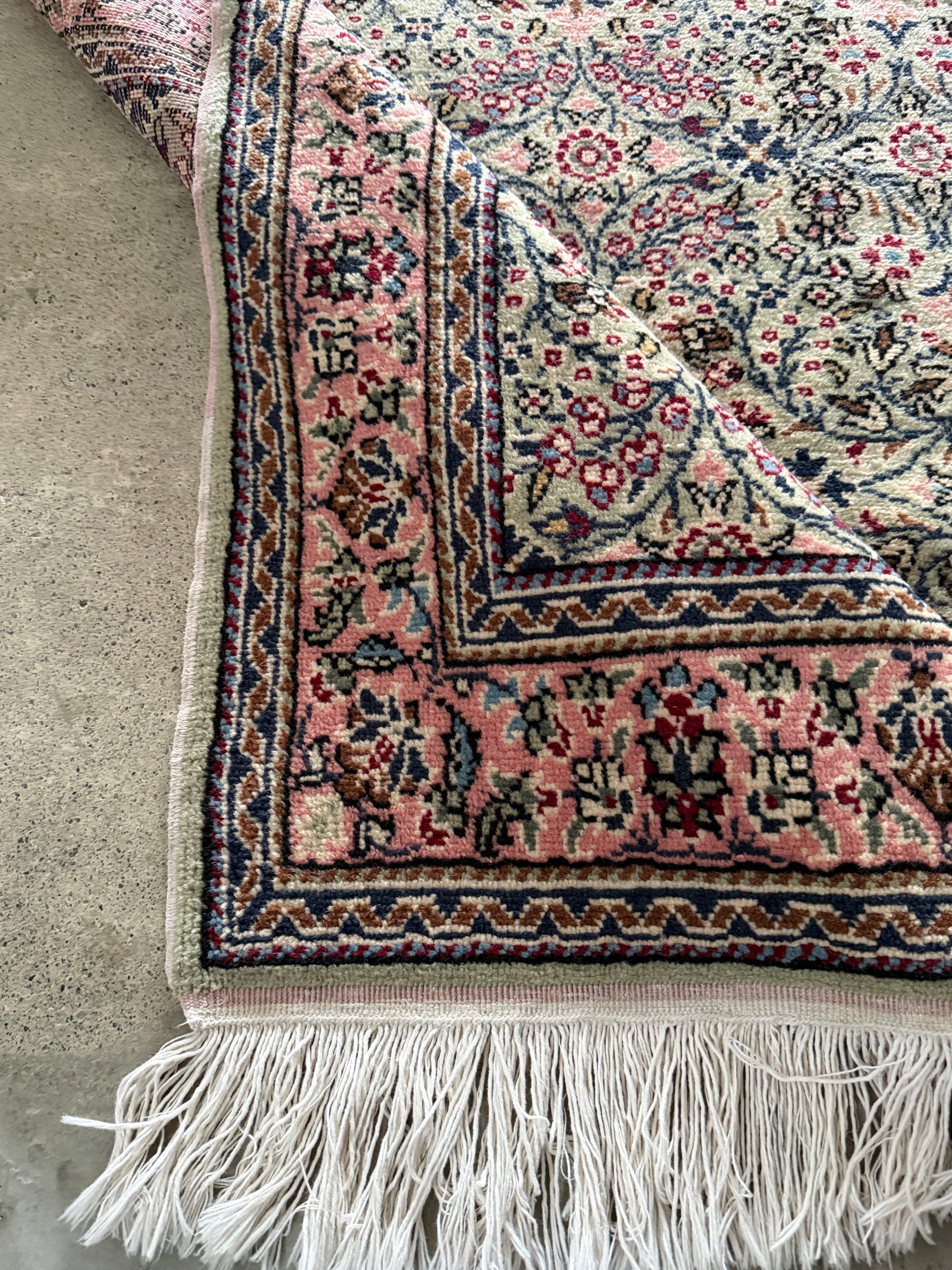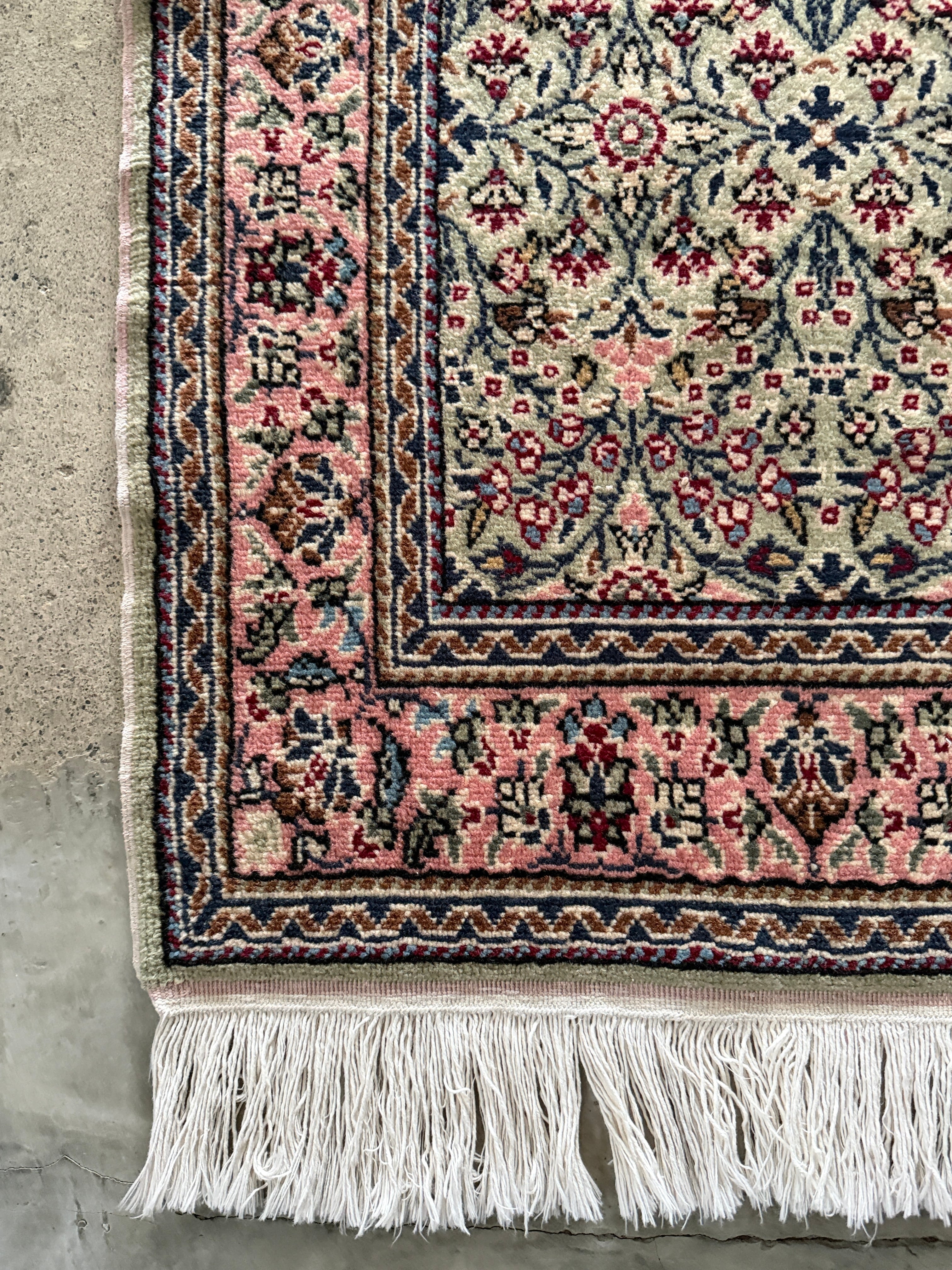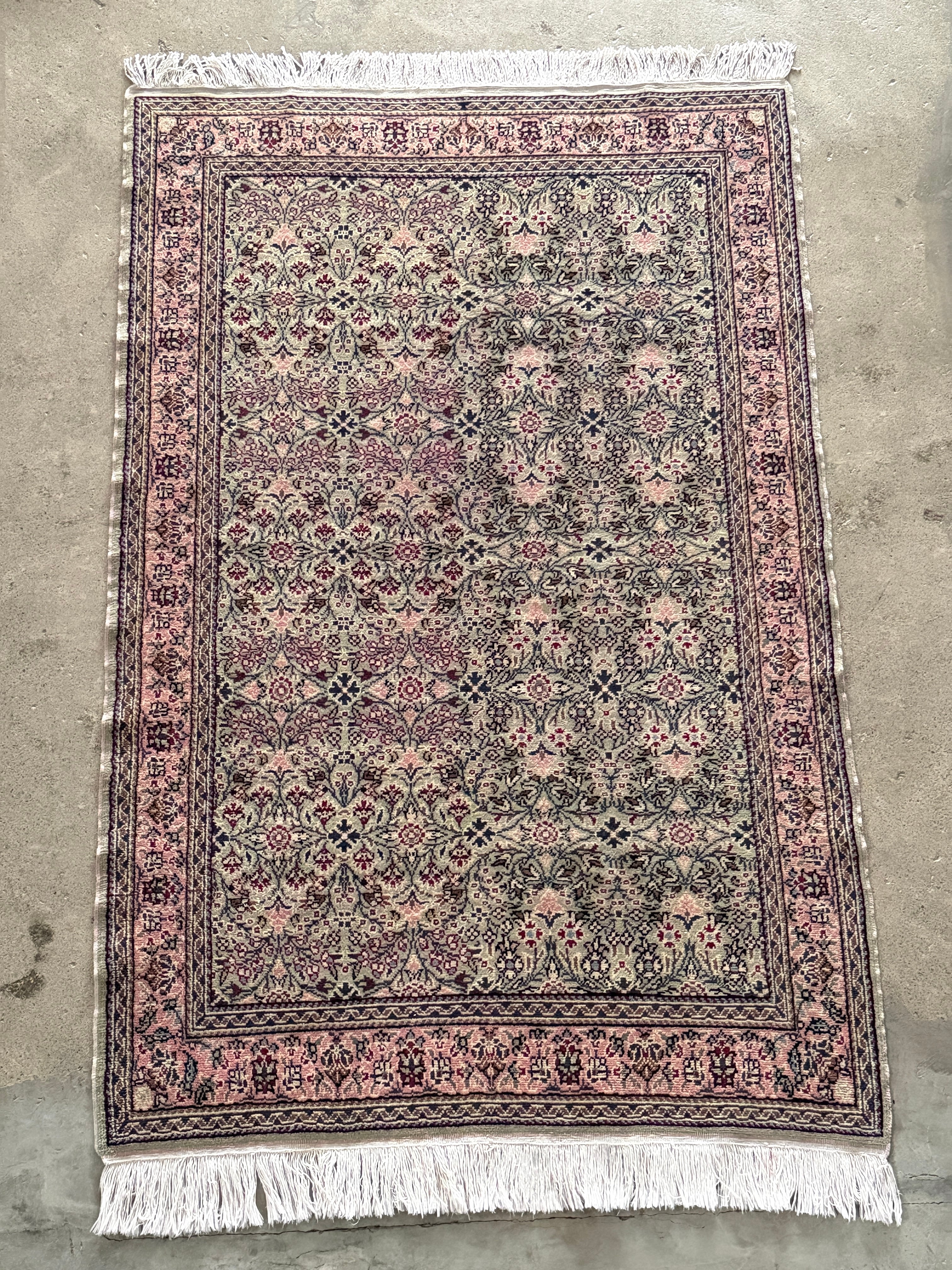 人気のカイセリ絨毯からデッドストック(未使用品)のご紹介です。王道の小花模様デザインに淡いグリーンとピンクという最高に可愛らしい組み合わせでございます!繊細な模様に華やかなフリンジ。織られた時のまま全く使われていなかったことが分かります。フワフワに柔らかな毛足に滑らかな艶。壁に飾りたくなるような絵画のように美しい芸術品です。