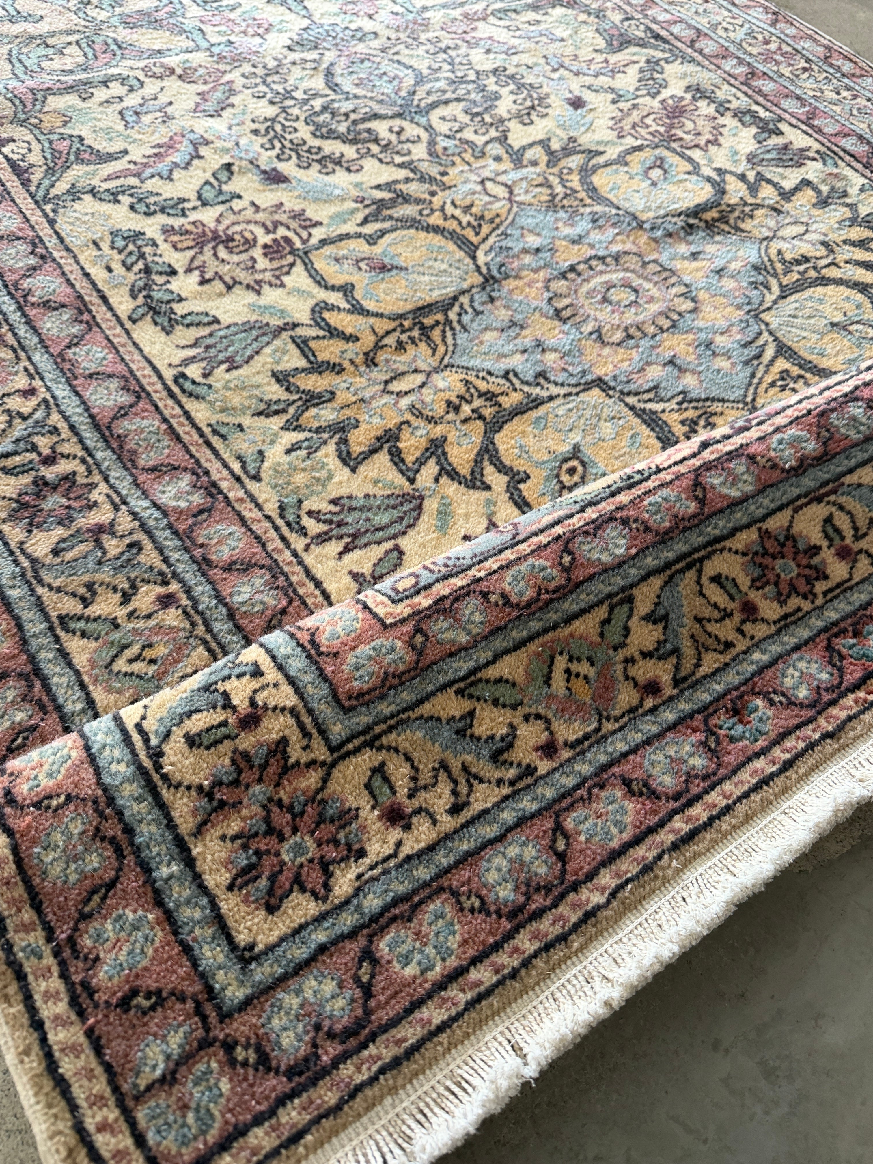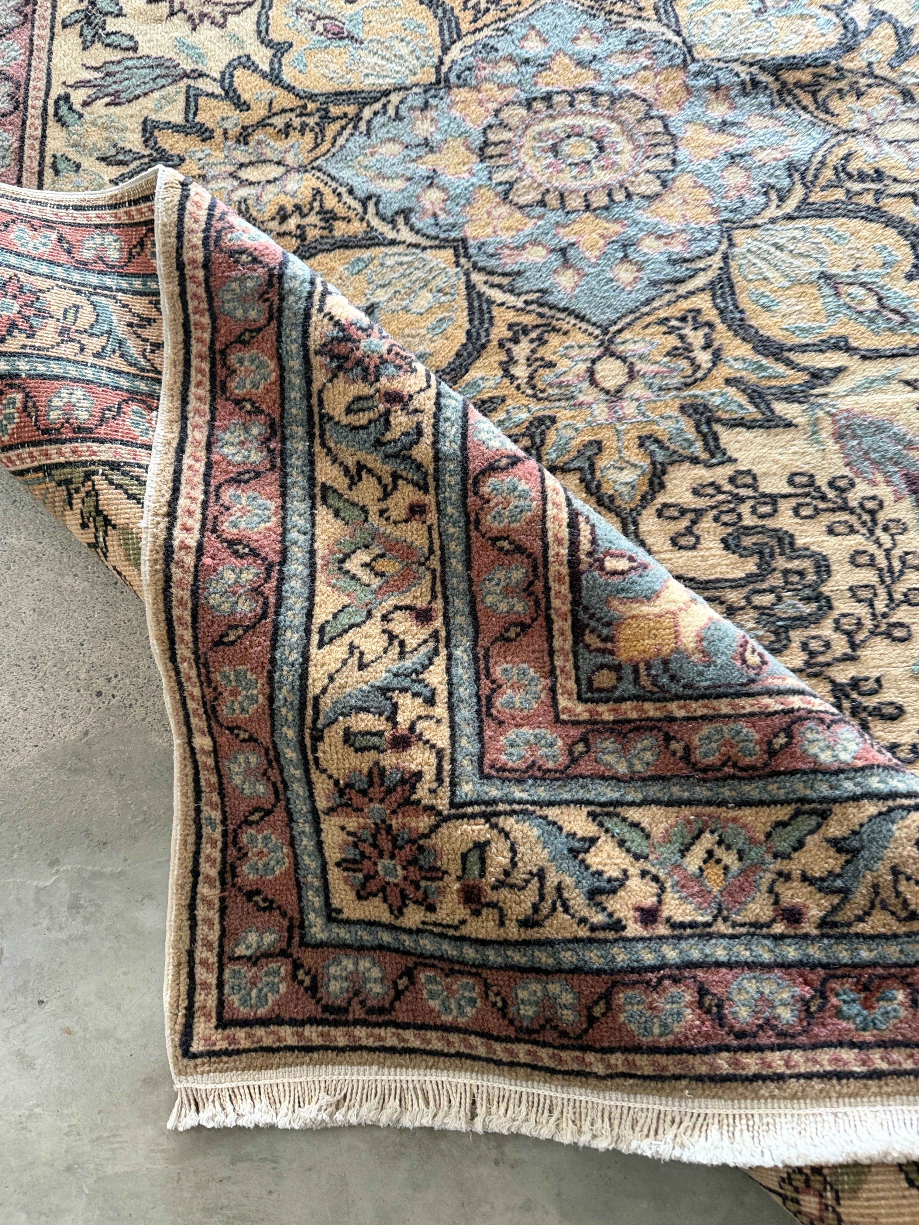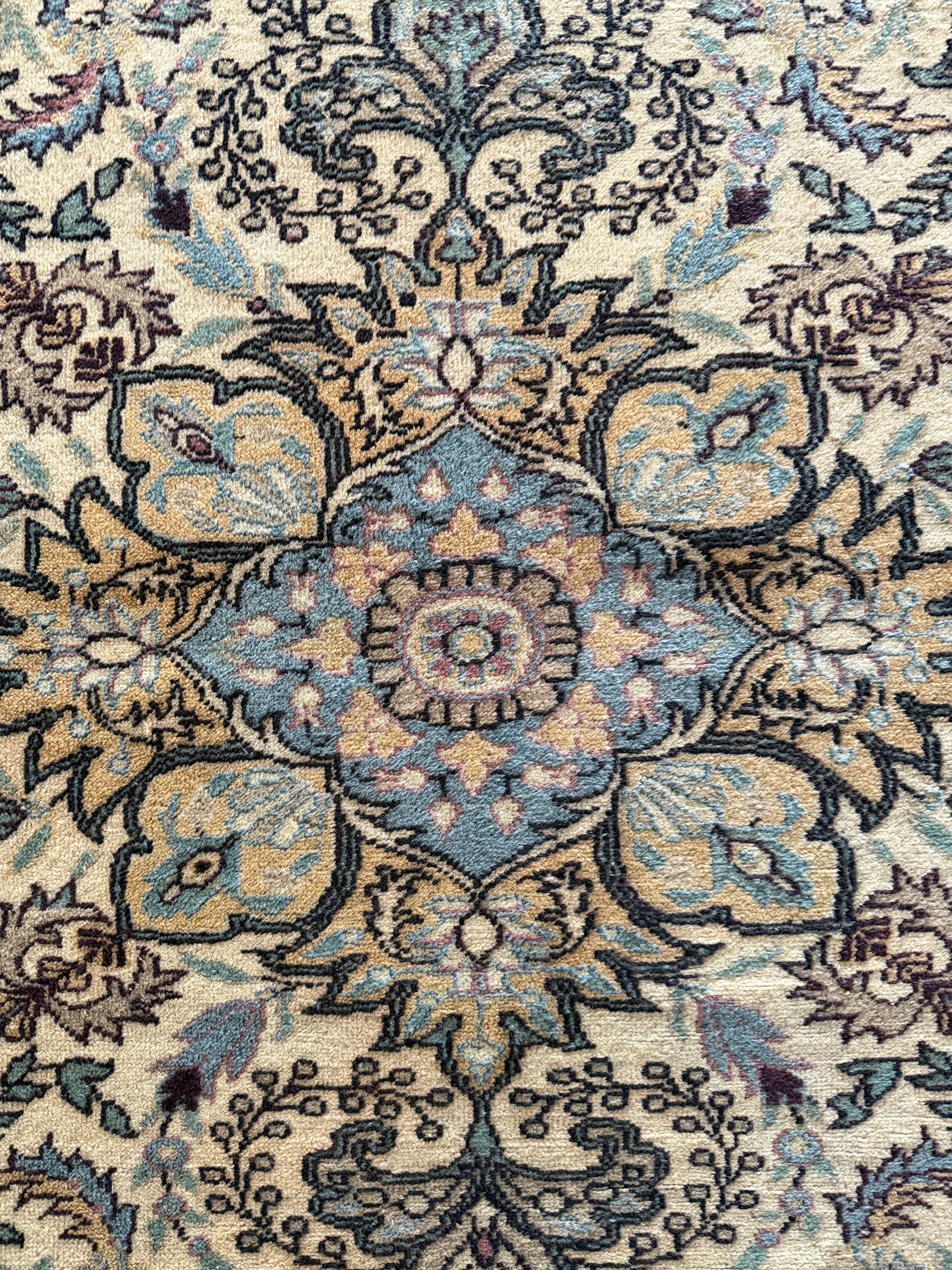 人気のカイセリ絨毯からデッドストック(未使用品)のご紹介です。淡いブルーとイエローに華やかな草木模様というちょっと個性を感じる1枚。王道のメダリオンにあしらわれた白い花が上品さを感じさせてくれます。品質、デザインこちらも素晴らしい絨毯です。