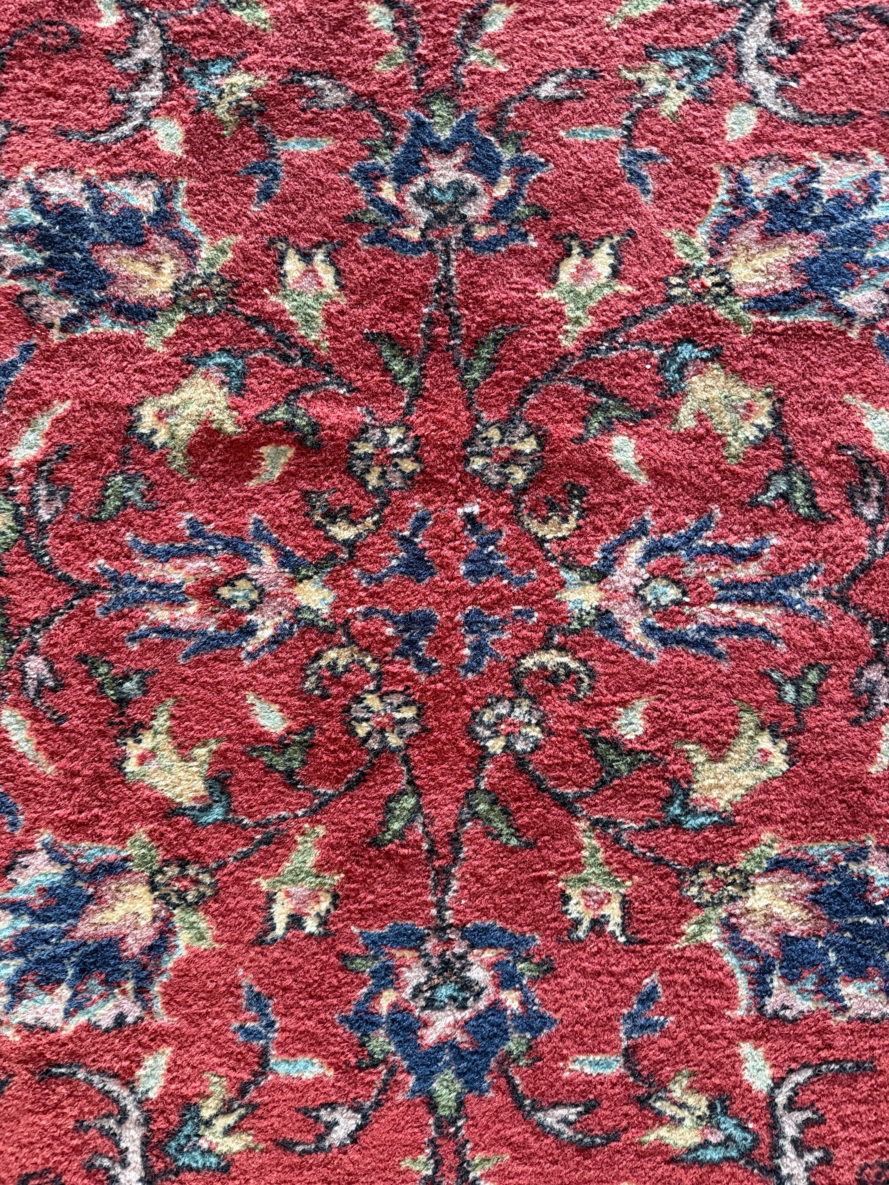 こちらは貴重な加工なしのイスパルタ絨毯です。モダンで落ち着いた赤にクラッシックでレトロなデザインが気に入っています。フワフワで柔らかな毛足はこの季節にぴったりの1枚です!