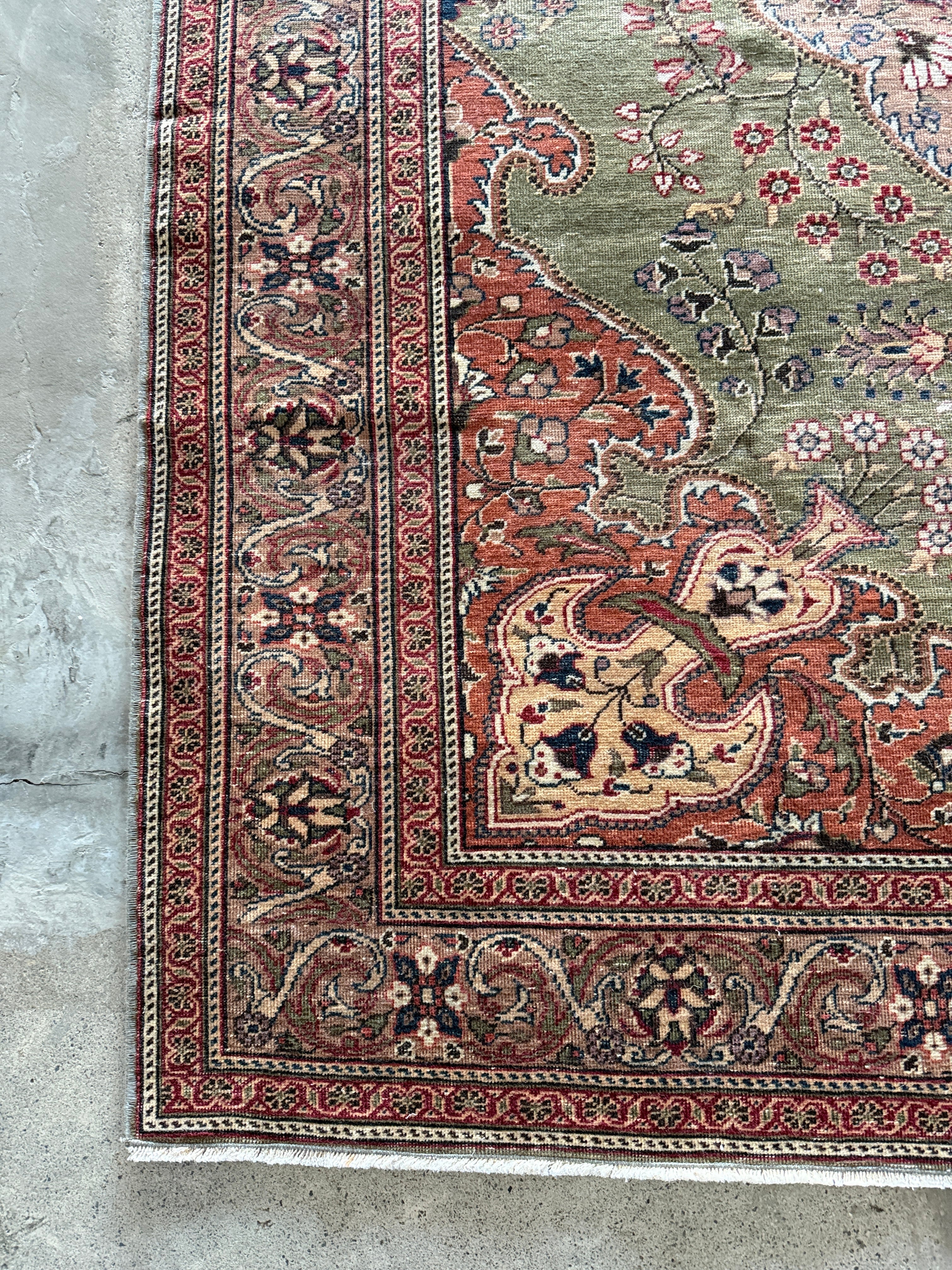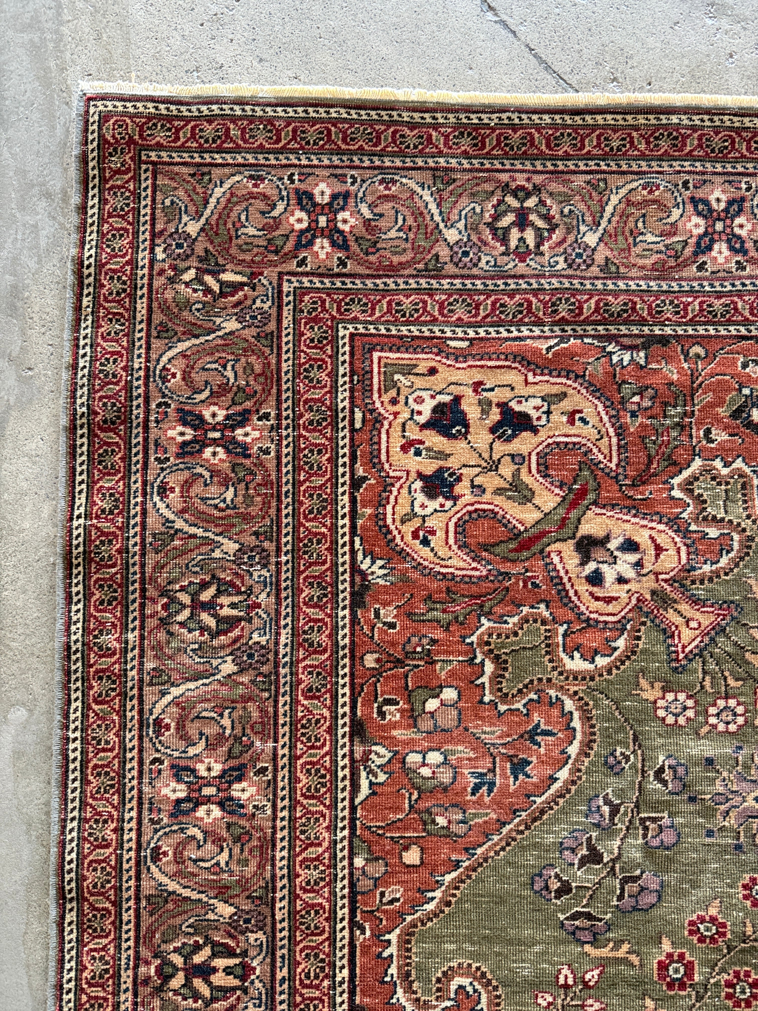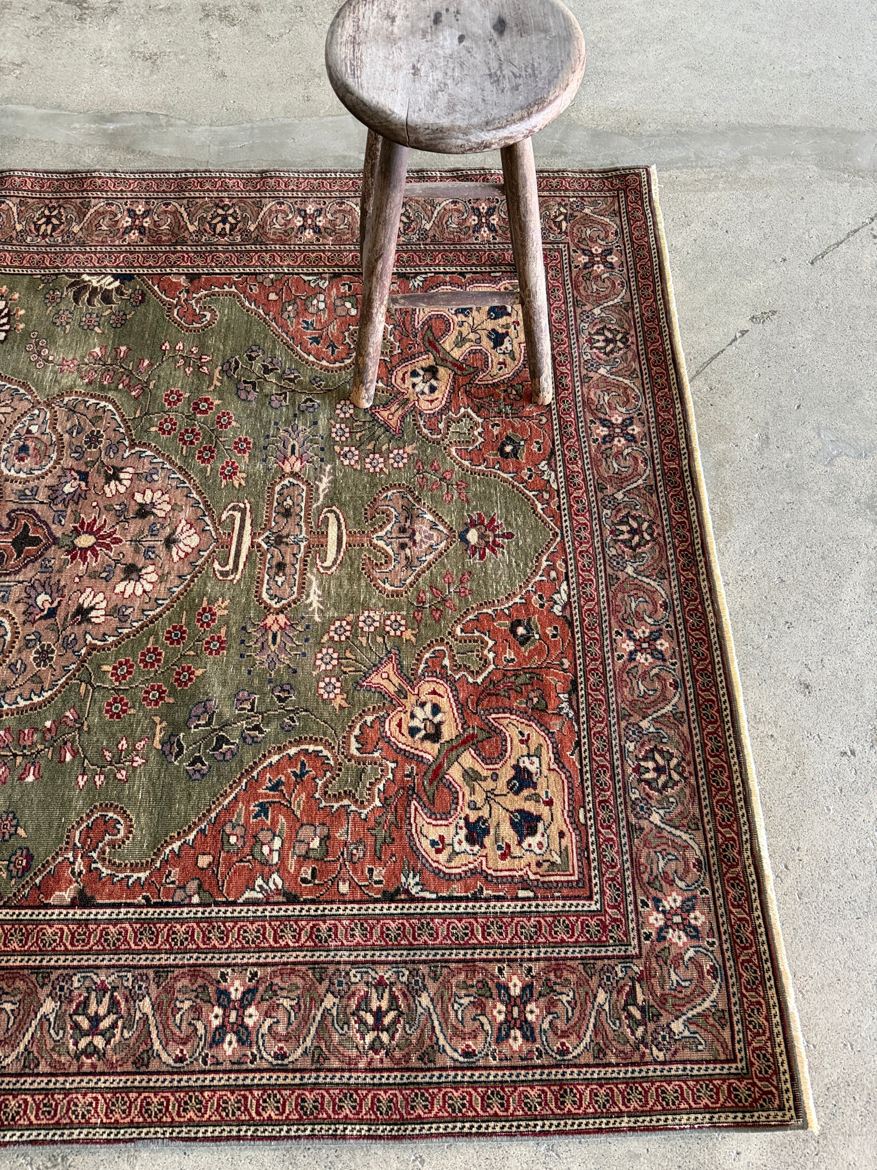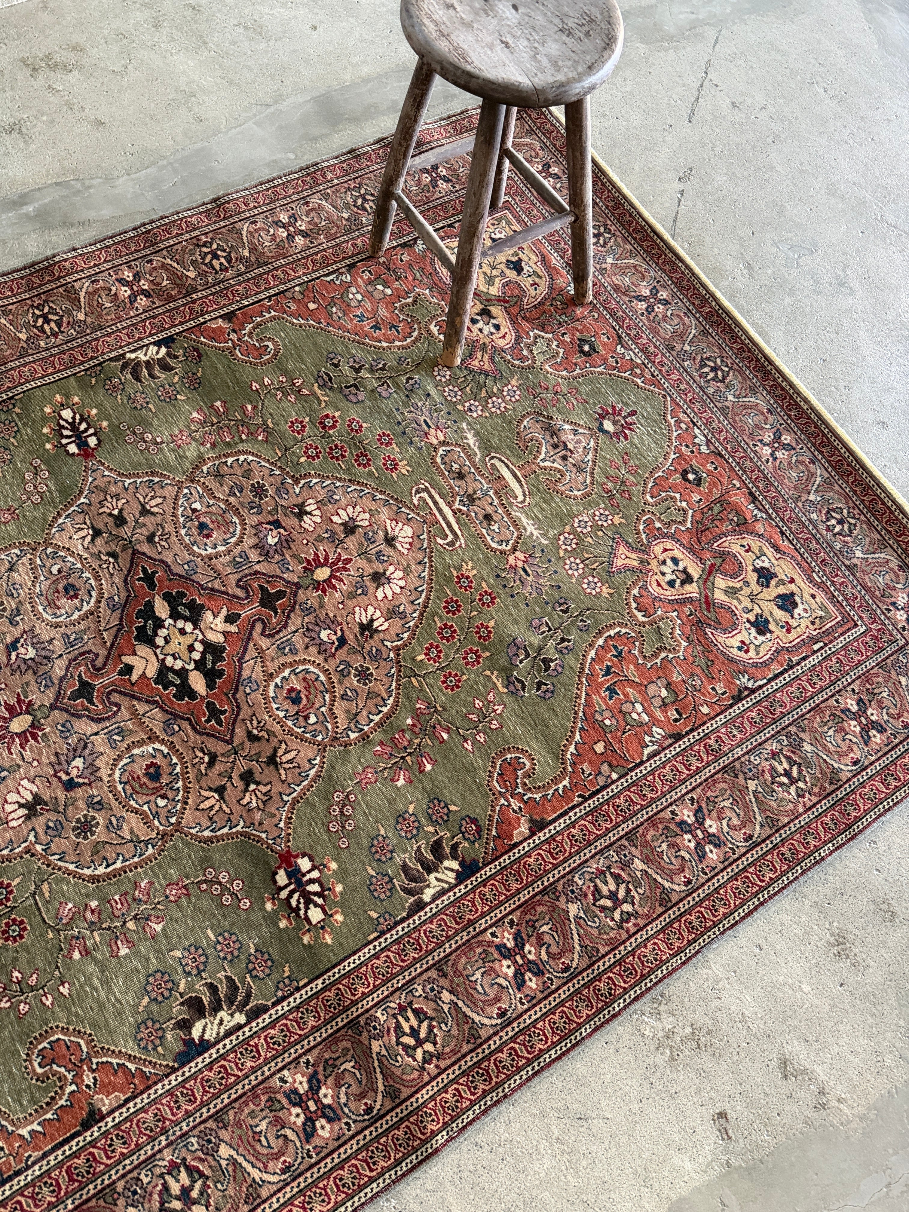 トルコ絨毯の中でも高品質で有名なLADIK(ラディック)絨毯。ラディック絨毯はヘレケのお手本といわれる700年以上の歴史を持つウールの絨毯です。こちらはこのラディック絨毯のモチーフを引用してカイセリで織られた絨毯。毛足の短くなっている箇所はありますが、デザインの繊細さと色使いが美しく非常にめずらしい1枚です。個人的にはモダンなグリーンがかなり好みです!