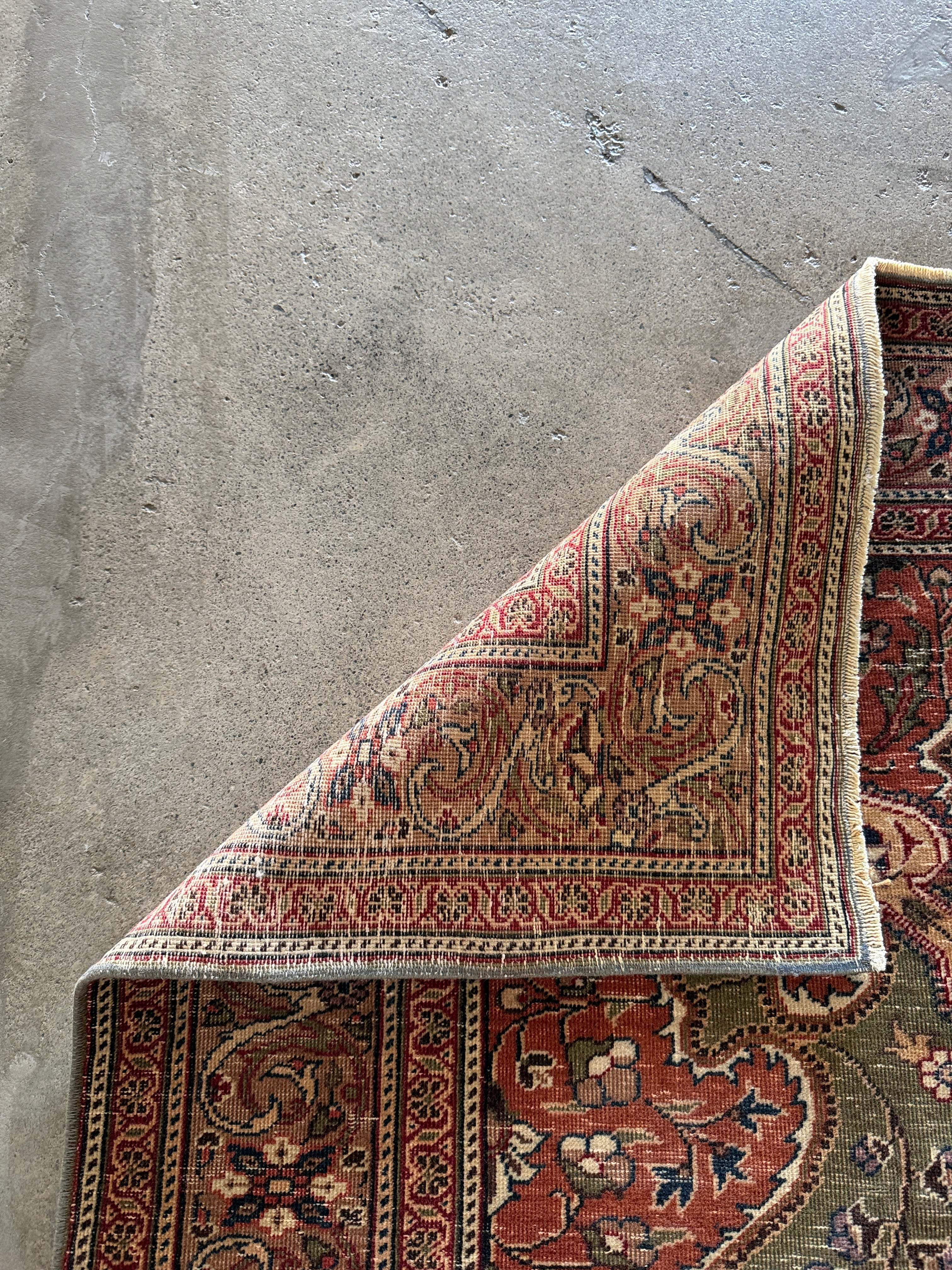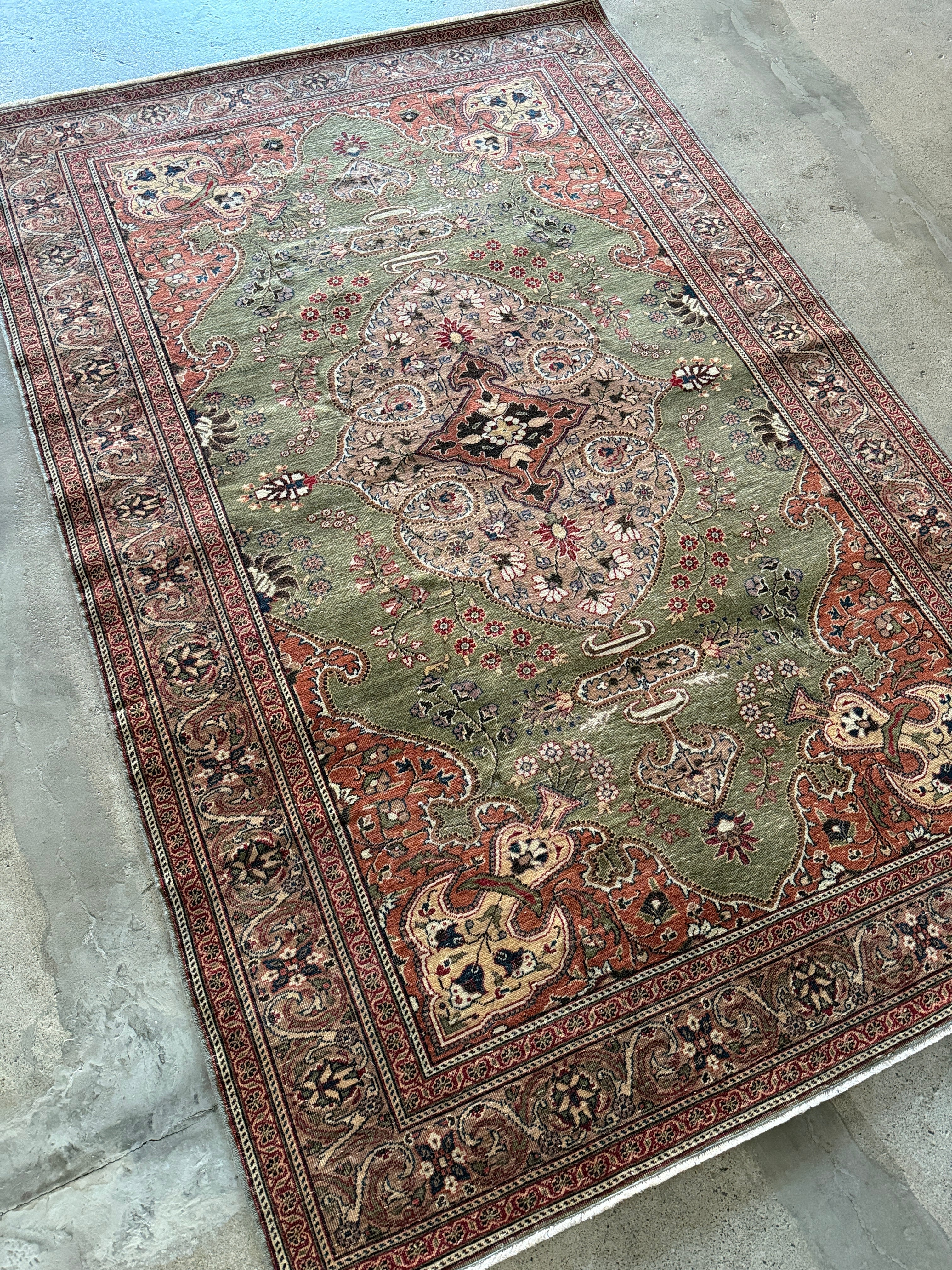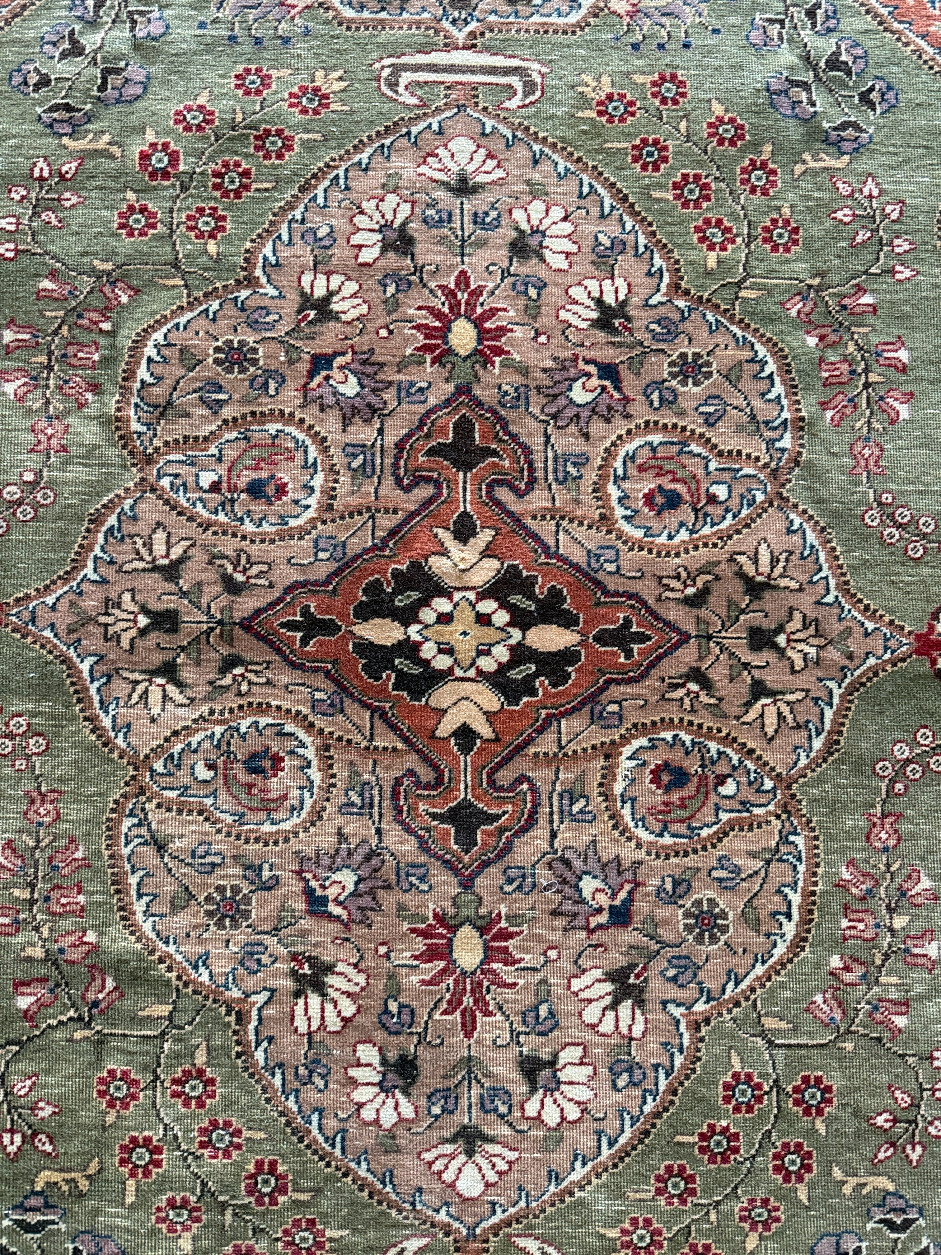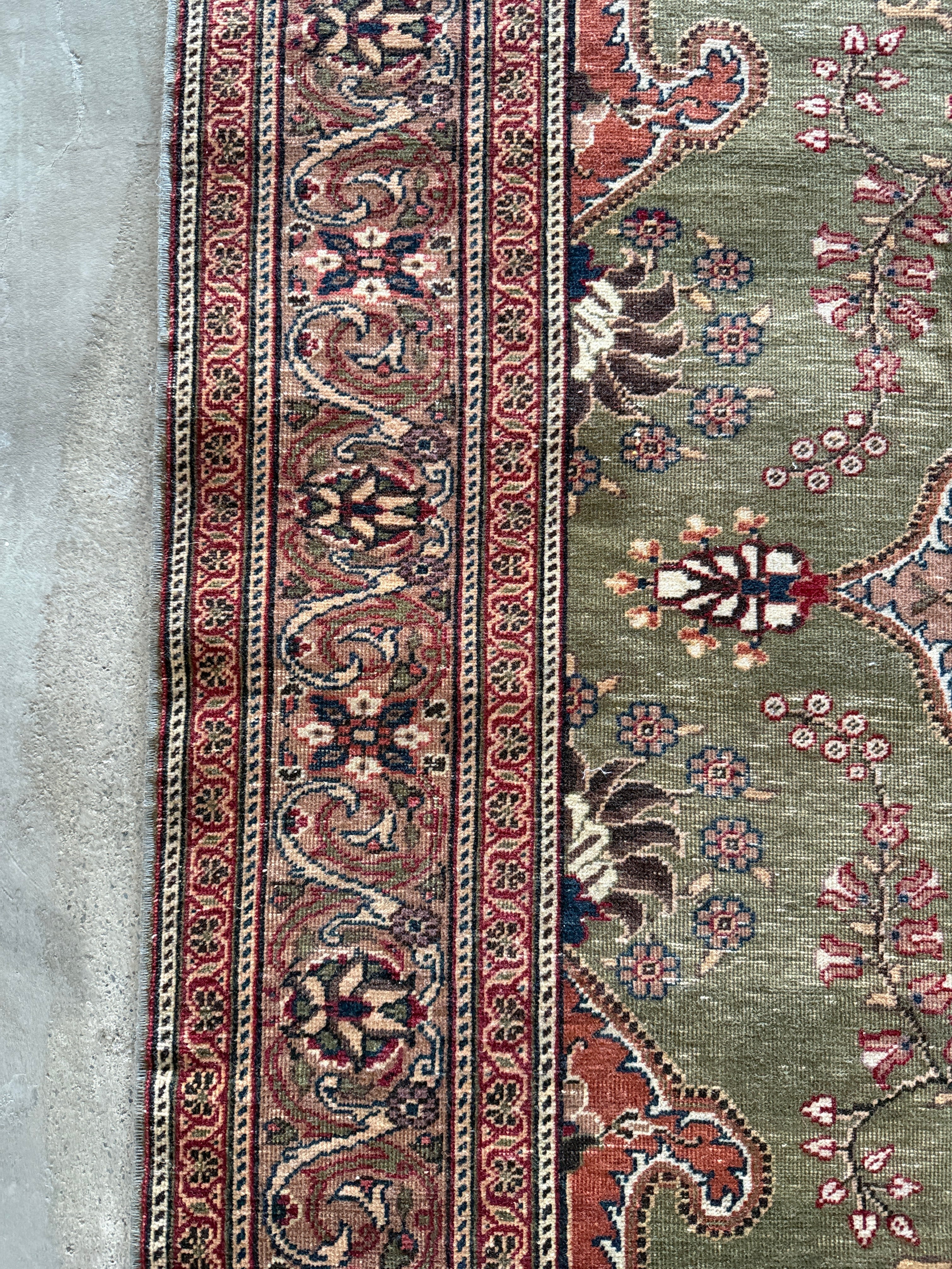 トルコ絨毯の中でも高品質で有名なLADIK(ラディック)絨毯。ラディック絨毯はヘレケのお手本といわれる700年以上の歴史を持つウールの絨毯です。こちらはこのラディック絨毯のモチーフを引用してカイセリで織られた絨毯。毛足の短くなっている箇所はありますが、デザインの繊細さと色使いが美しく非常にめずらしい1枚です。個人的にはモダンなグリーンがかなり好みです!