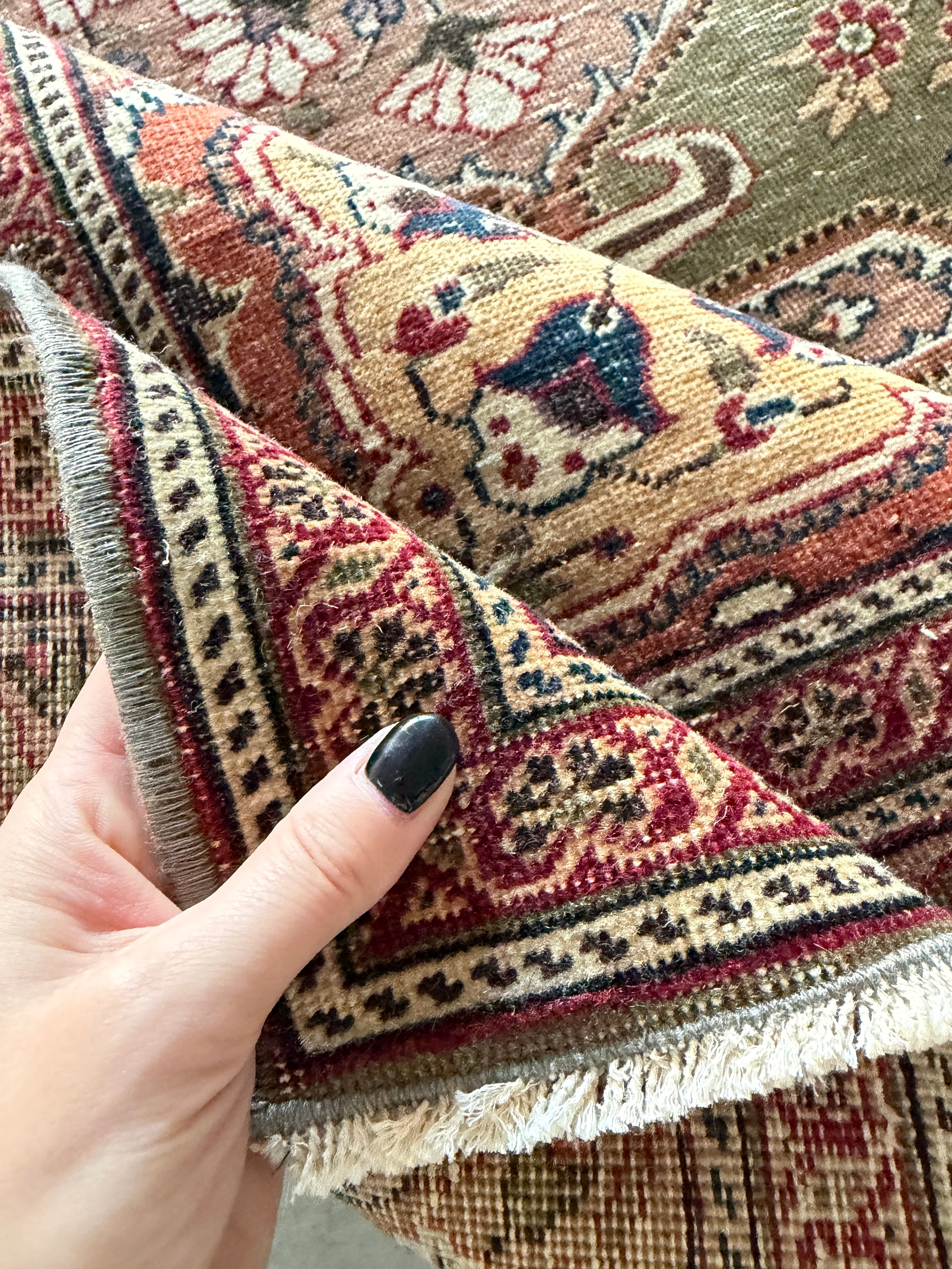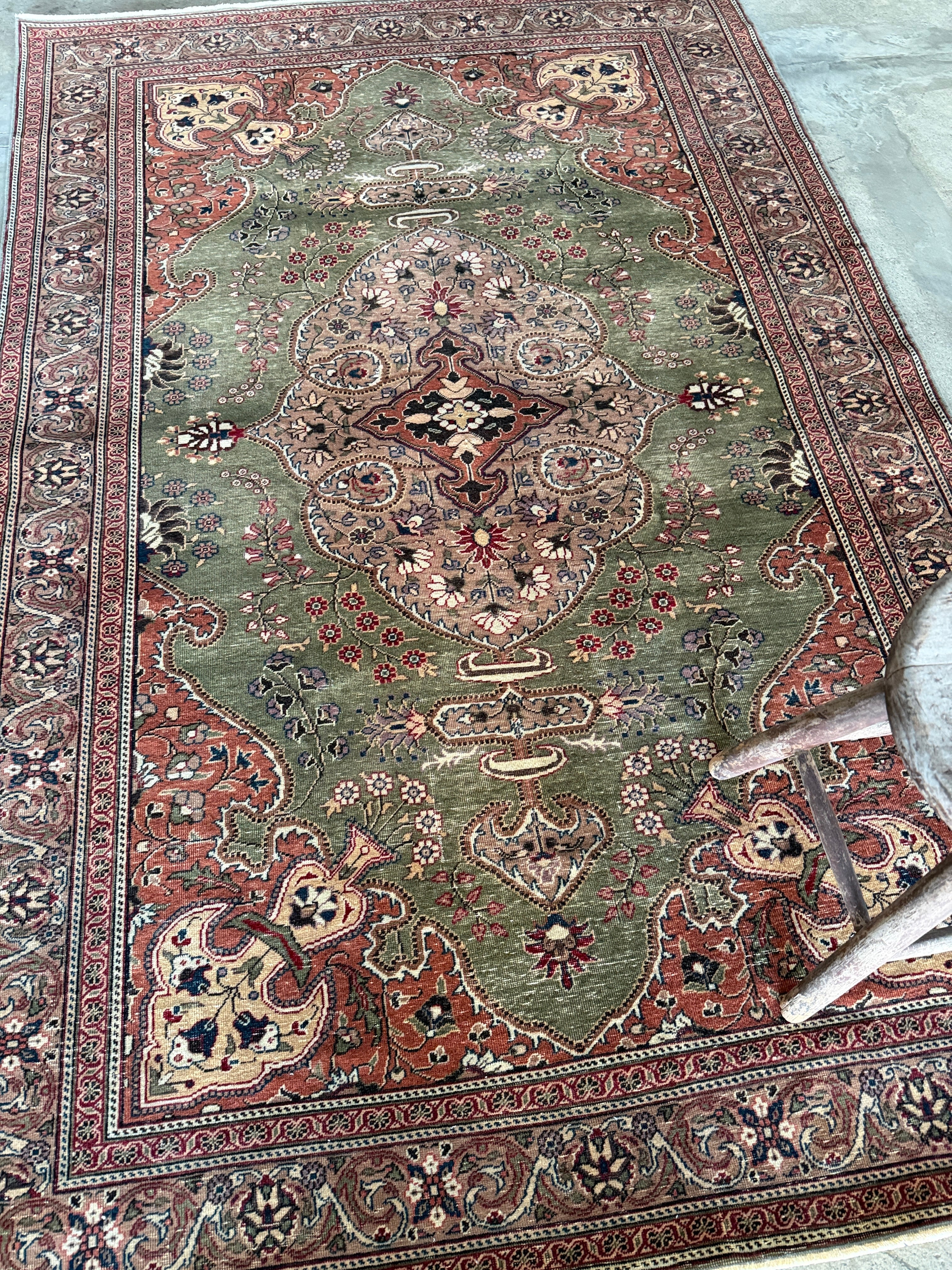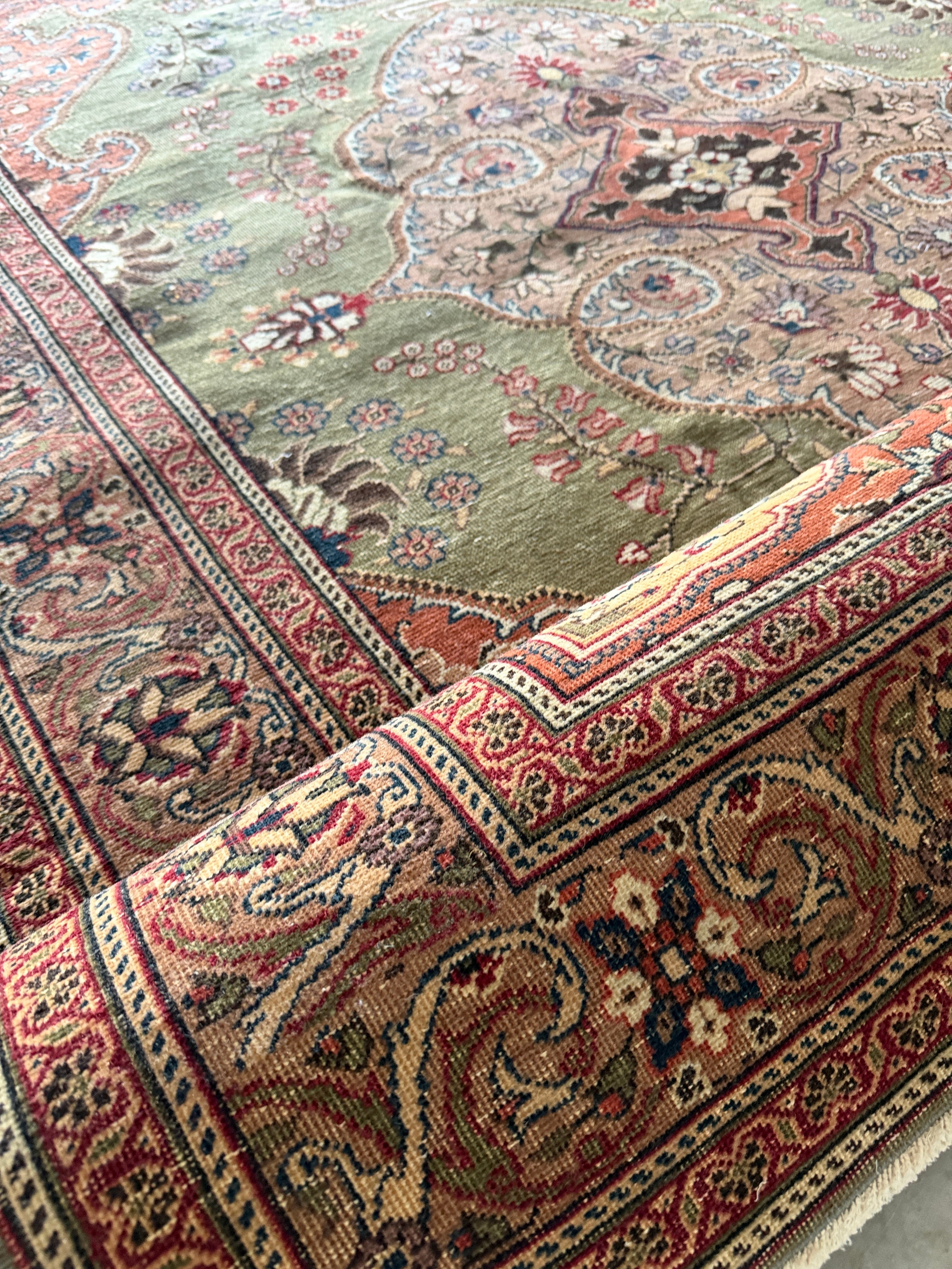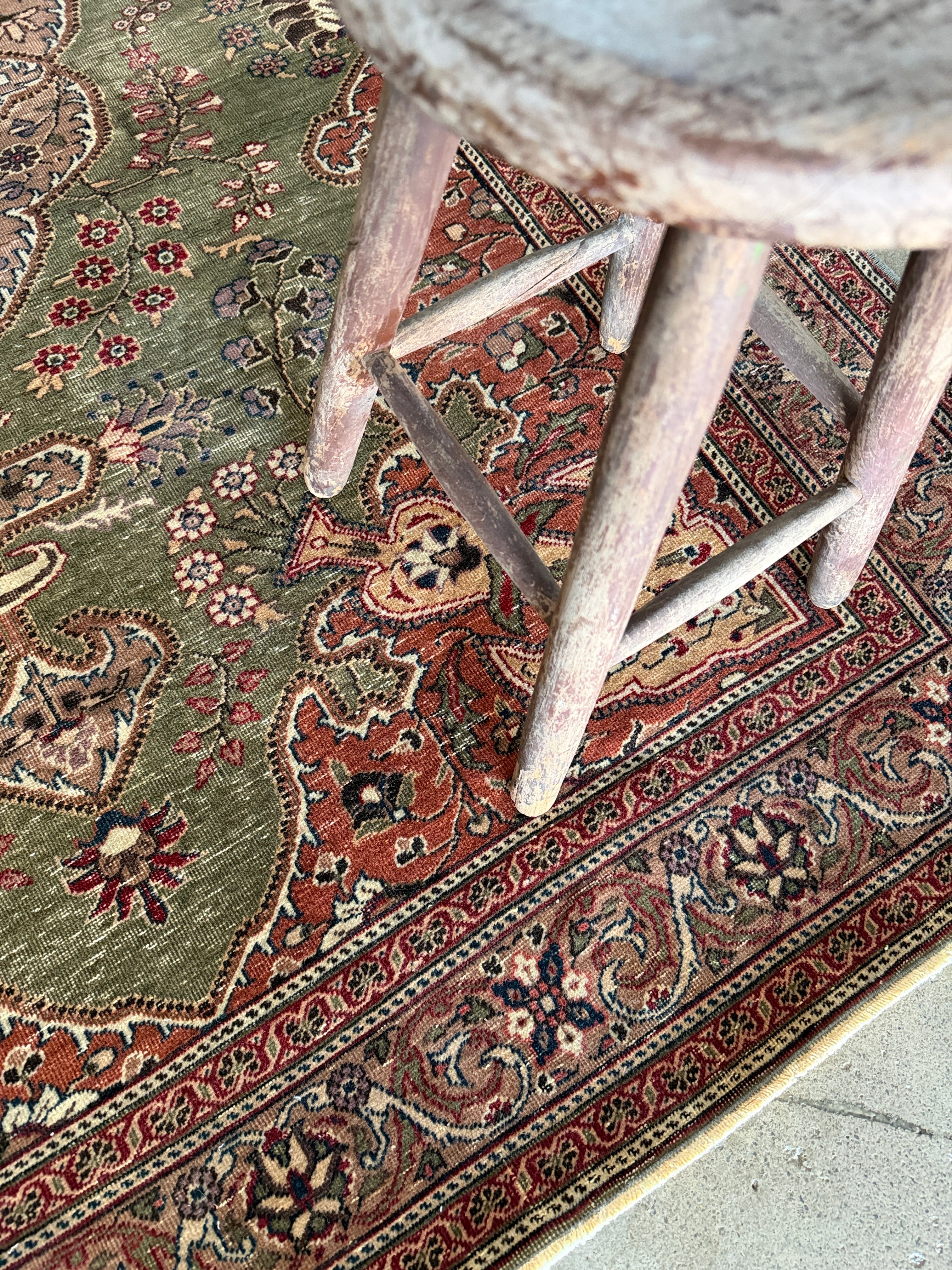 トルコ絨毯の中でも高品質で有名なLADIK(ラディック)絨毯。ラディック絨毯はヘレケのお手本といわれる700年以上の歴史を持つウールの絨毯です。こちらはこのラディック絨毯のモチーフを引用してカイセリで織られた絨毯。毛足の短くなっている箇所はありますが、デザインの繊細さと色使いが美しく非常にめずらしい1枚です。個人的にはモダンなグリーンがかなり好みです!
