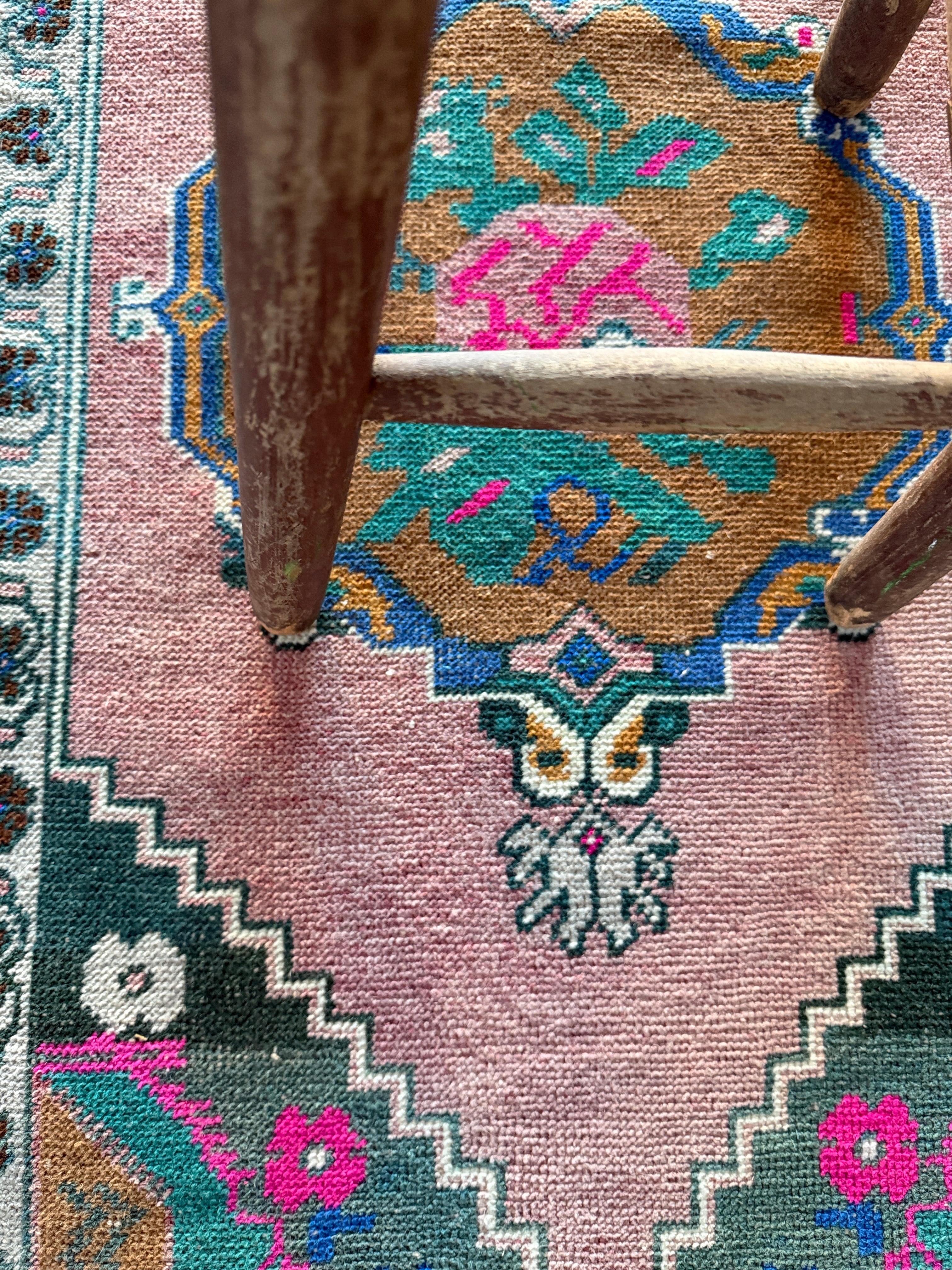 スモールサイズのヴィンテージラグは、玄関マットに人気があります。猫との暮らしで考えると彼らのトイレ用マットやご飯マット、お昼寝マットとしてお使いいただくのがオススメです!我が家もトイレ用マットとして愛用中。トイレ後の砂の飛び散りをカバーしてくれるのでお掃除が楽チンです!