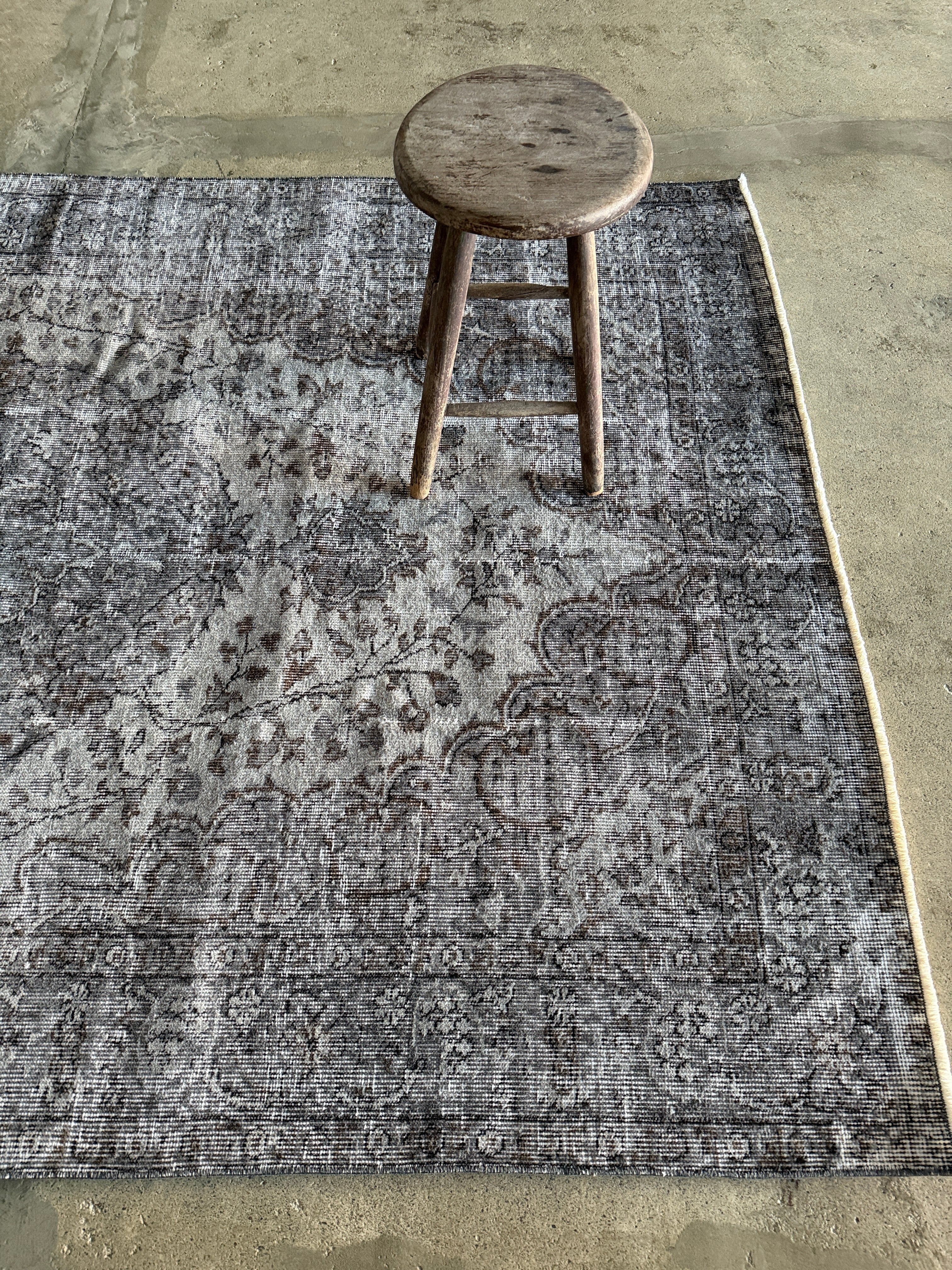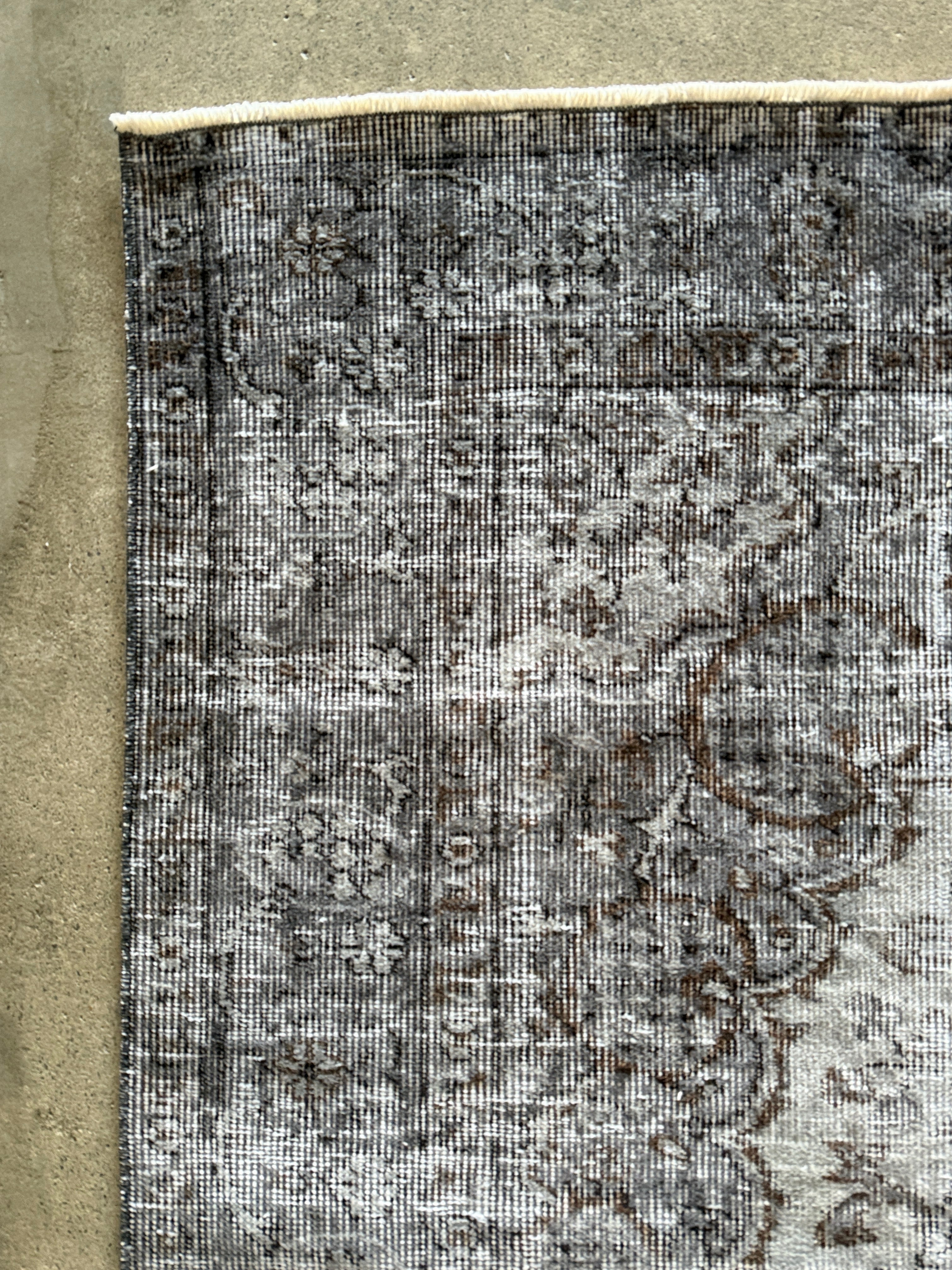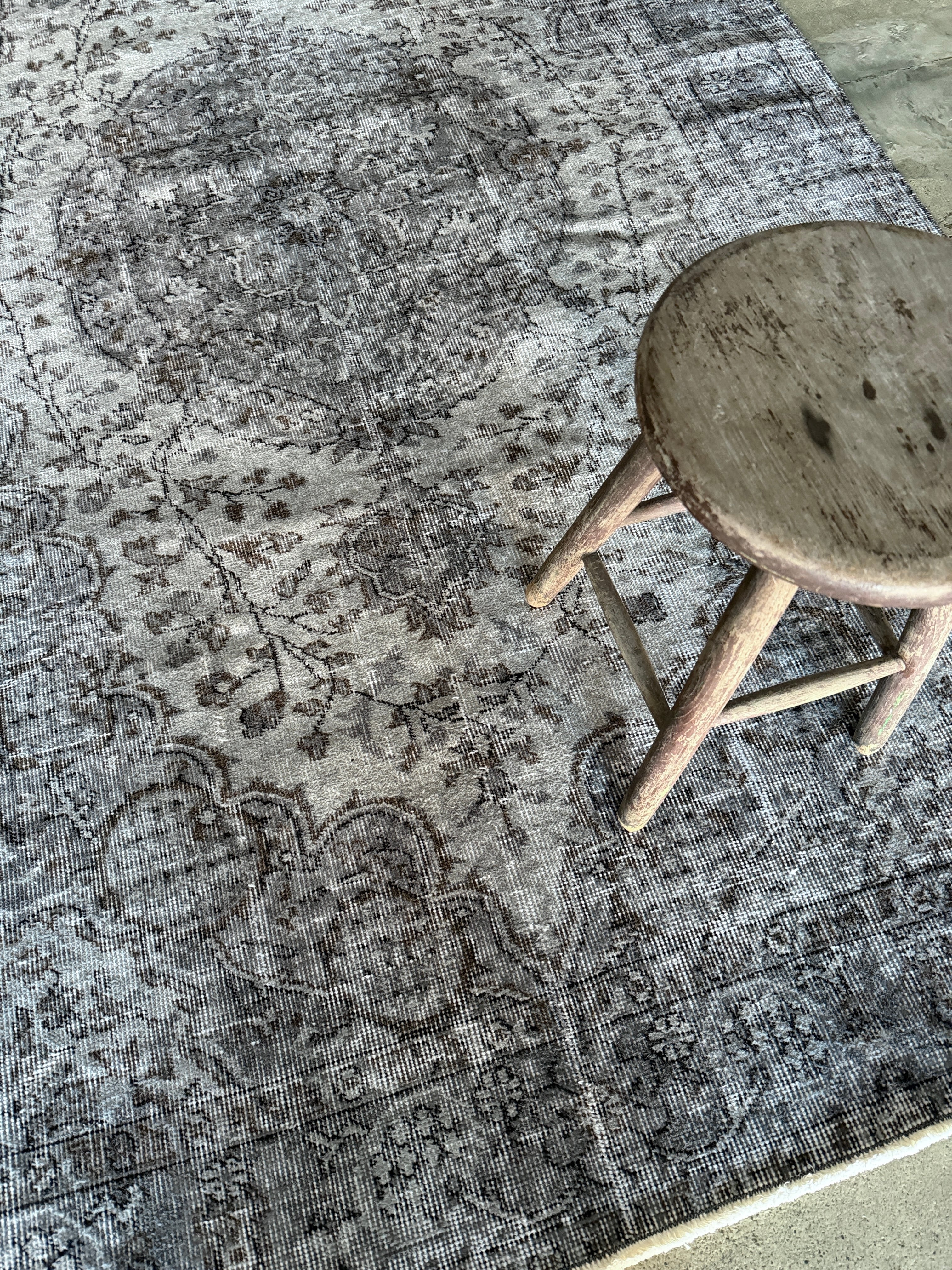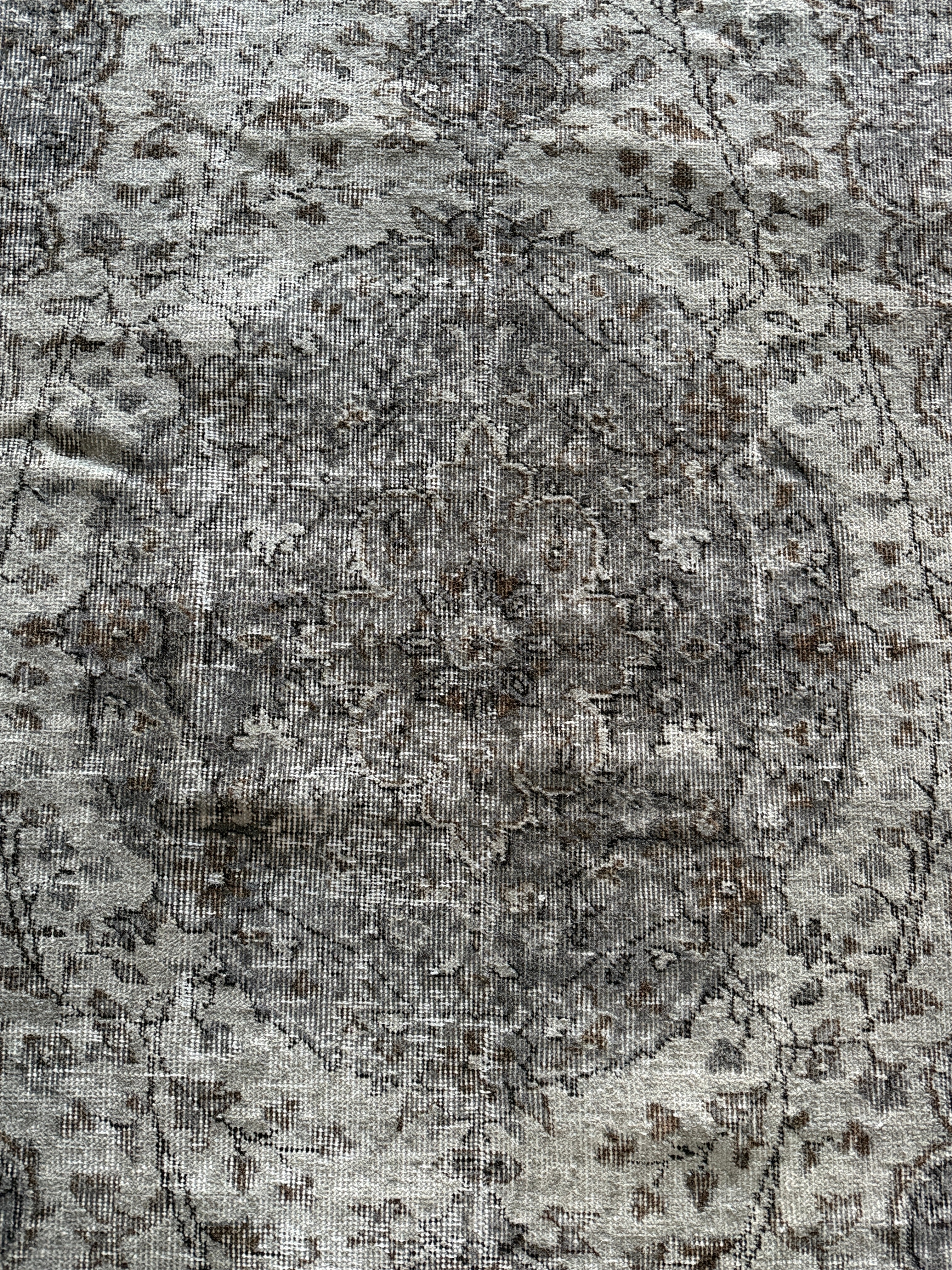 明るめのグレーにクラッシックなメダリオンという王道で人気のデザインに仕上がった1枚。グレーは使うって行くうちに、日が良く当たる場所は色合いが変化したり、良く歩く場所にはスレ感が生まれたり(デニムのようなイメージです)私はオーバーダイは暮らしの中で育てていく楽しさを感じられるラグだと思います。