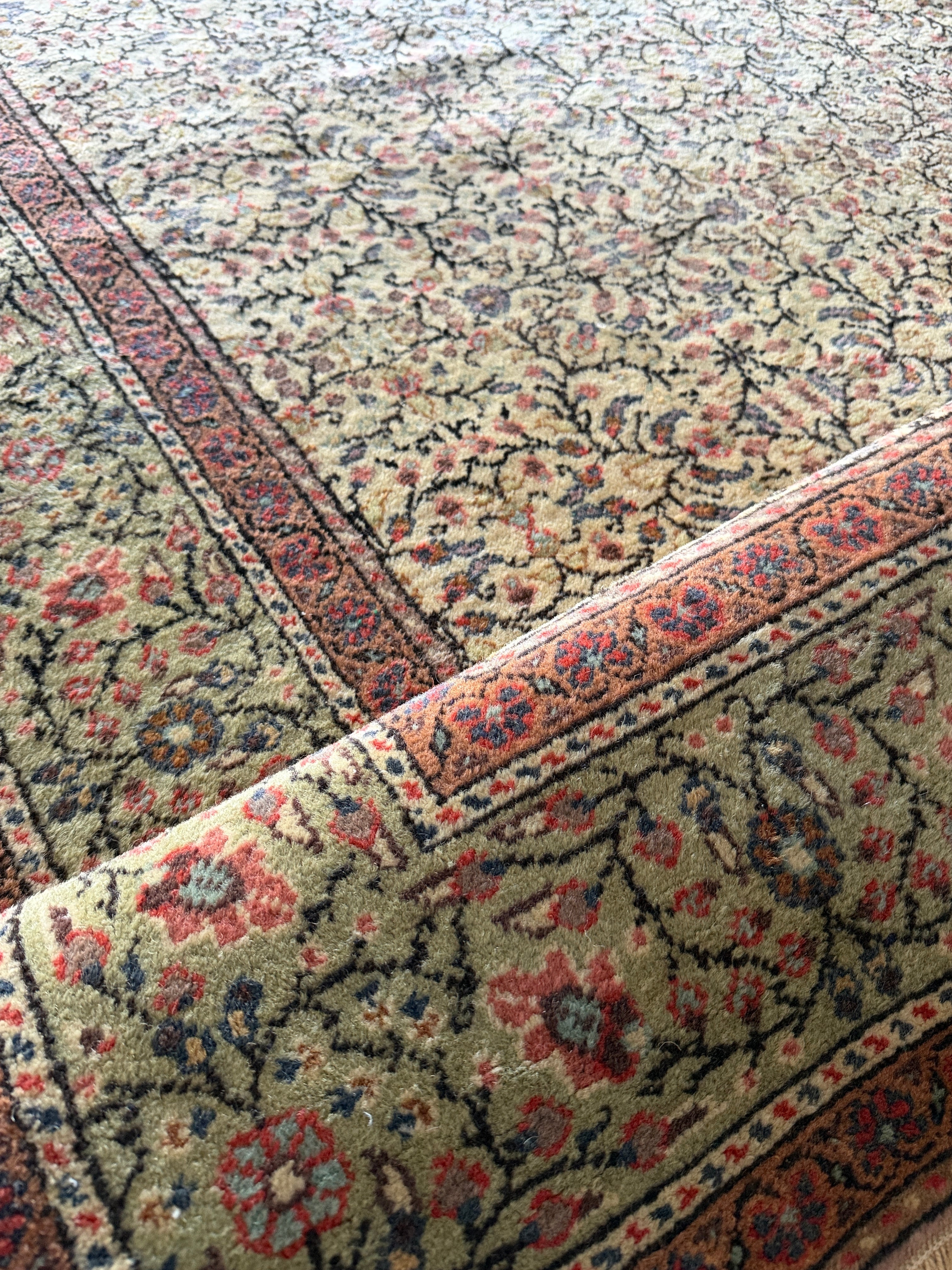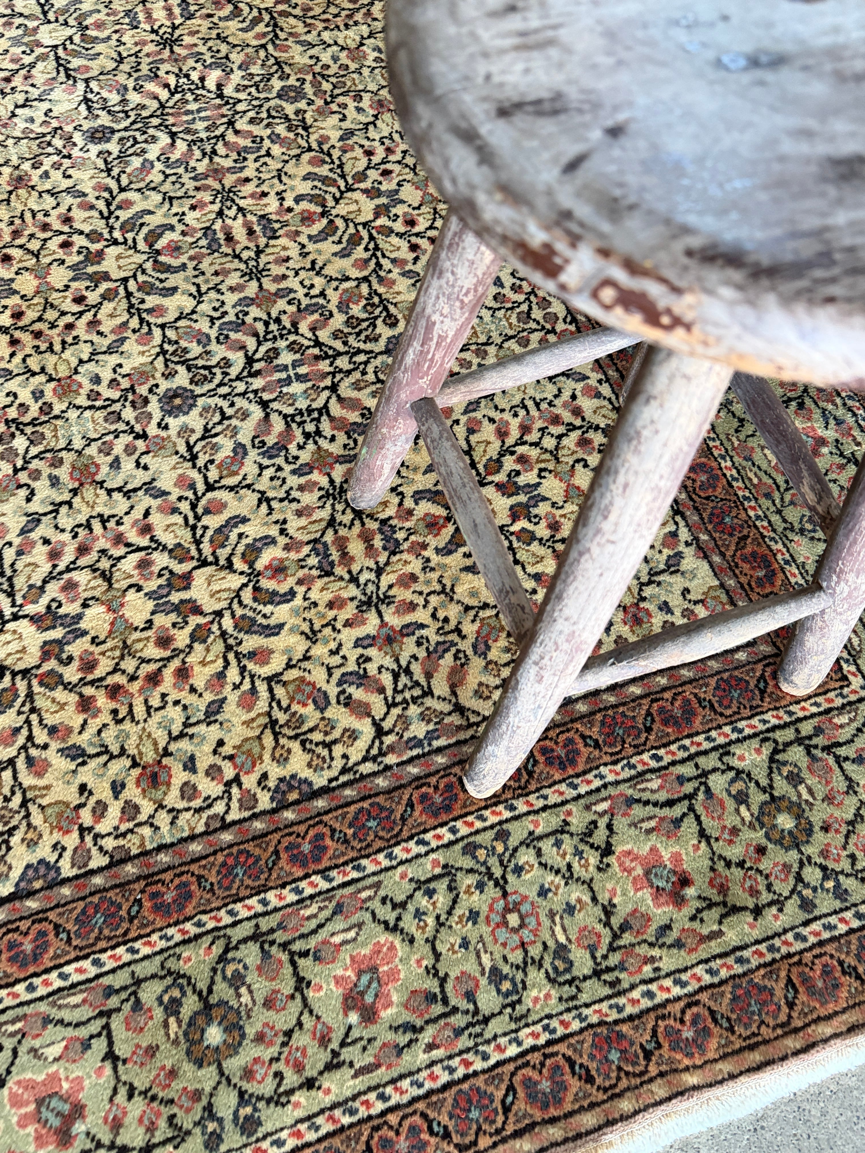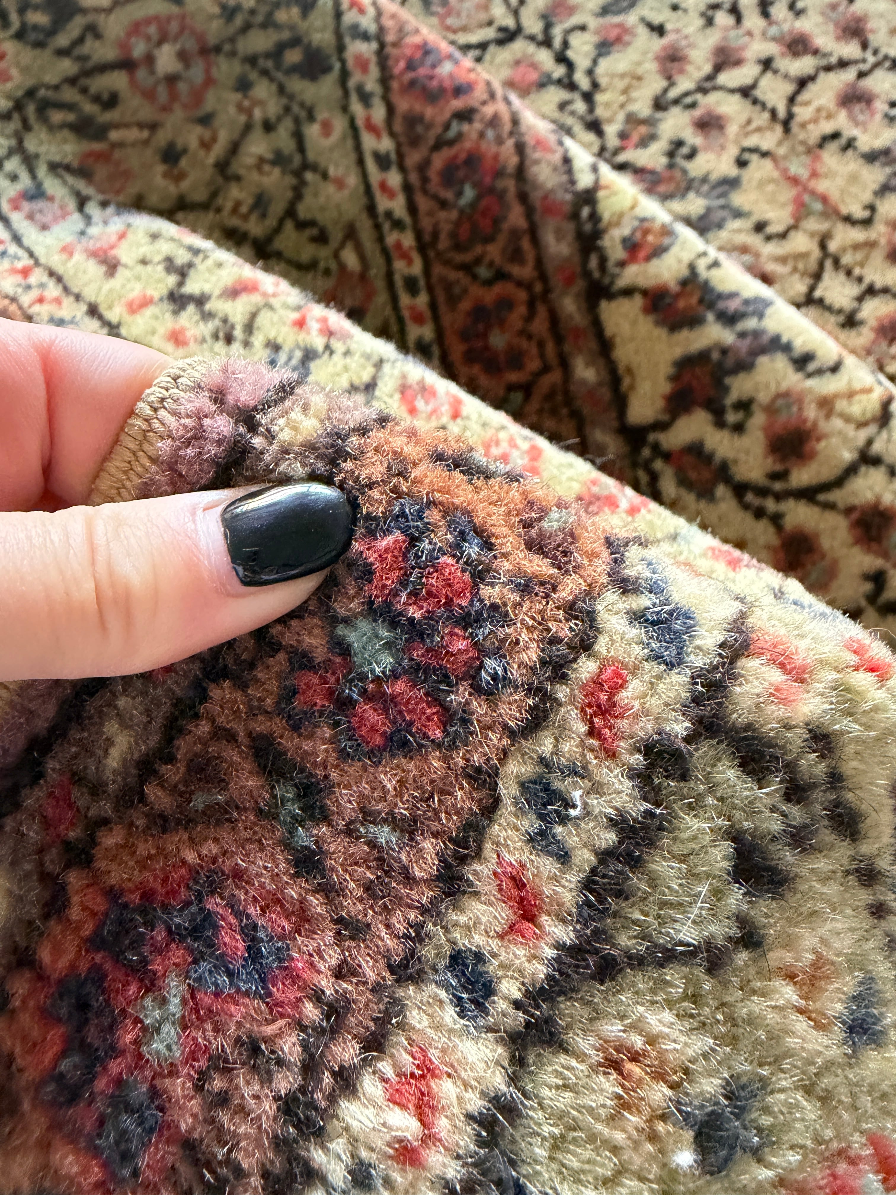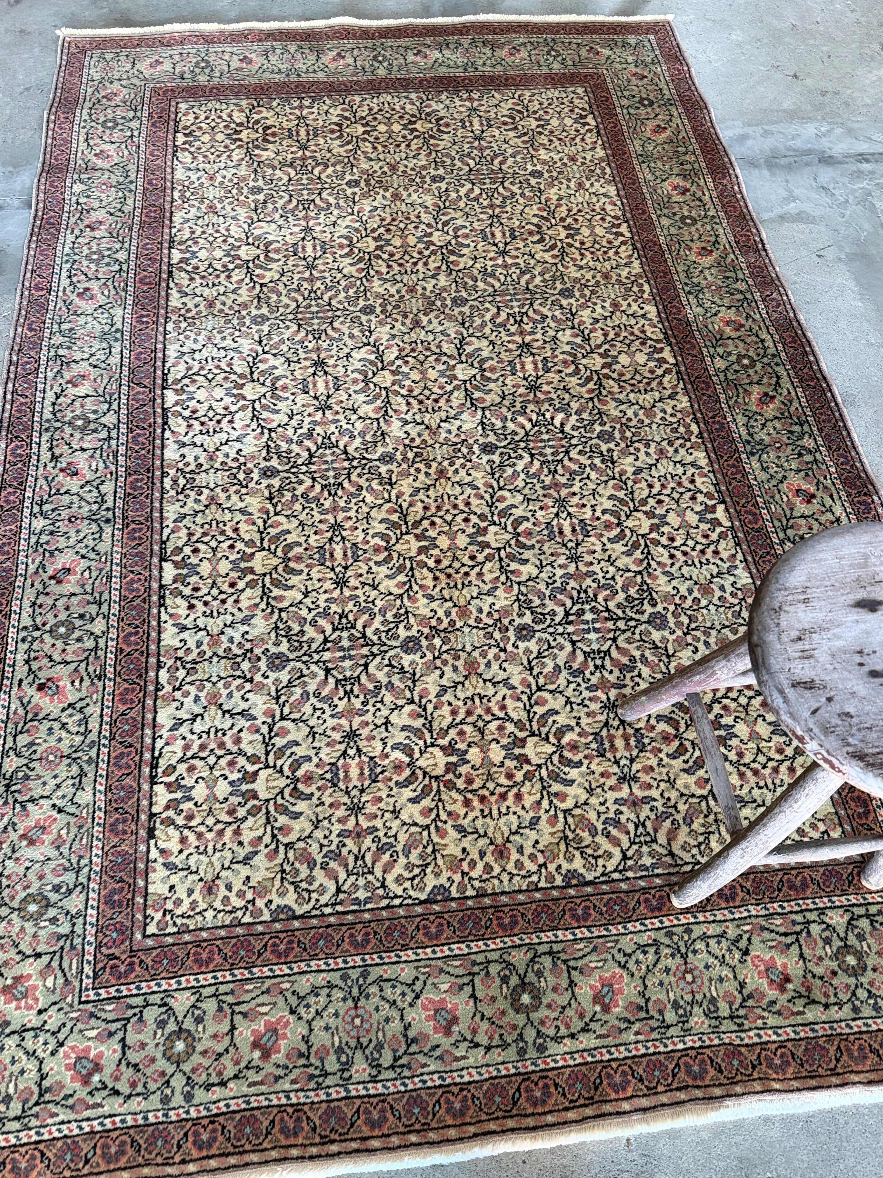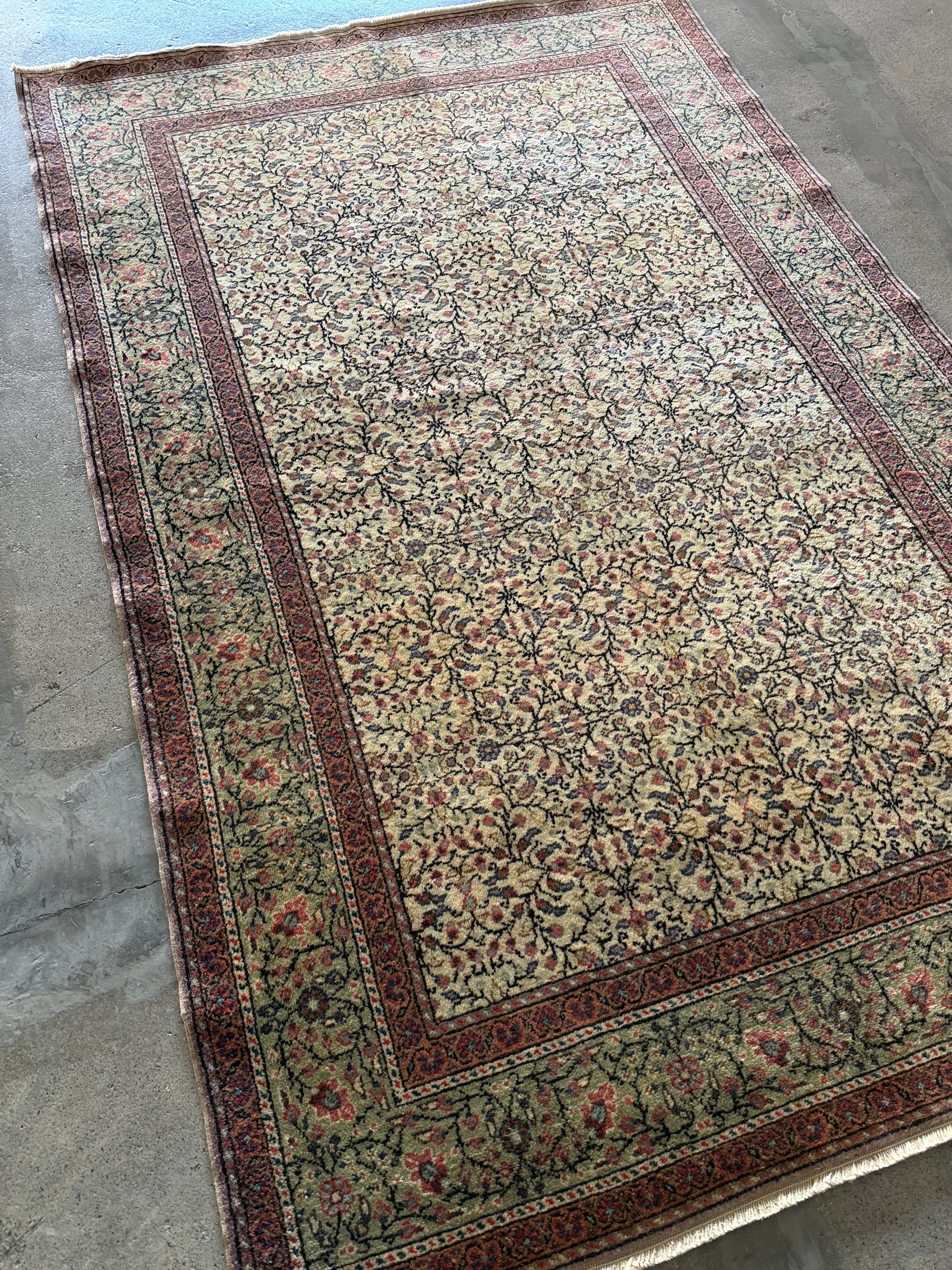ナチュラルベージュにカイセリ人気の花模様、淡いグリーンがアクセントになったやわらかい雰囲気の1枚です。個人的に和室に敷いても相性が良さそうだな!と感じています。