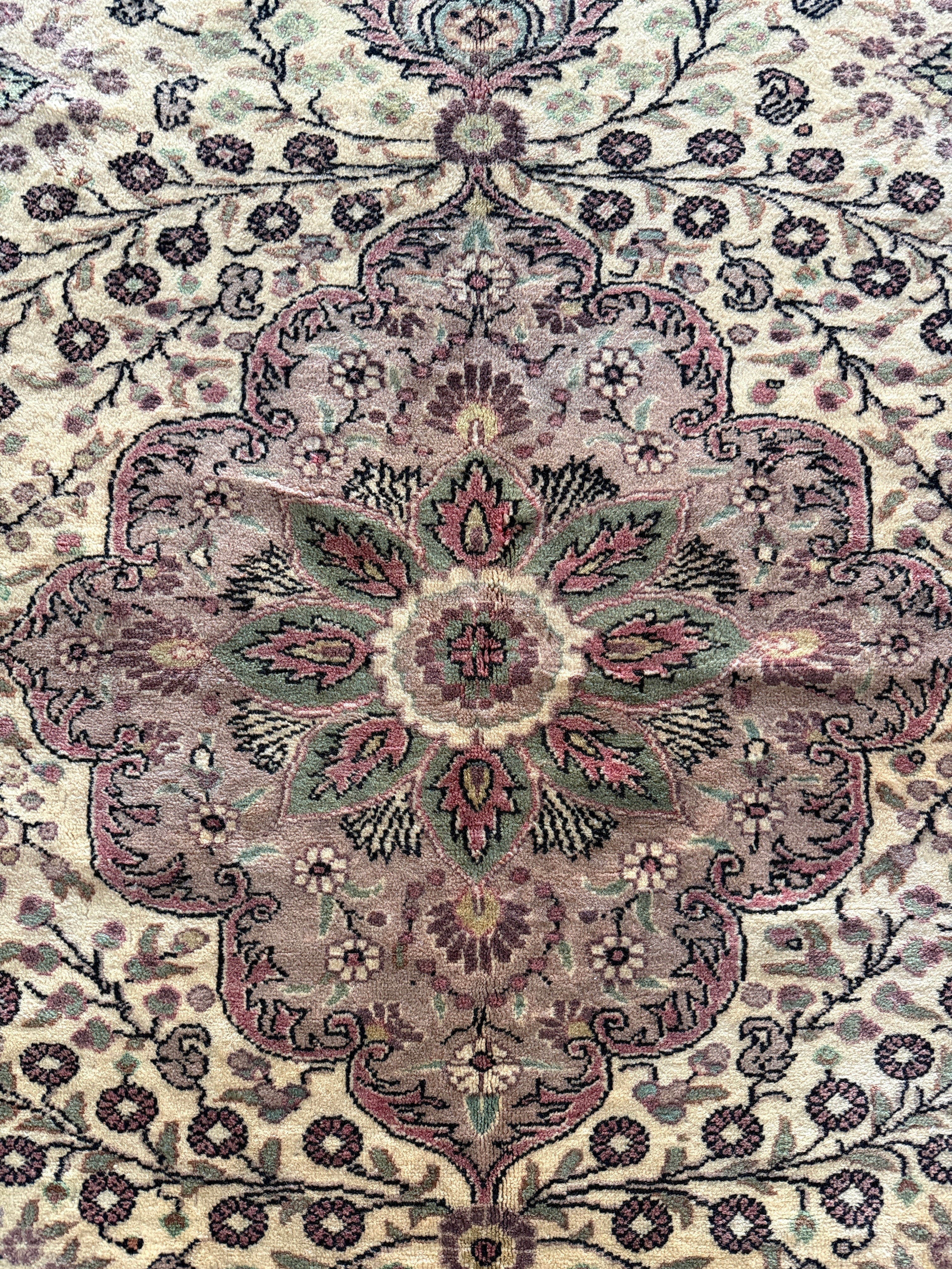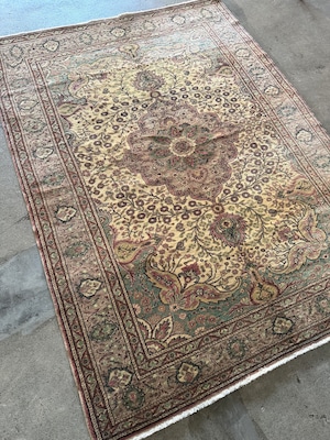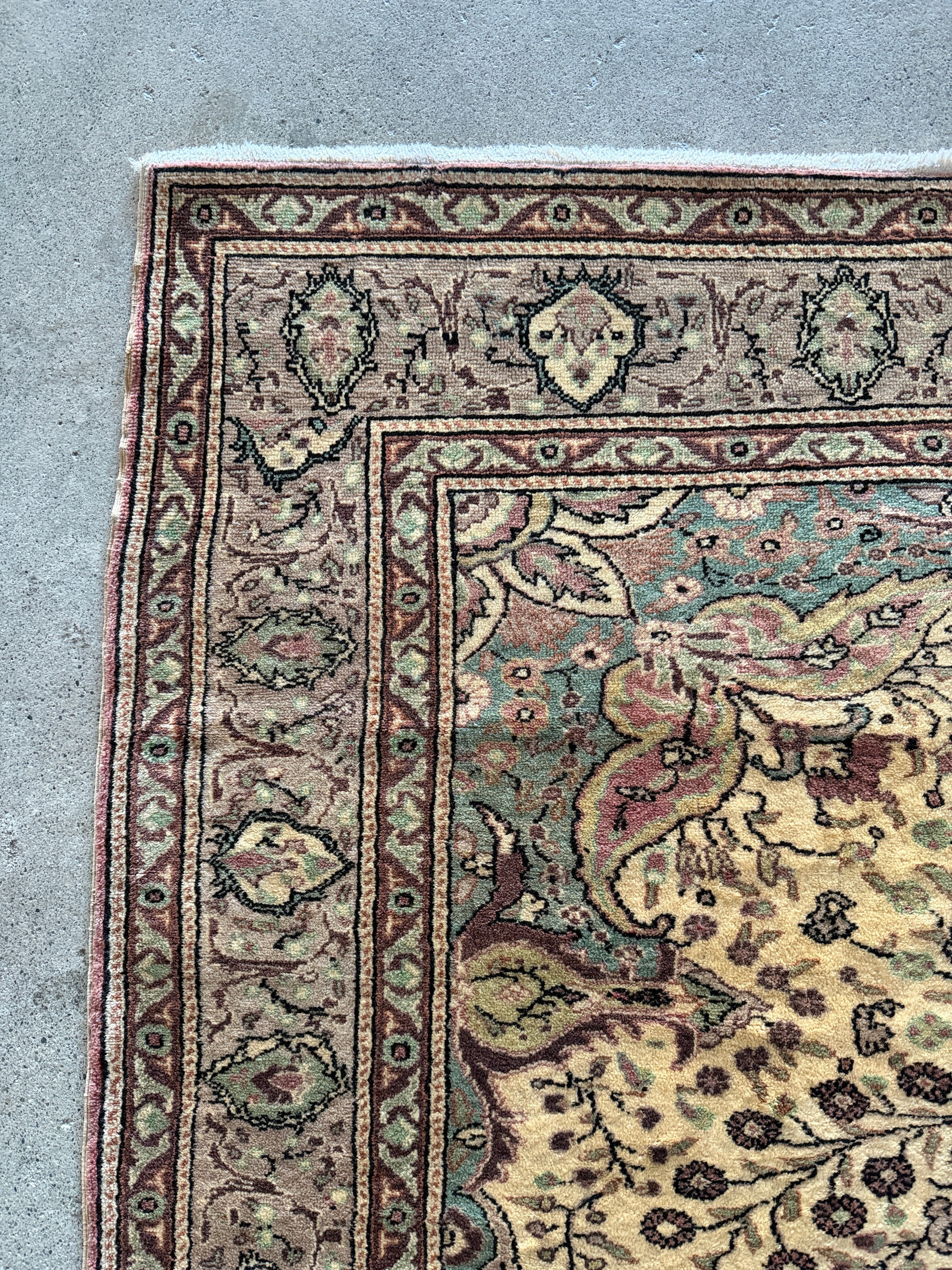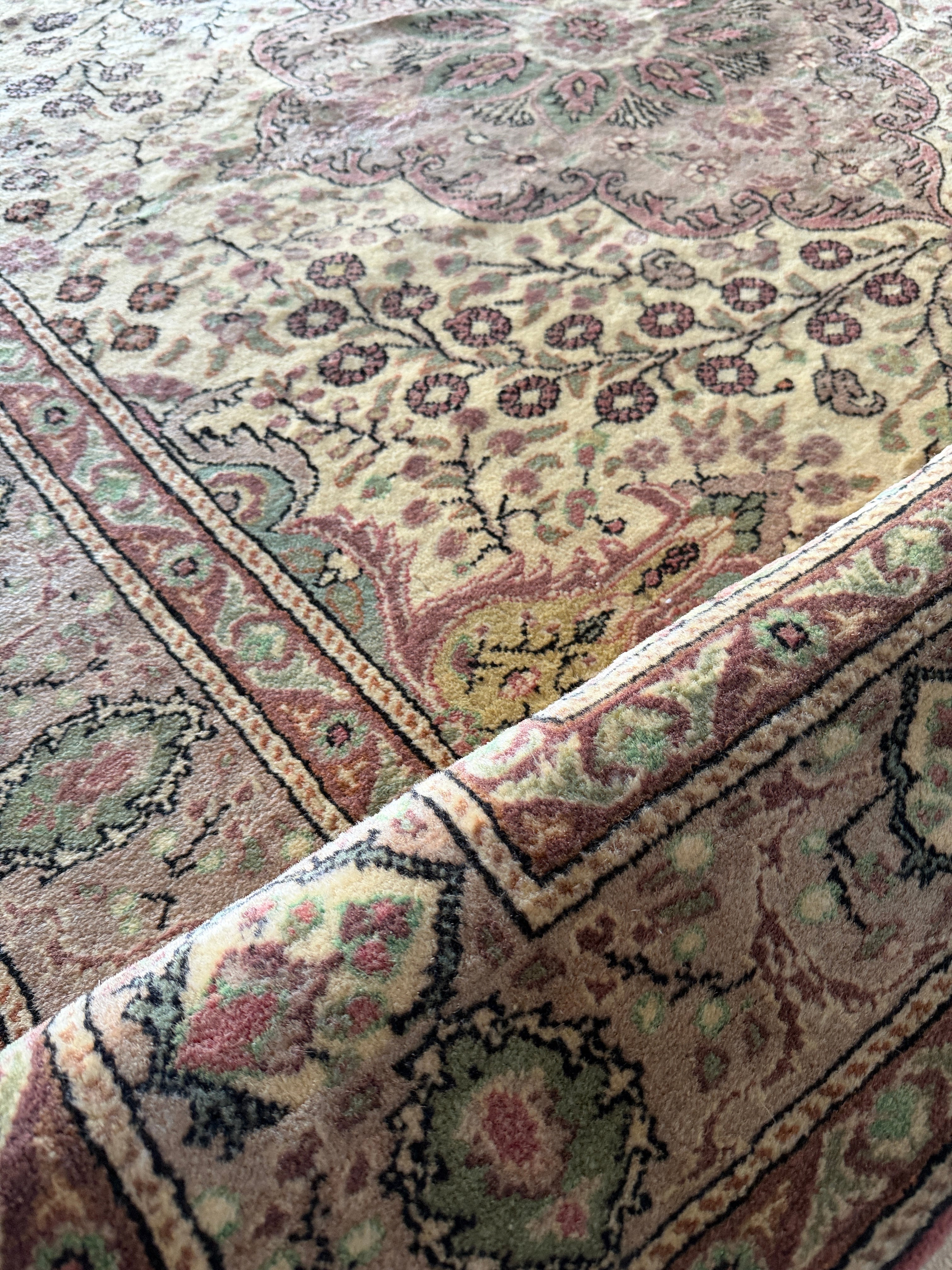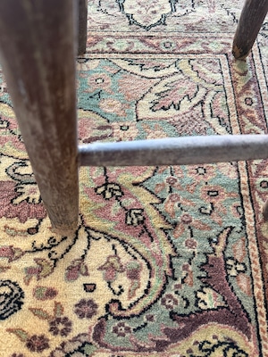 ナチュラルなベージュに淡いブルーグリーンの色使い、花模様に彩られたくすみピンクのクラッシックなメダリオンも華やかすぎない上品さがあり、この絶妙な塩梅が個人的に気に入っています。毛足もやわらかで気持ちがいい肌触りです!