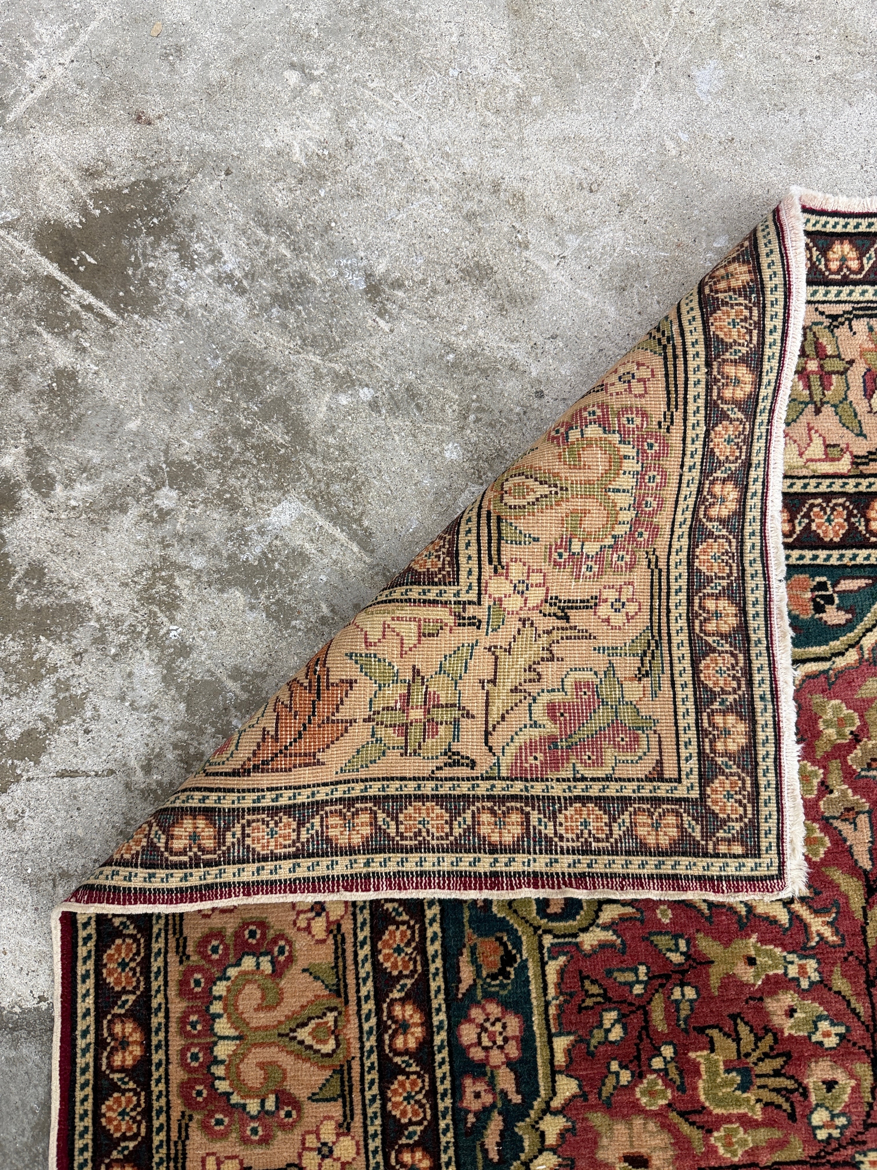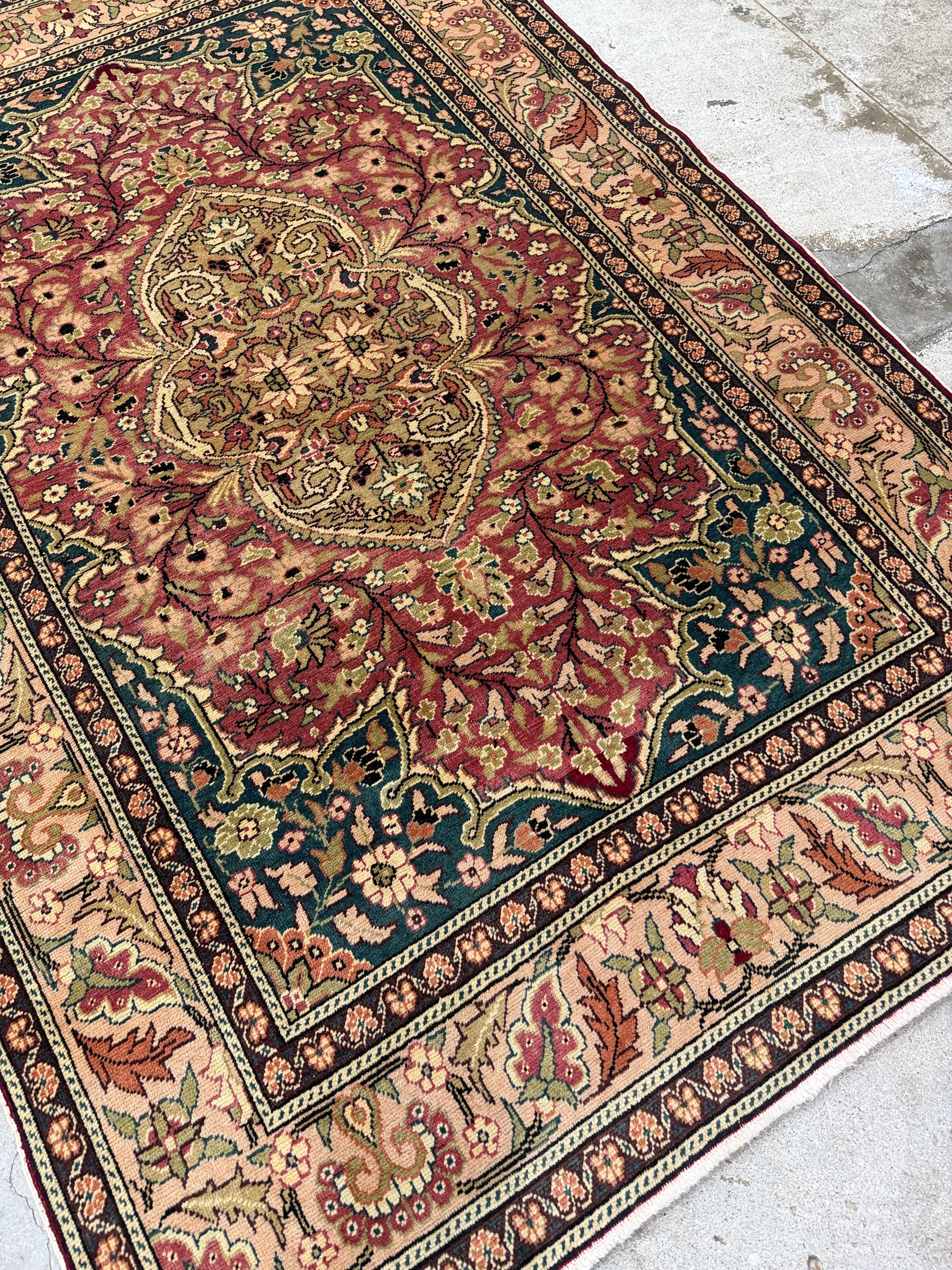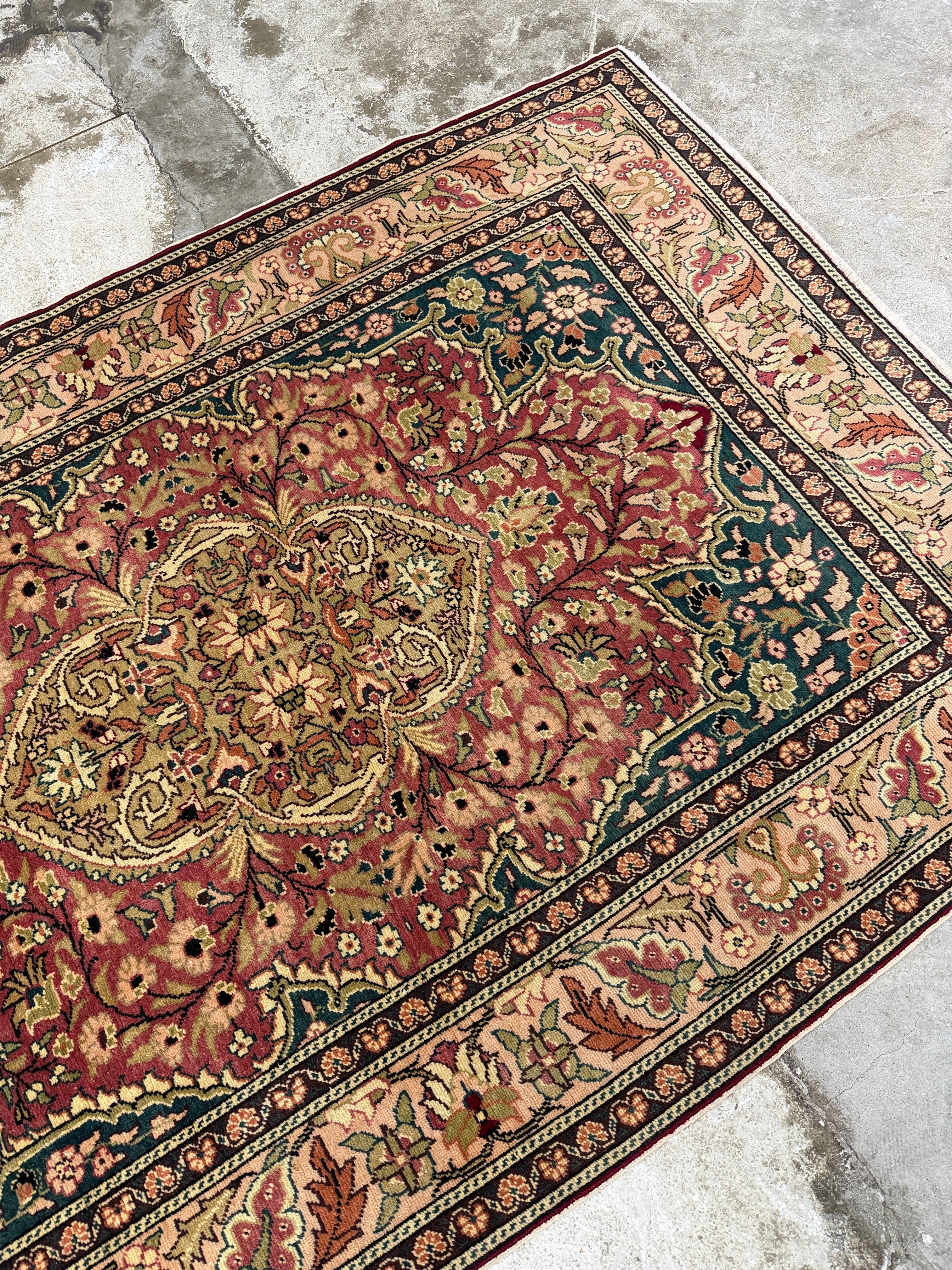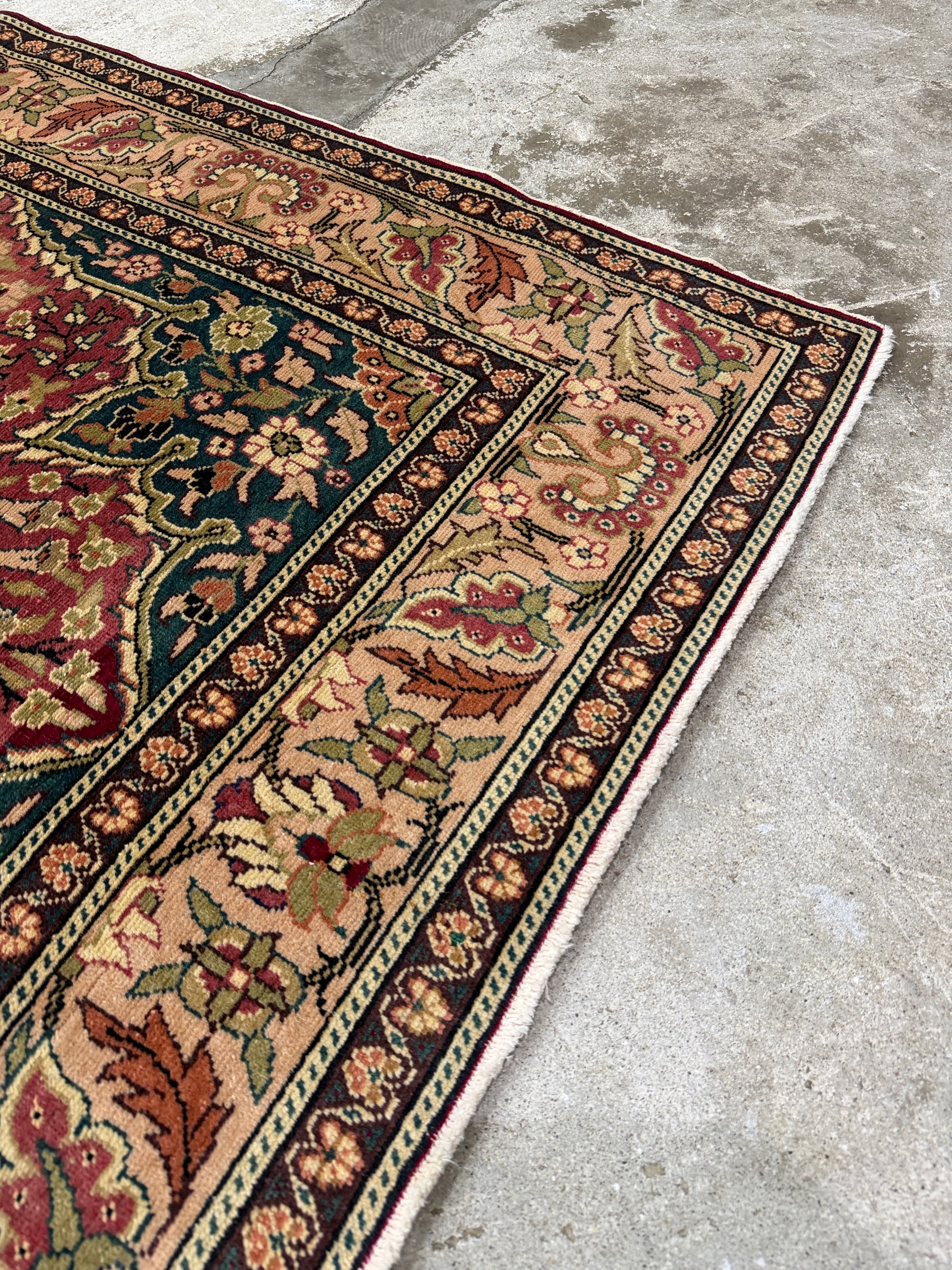 人気のデッドストック(未使用品)からクラッシックでモダンな1枚をご紹介します。深いグリーンとグラデーションレッド、花模様に囲まれた美しいメダリオンはどこかレトロさもあって気に入っています。