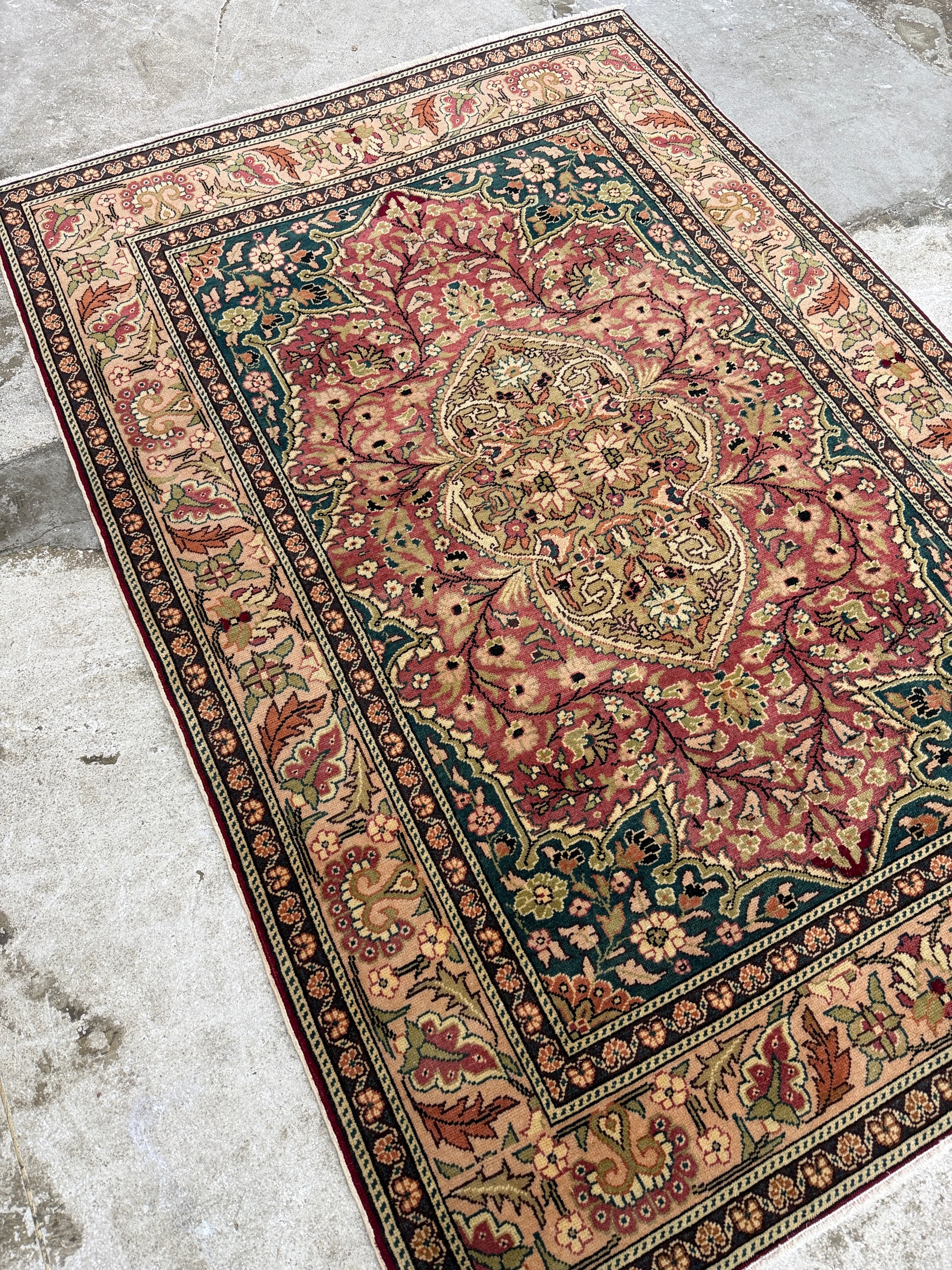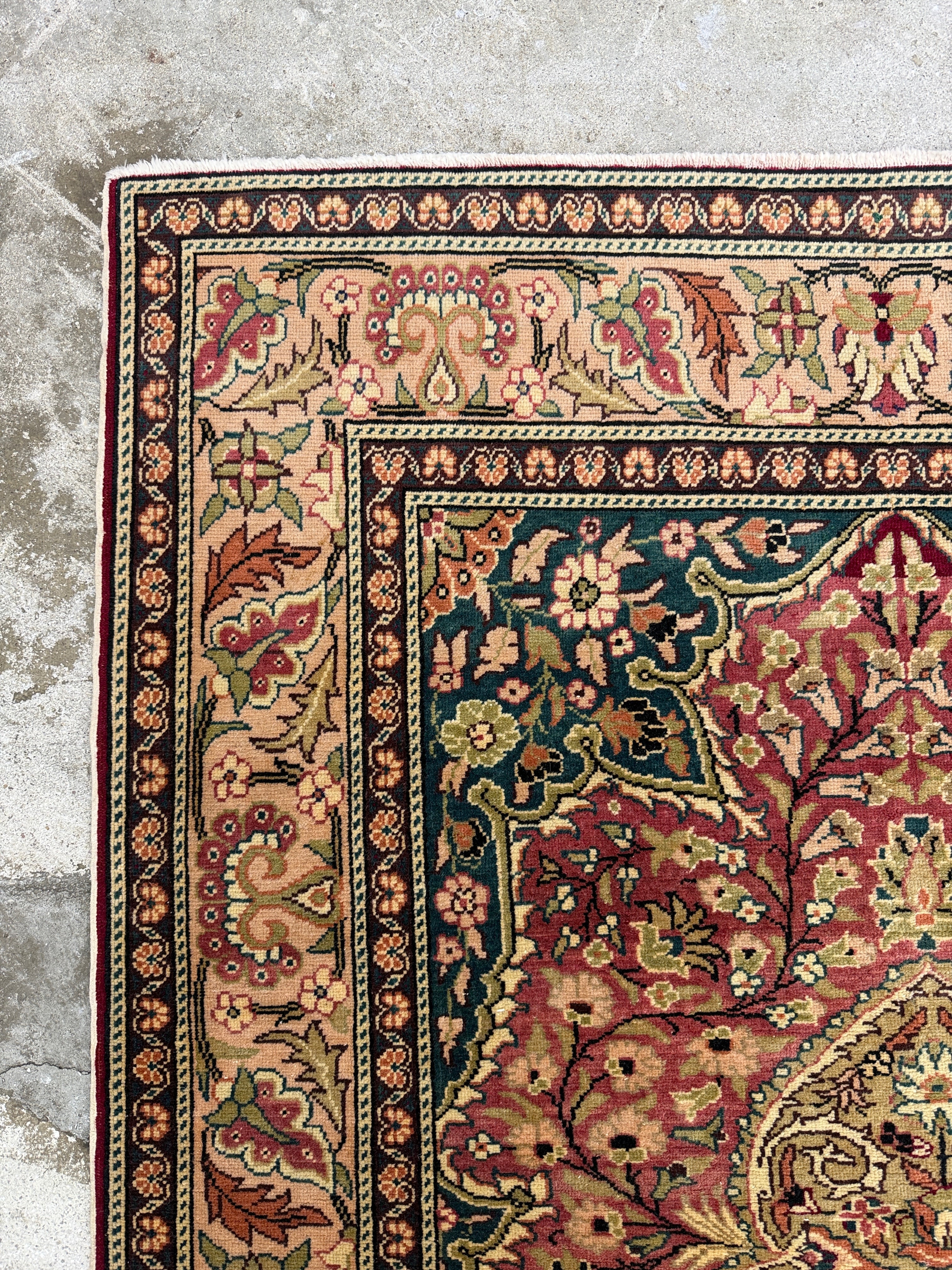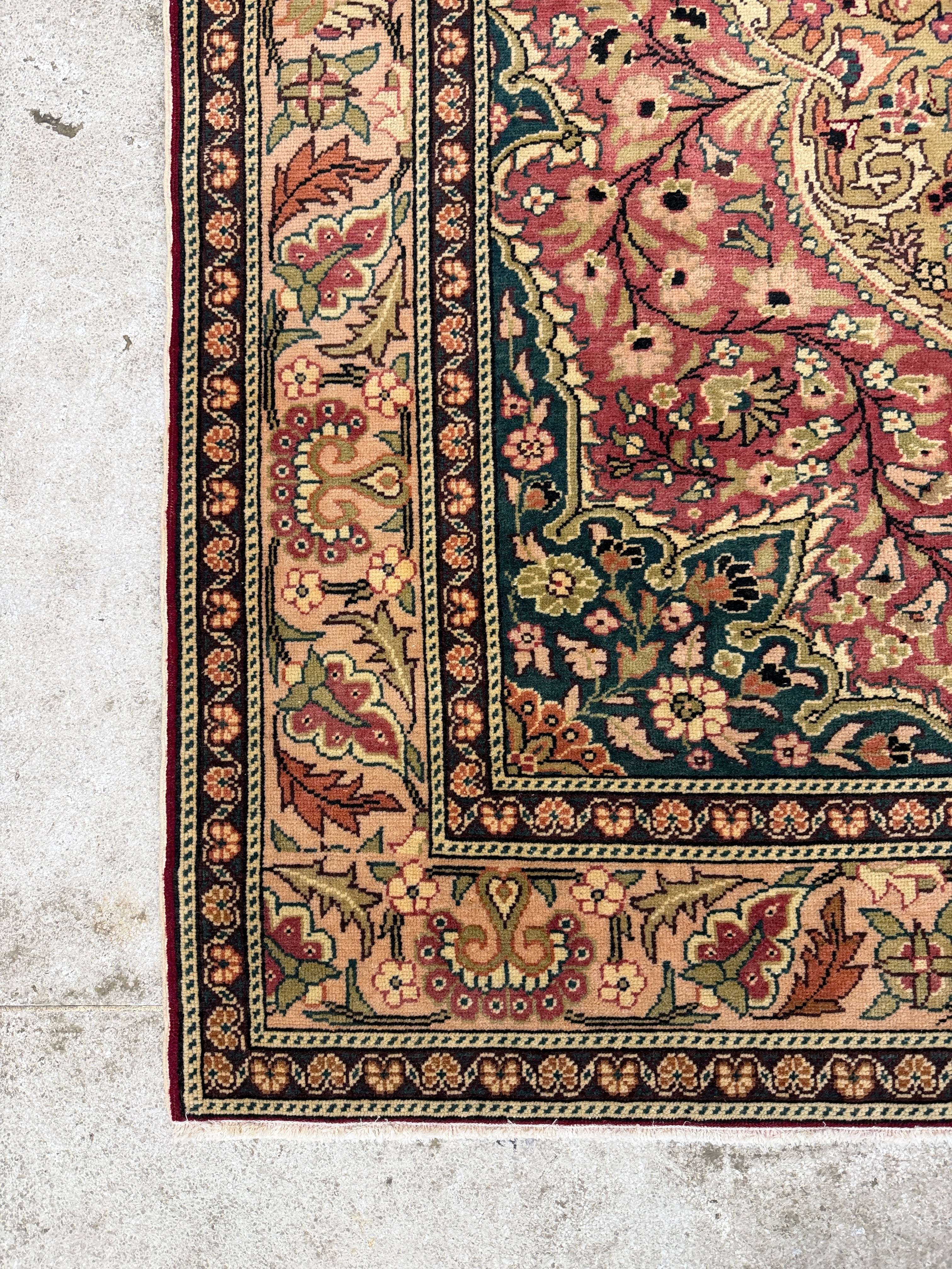 人気のデッドストック(未使用品)からクラッシックでモダンな1枚をご紹介します。深いグリーンとグラデーションレッド、花模様に囲まれた美しいメダリオンはどこかレトロさもあって気に入っています。