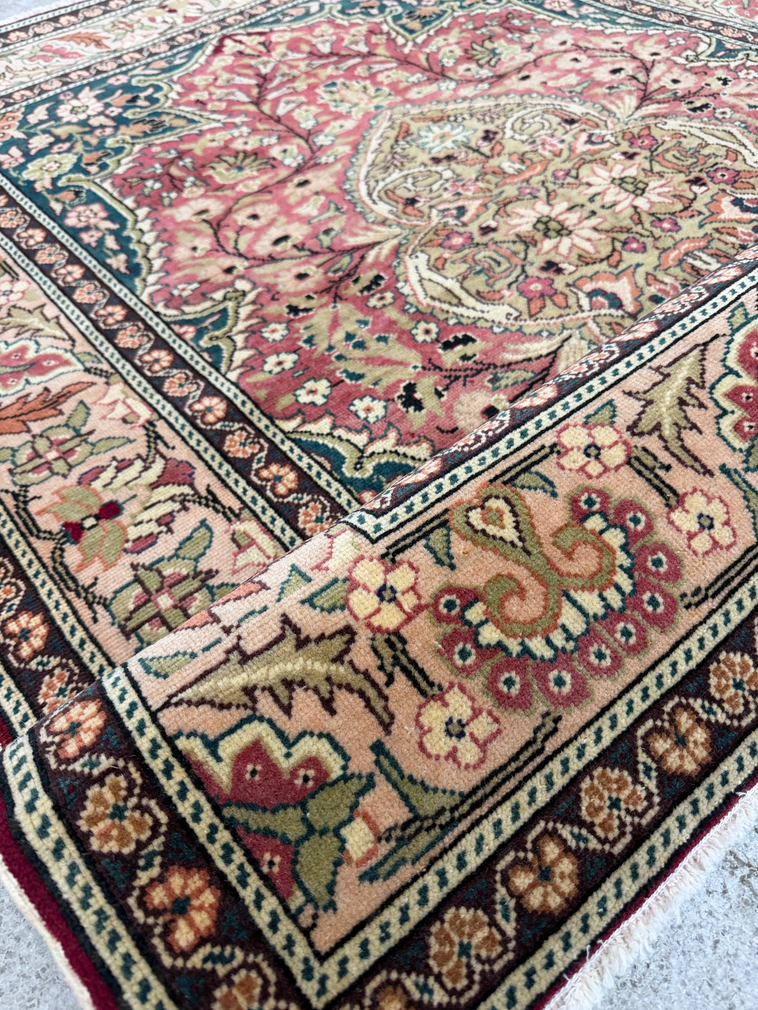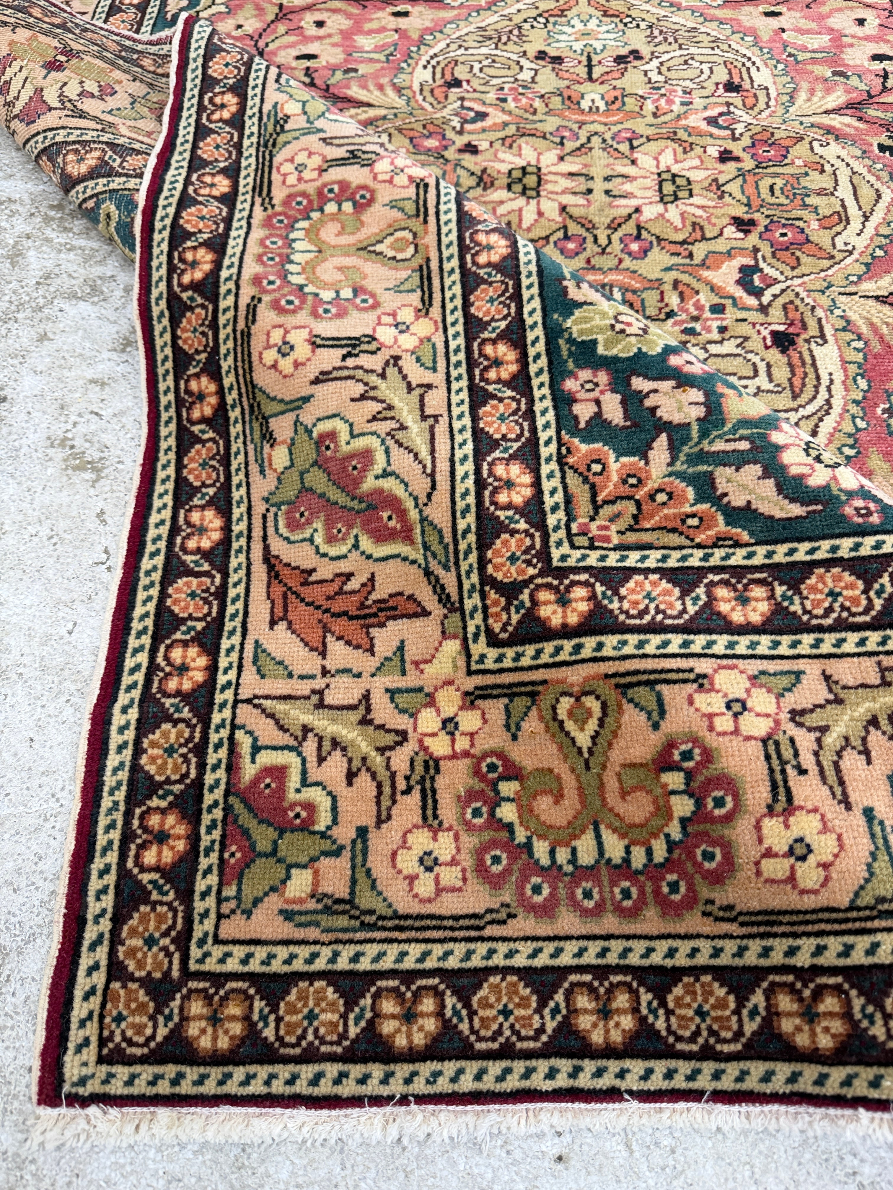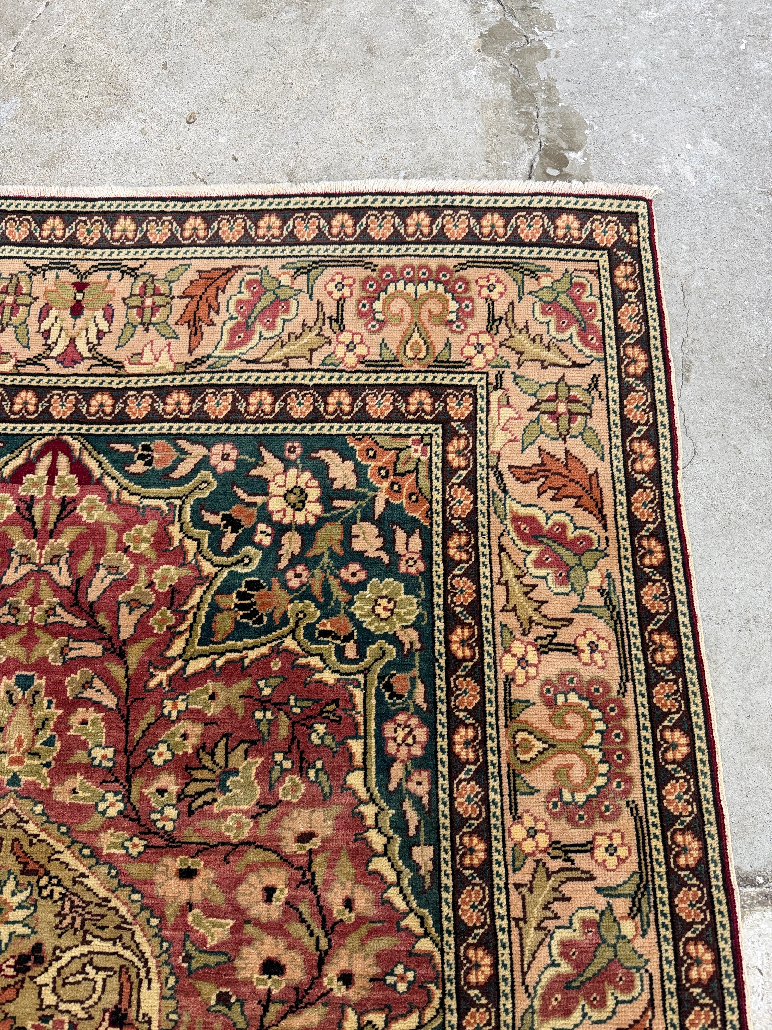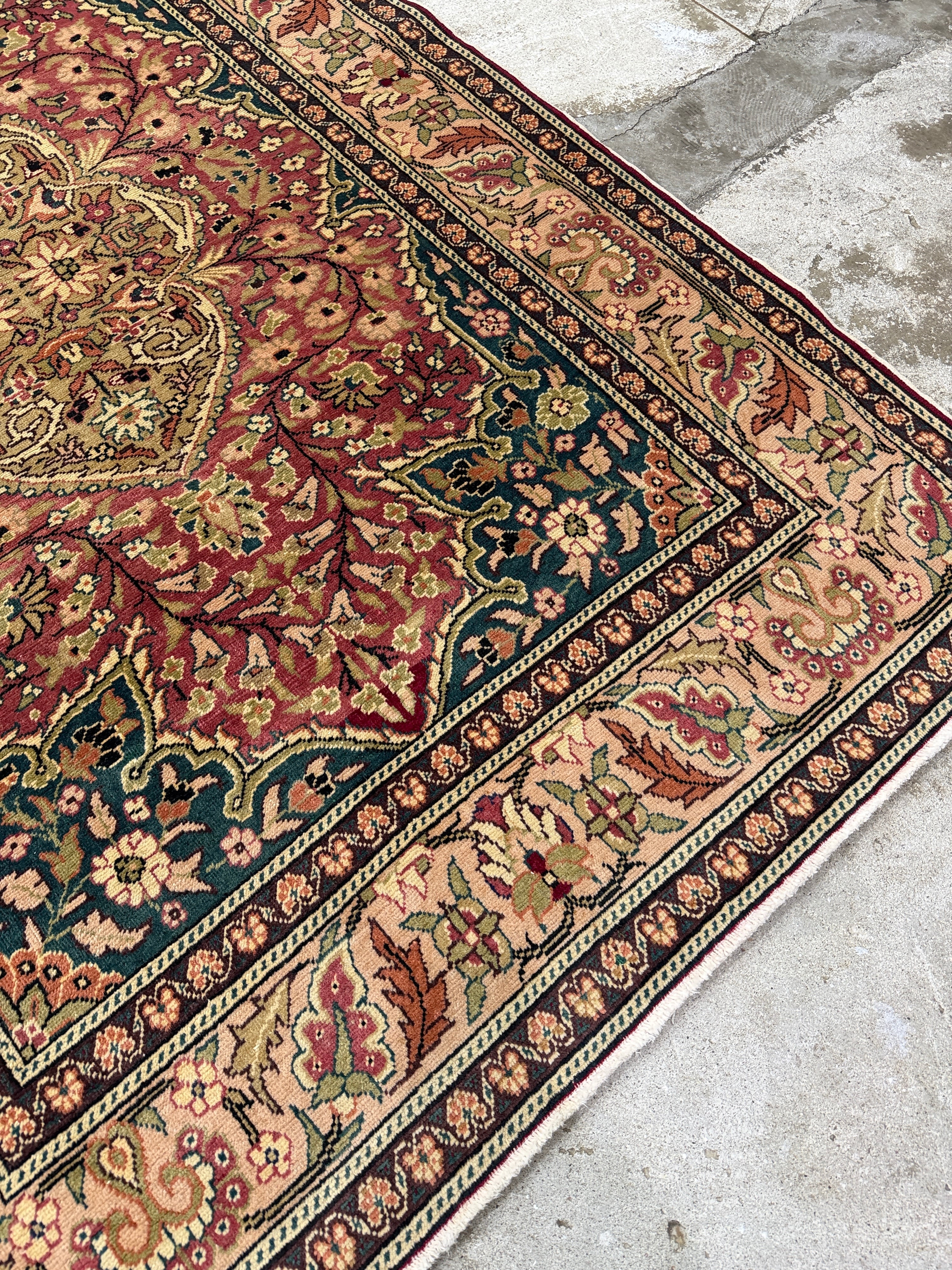 人気のデッドストック(未使用品)からクラッシックでモダンな1枚をご紹介します。深いグリーンとグラデーションレッド、花模様に囲まれた美しいメダリオンはどこかレトロさもあって気に入っています。