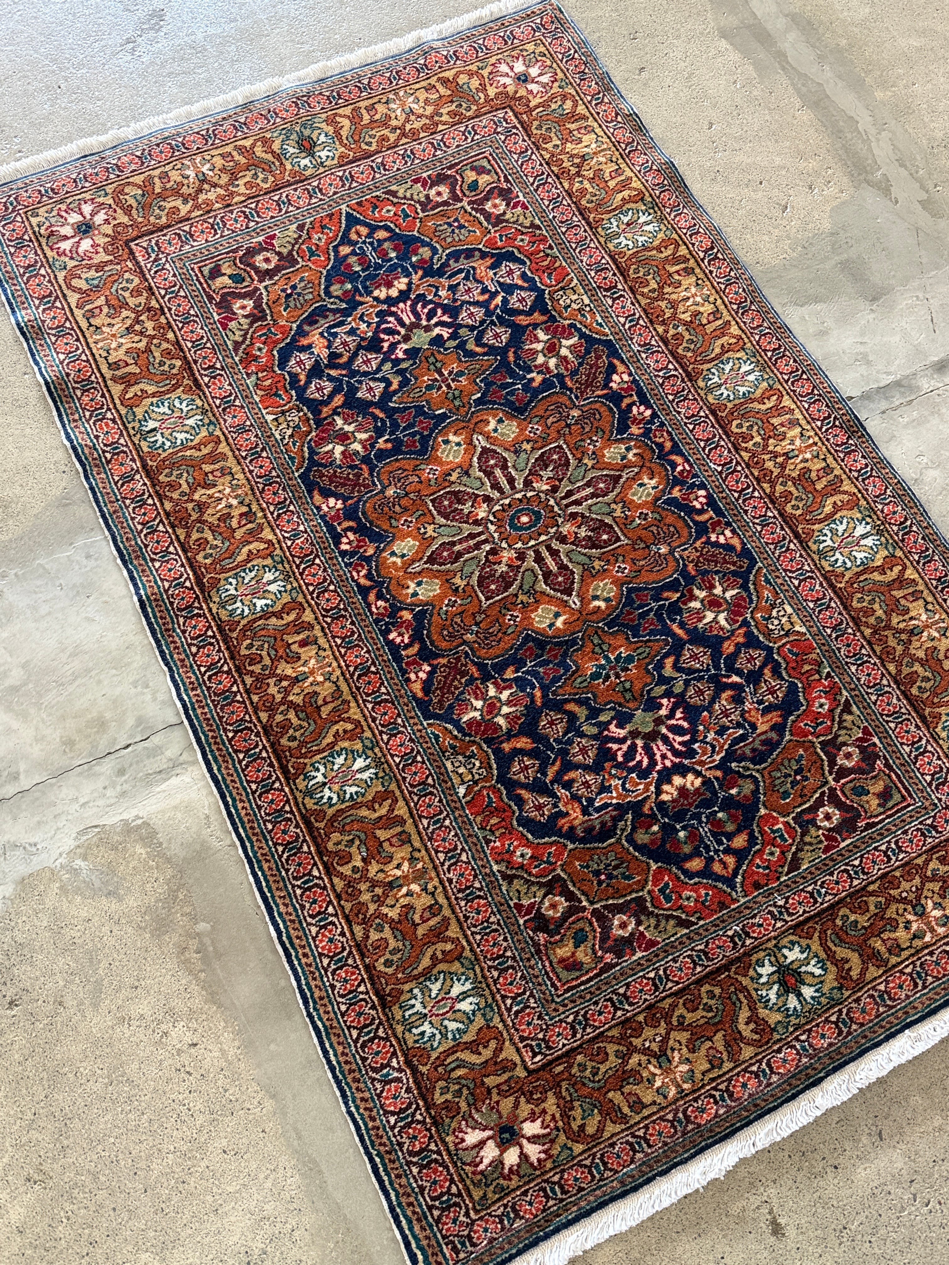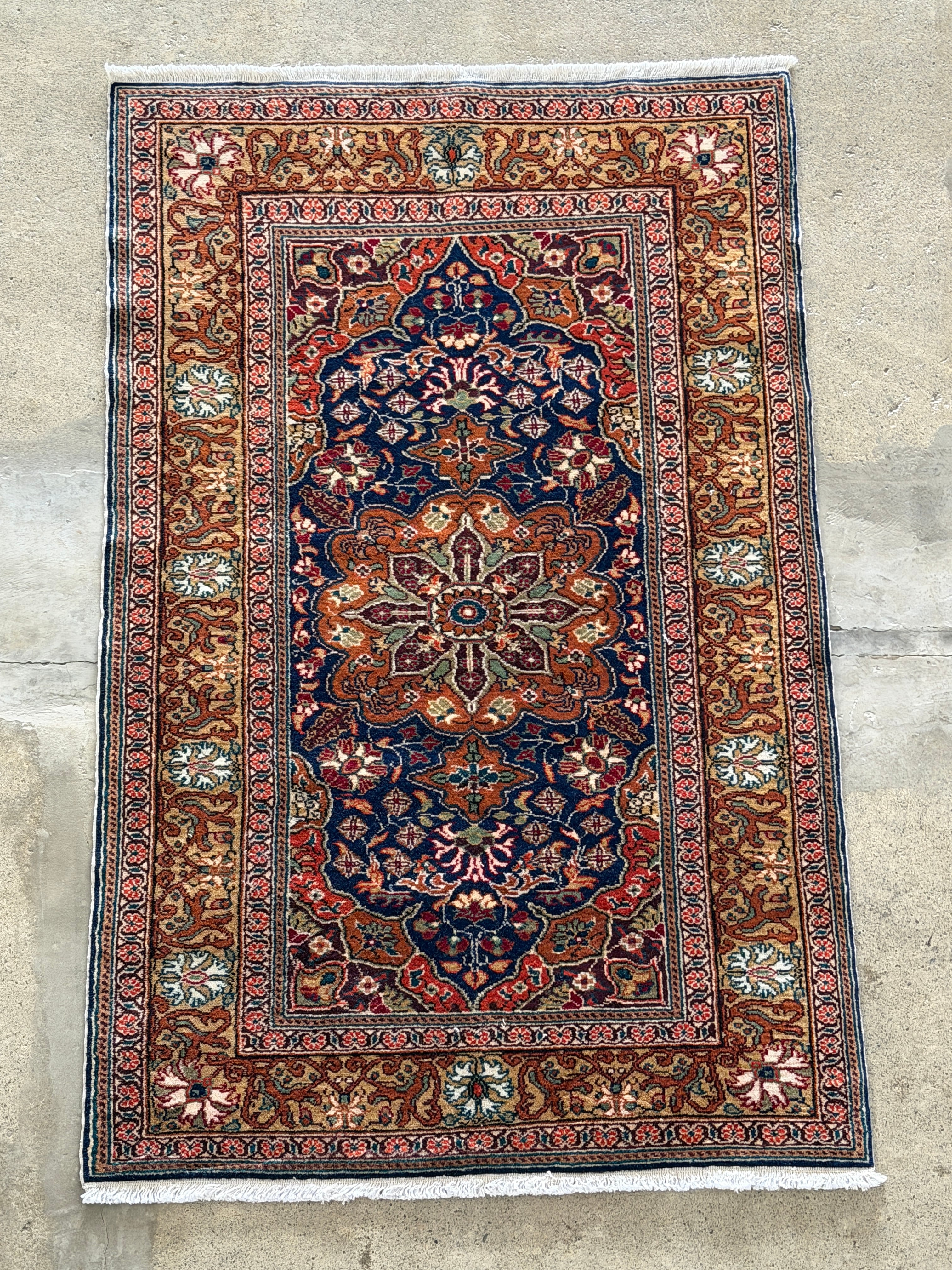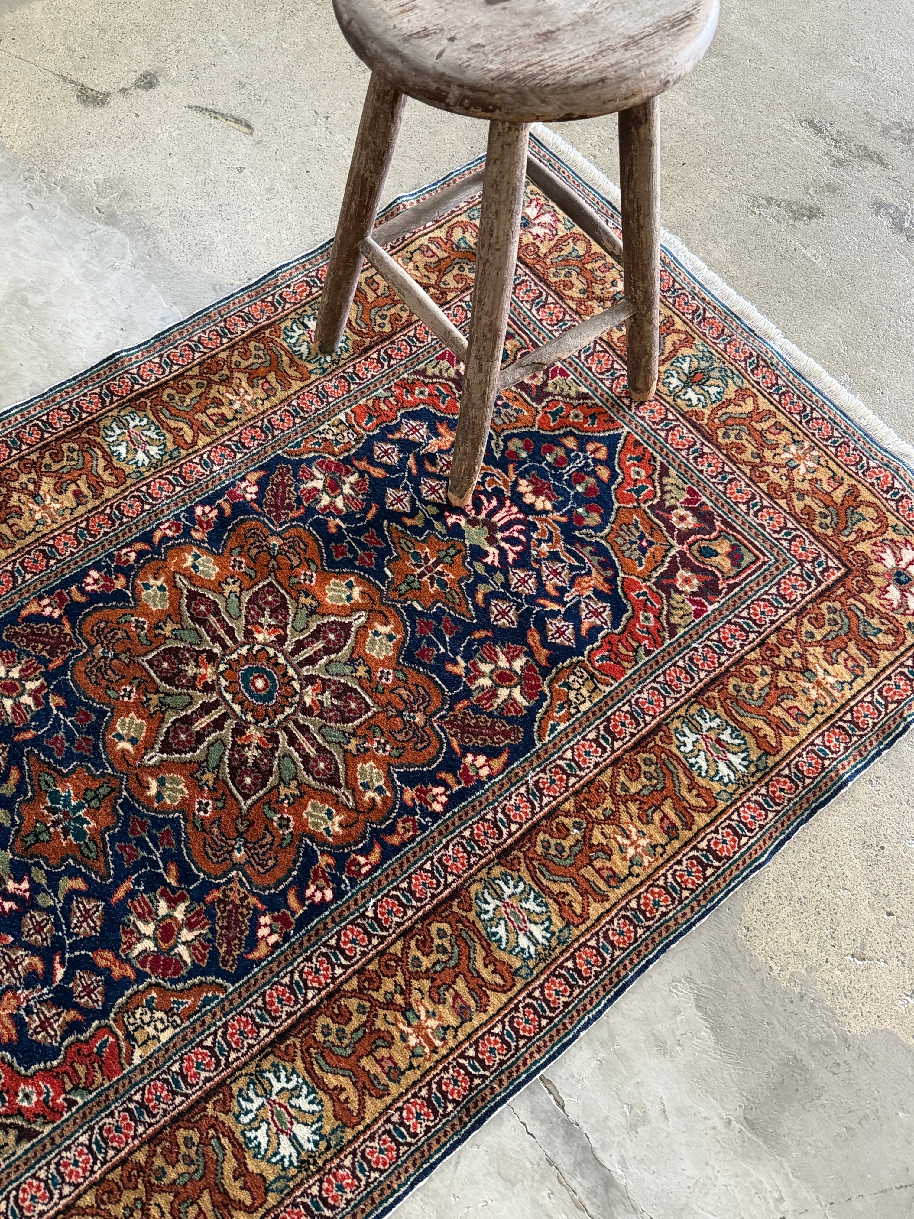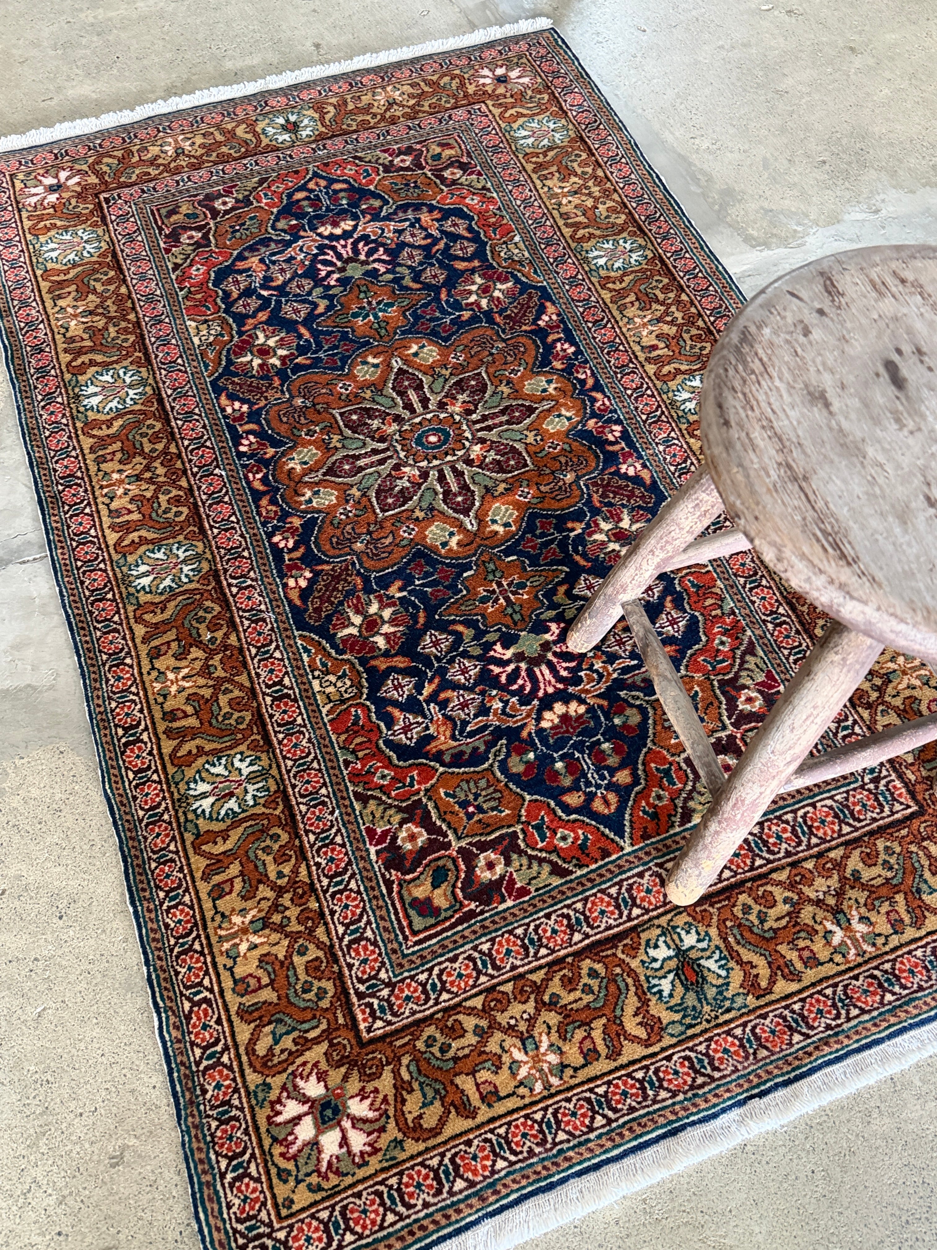 玄関マットサイズの美しいカイセリ絨毯。密度が高く重厚感があり、小さいサイズではありますが存在感は抜群です!キャメルとロイヤルブルーの上品な組み合わせにナチュラルな春らしいグリーンが気に入っています。ぜひちょっとしたお気に入りに空間に敷いてみてくださいね。