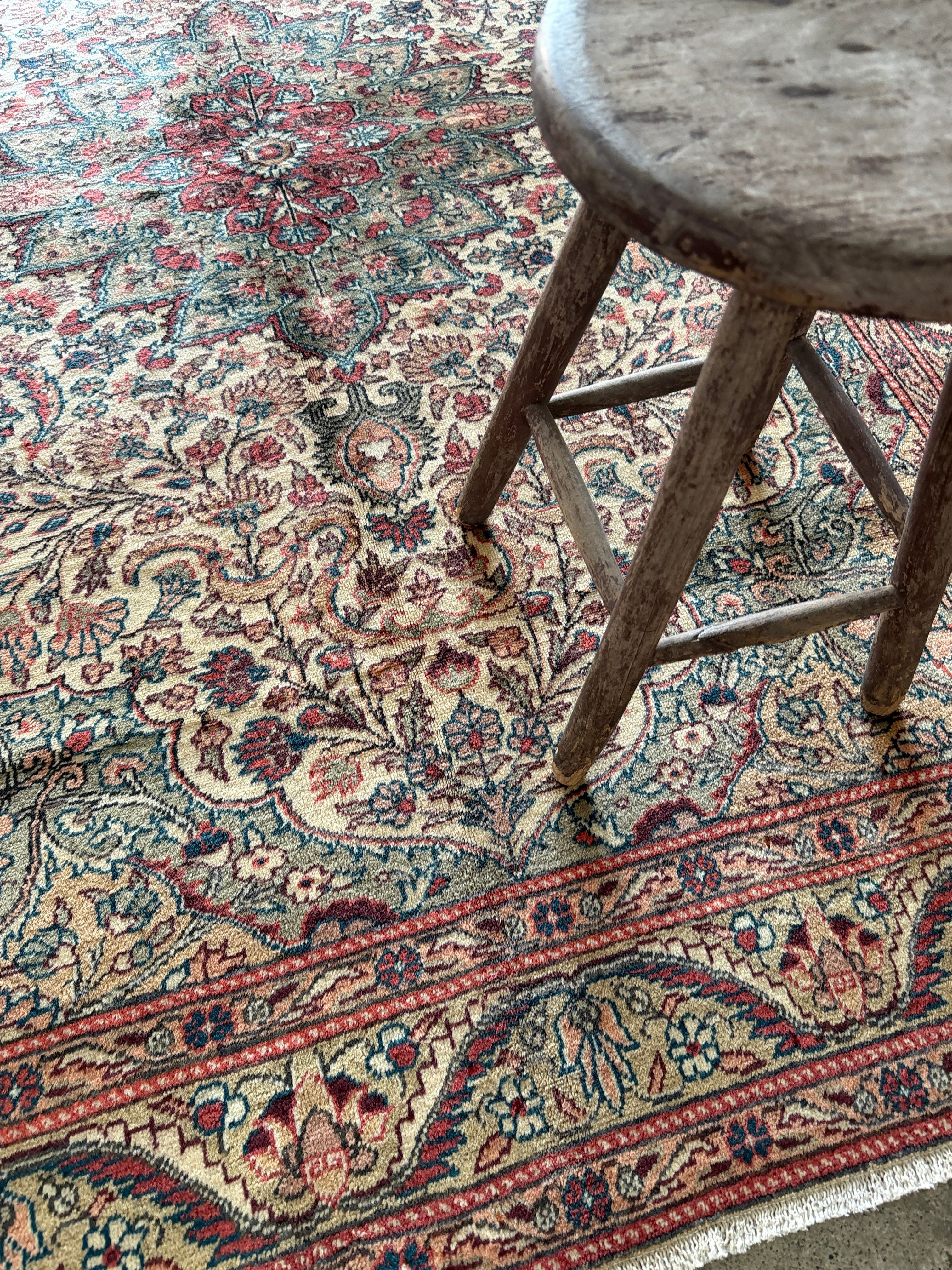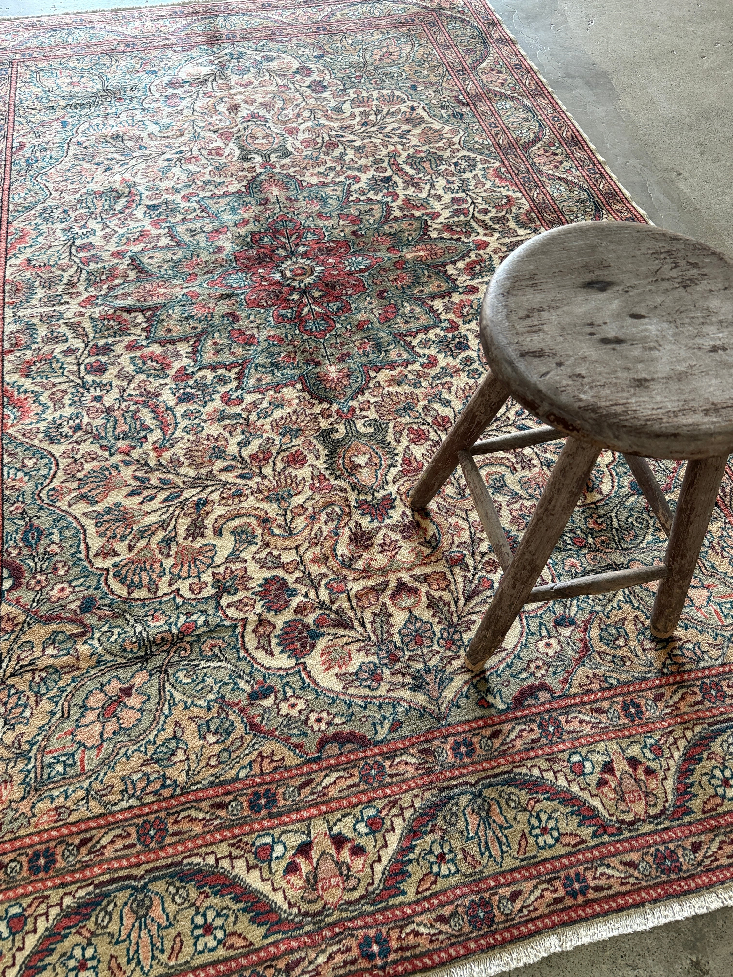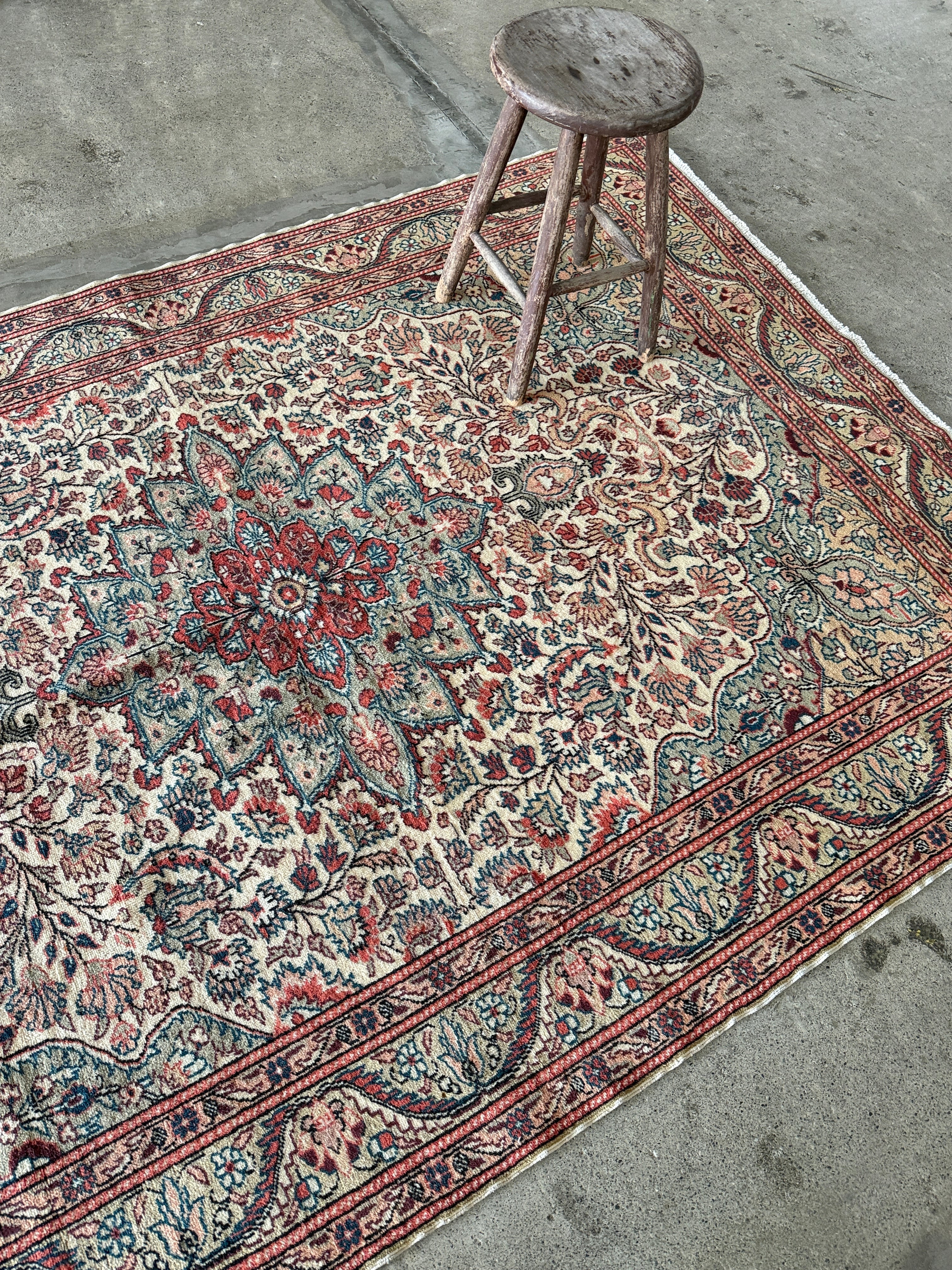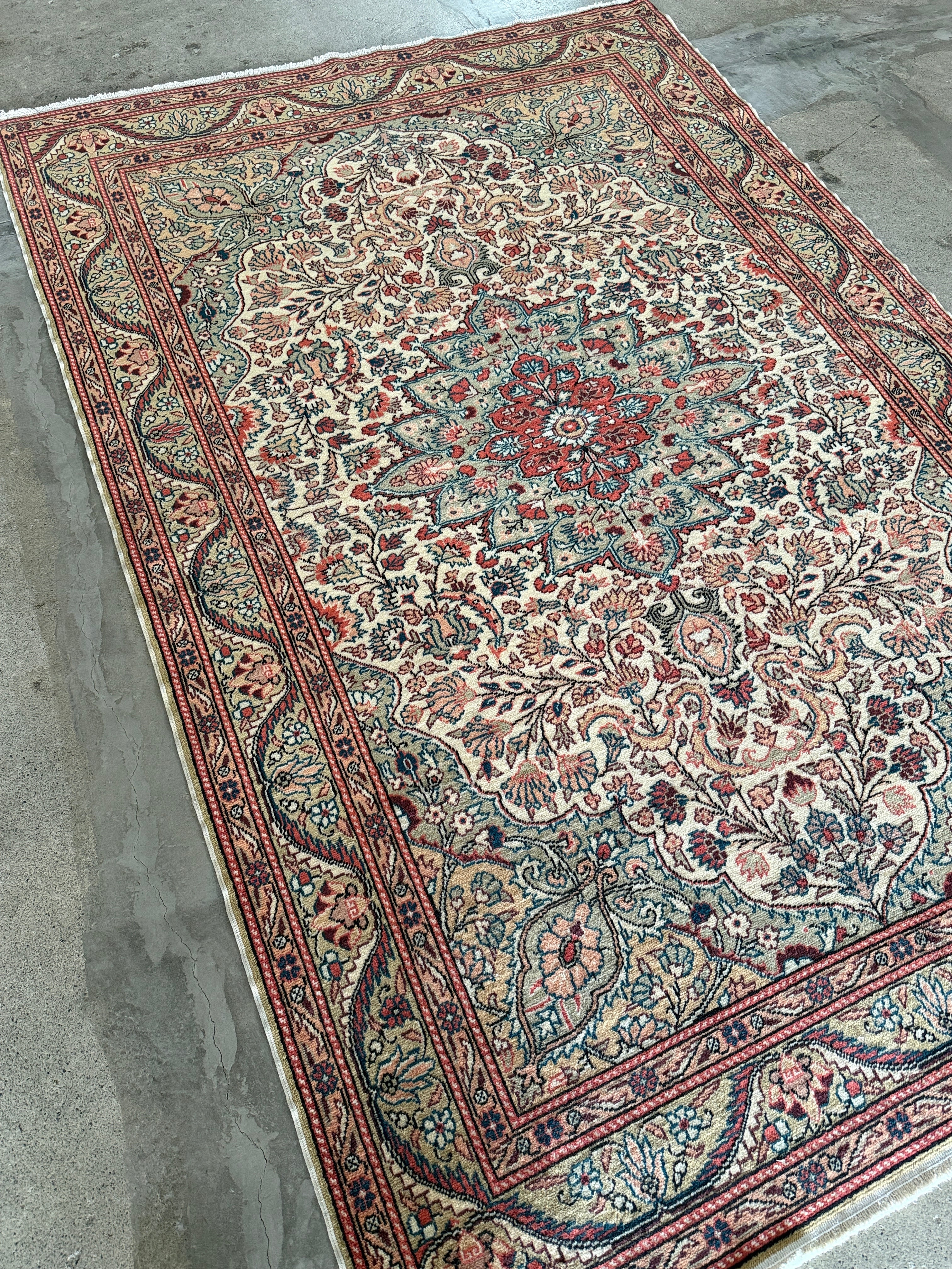 こちらはザ!カイセリ絨毯とも呼べる1枚。カイセリらしいナチュラルなピンクと美しく華やかなメダリオン。淡いグリーンとアクセントになるモダンなブルーの色使いに心奪われました。全体的にナチュラルな色合いなのでどんなインテリアにも合わせやすいと感じます。