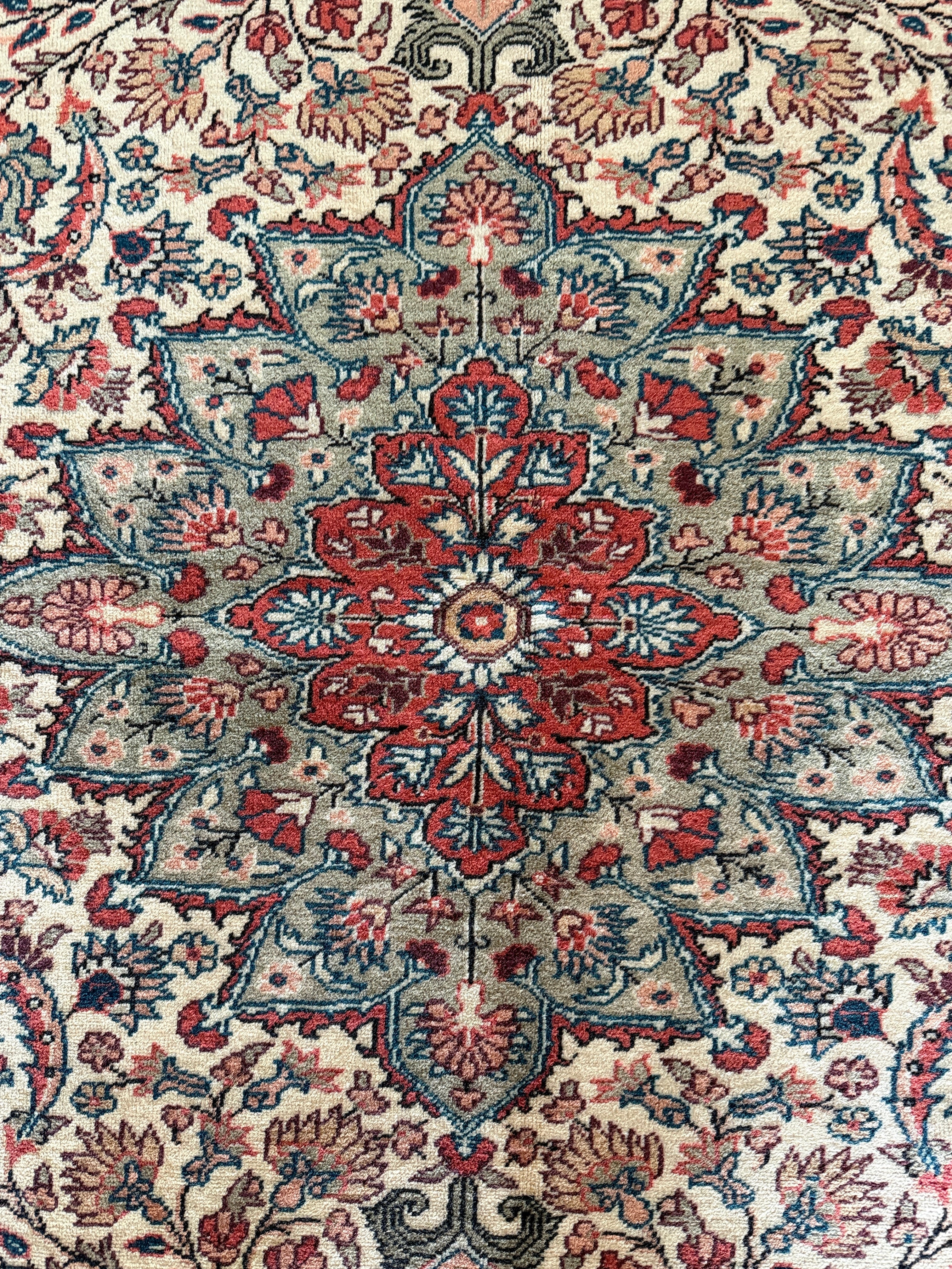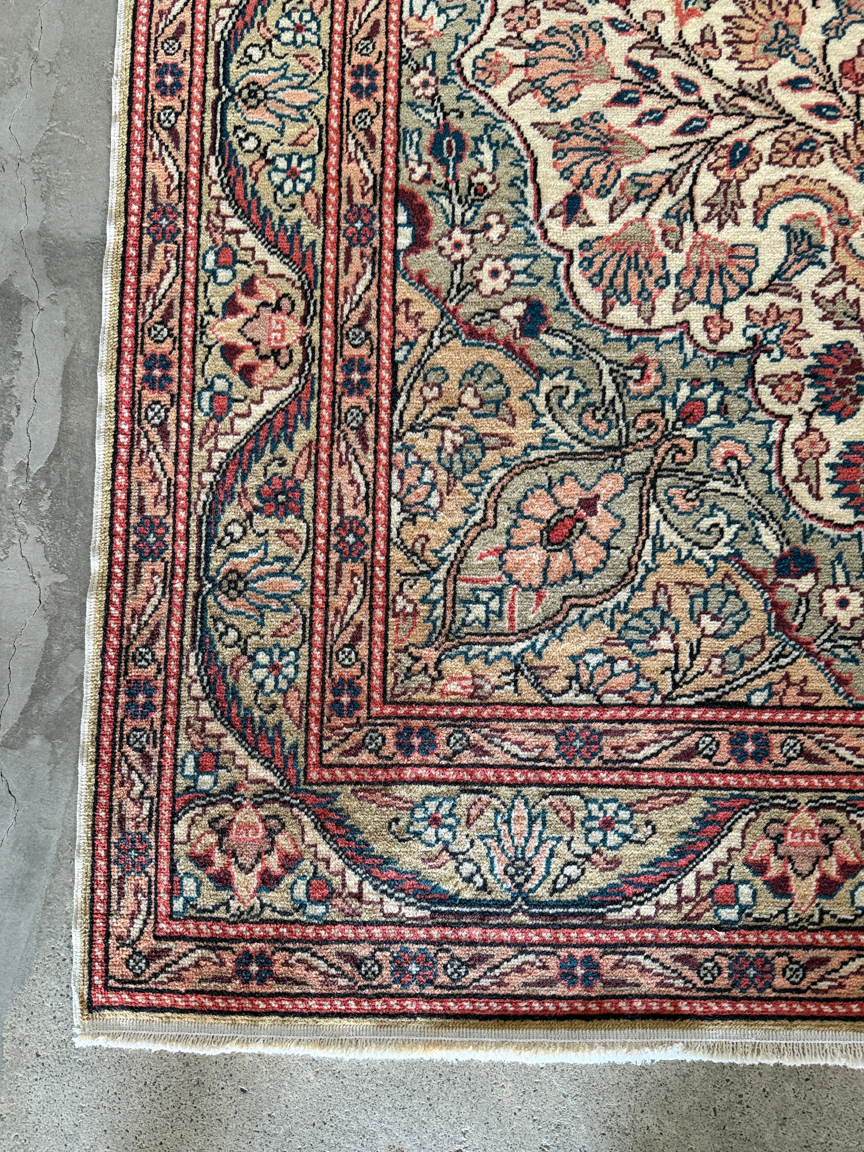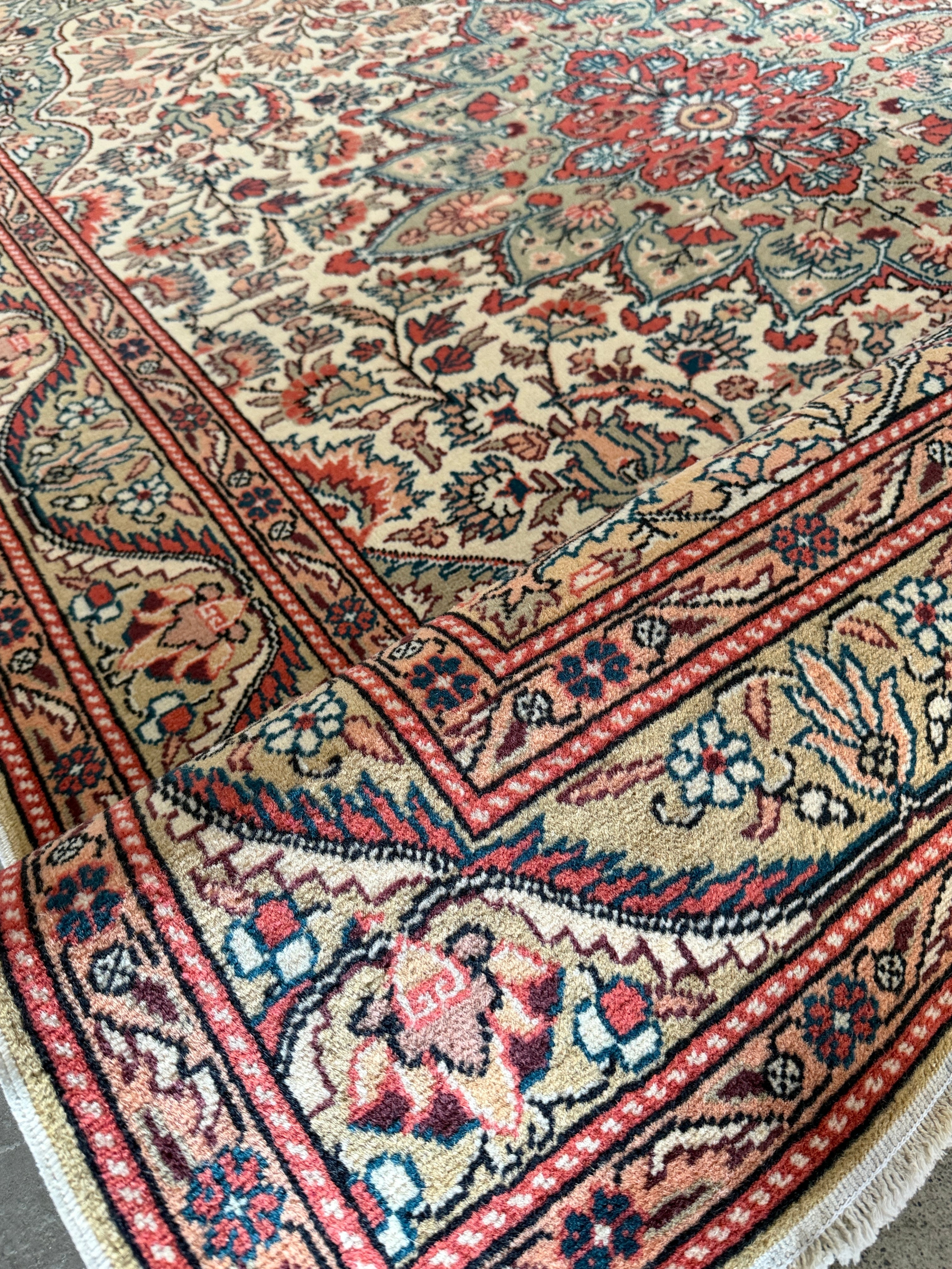 こちらはザ!カイセリ絨毯とも呼べる1枚。カイセリらしいナチュラルなピンクと美しく華やかなメダリオン。淡いグリーンとアクセントになるモダンなブルーの色使いに心奪われました。全体的にナチュラルな色合いなのでどんなインテリアにも合わせやすいと感じます。