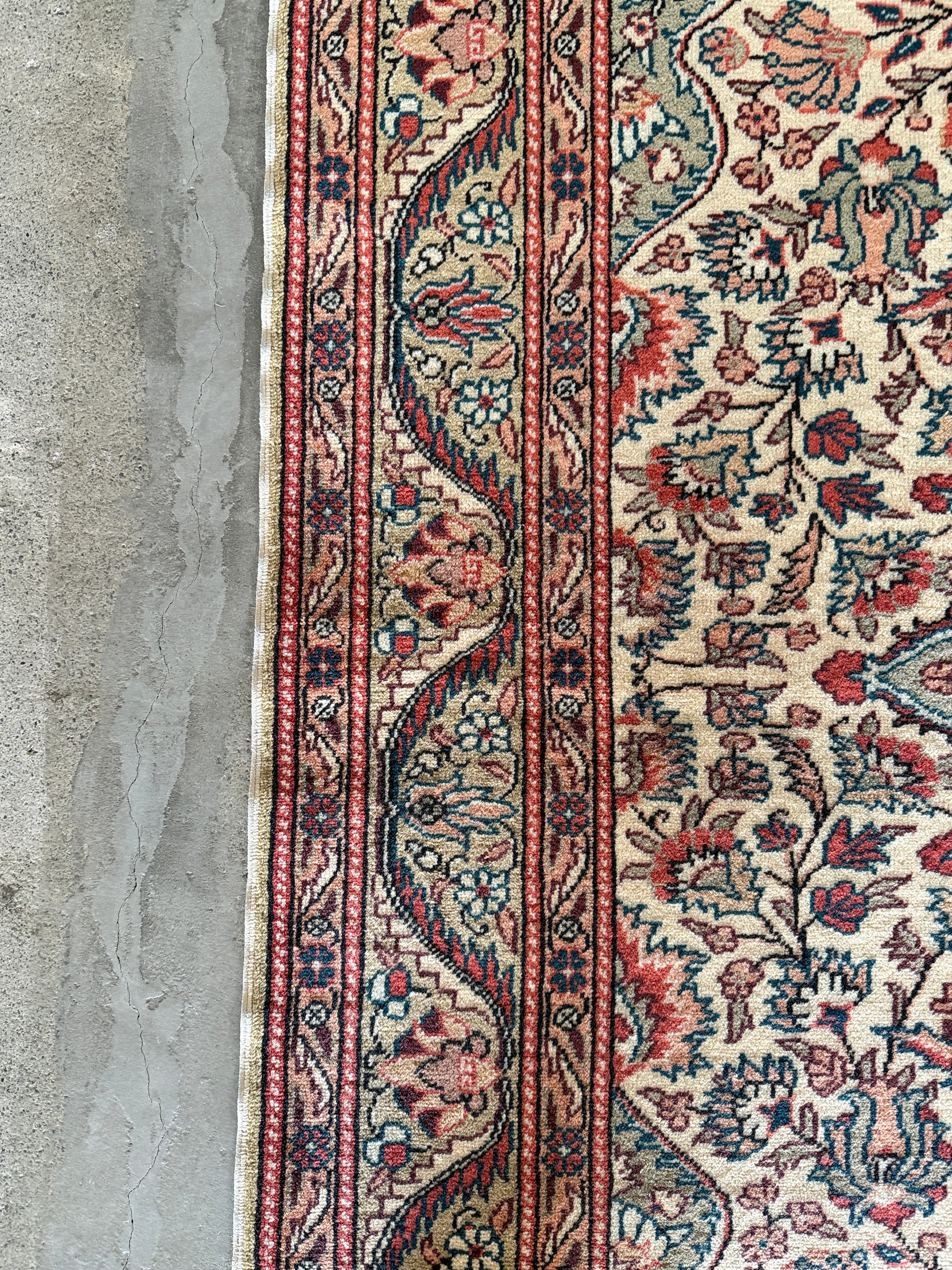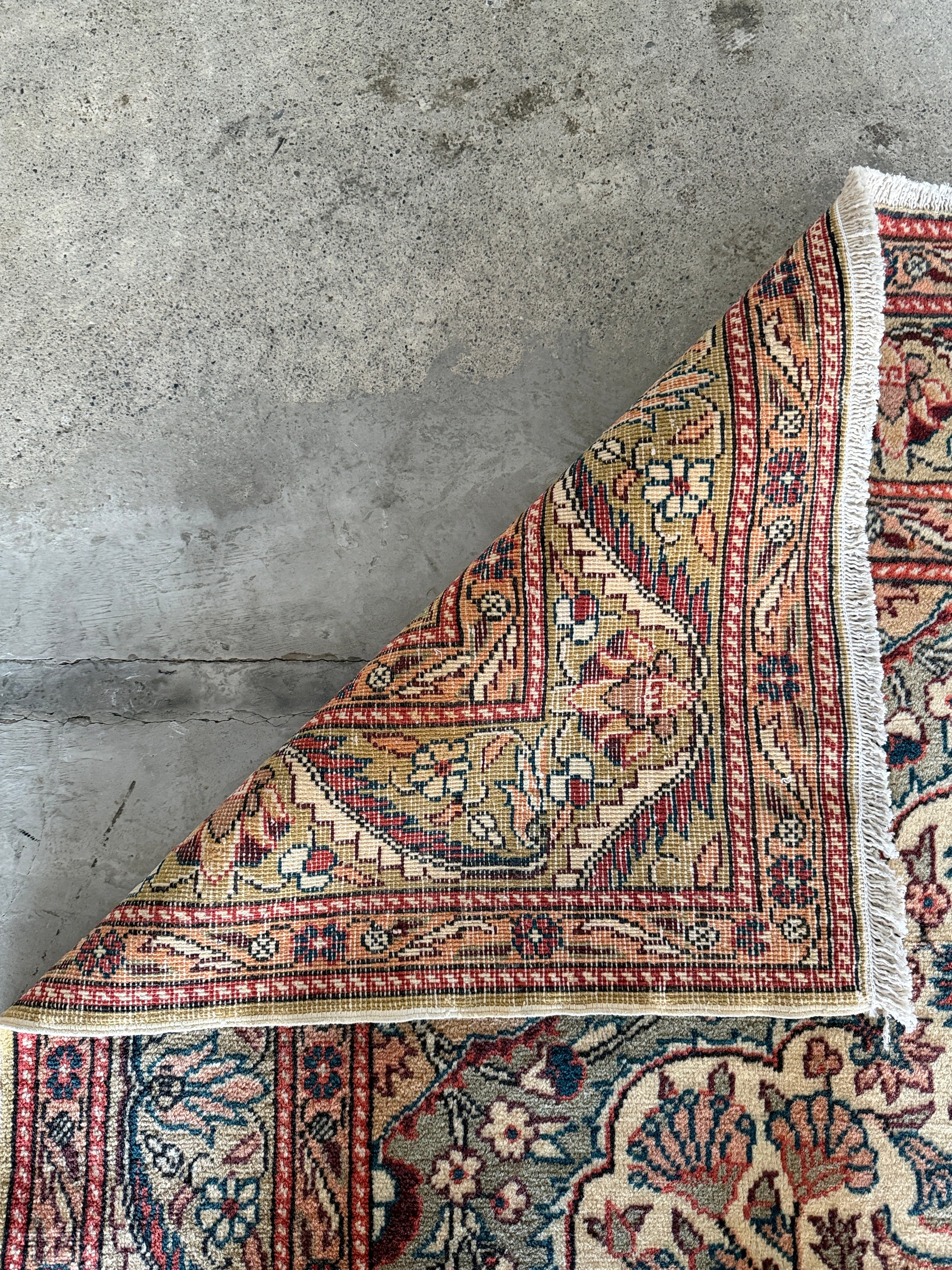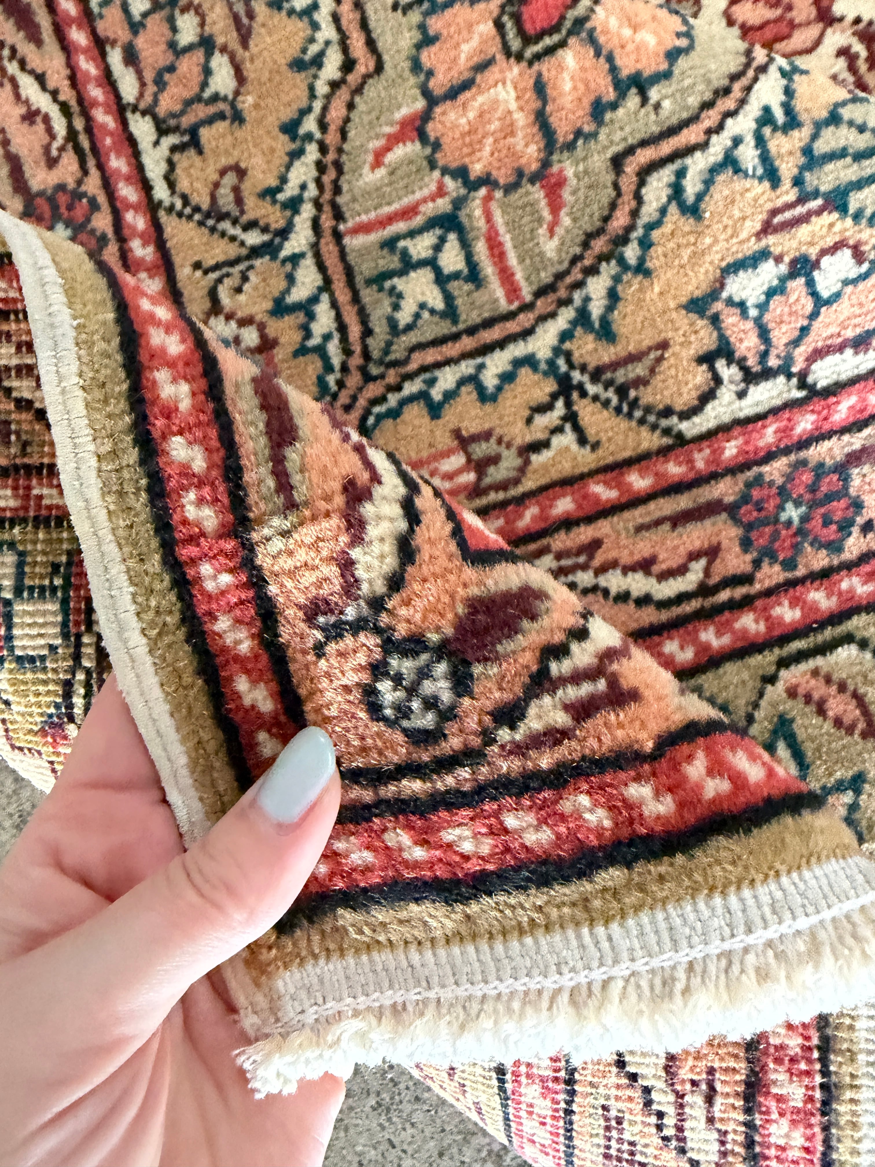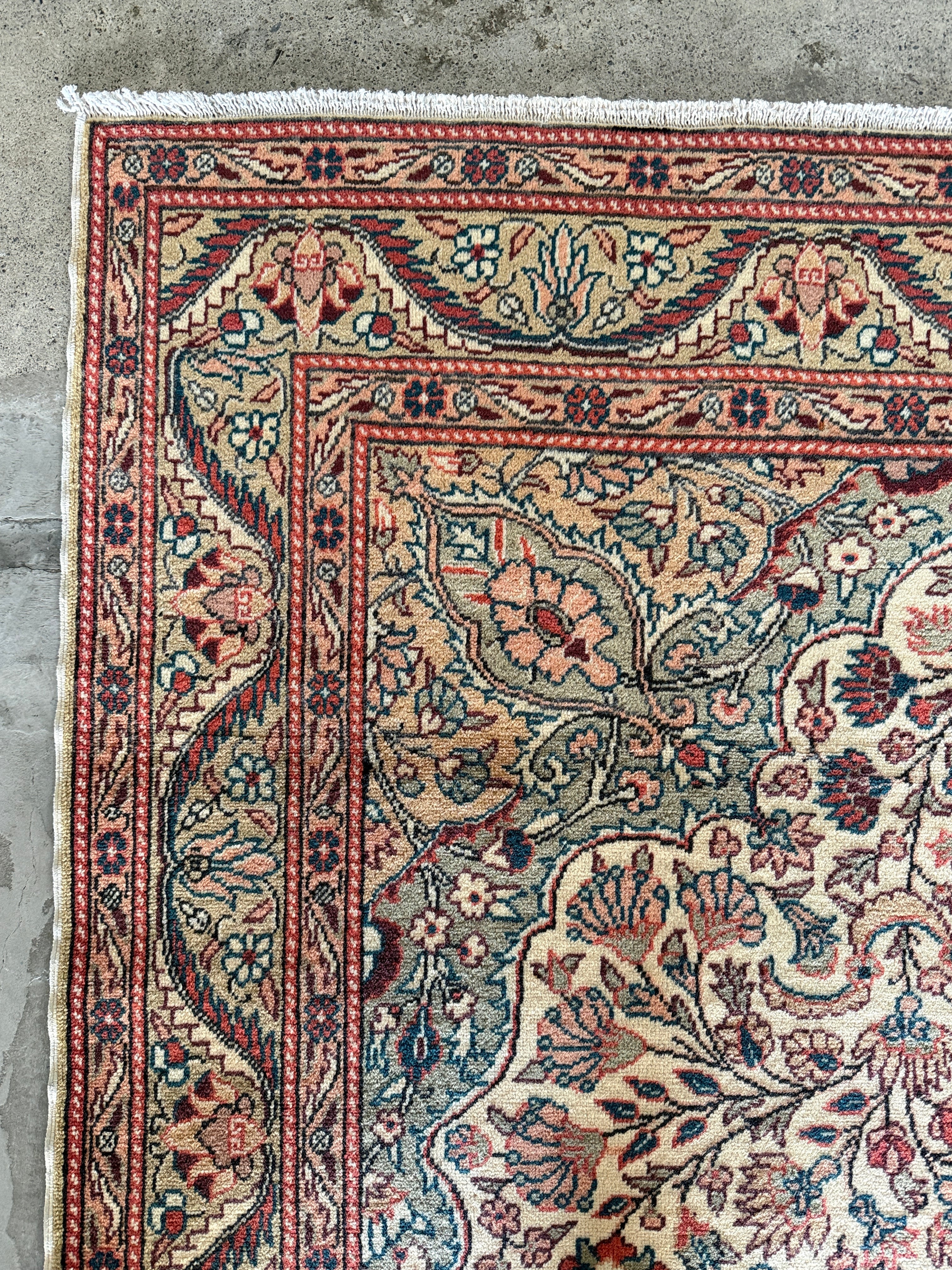こちらはザ!カイセリ絨毯とも呼べる1枚。カイセリらしいナチュラルなピンクと美しく華やかなメダリオン。淡いグリーンとアクセントになるモダンなブルーの色使いに心奪われました。全体的にナチュラルな色合いなのでどんなインテリアにも合わせやすいと感じます。