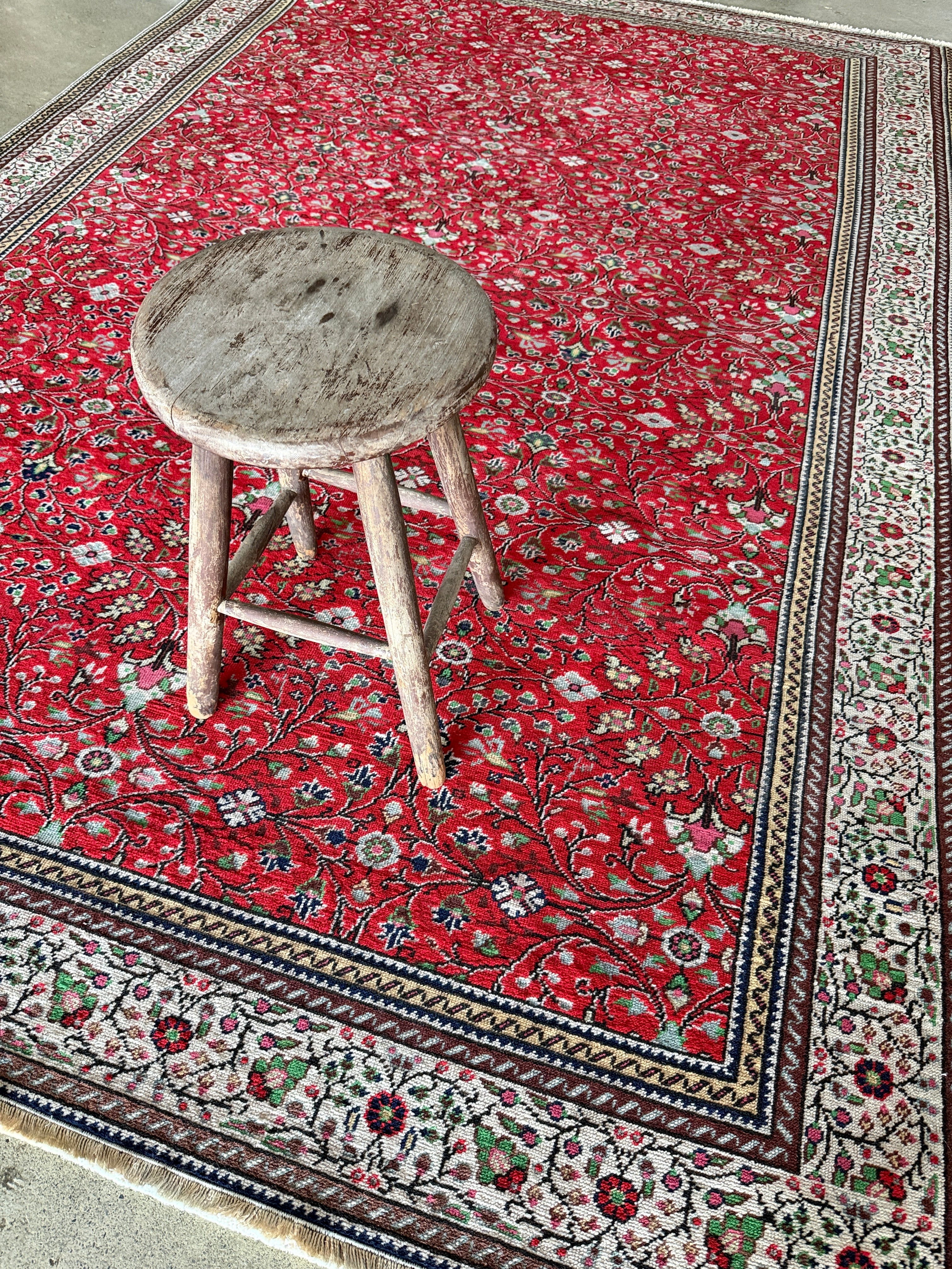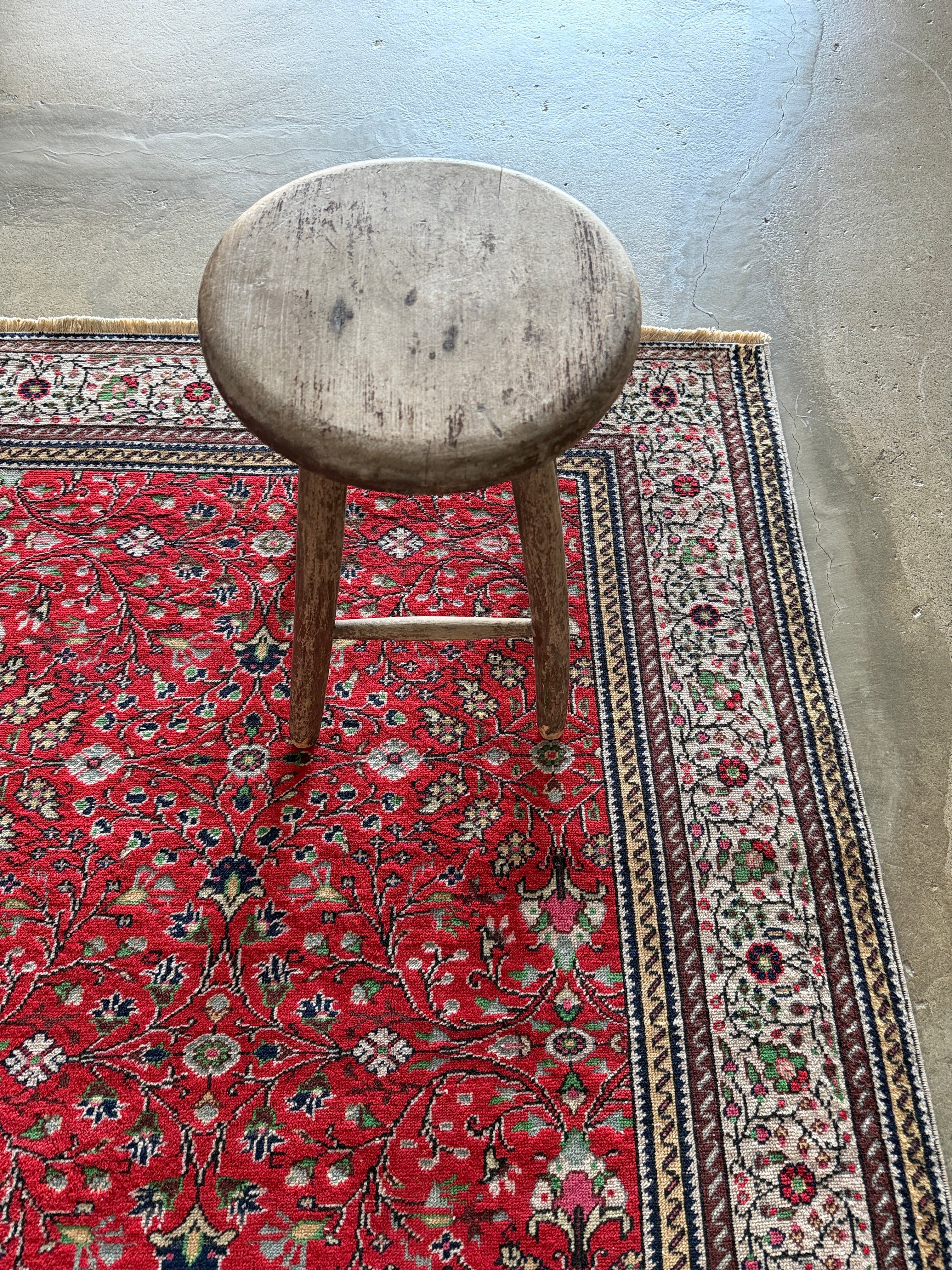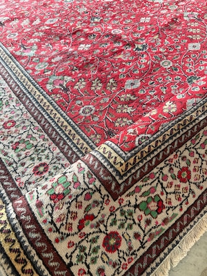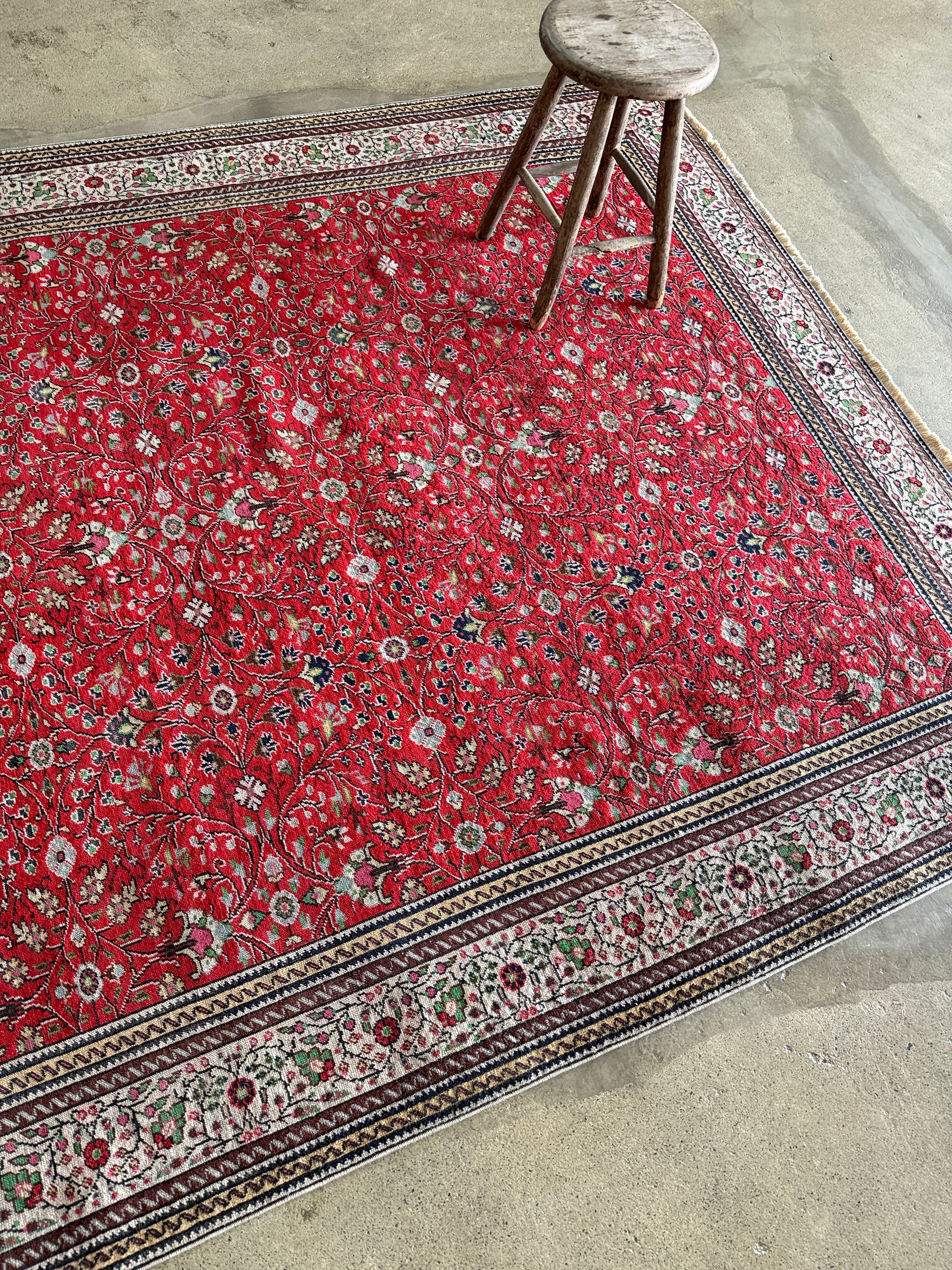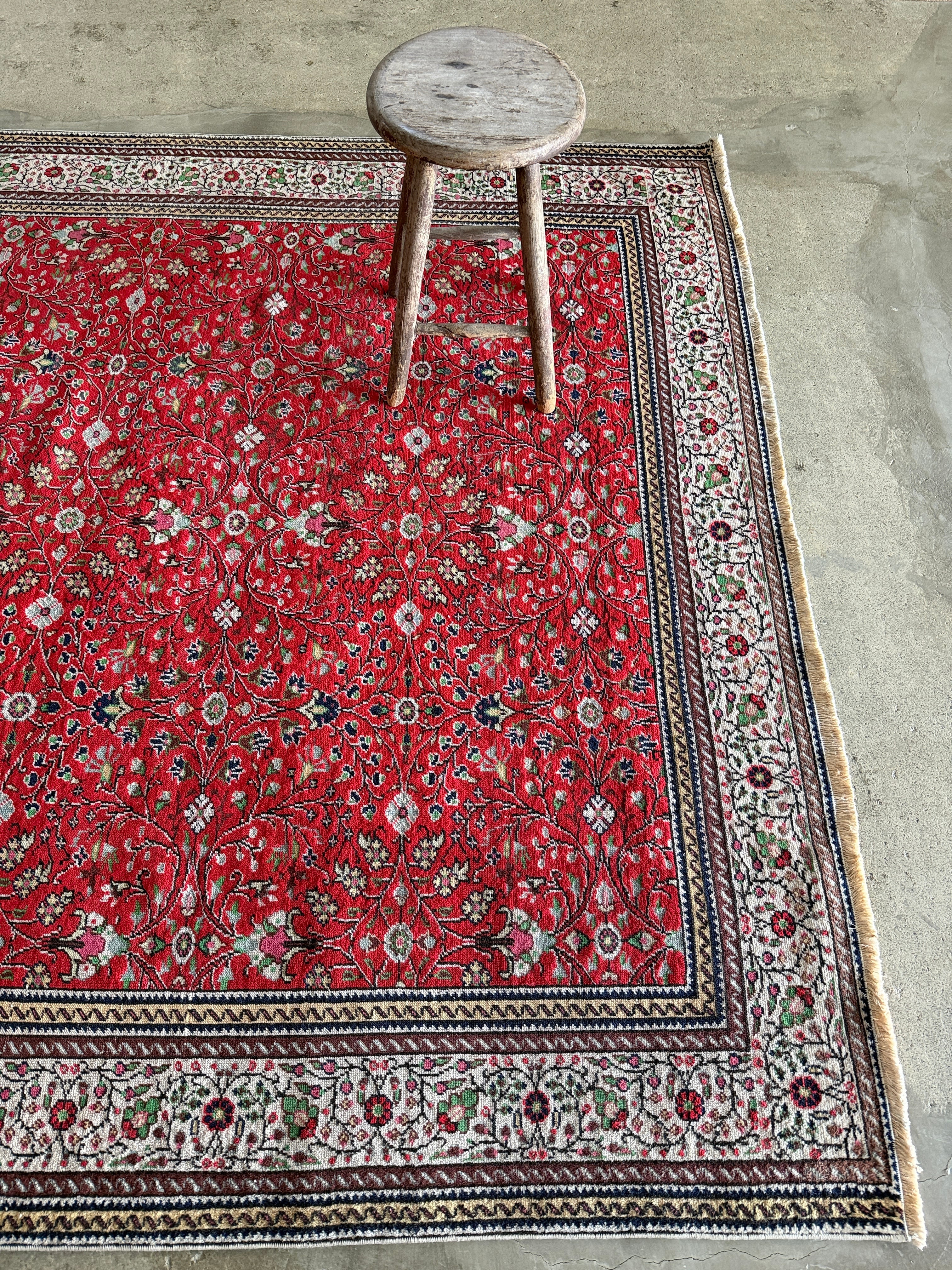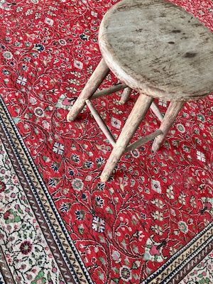 こちらは鮮やかな赤に花模様が美しい1枚。赤をお探しのお客様にはぜひオススメの1枚です。このような綺麗な鮮やかな赤に出会うことは希少です!周りの花模様に春らしいグリーンが使われているところもこの季節らしくてオススメでございます。ヴィンテージですが状態も良く、色合いも綺麗な絨毯でございます。