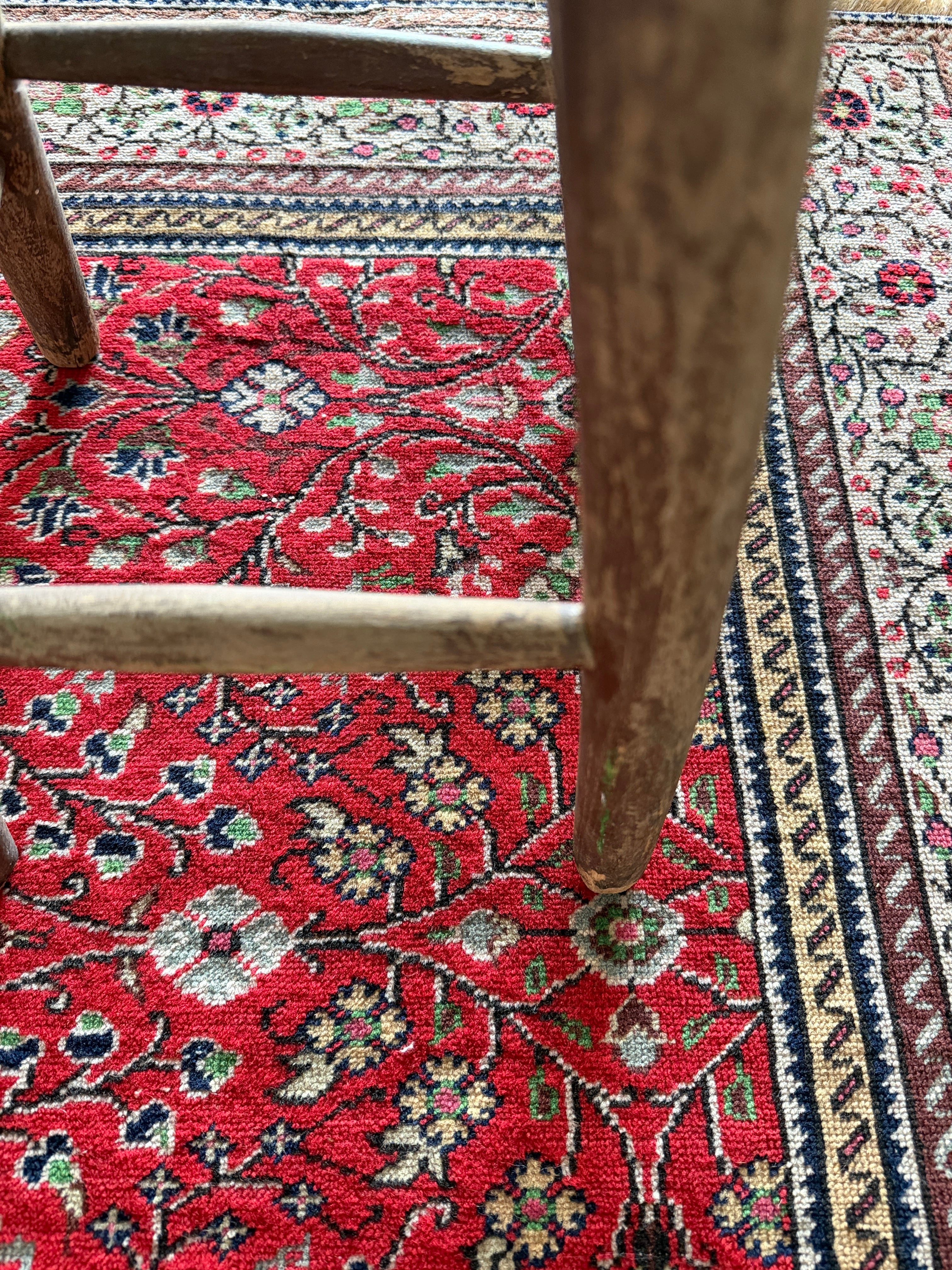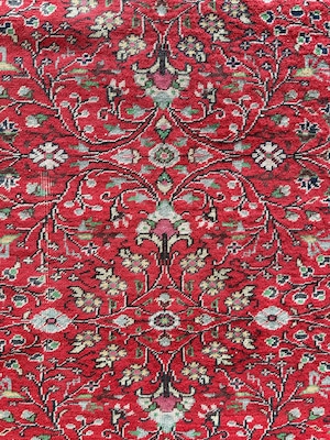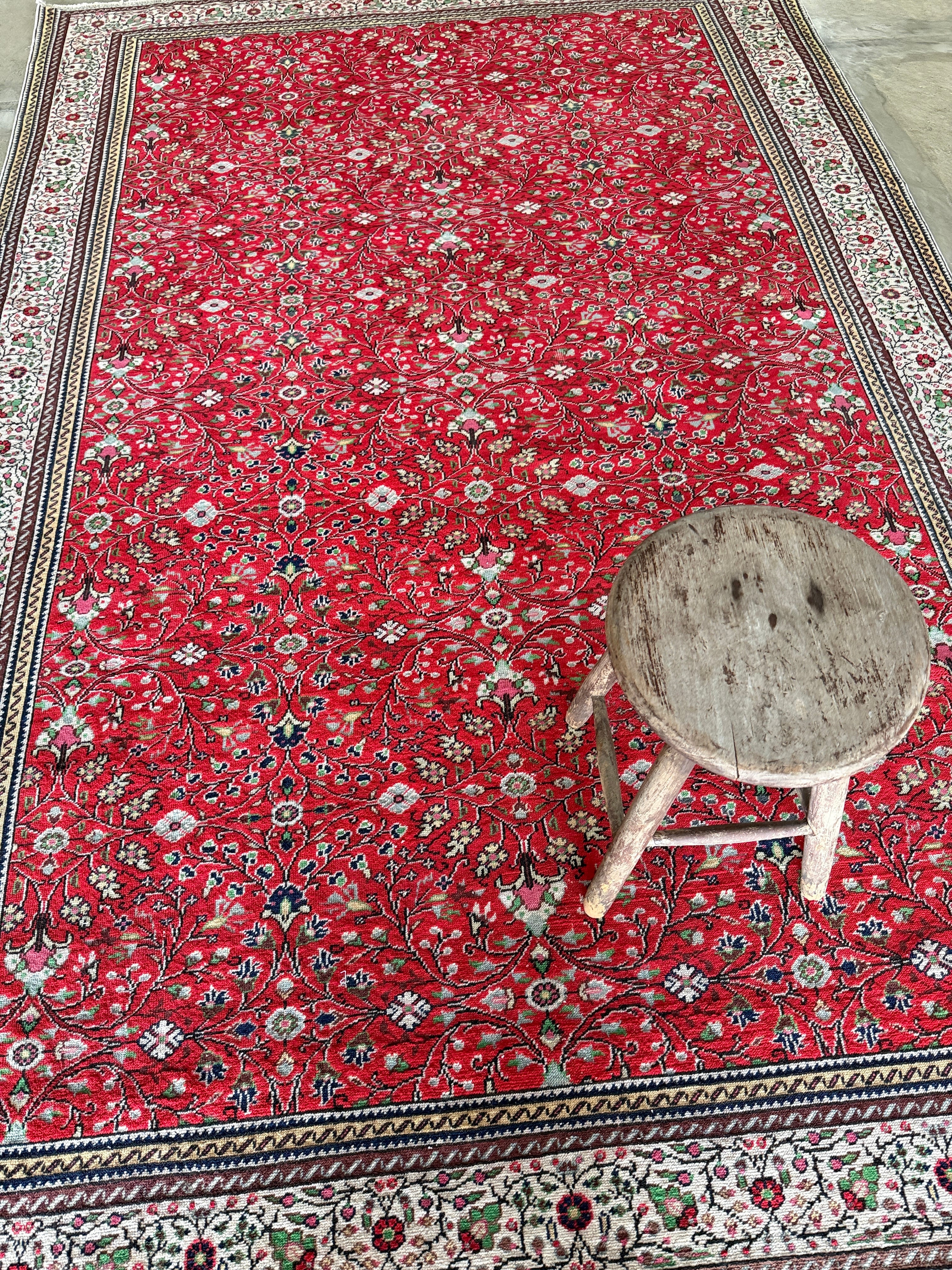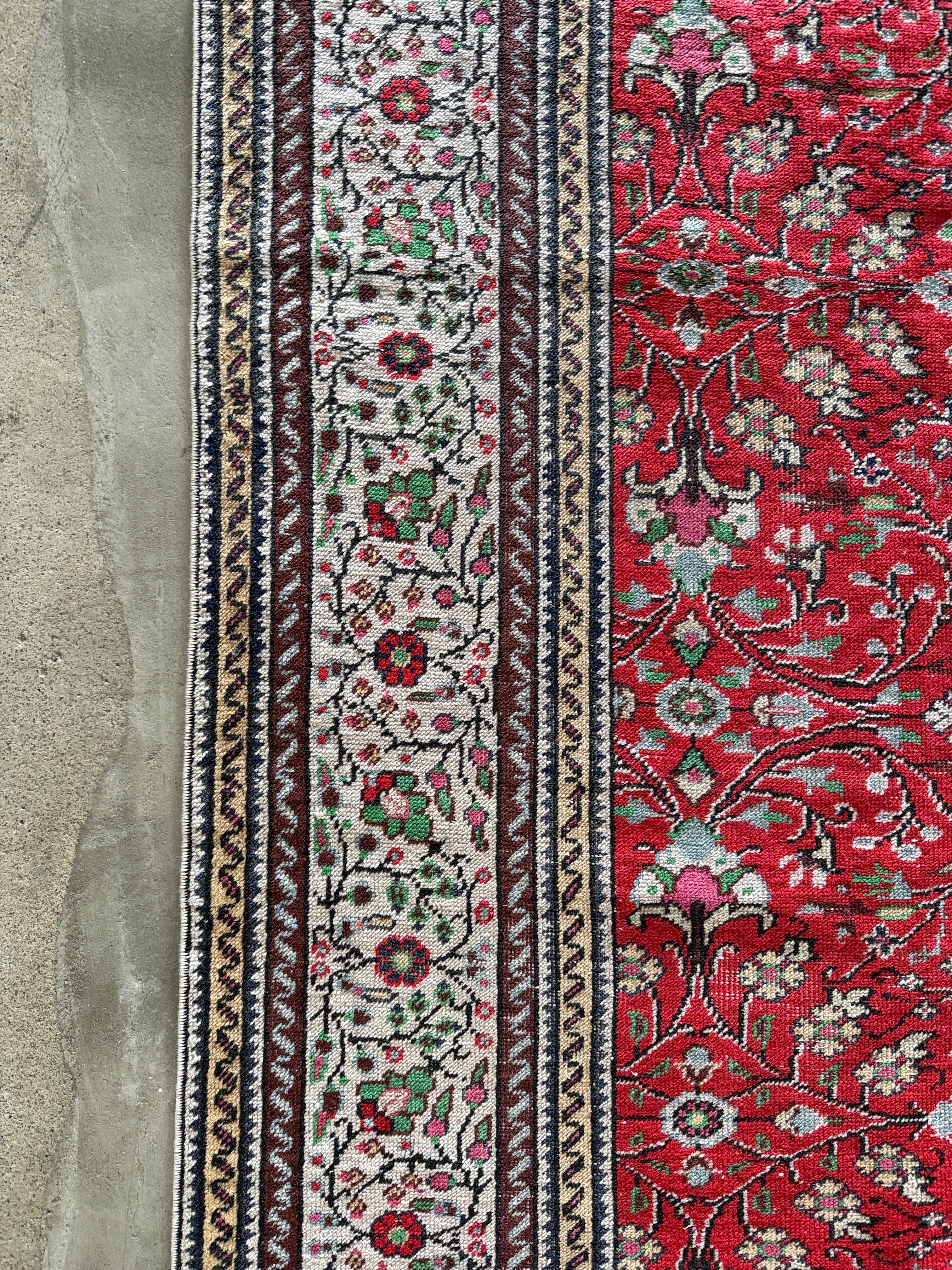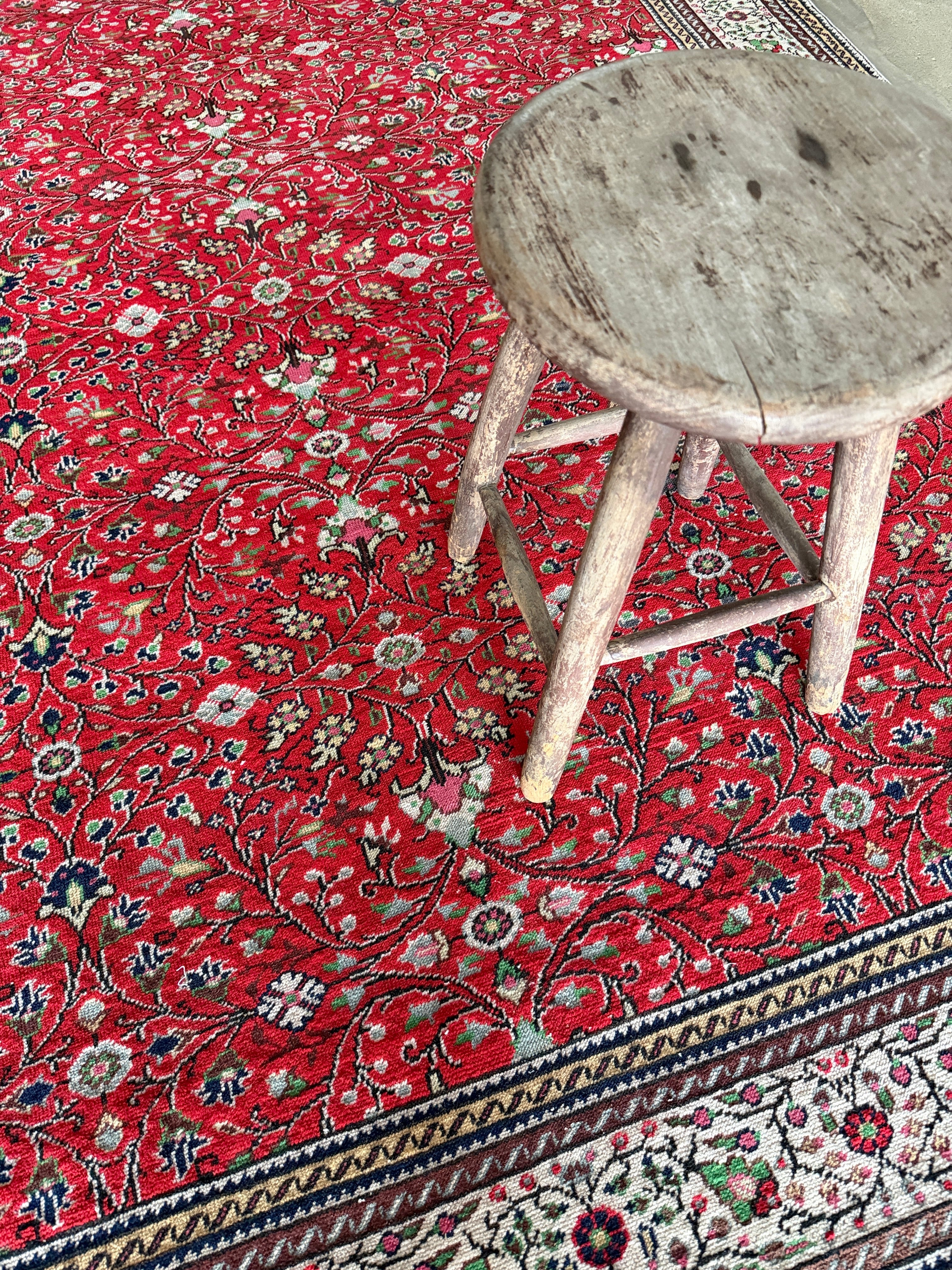 こちらは鮮やかな赤に花模様が美しい1枚。赤をお探しのお客様にはぜひオススメの1枚です。このような綺麗な鮮やかな赤に出会うことは希少です!周りの花模様に春らしいグリーンが使われているところもこの季節らしくてオススメでございます。ヴィンテージですが状態も良く、色合いも綺麗な絨毯でございます。