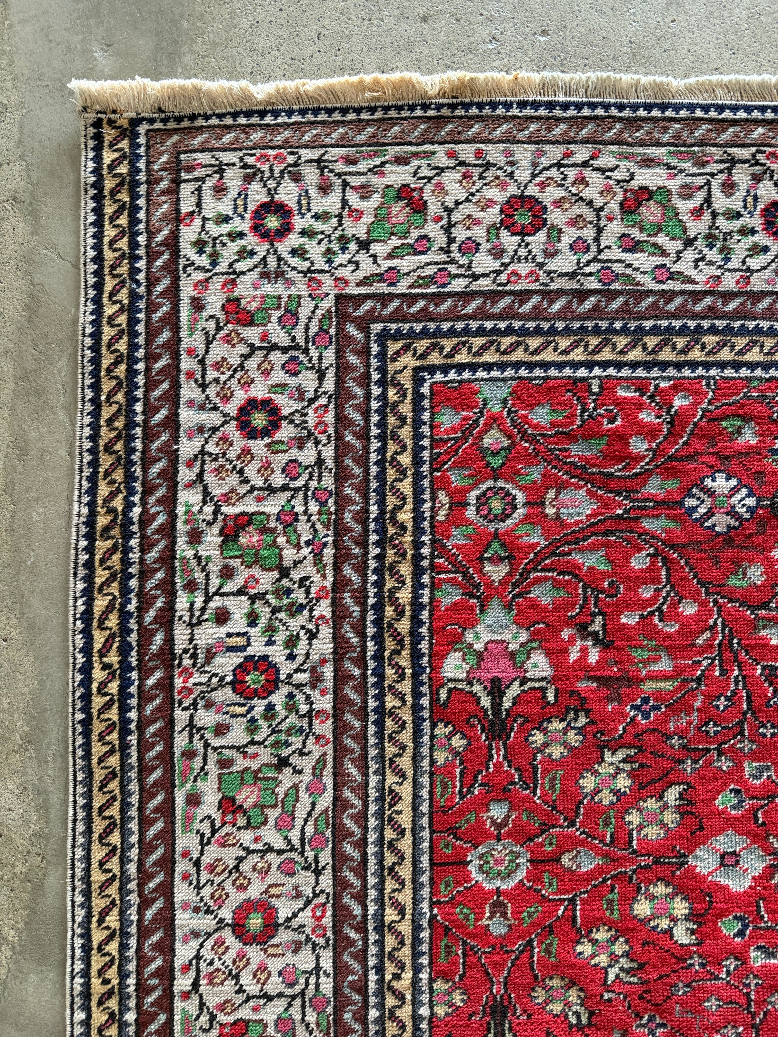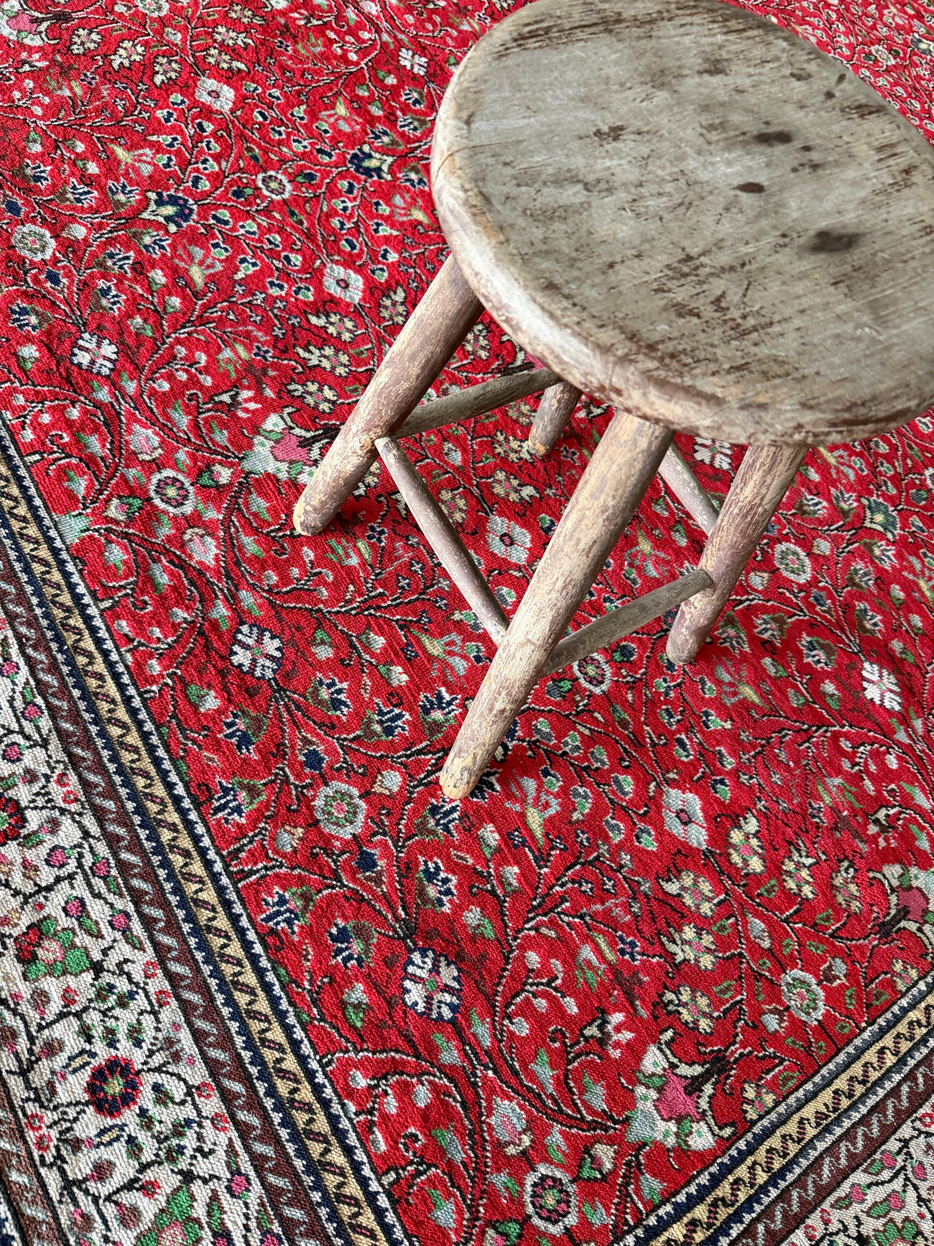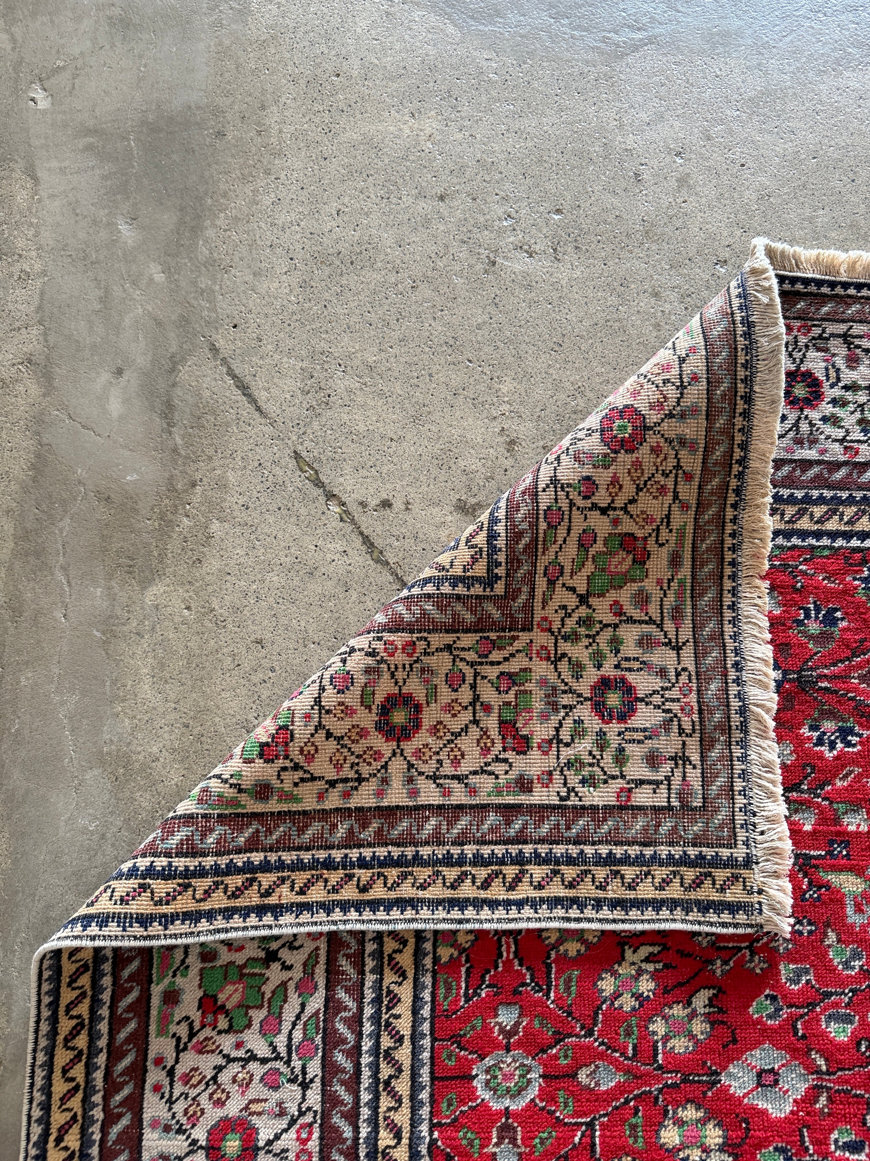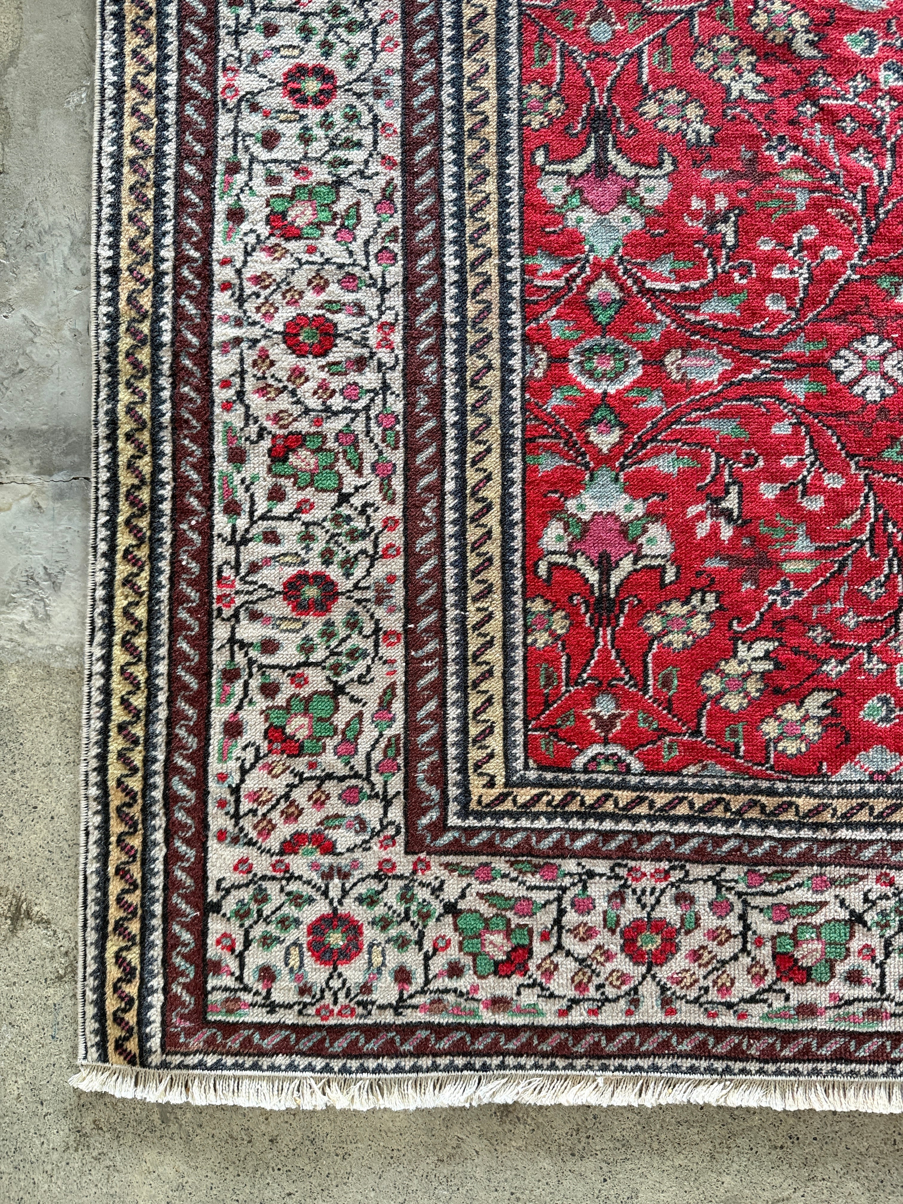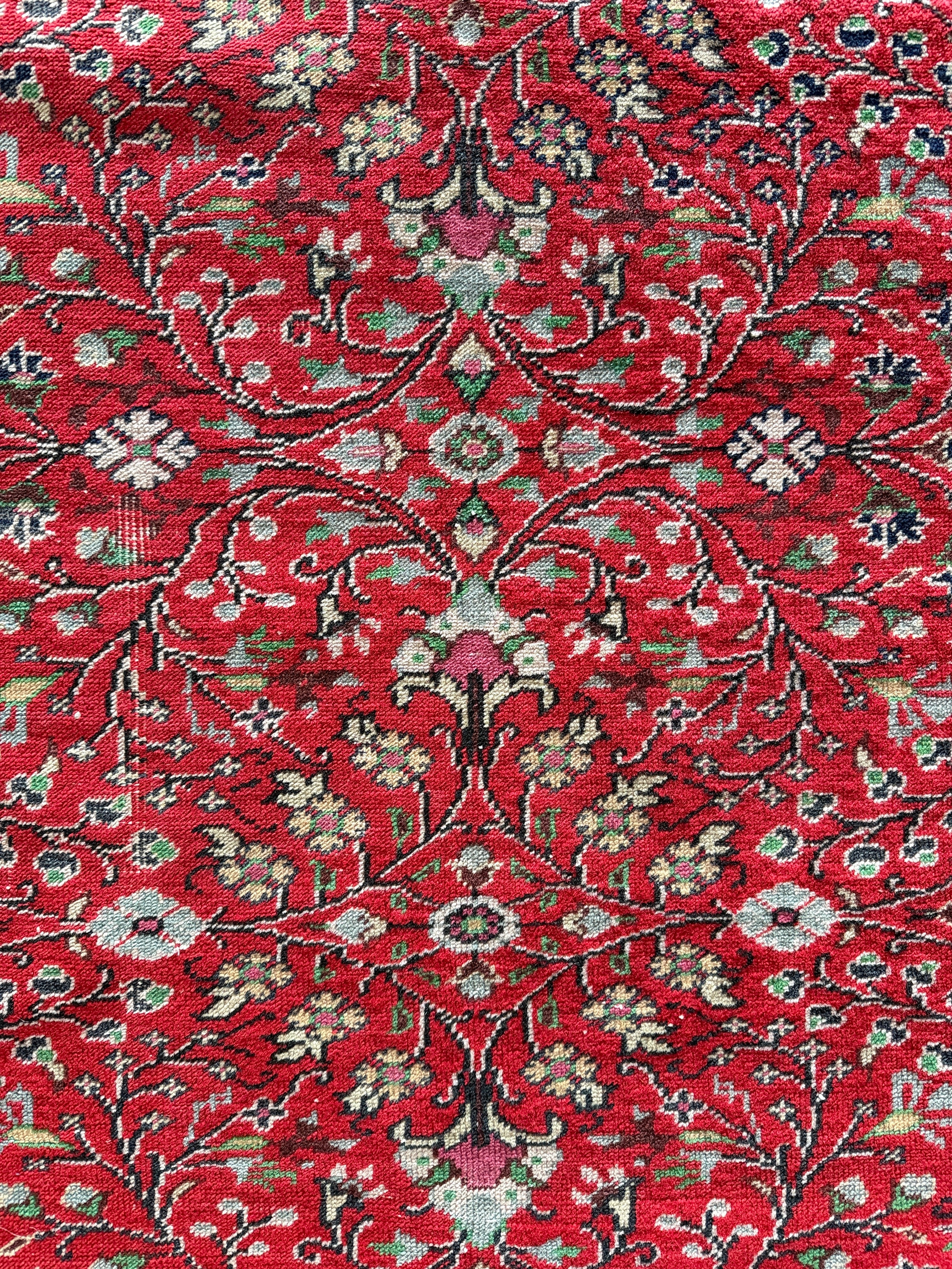 こちらは鮮やかな赤に花模様が美しい1枚。赤をお探しのお客様にはぜひオススメの1枚です。このような綺麗な鮮やかな赤に出会うことは希少です!周りの花模様に春らしいグリーンが使われているところもこの季節らしくてオススメでございます。ヴィンテージですが状態も良く、色合いも綺麗な絨毯でございます。