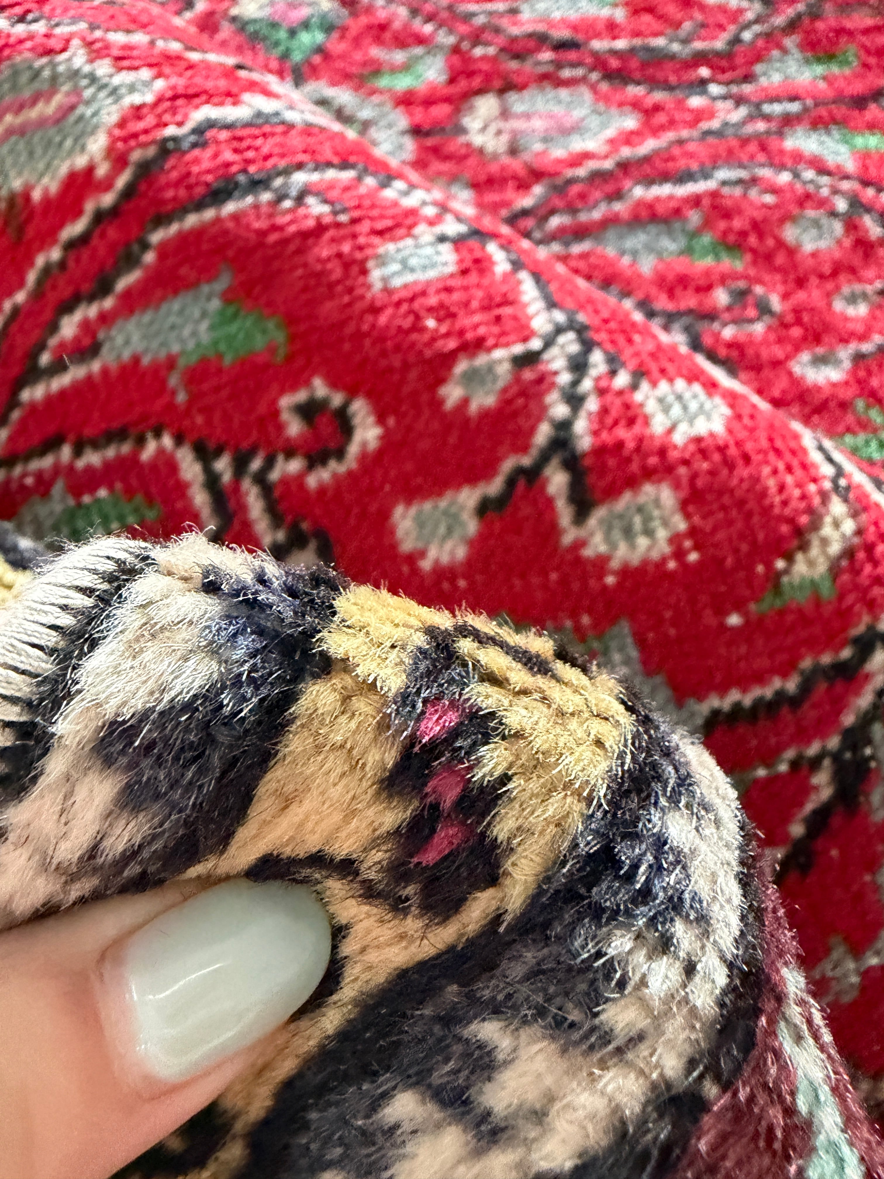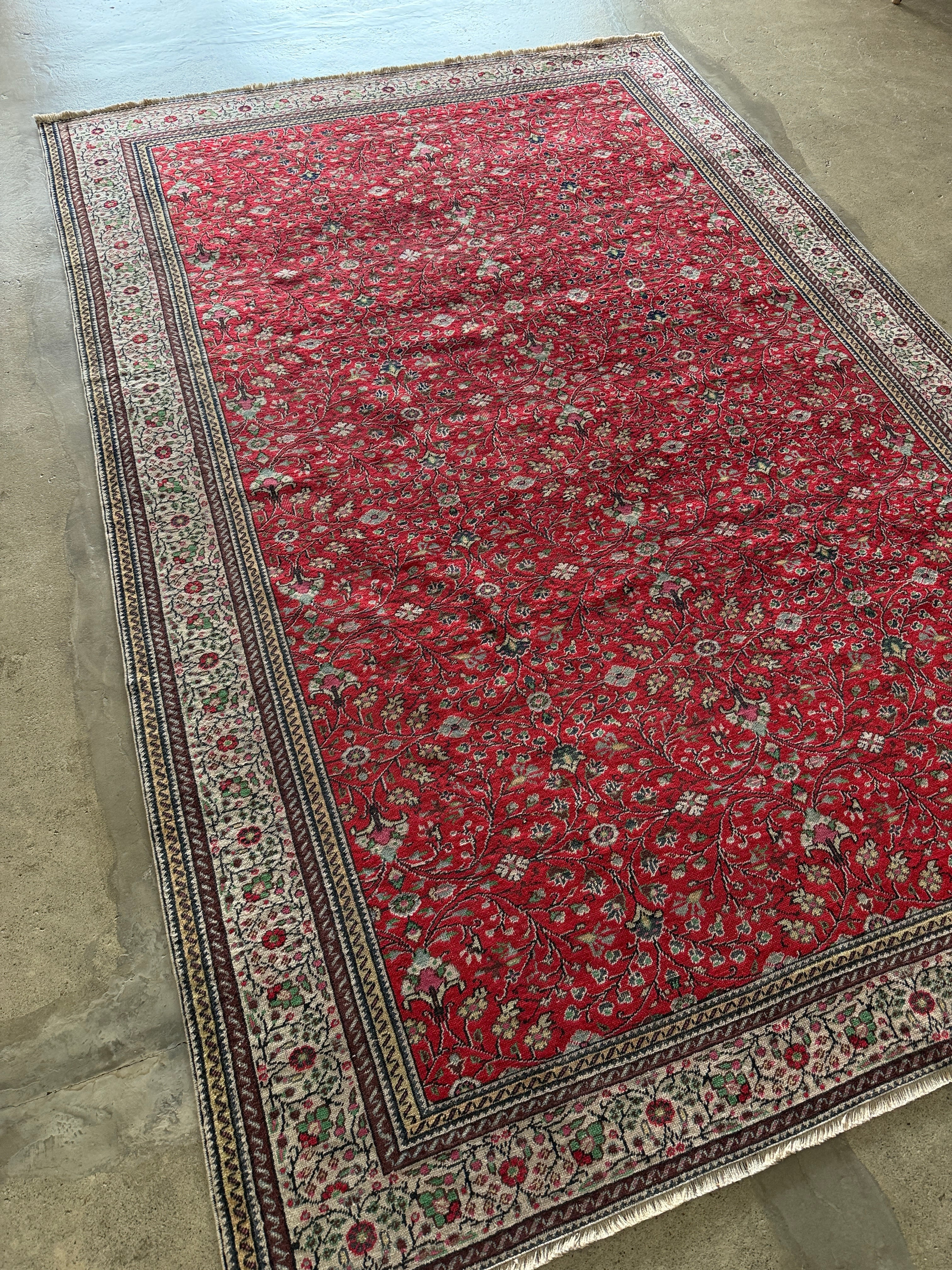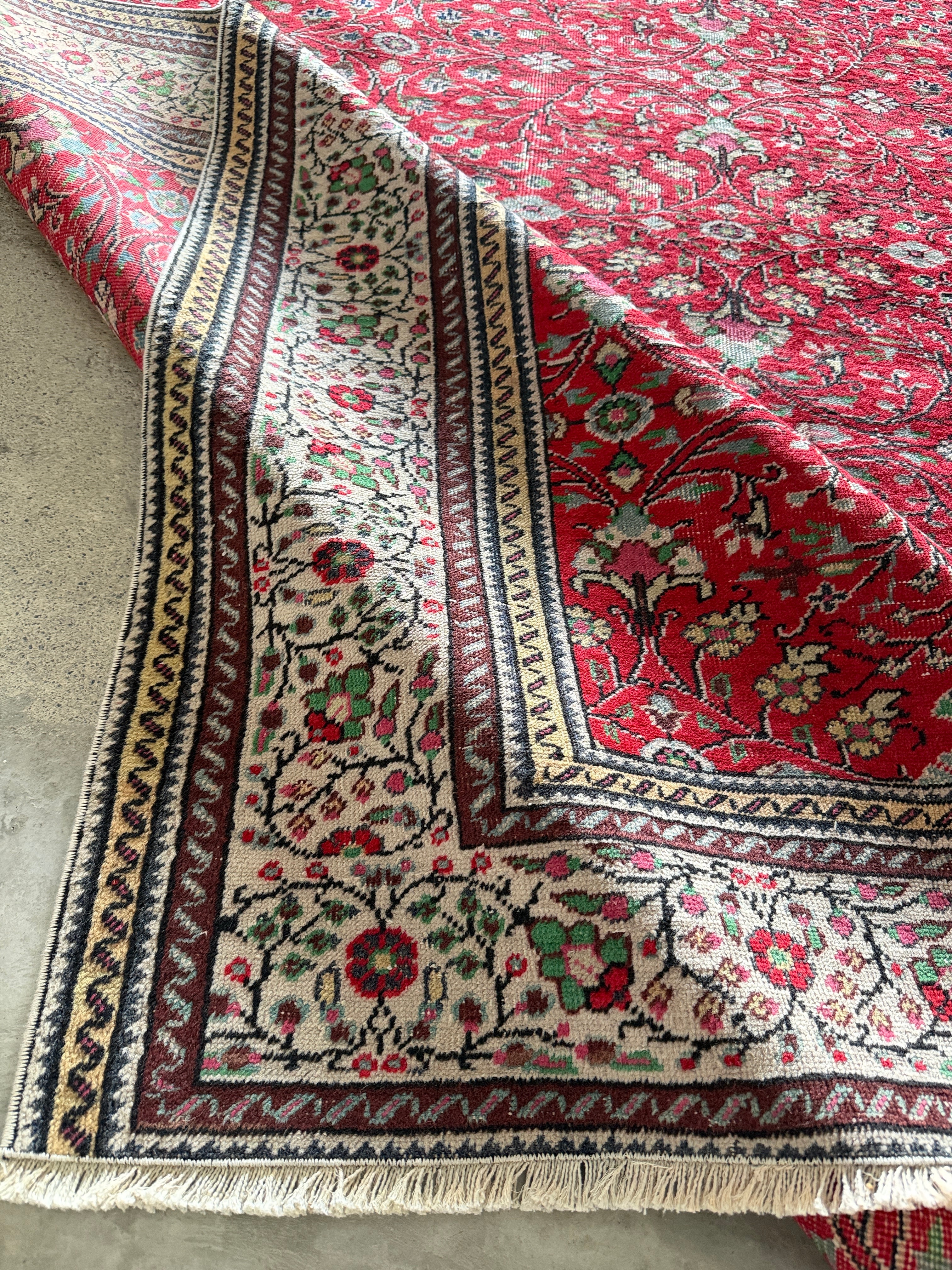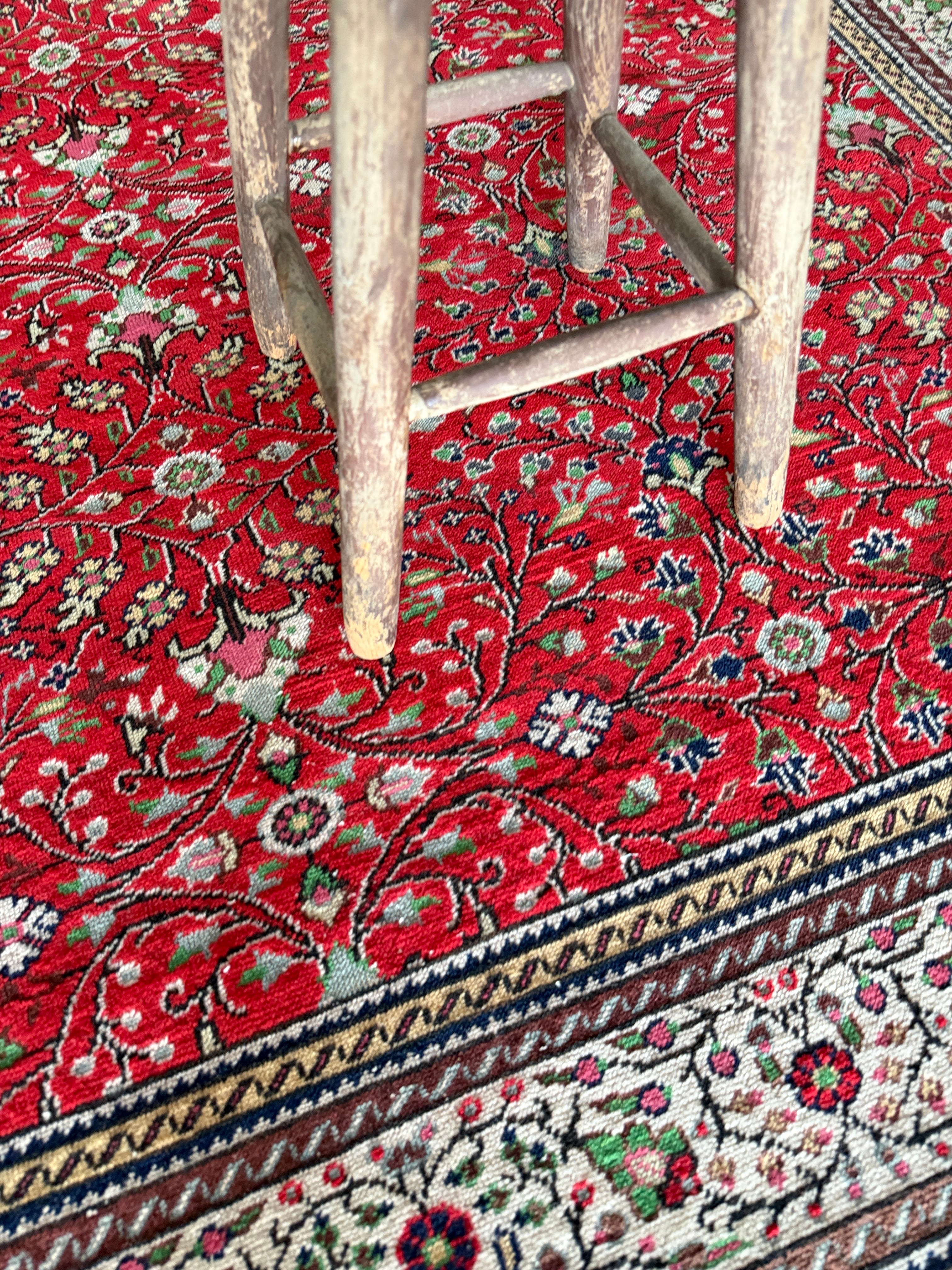こちらは鮮やかな赤に花模様が美しい1枚。赤をお探しのお客様にはぜひオススメの1枚です。このような綺麗な鮮やかな赤に出会うことは希少です!周りの花模様に春らしいグリーンが使われているところもこの季節らしくてオススメでございます。ヴィンテージですが状態も良く、色合いも綺麗な絨毯でございます。