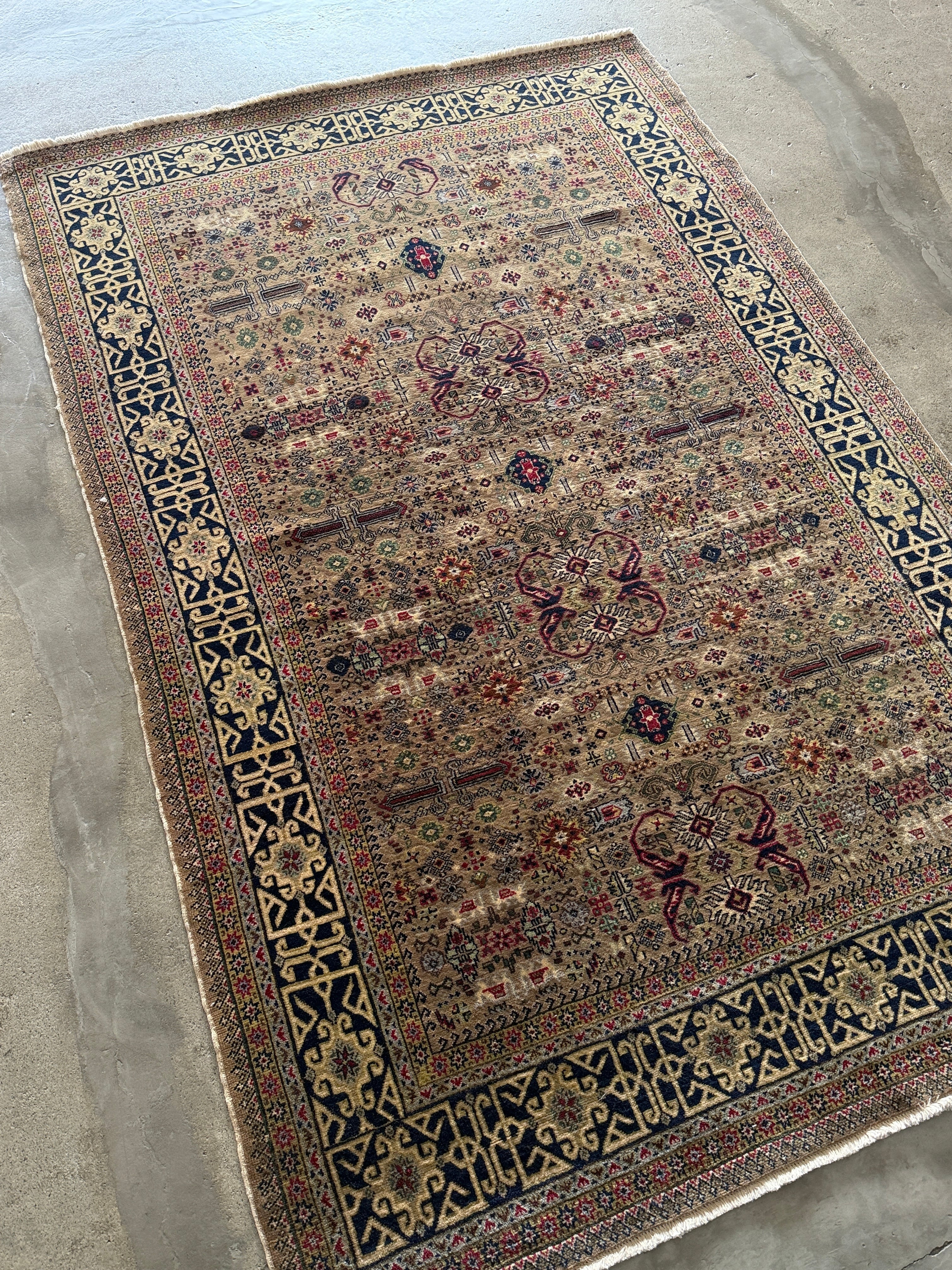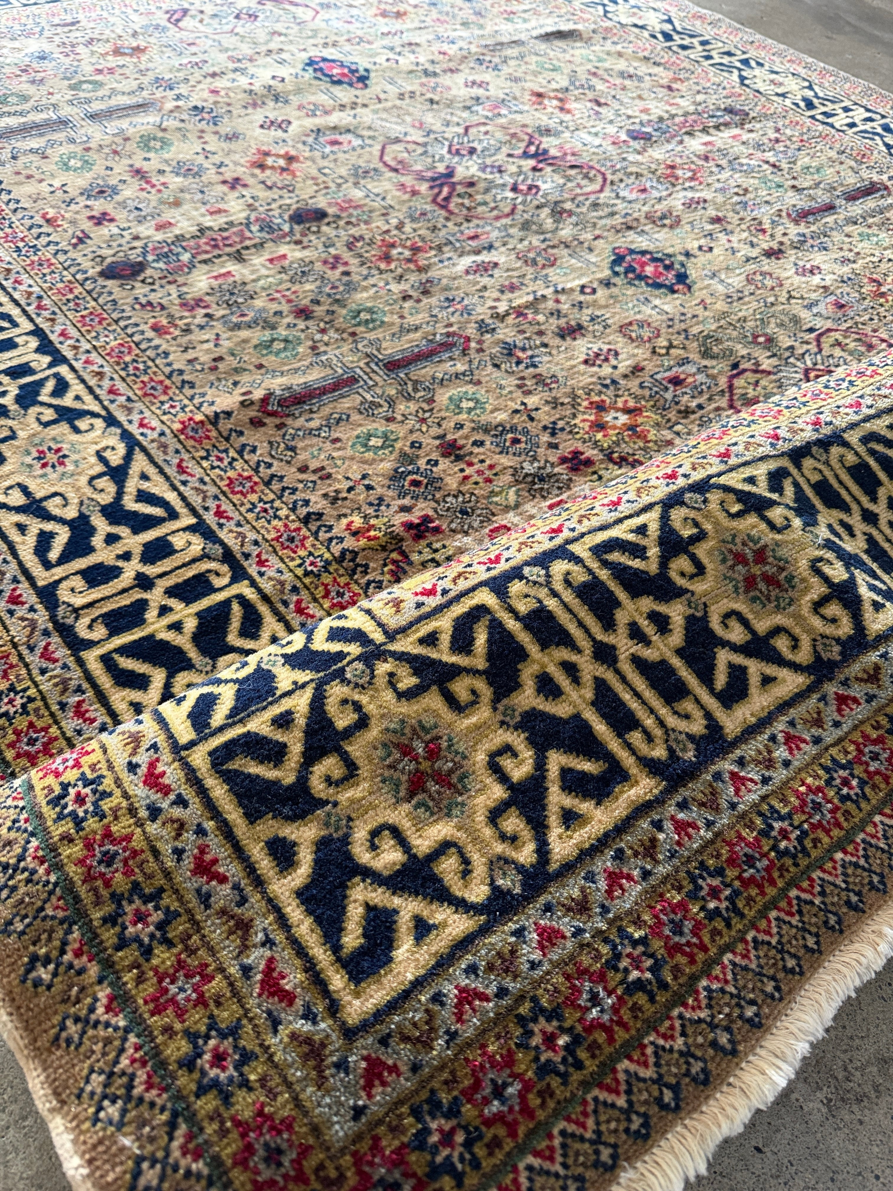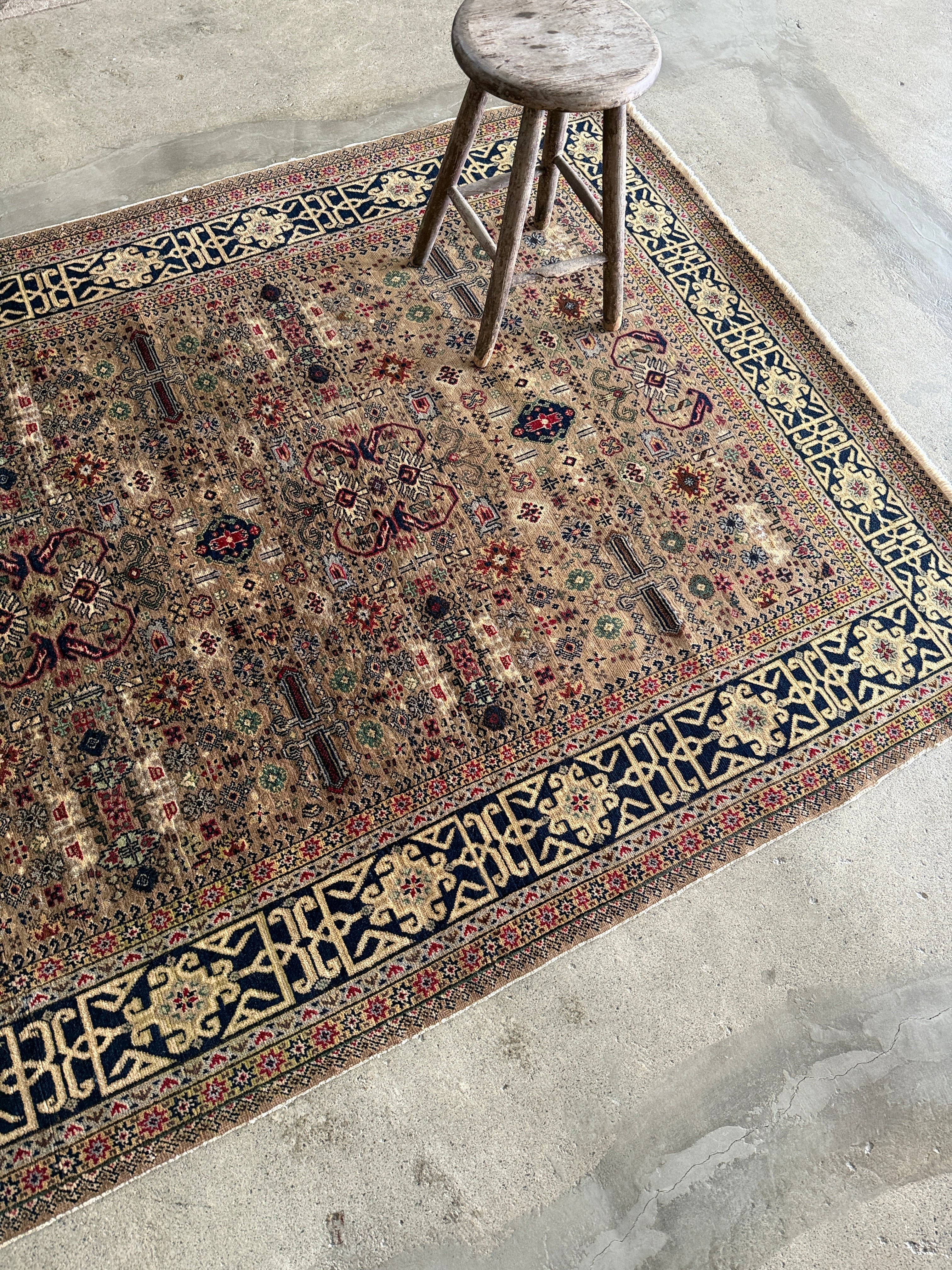 クラッシックなベージュが光に当たると輝くゴールドのようにも見える絶妙な色合いが美しい1枚。レトロな色合いに花模様と幾何学模様で彩られた最高のカイセリ絨毯。繊細な糸をたっぷり使った重厚感がある密度の高い絨毯です。このような絨毯はとてもめずらしい!ヴィンテージではありますが未使用品同等の美しさです。2度と出会えない貴重なラグになること間違いなし!ぜひコレクションにいかがでしょうか?