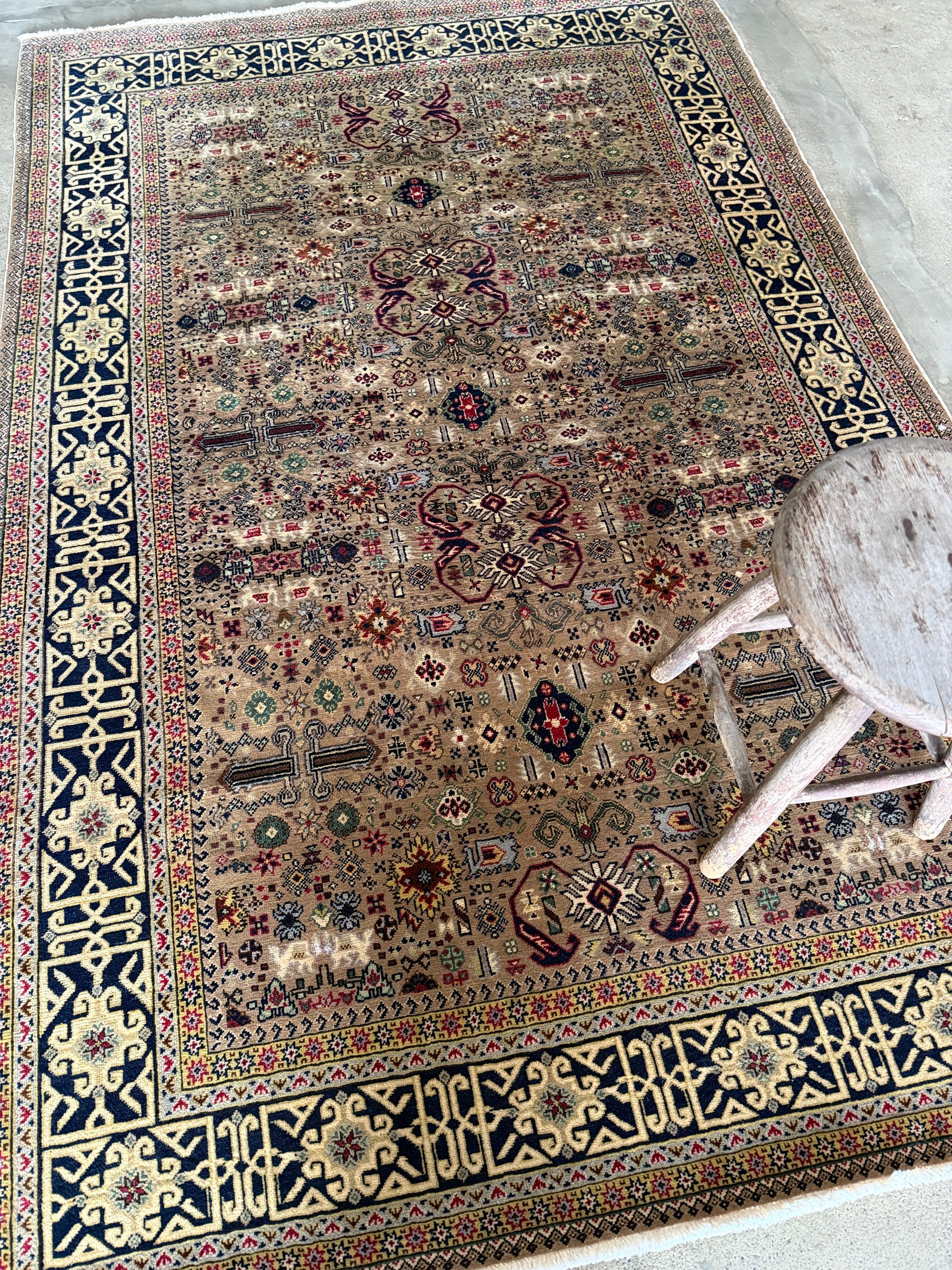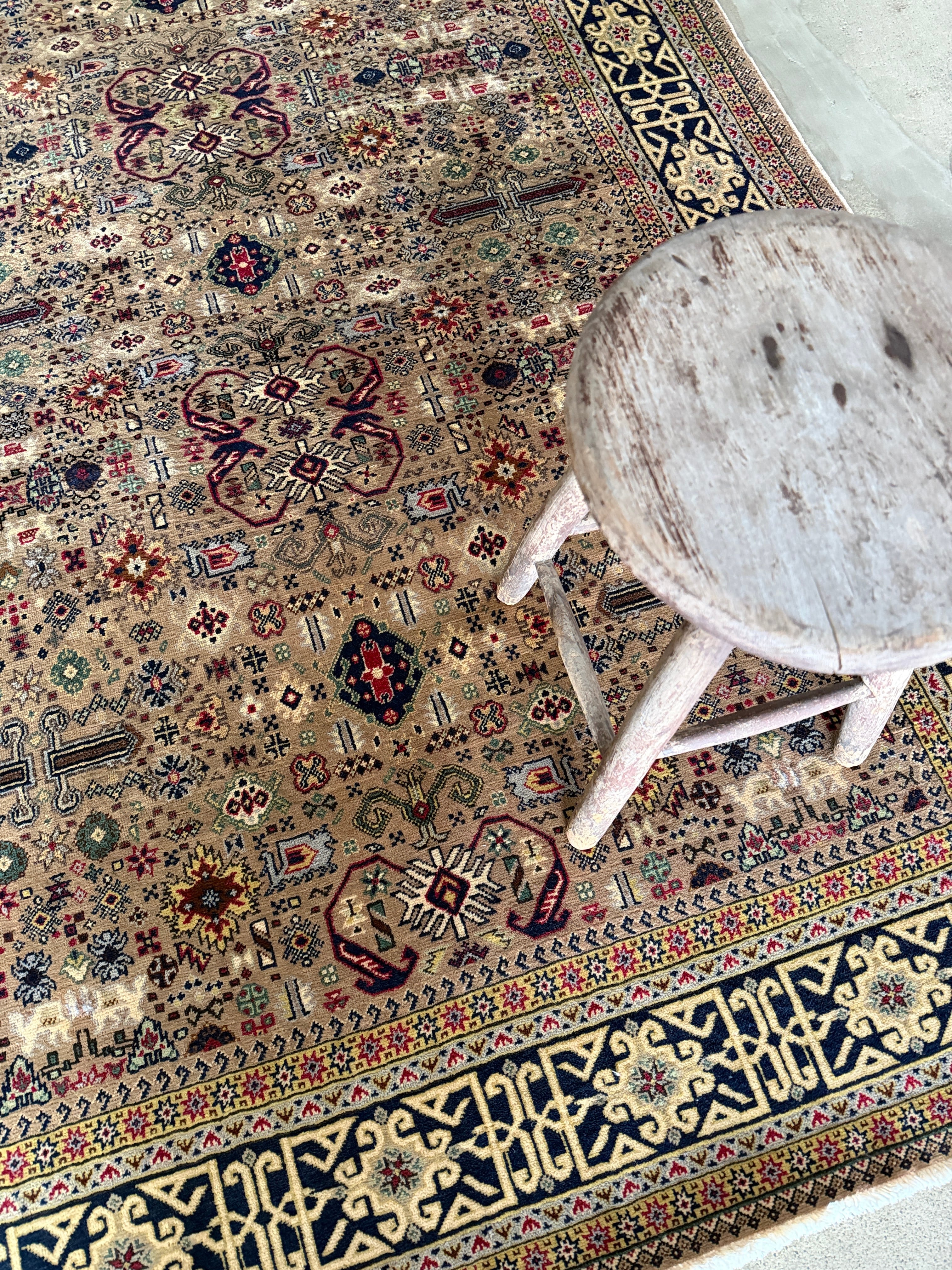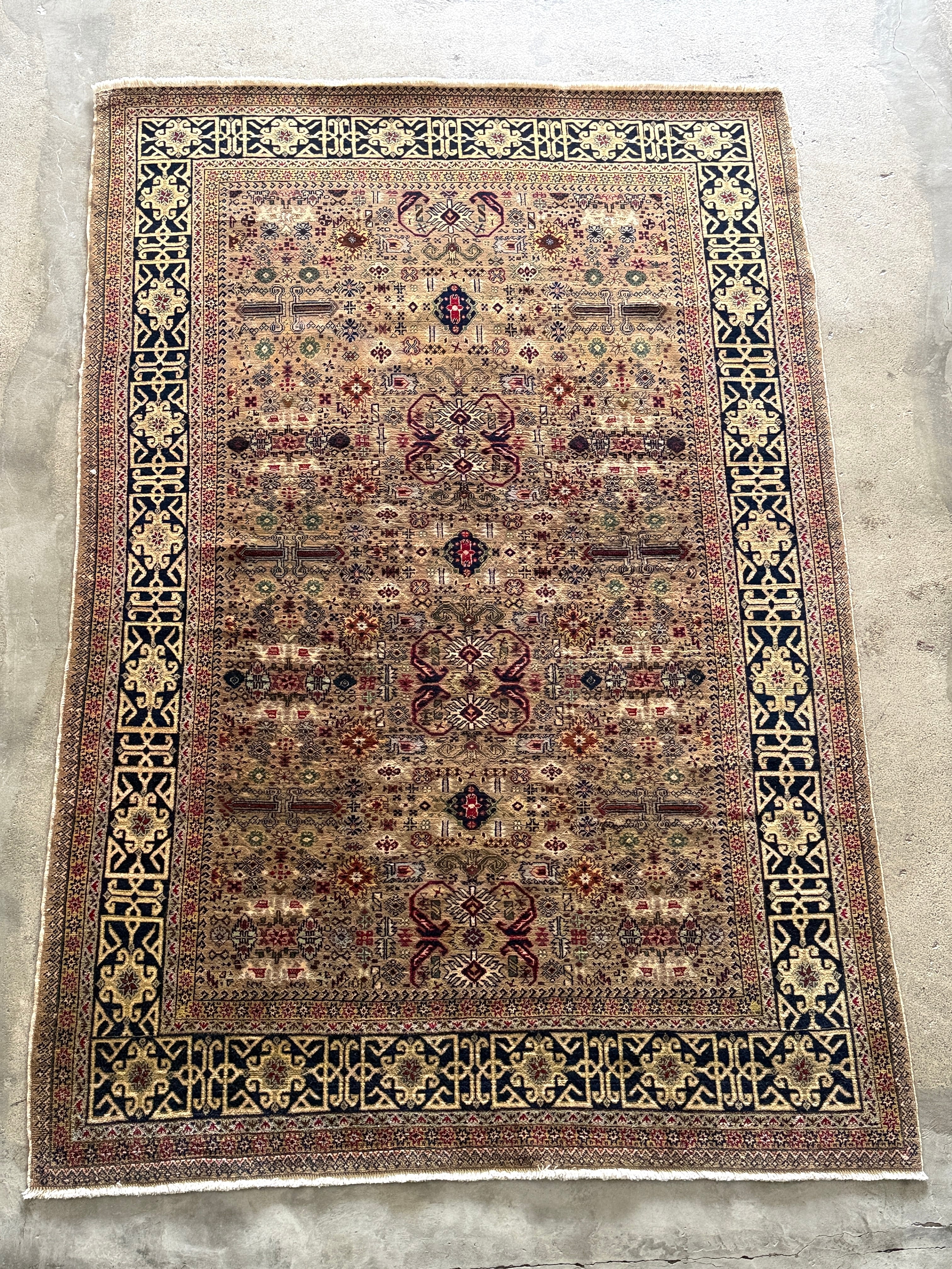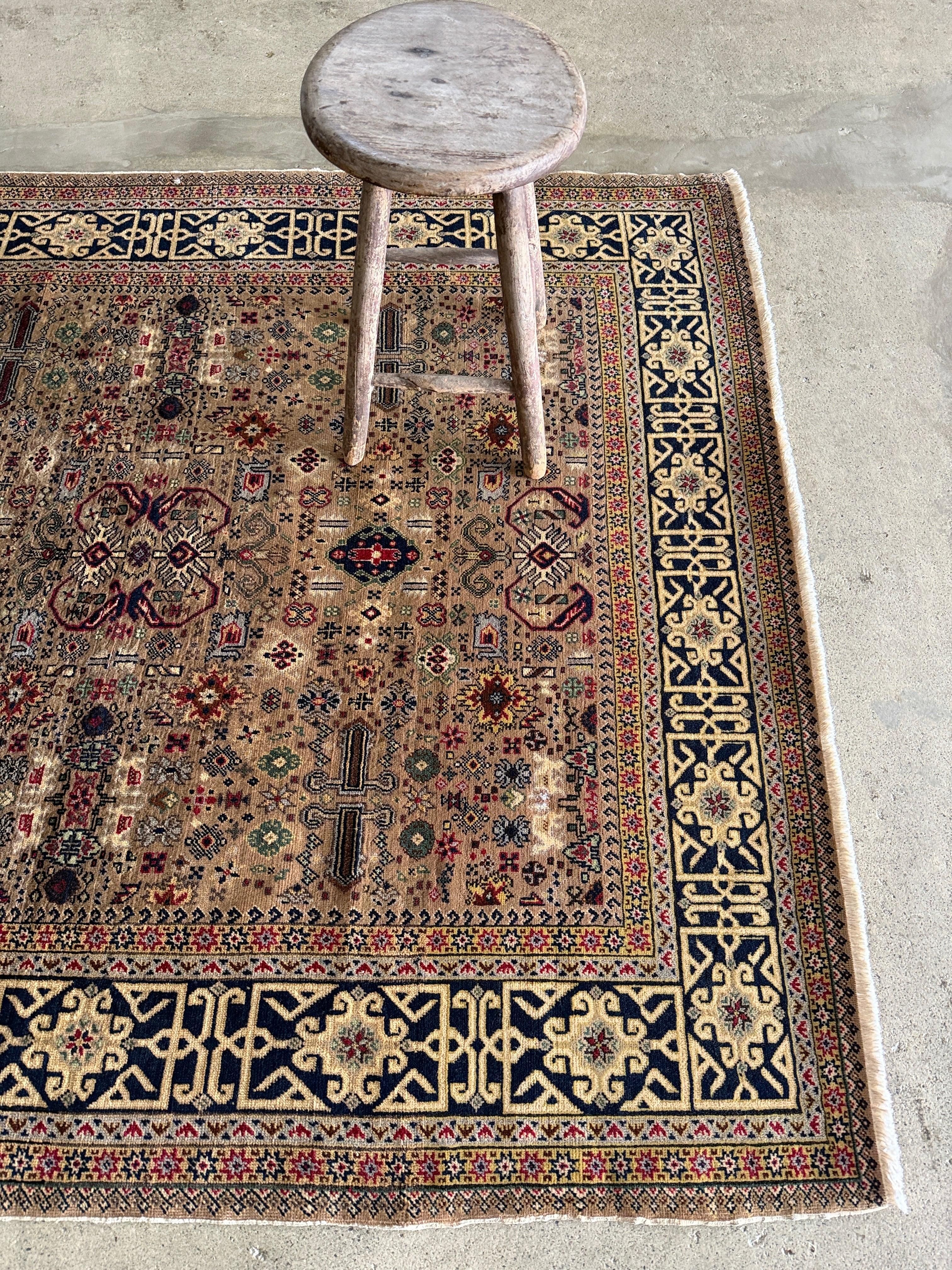 クラッシックなベージュが光に当たると輝くゴールドのようにも見える絶妙な色合いが美しい1枚。レトロな色合いに花模様と幾何学模様で彩られた最高のカイセリ絨毯。繊細な糸をたっぷり使った重厚感がある密度の高い絨毯です。このような絨毯はとてもめずらしい!ヴィンテージではありますが未使用品同等の美しさです。2度と出会えない貴重なラグになること間違いなし!ぜひコレクションにいかがでしょうか?