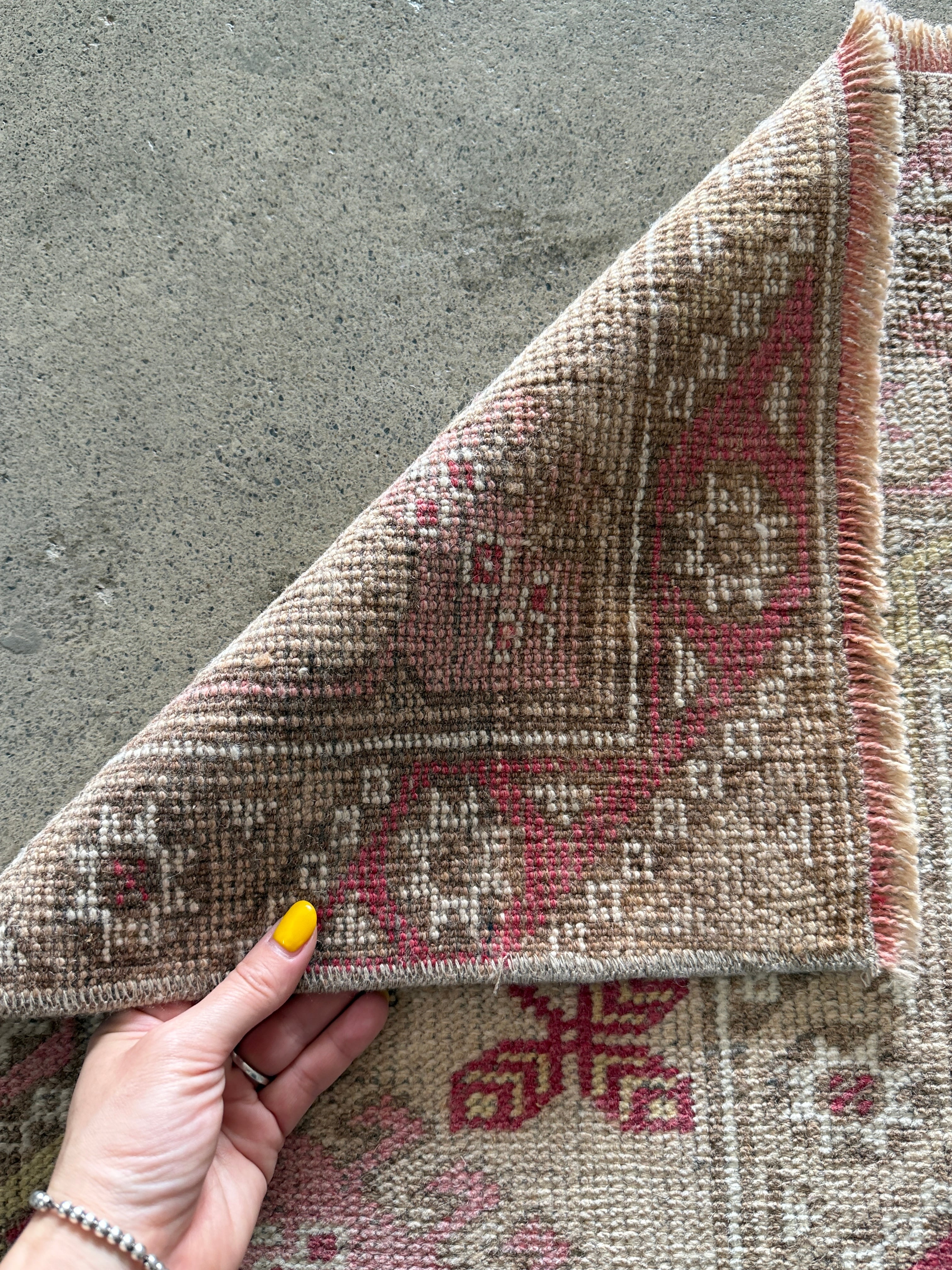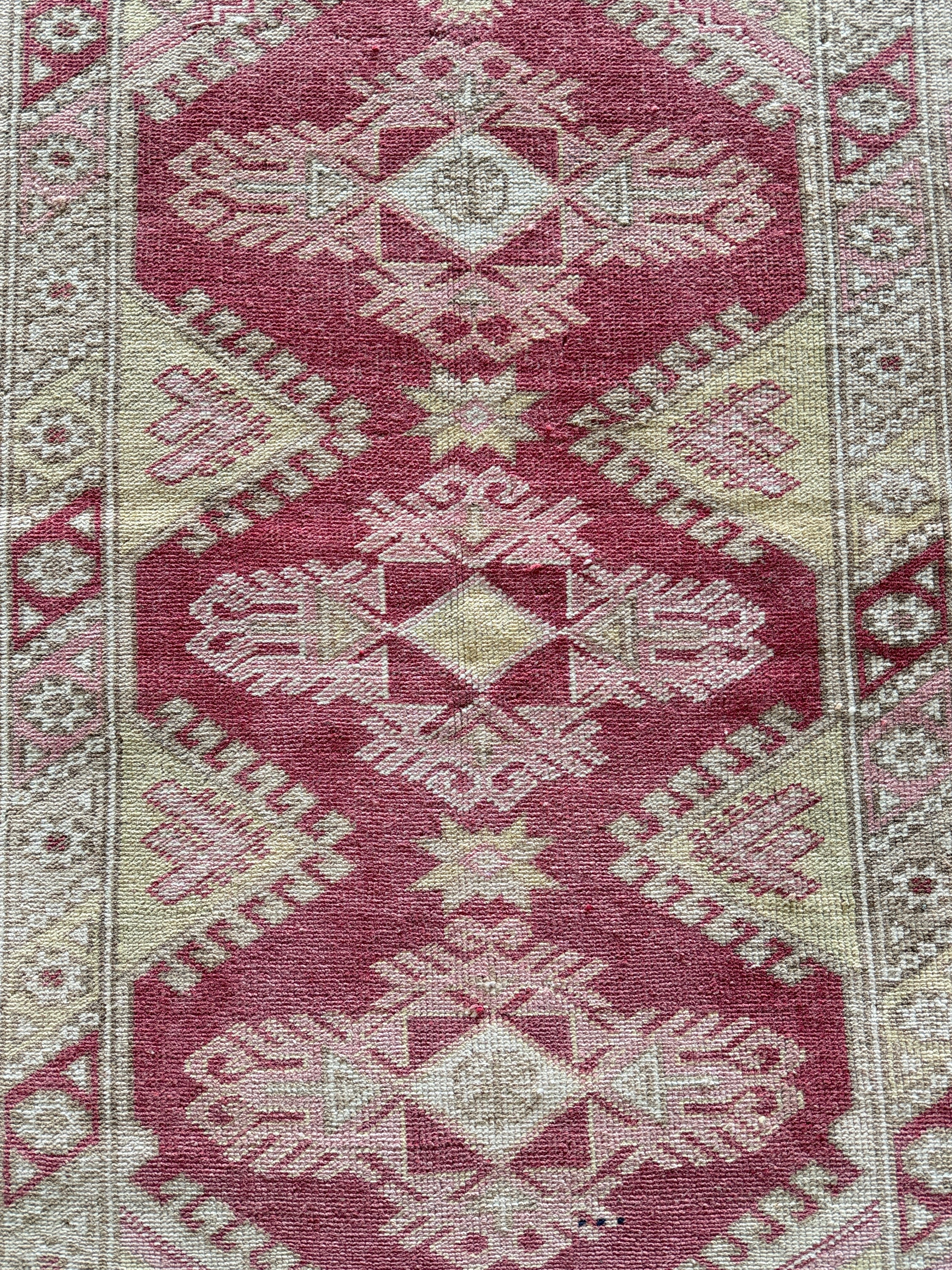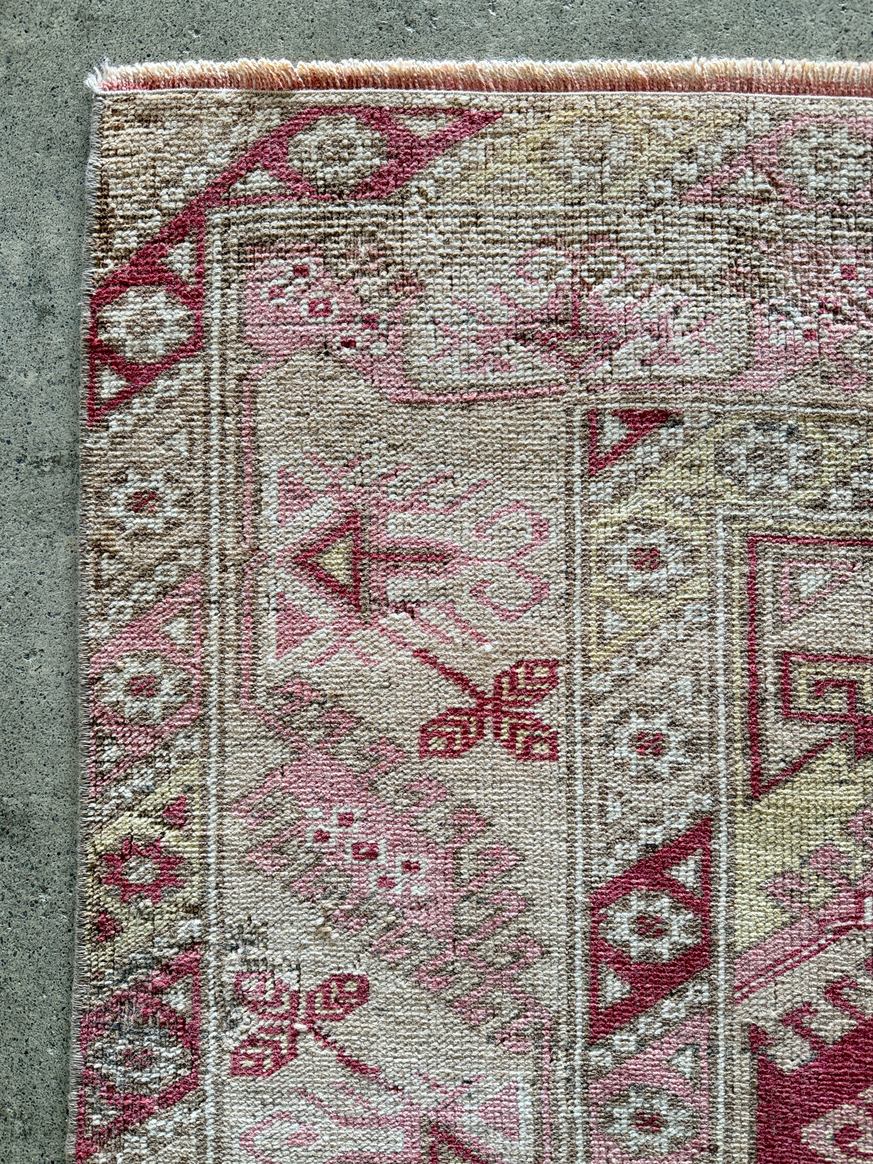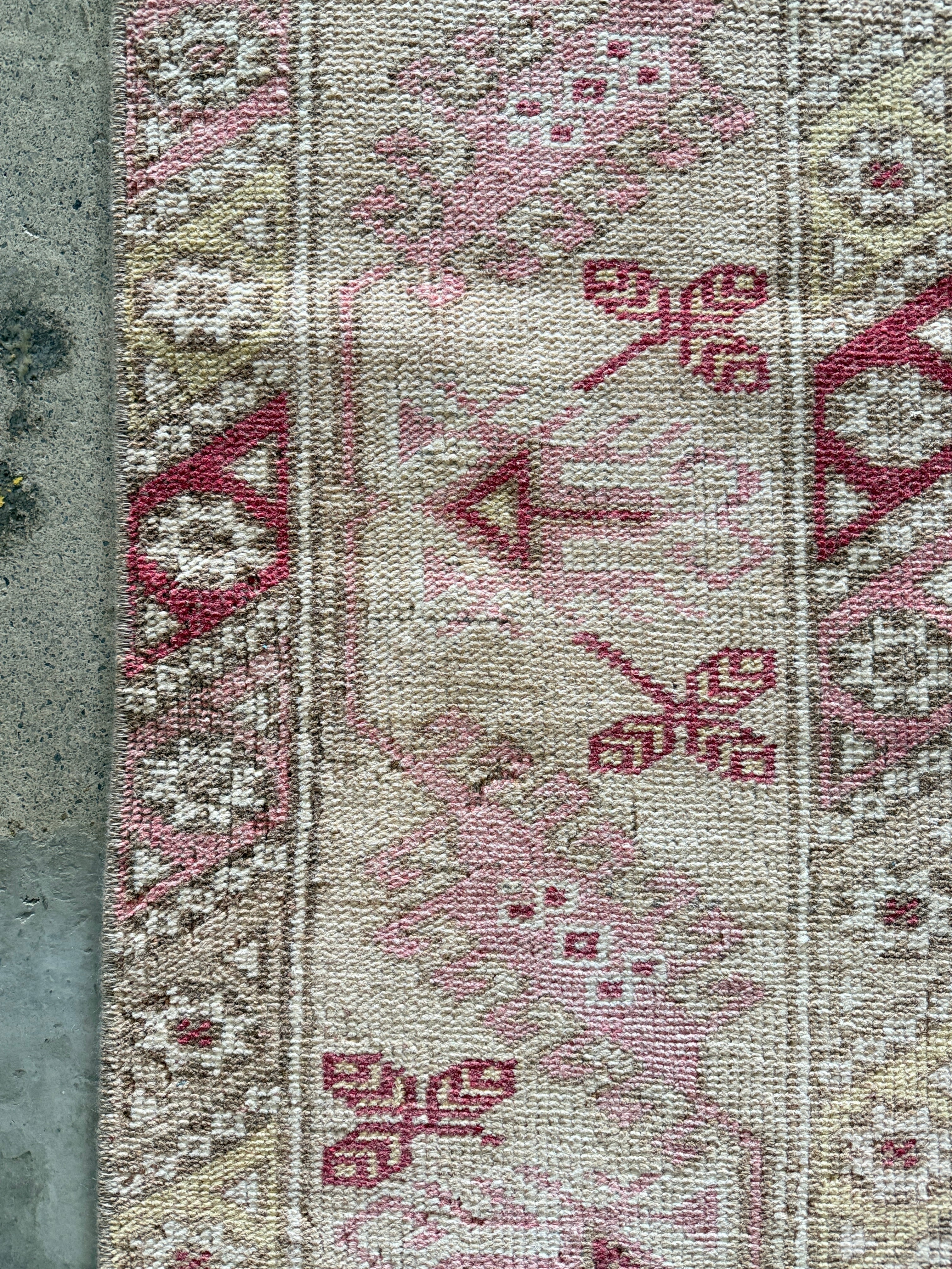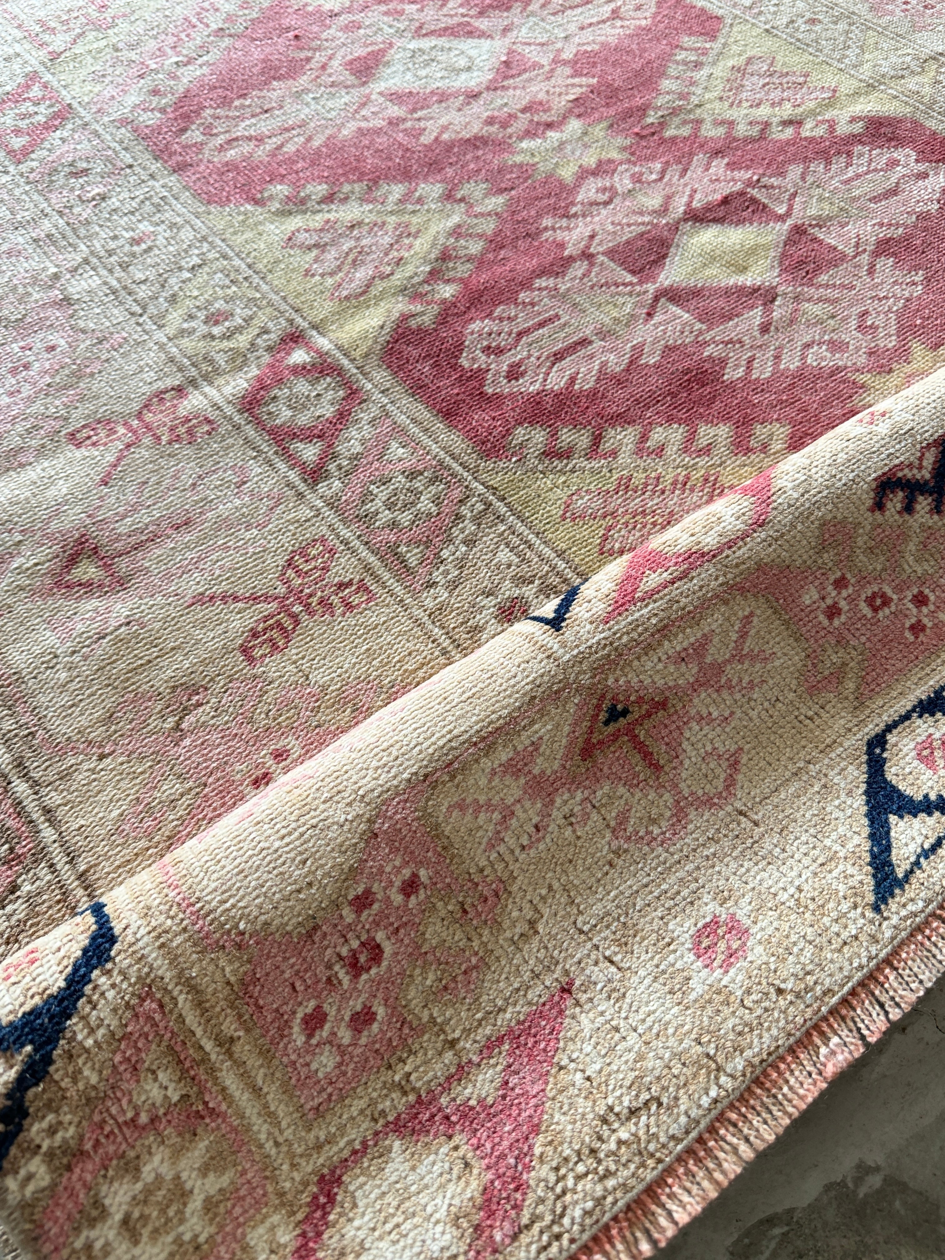 トルコのエーゲ界エリアのリゾート地、アンタルヤはエネルギッシュな色合いの絨毯が多くみられます。今回は春ということであえてウォッシュ加工で色を落とし、やわらかな春らしい色合いに仕上がったモノをセレクトさせていただきました。個性はしっかり残っているものの、お部屋に馴染みやすく取り入れやすい1枚となっております。