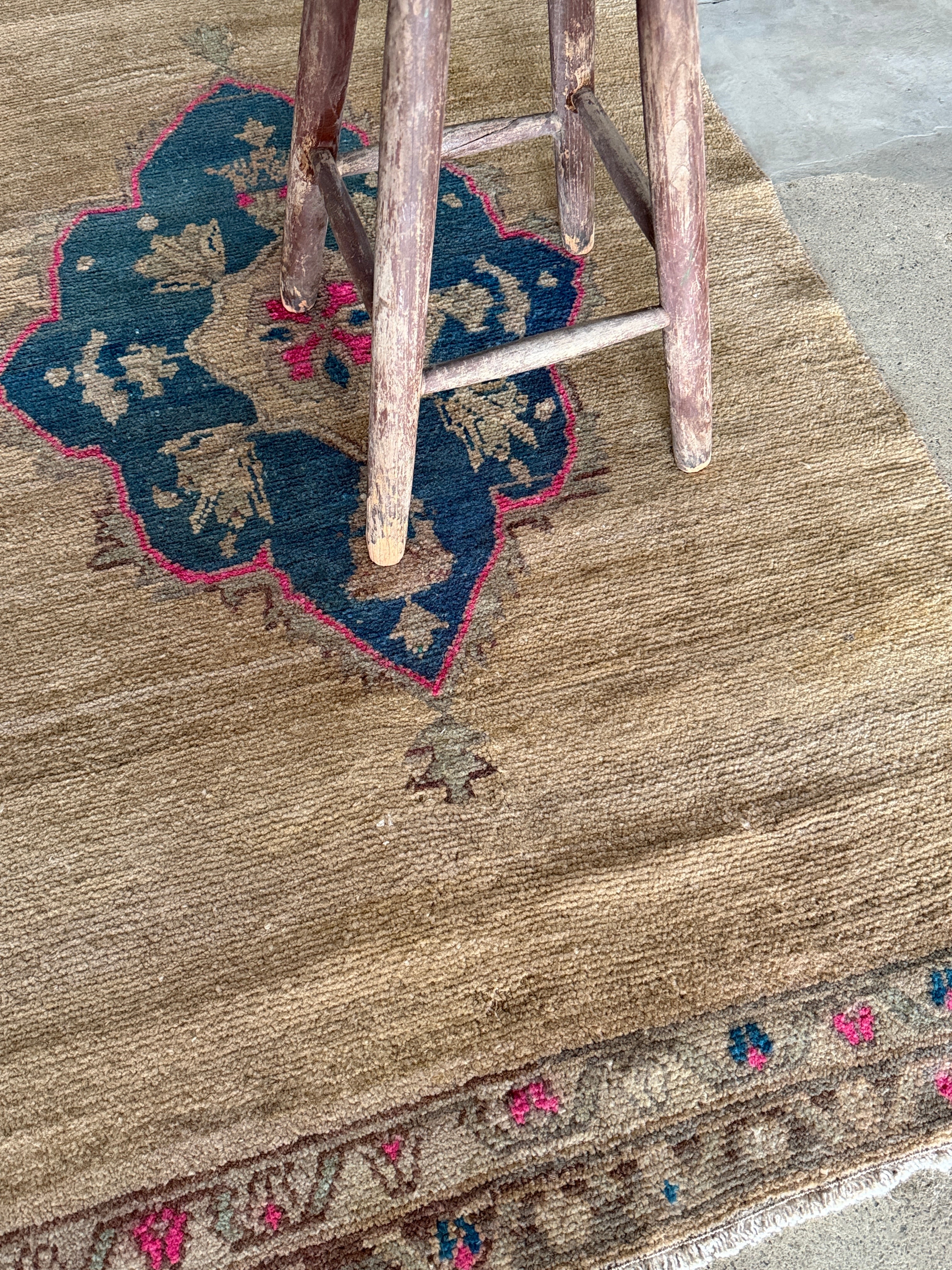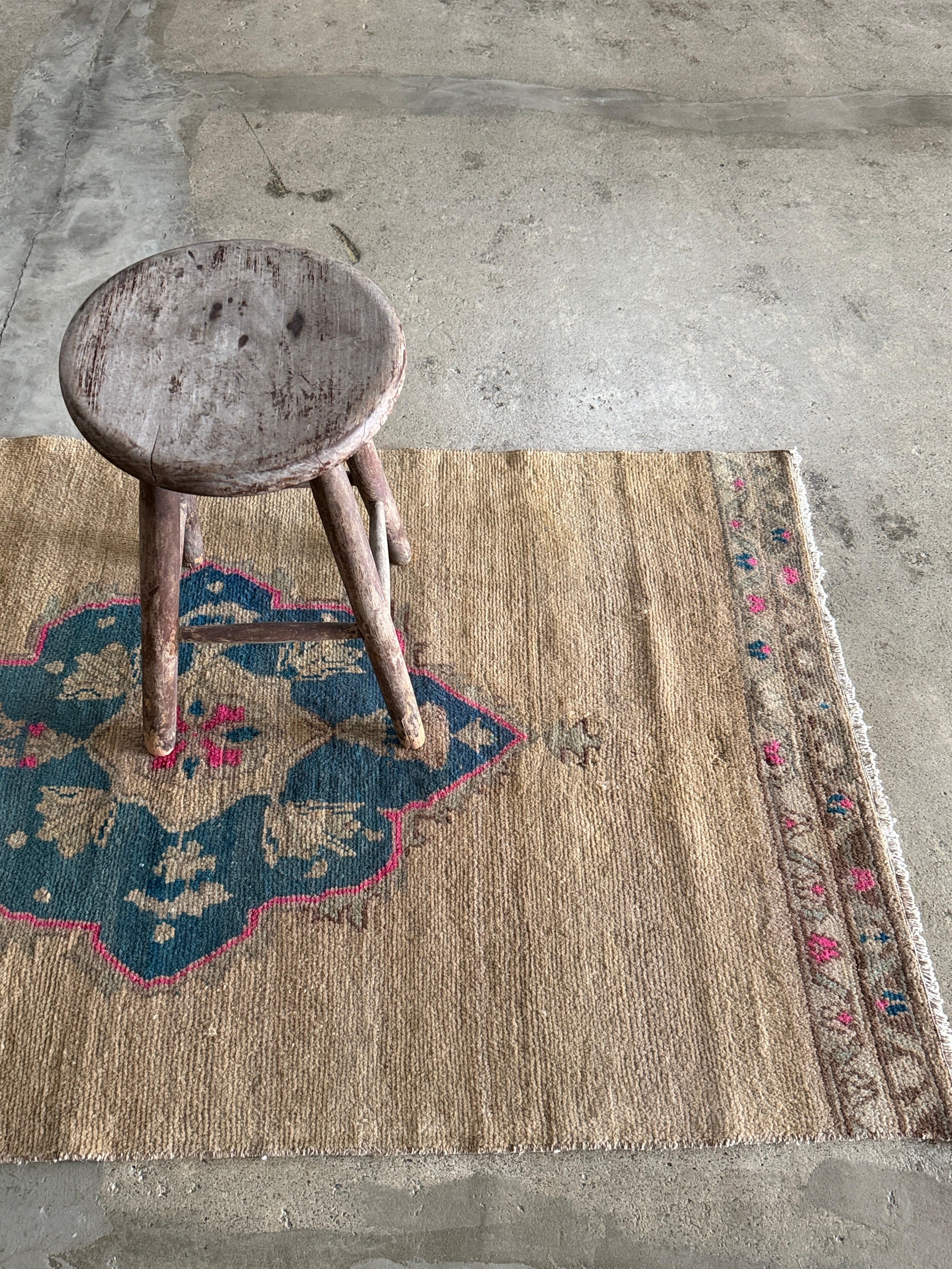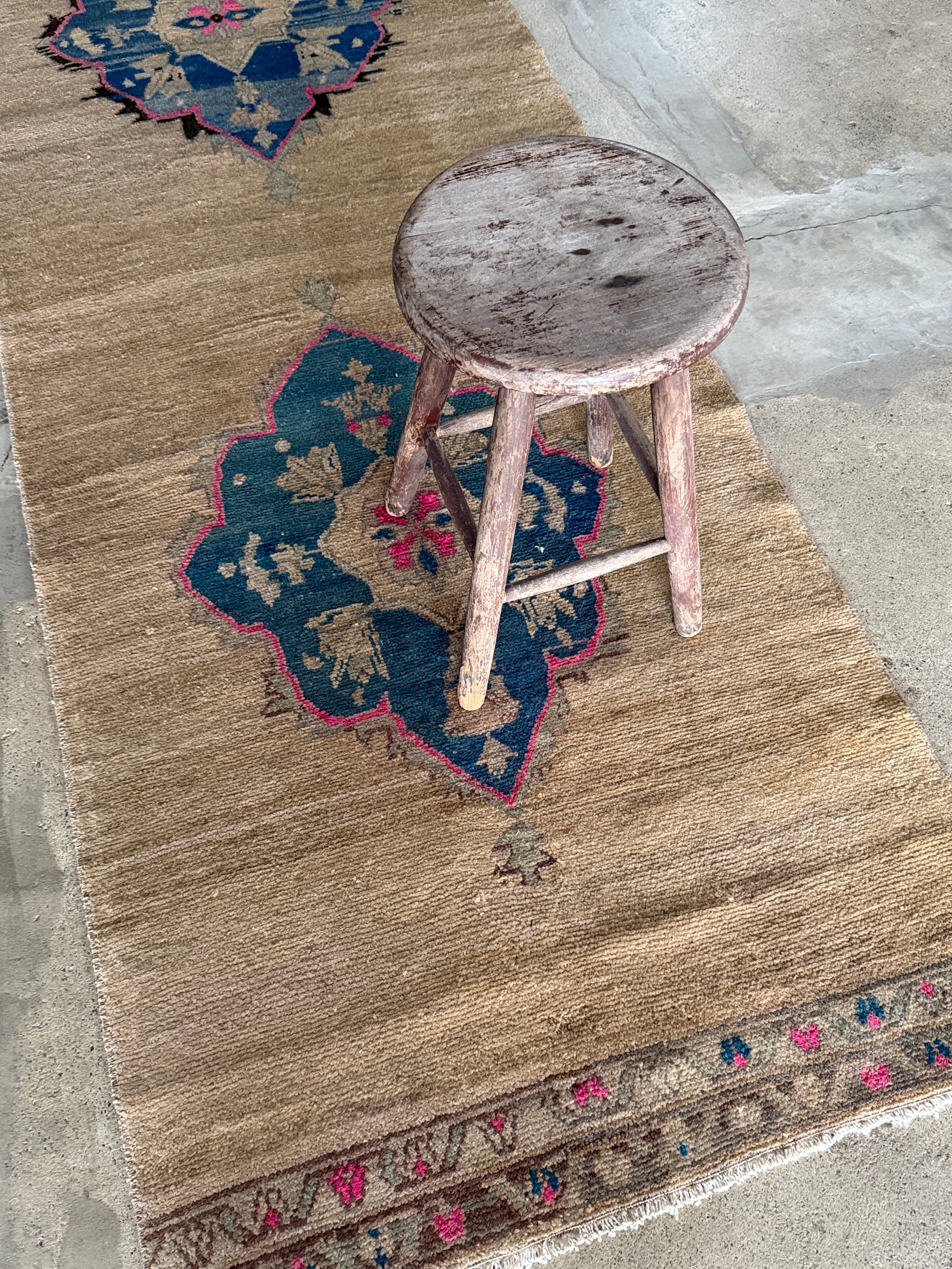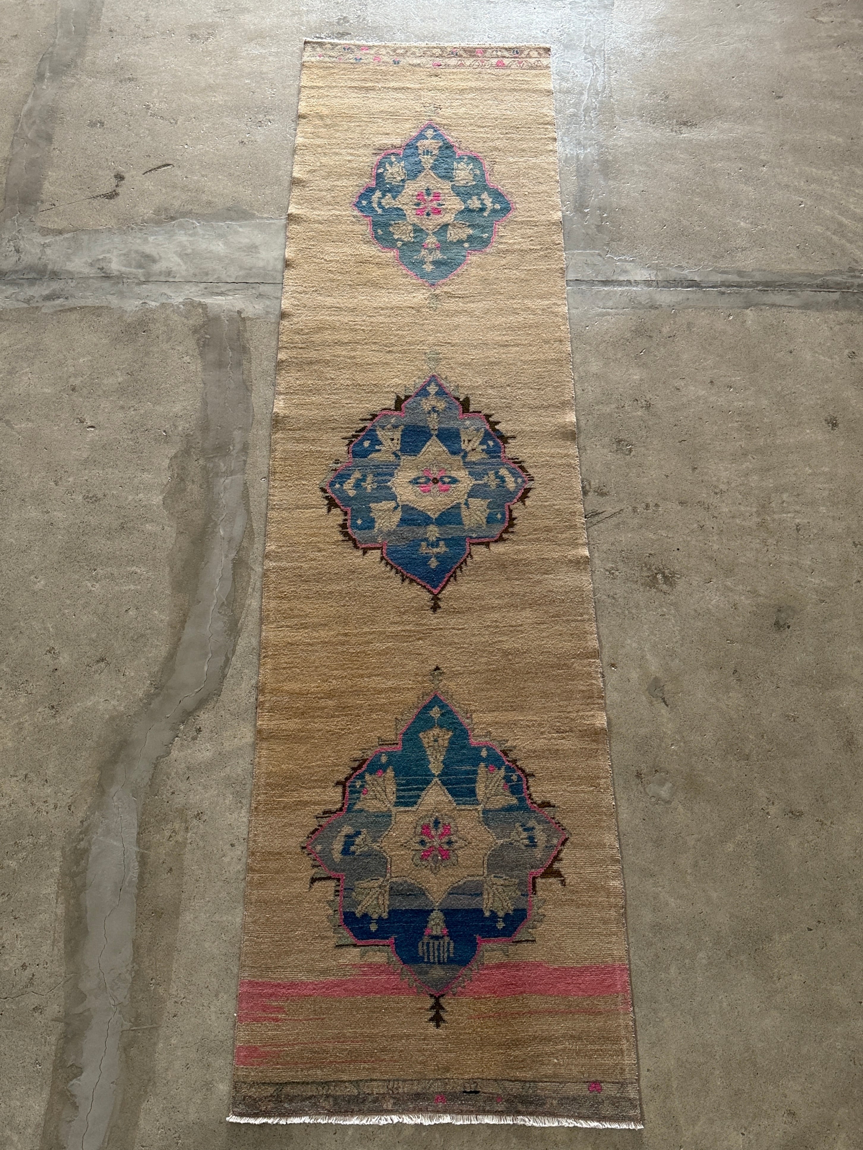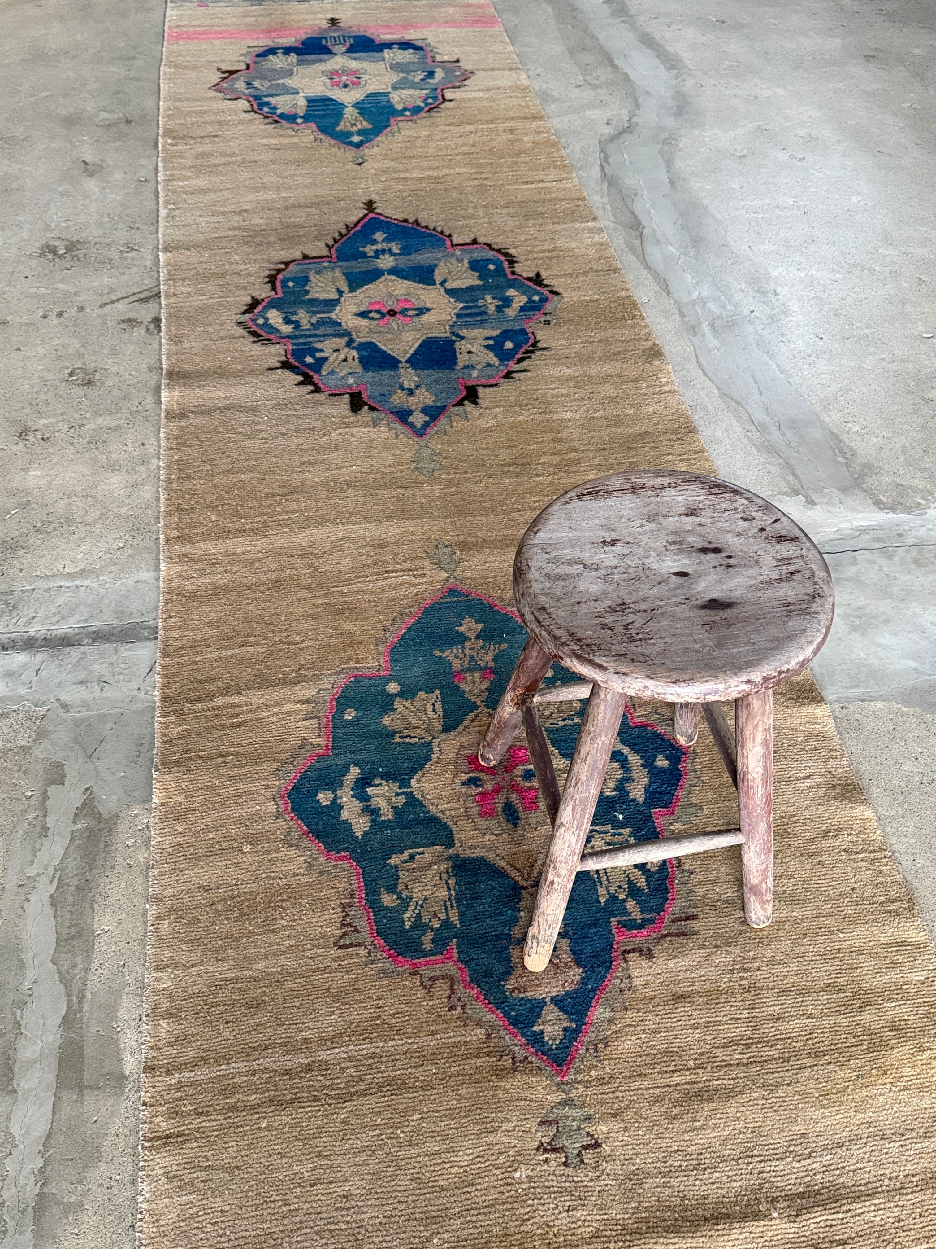 こちらはアナトリア絨毯をペイント加工したモノ。廊下やキッチン、本棚の下など縦長スペースに敷くだけで「ただの通路が<空間>になります」ね!こちらはアンティーク感のシックなベージュに3つのカラフルなメダリオンがとても印象的なラグ。一目でこの色合いと雰囲気に心惹かれました!絶対に他にはない<自分だけのお気に入りの1枚>になること間違いなしのラグです。